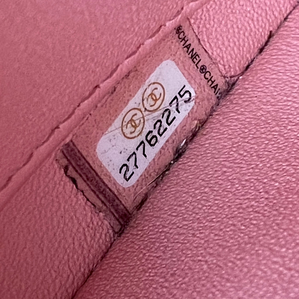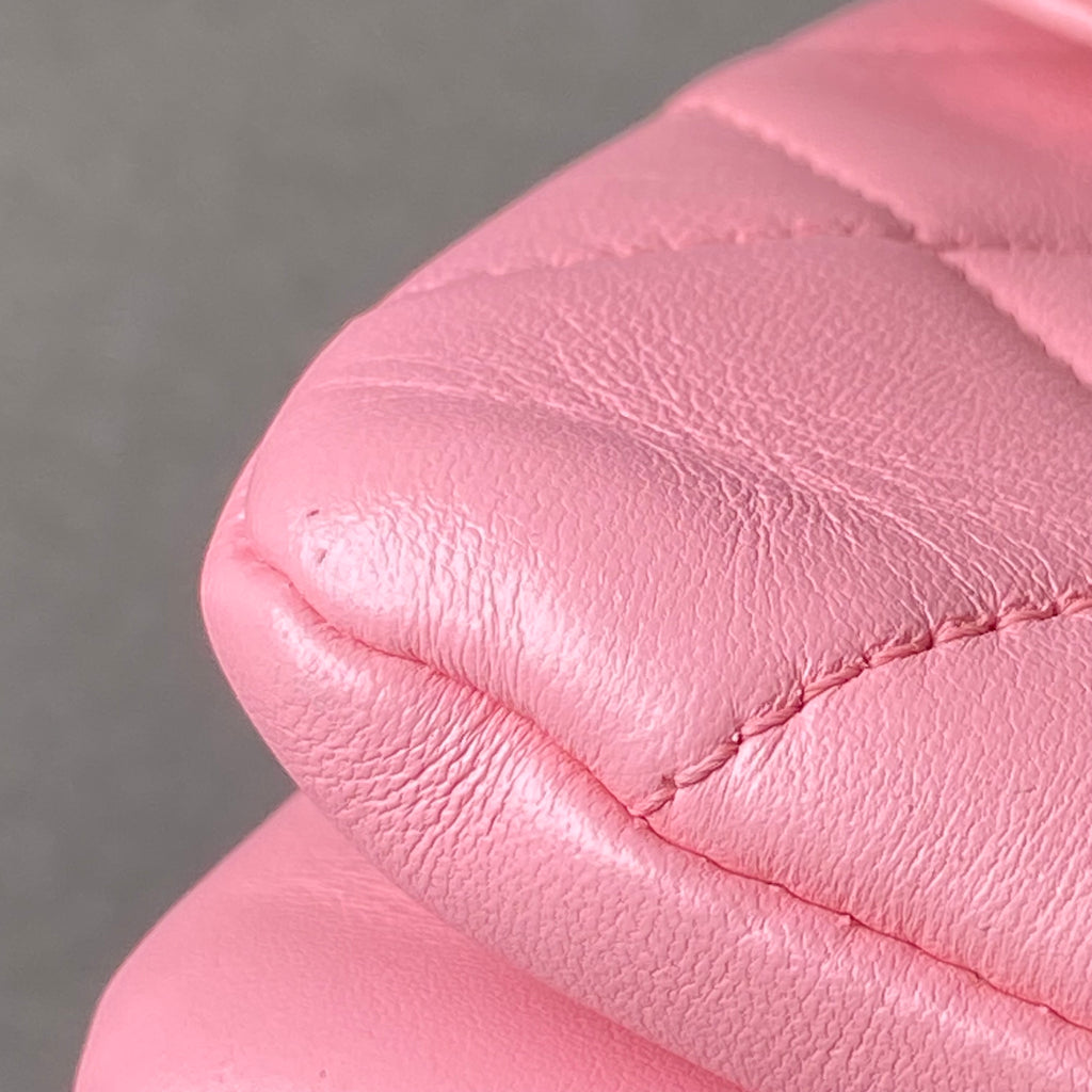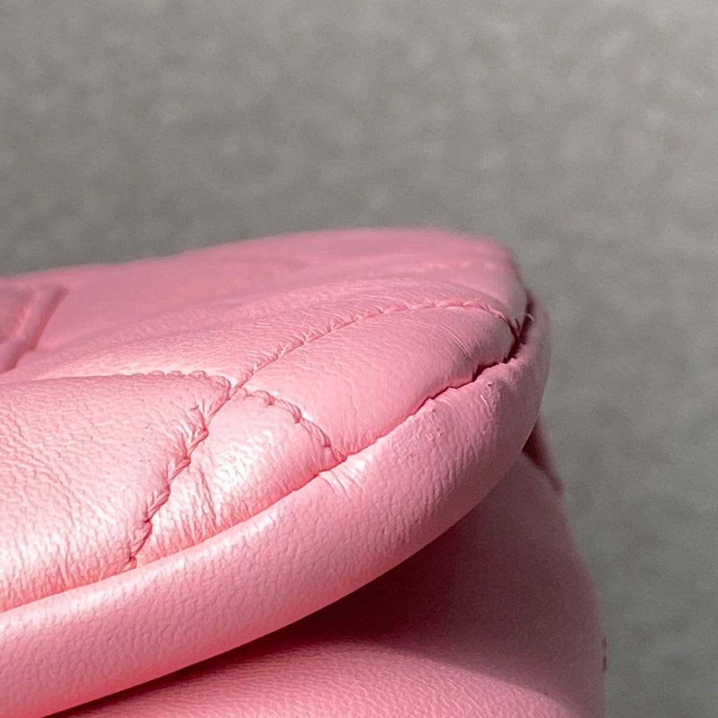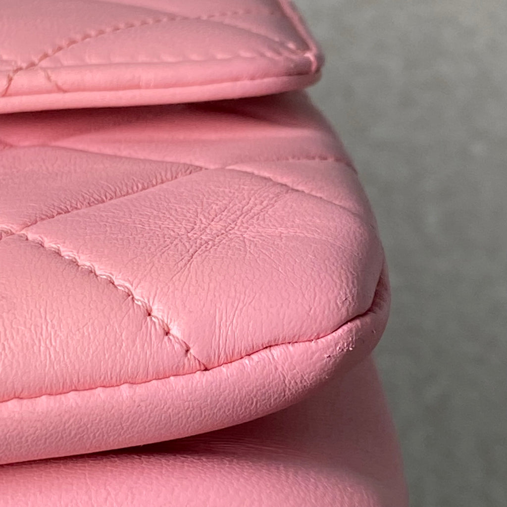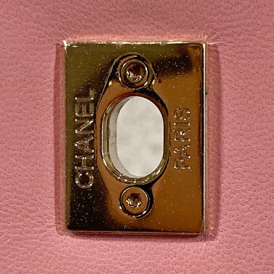 Approximately: Length: 10.5in Width: 1in Height: 6.5in Bag depth: 5.5in Strap drop: 13in. Pink Lambskin. Light gold hardware.