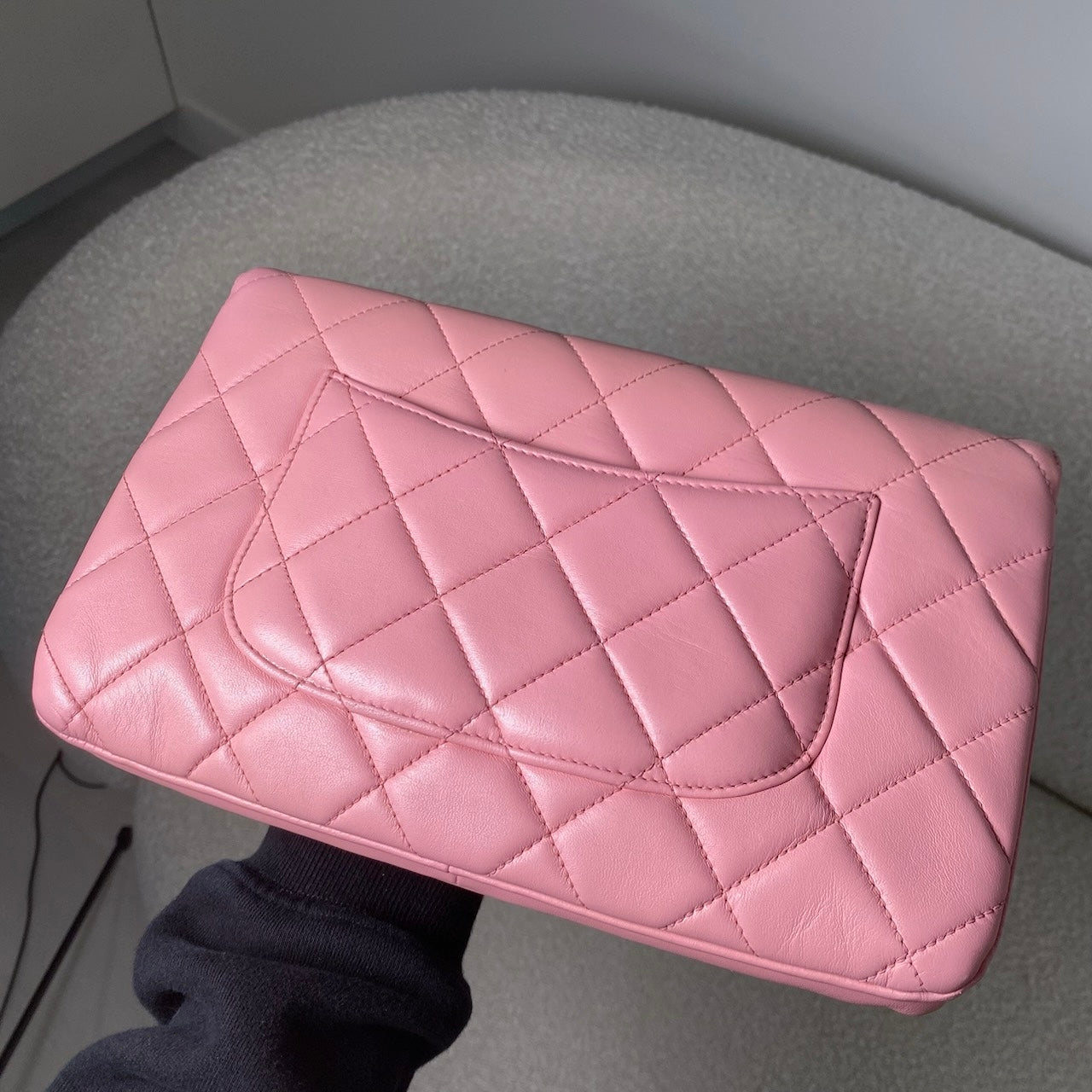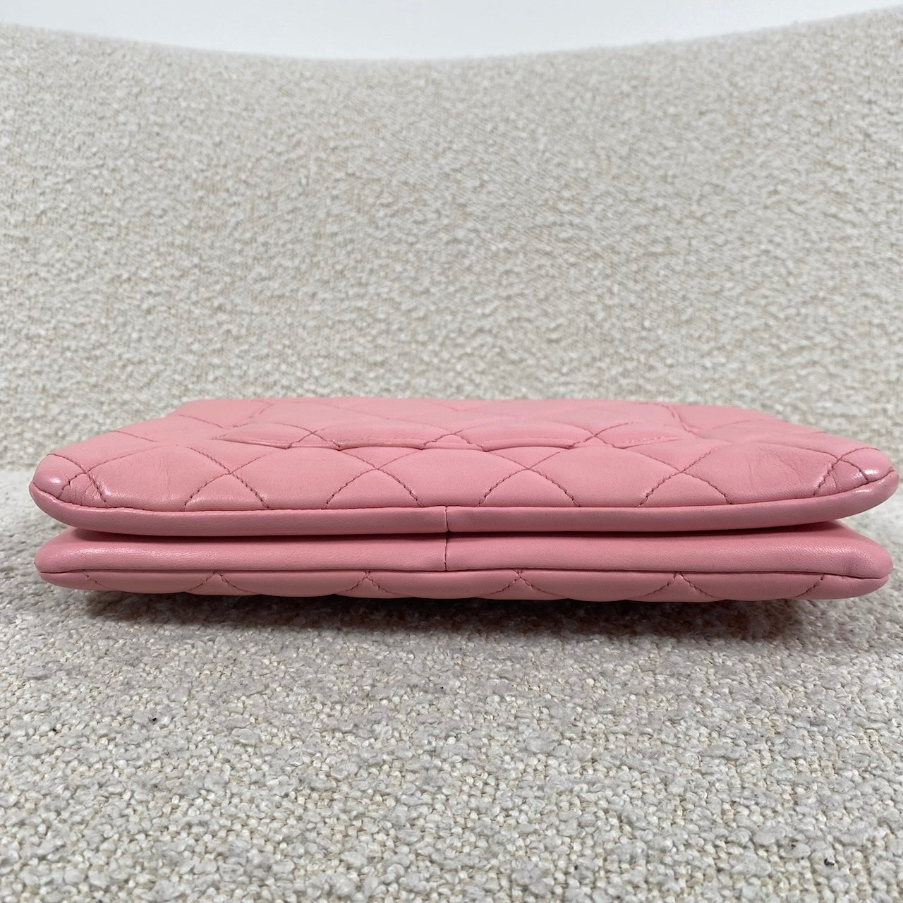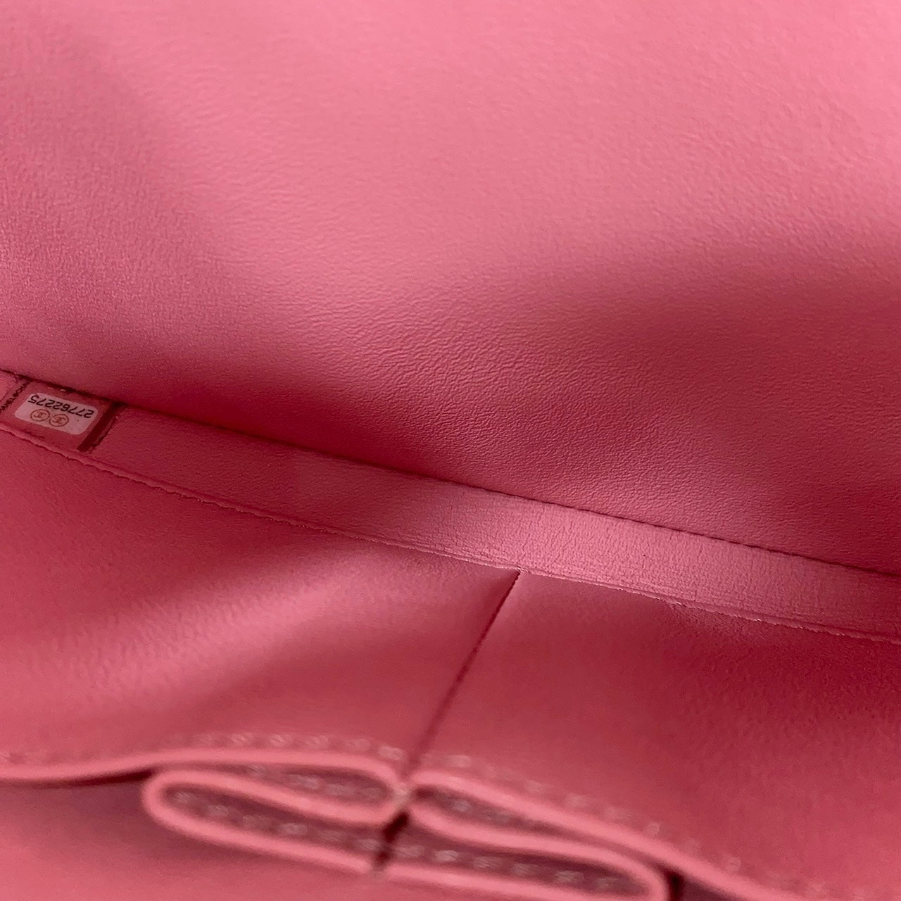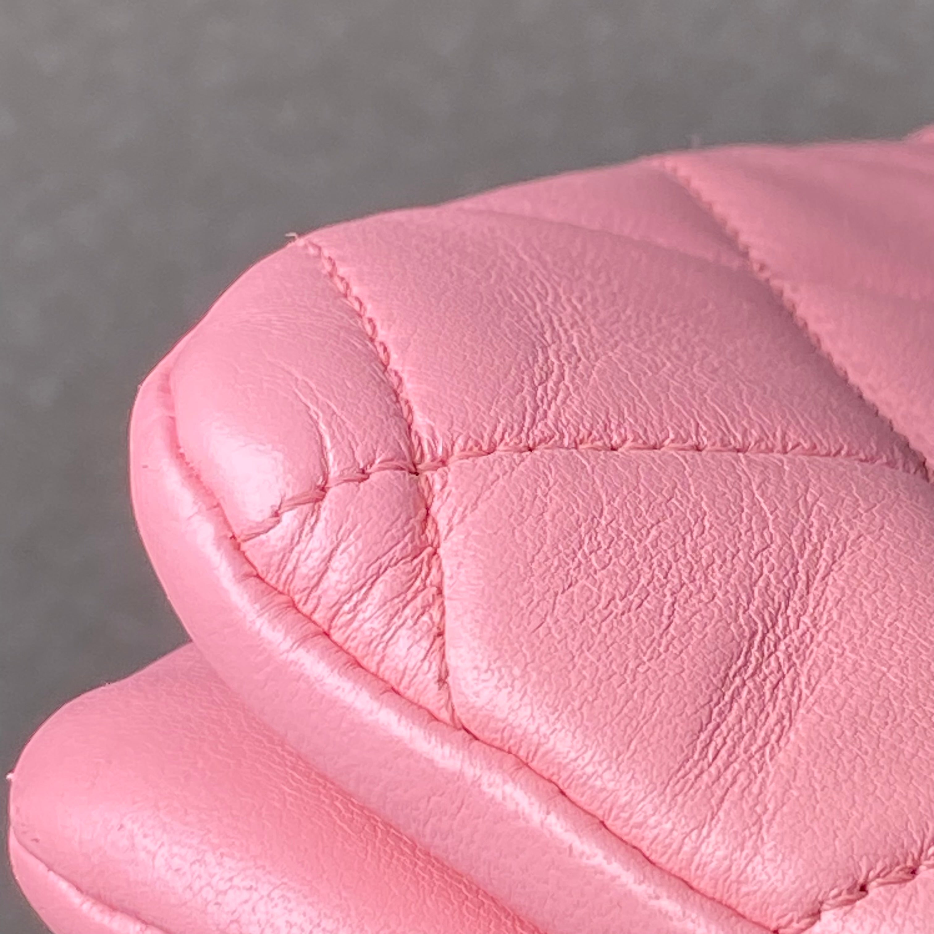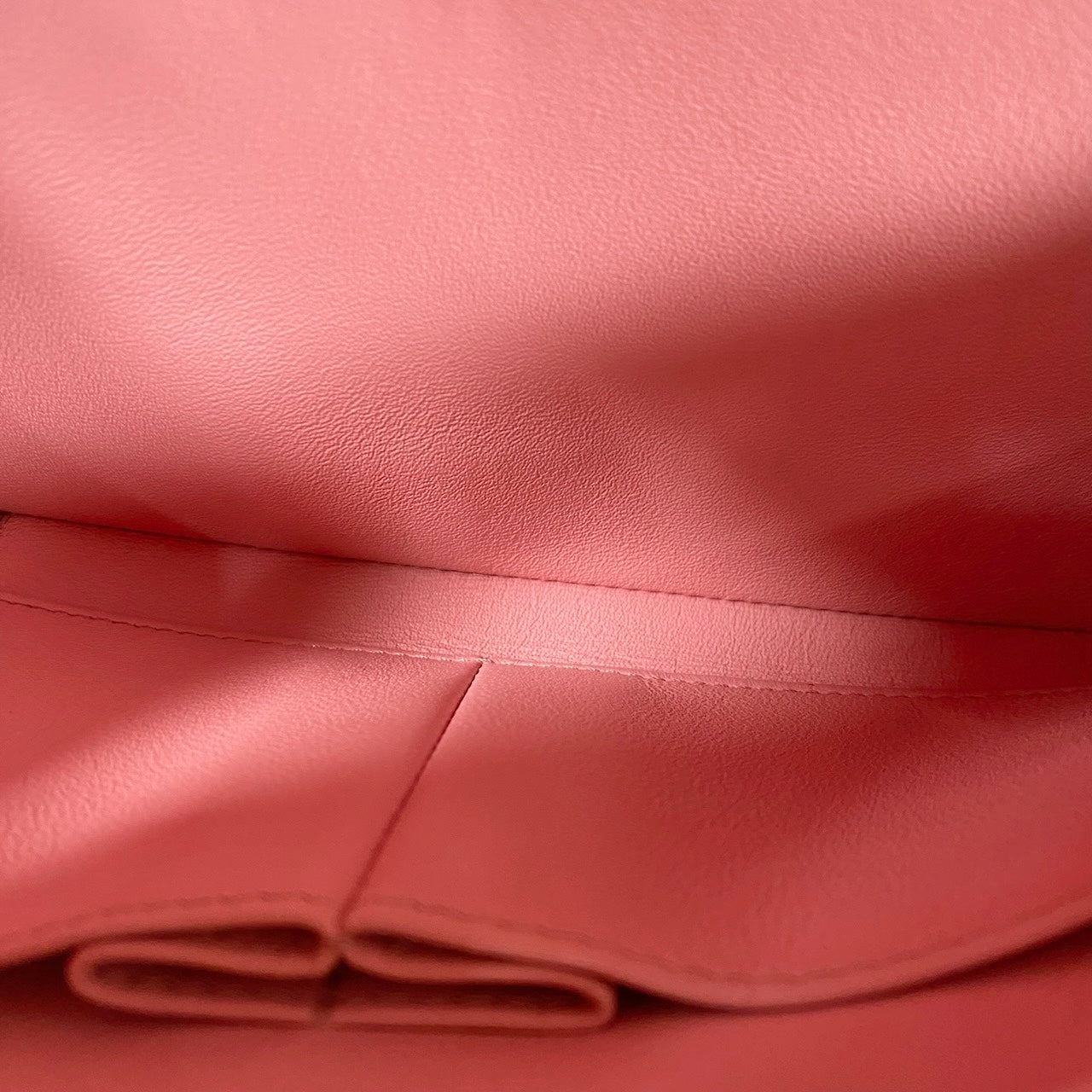 Approximately: Length: 10.5in Width: 1in Height: 6.5in Bag depth: 5.5in Strap drop: 13in. Pink Lambskin. Light gold hardware.