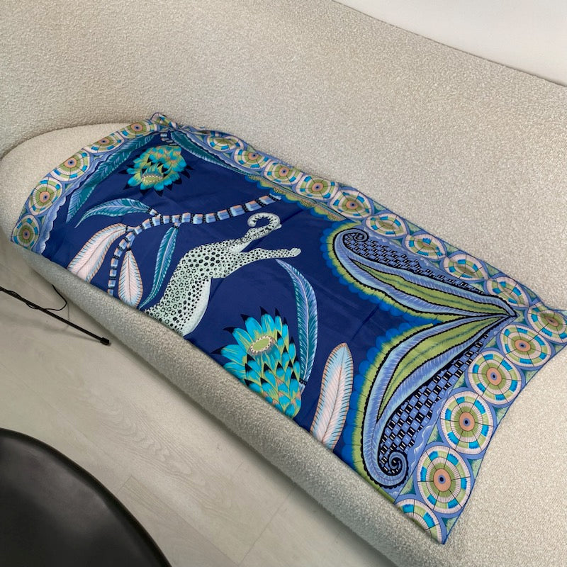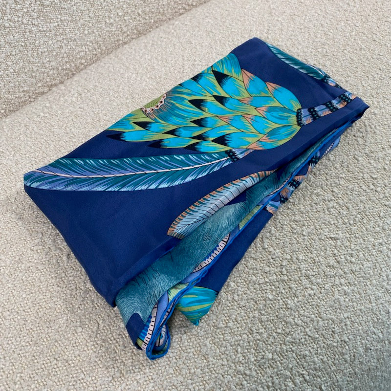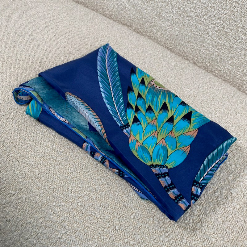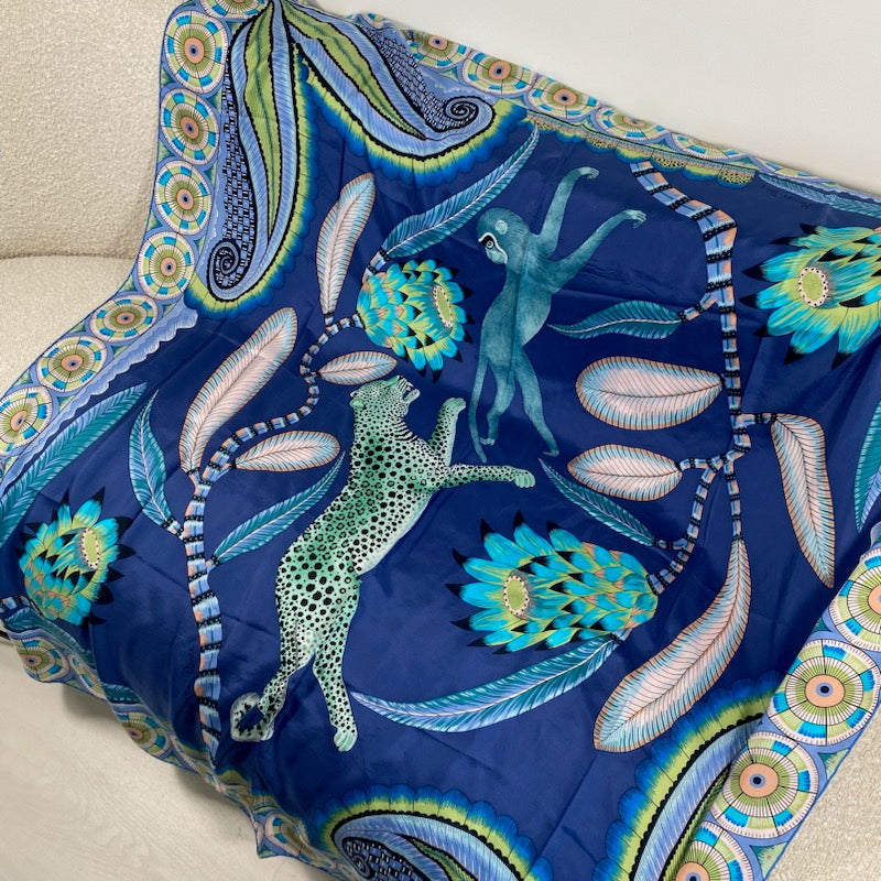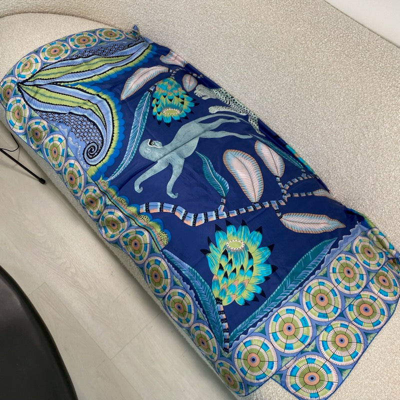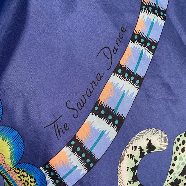Blue silk. Featuring Hand-Rolled Edges. 140cm with The Savana Dance wash scarf 140 Motif. Length: 55" Width: 55".