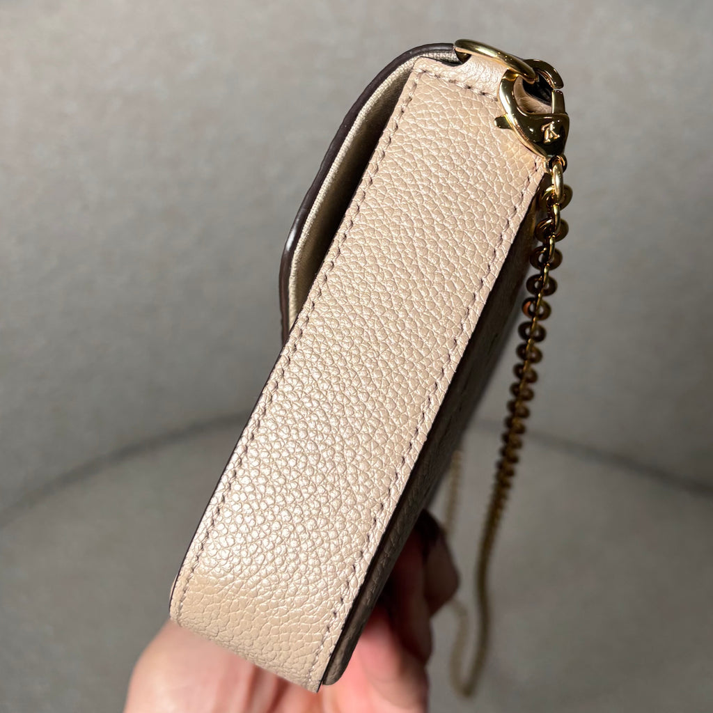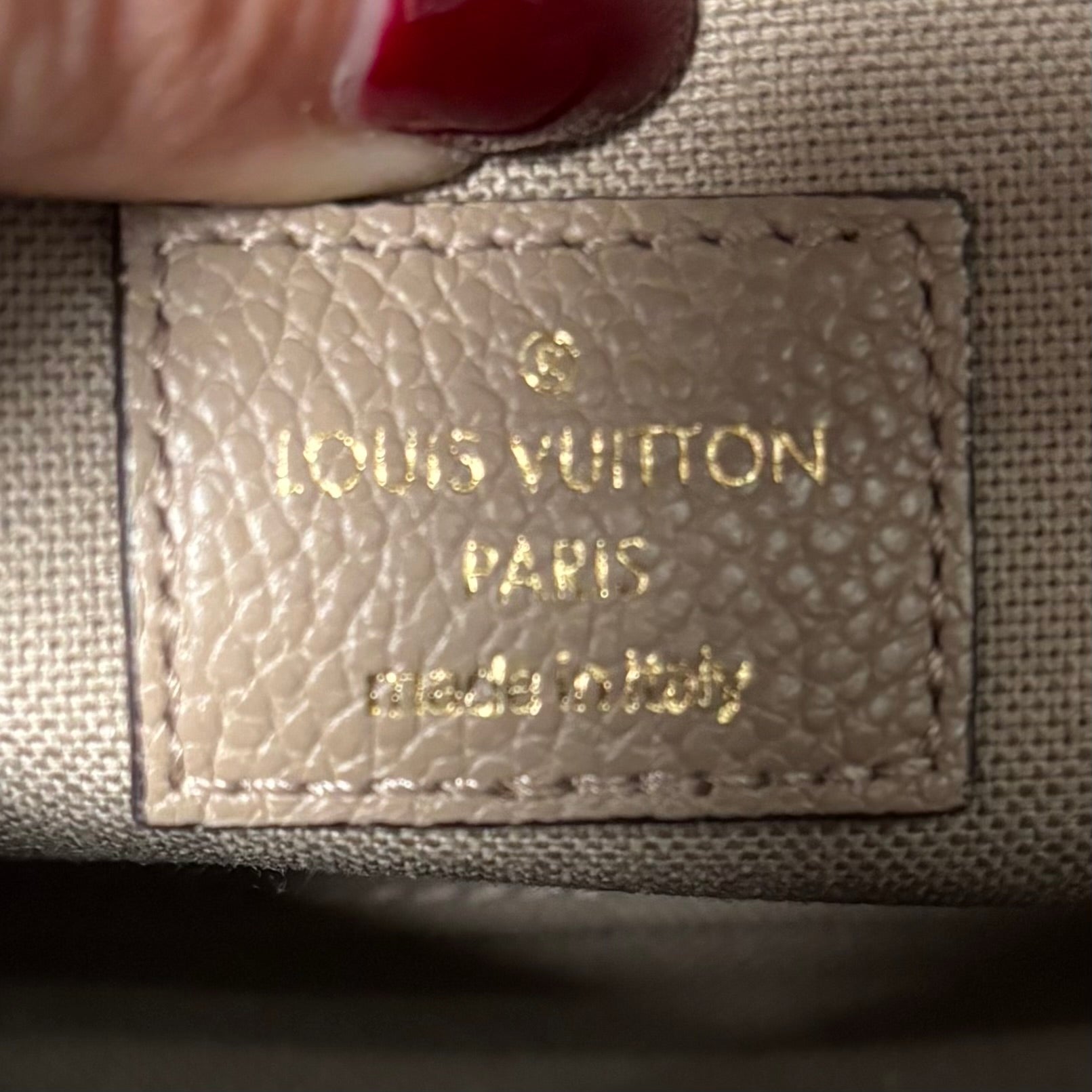 Tourterelle Beige Monogram Empreinte embossed supple grained cowhide leather. Supple grained cowhide-leather trim. Microfiber lining. Gold-color hardware. Press-stud closure. Fits: 6.7-inches smartphone, LV Charms Card Holder, earphones, keys, lipstick. Chain:Removable.Chain drop:20.9 inches.