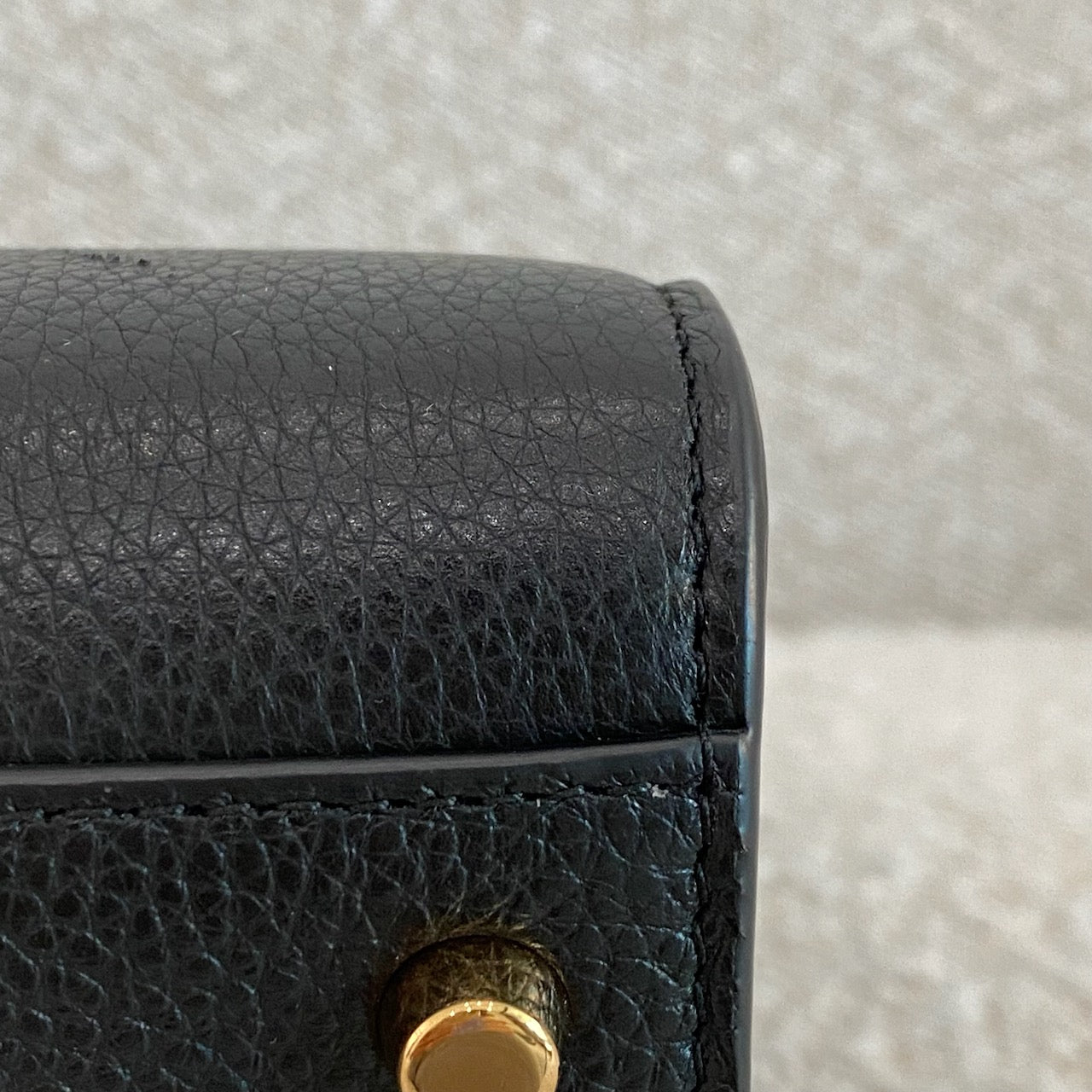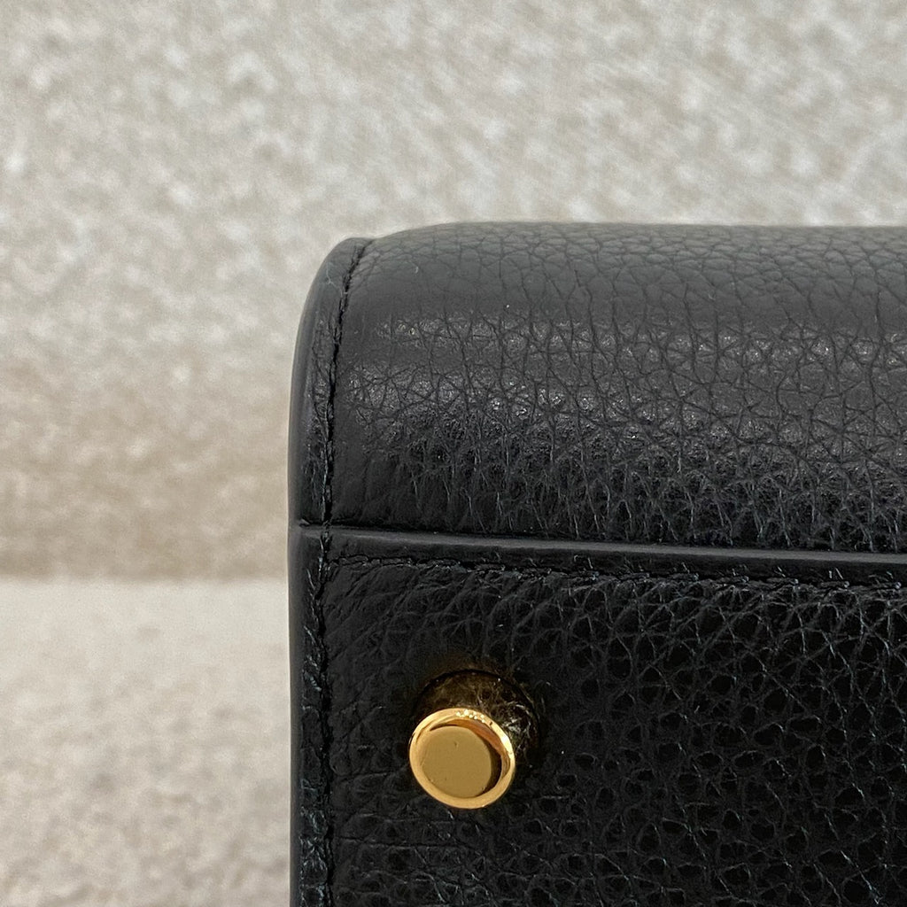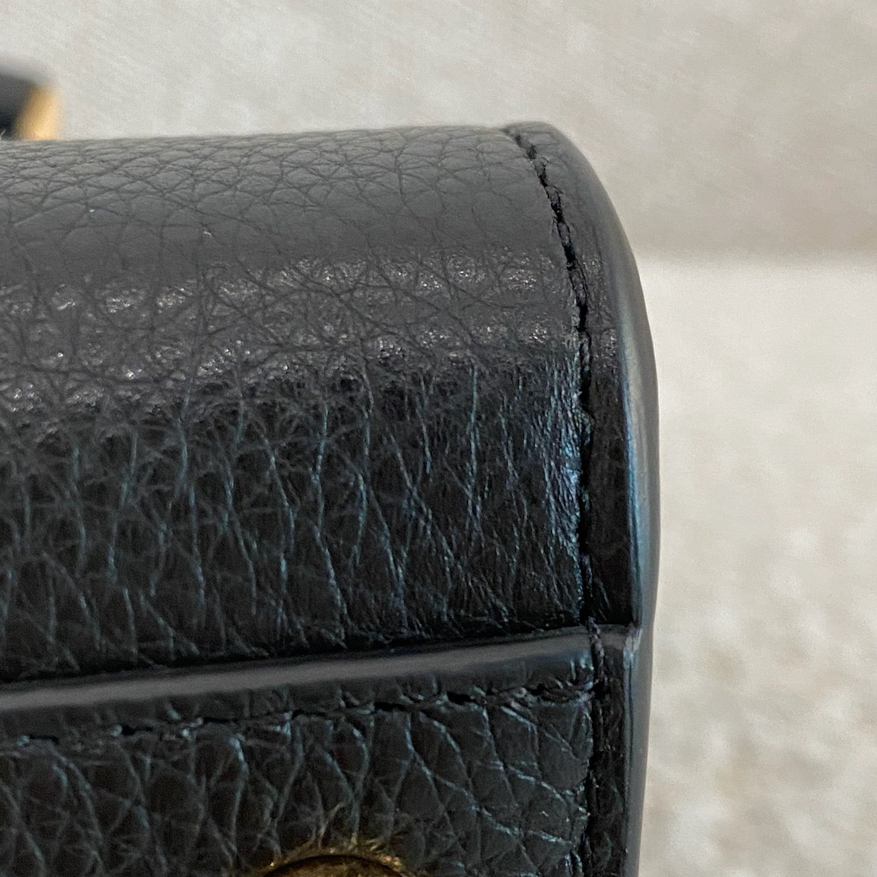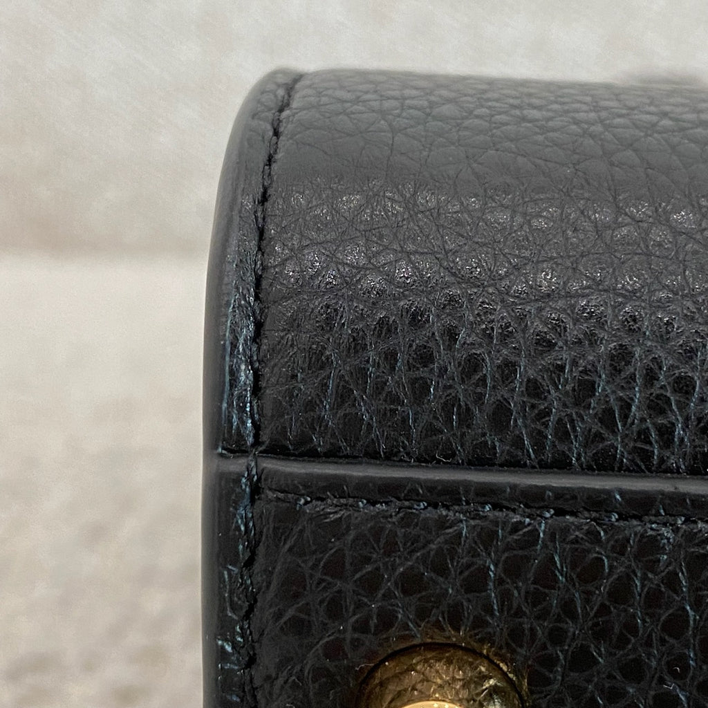Black grained leather. Gold tone hardware.