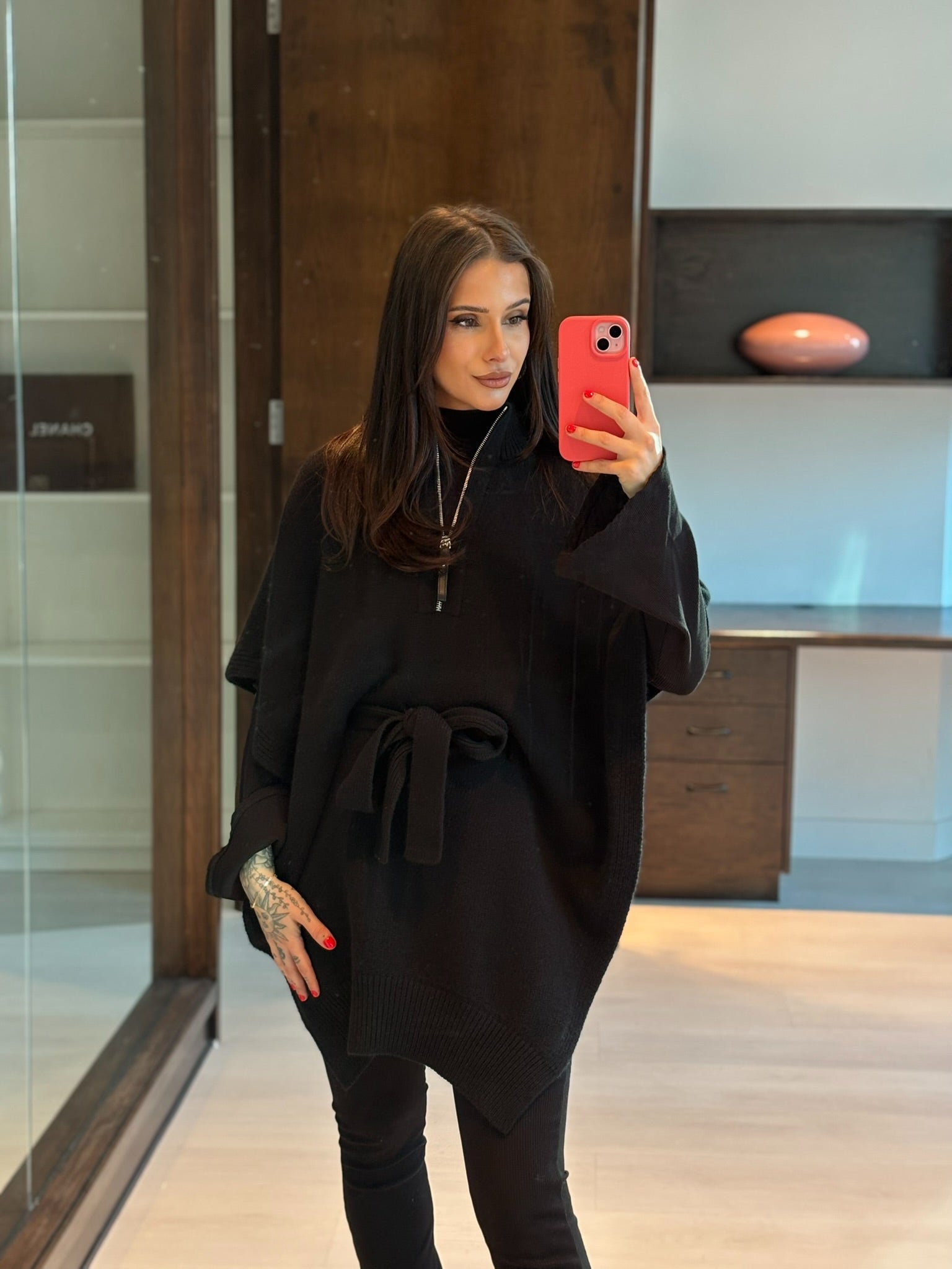 Black cashmere. Palladium hardware. Black leather zipper pull.