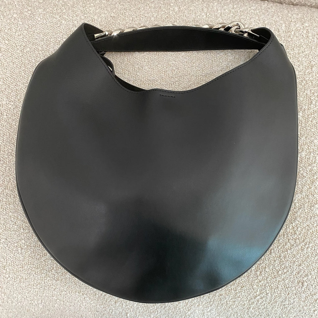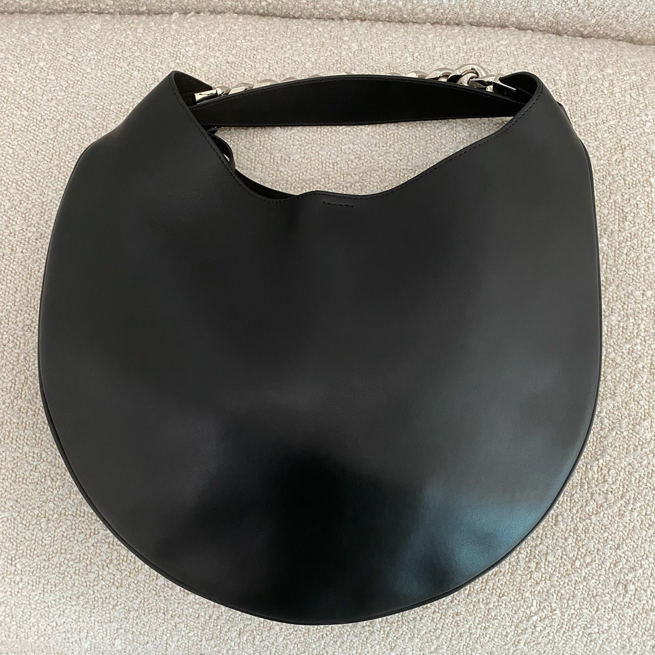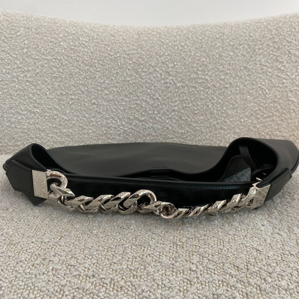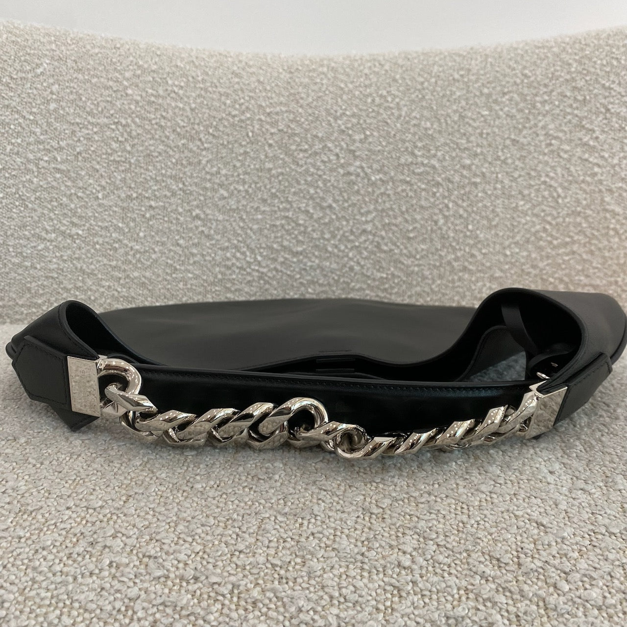 Length: 15.5in Width: 0.5in Height: 15.5in Bag depth: 12in Handle drop: 4in. Soft calfskin leather in black with polished silver edgy chains along the top of the strap.