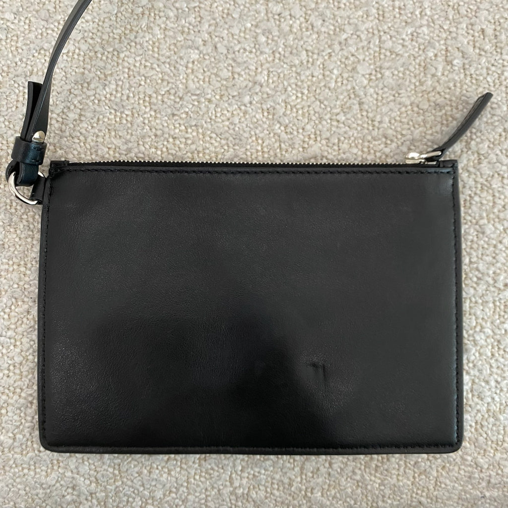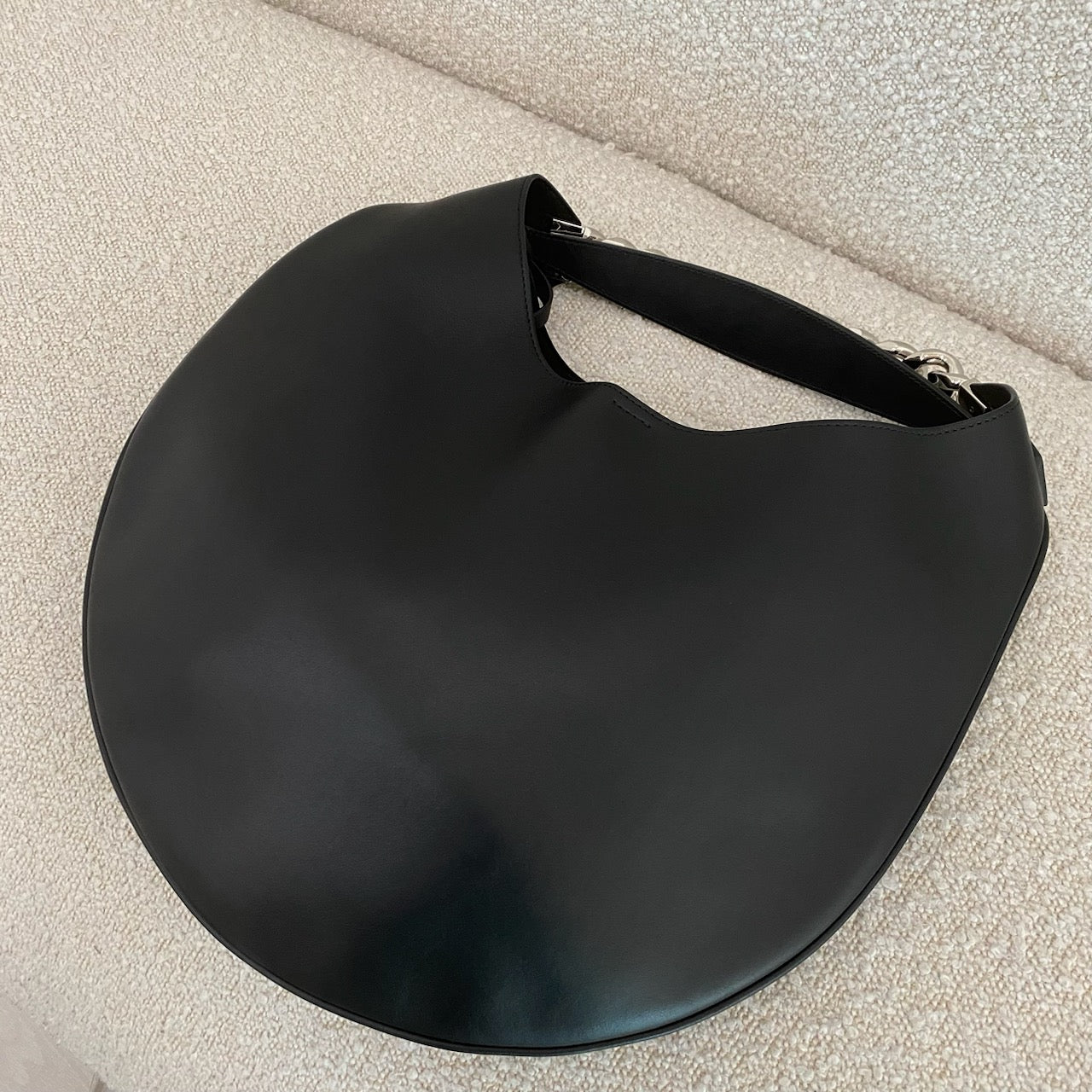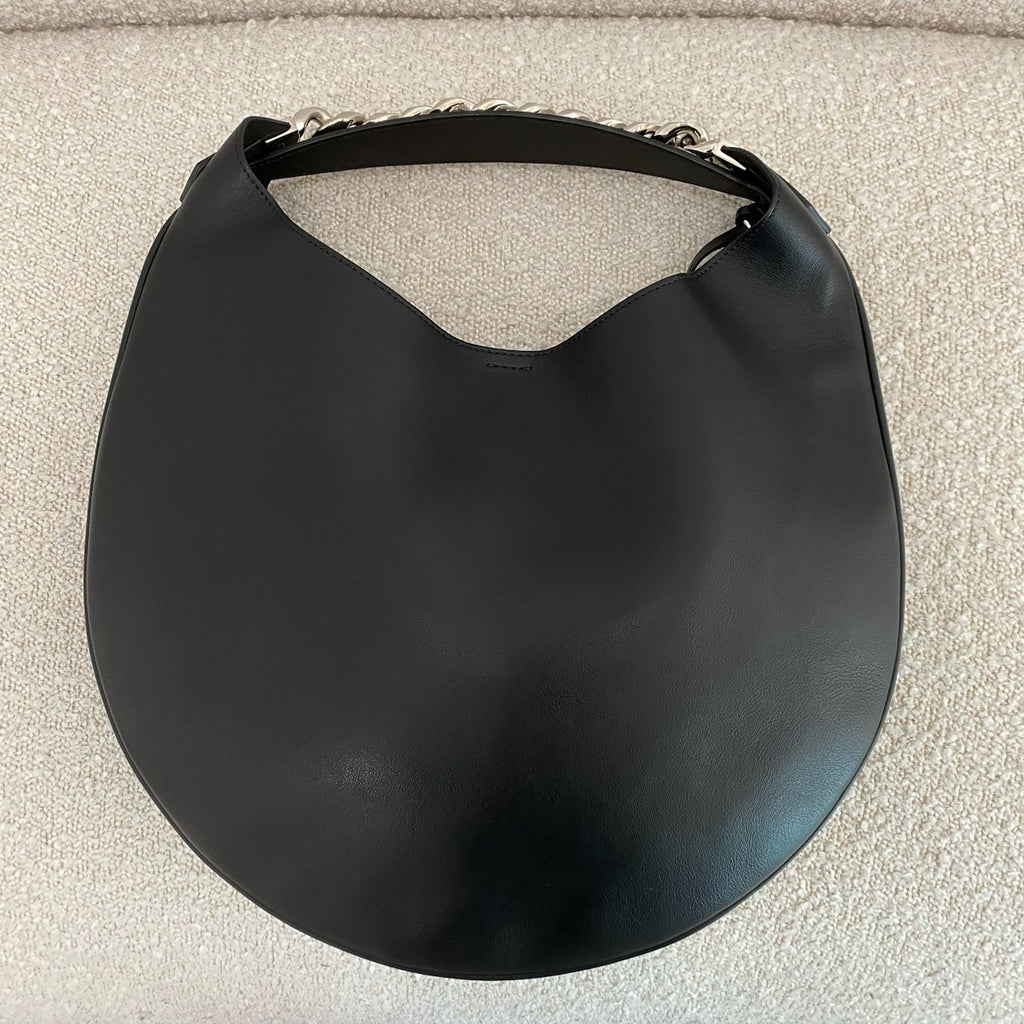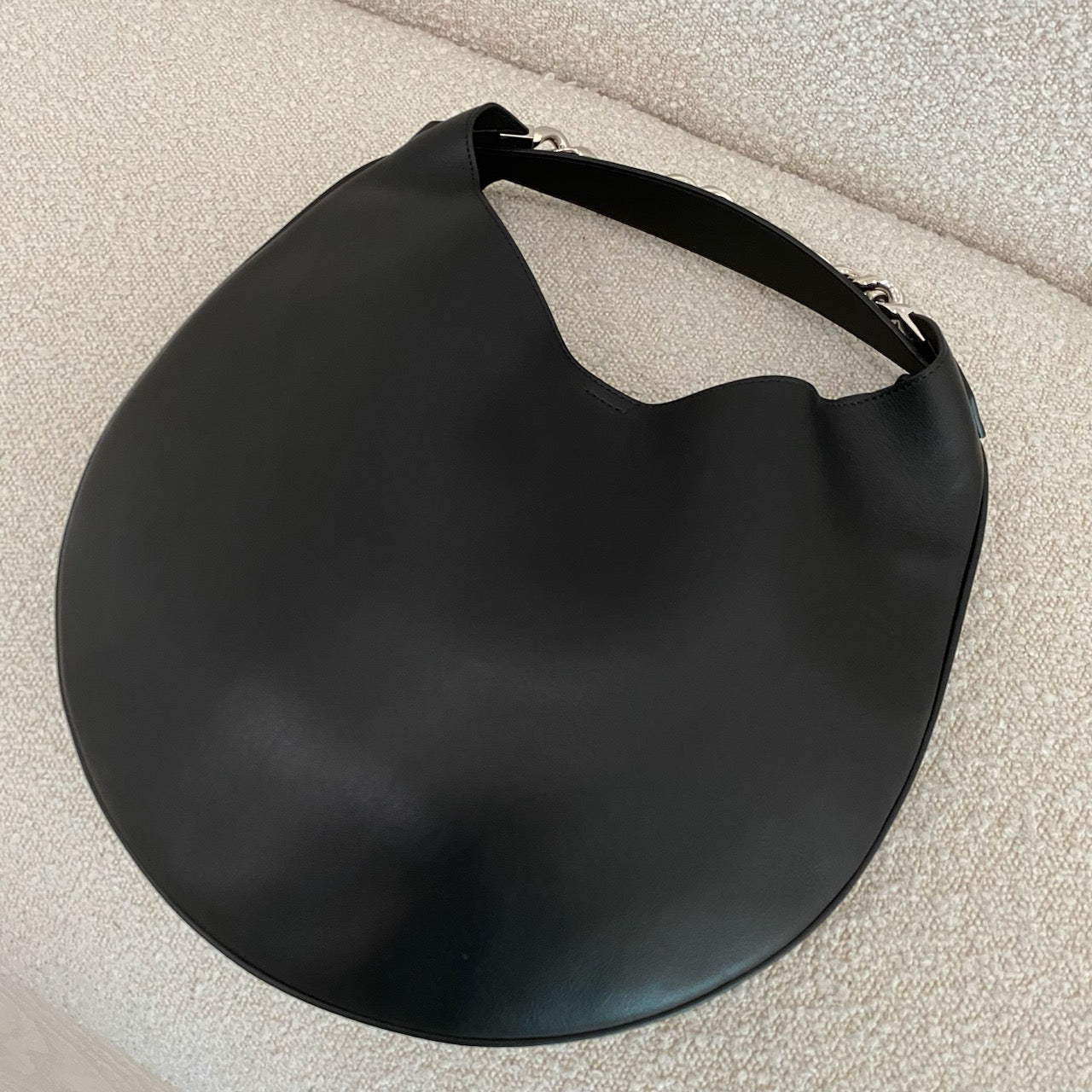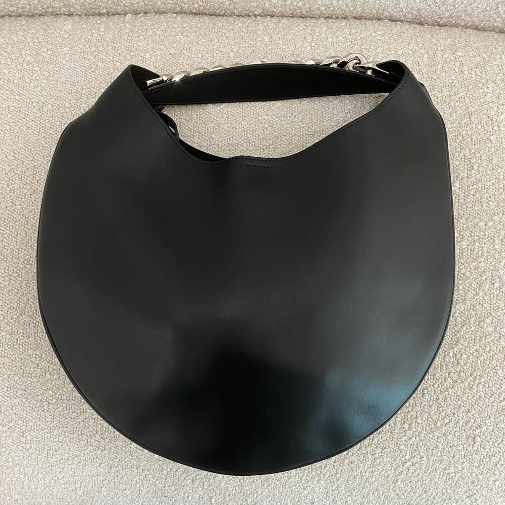 Length: 15.5in Width: 0.5in Height: 15.5in Bag depth: 12in Handle drop: 4in. Soft calfskin leather in black with polished silver edgy chains along the top of the strap.