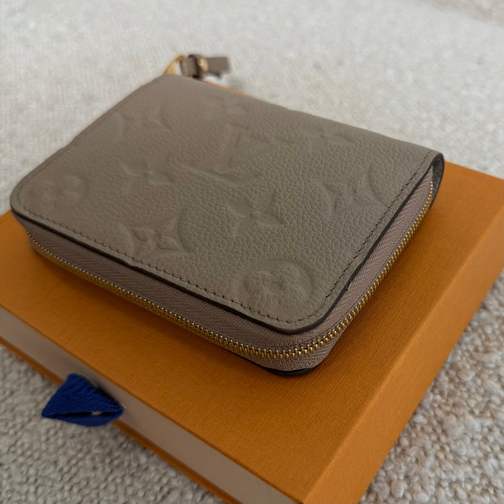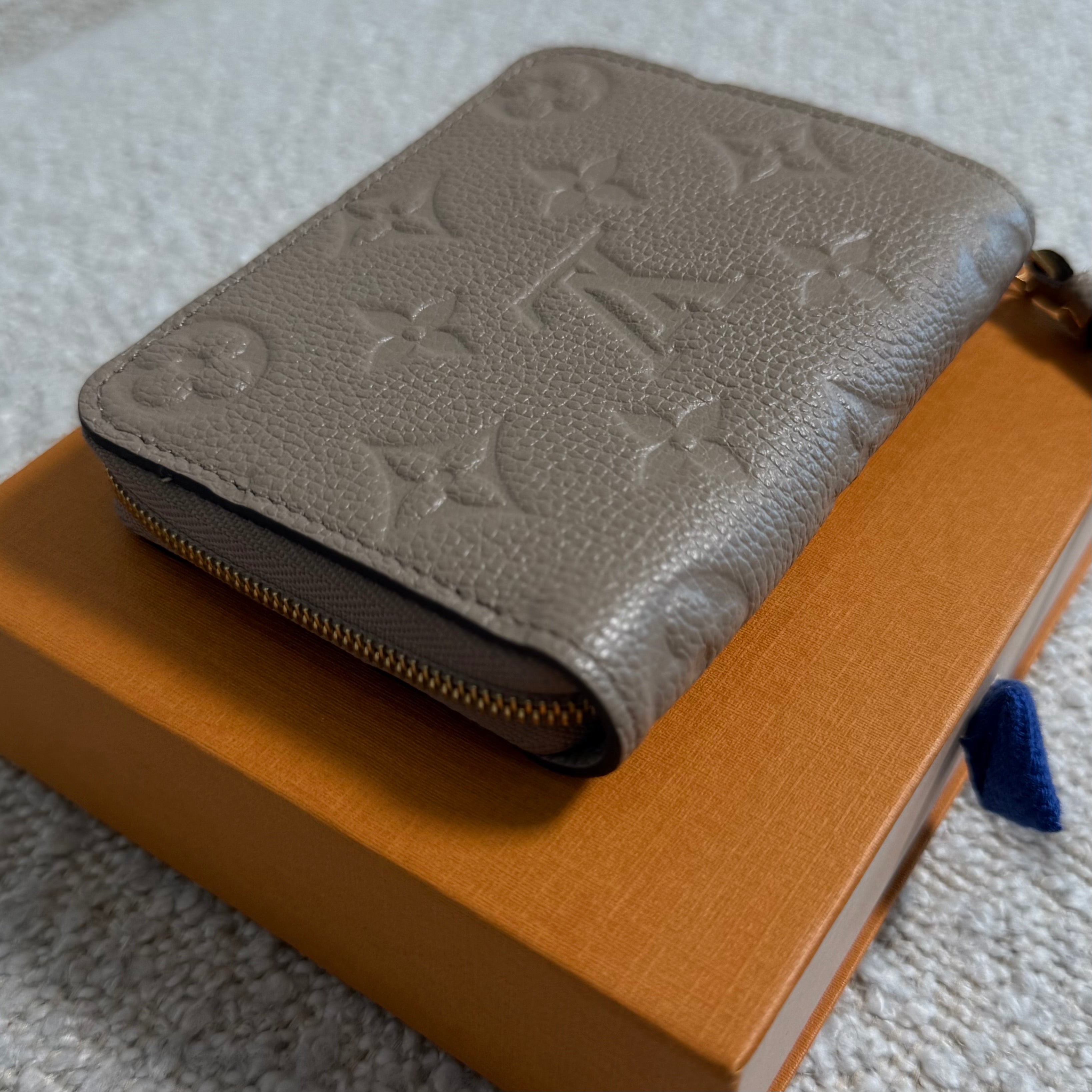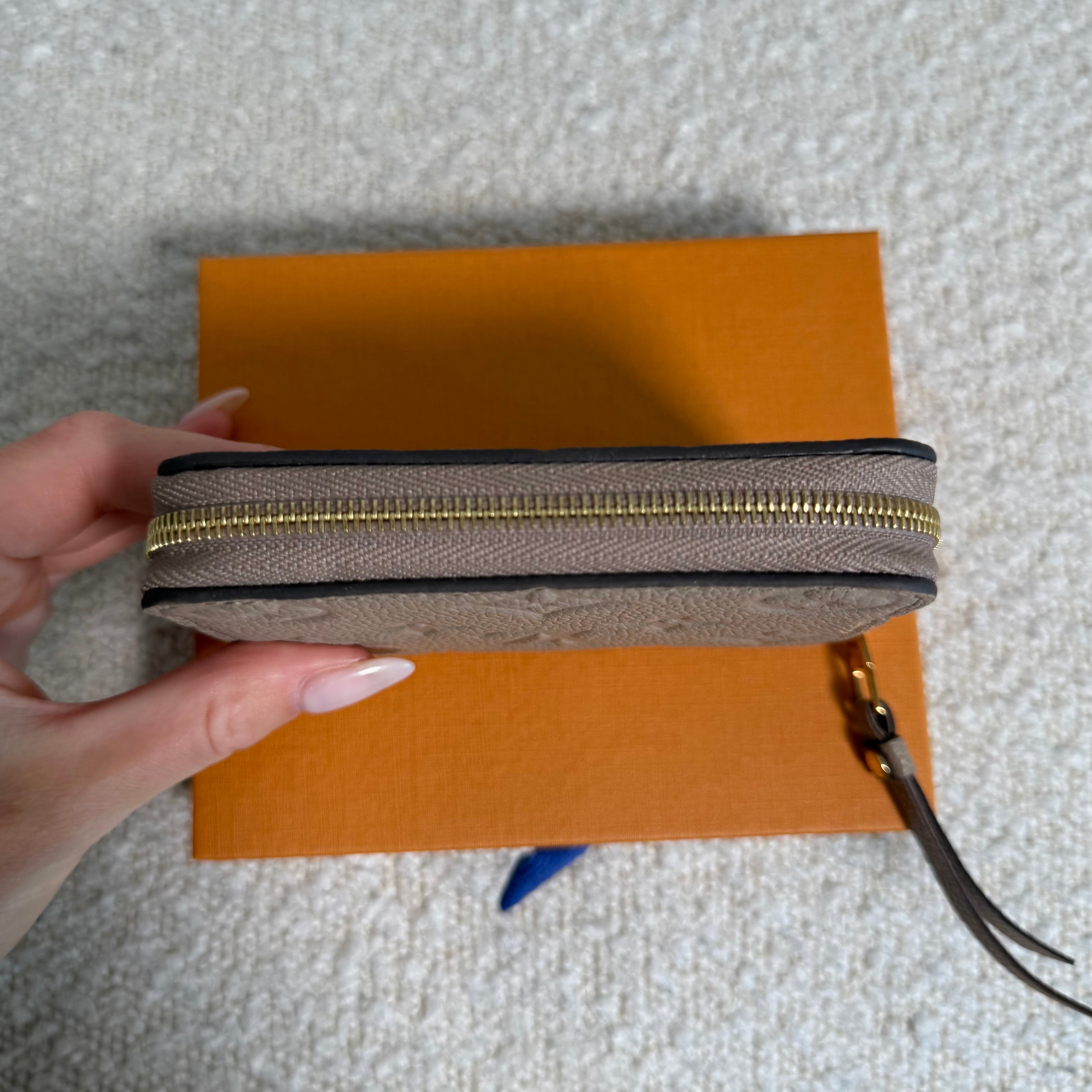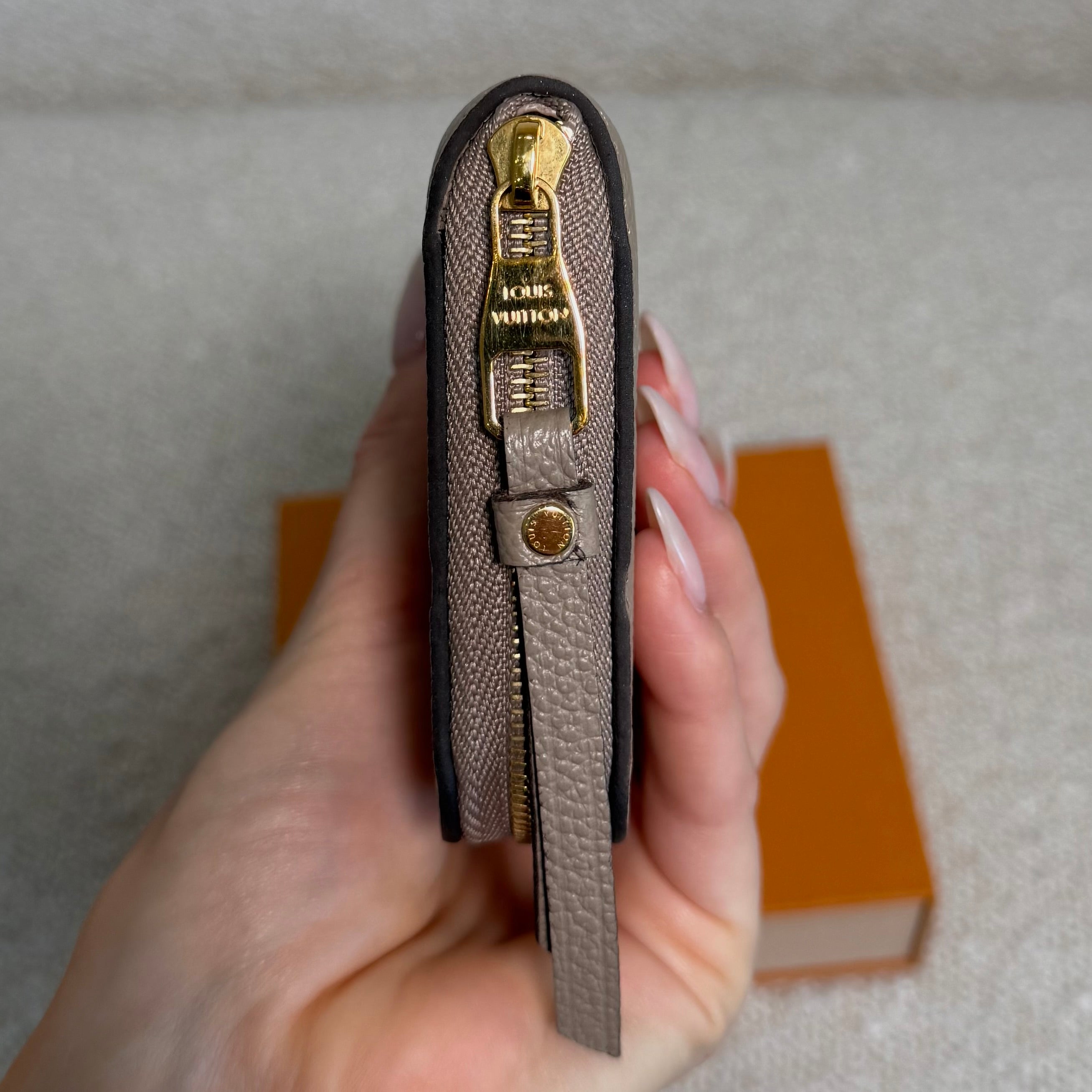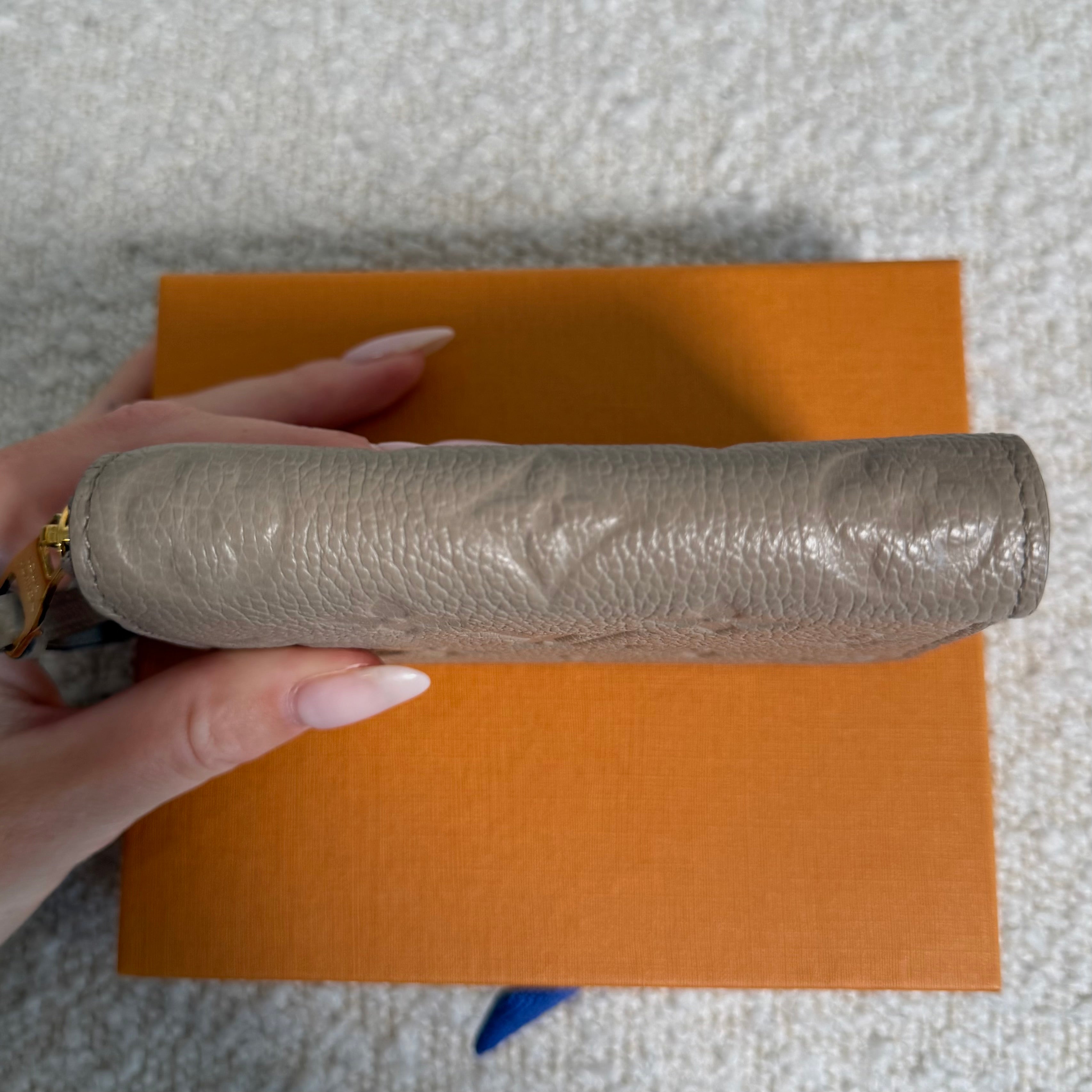 Turtledove empreinte monogram leather. Gold tone hardware. 4.3 x 3.3 x 0.8 inches.