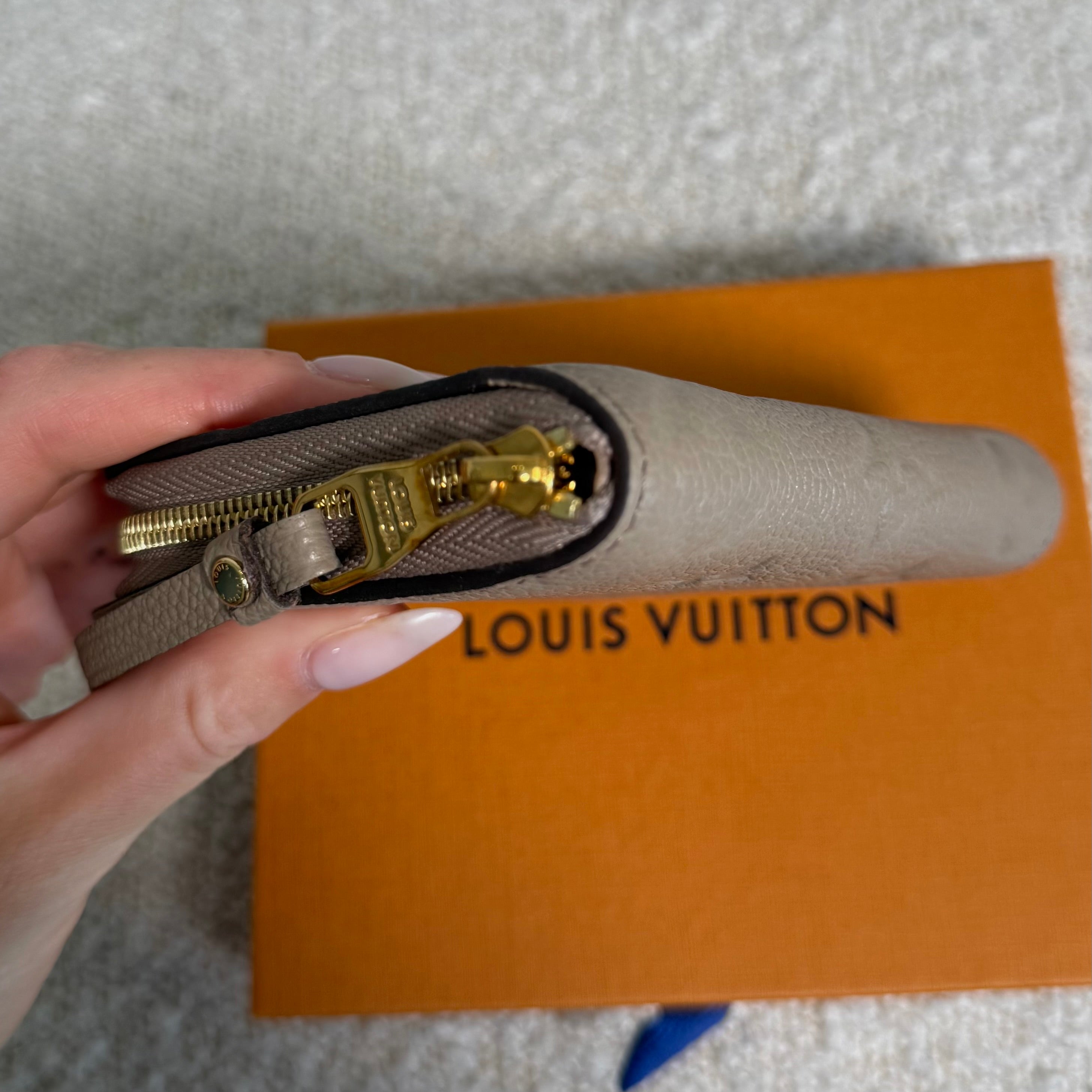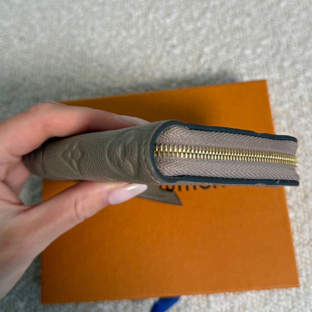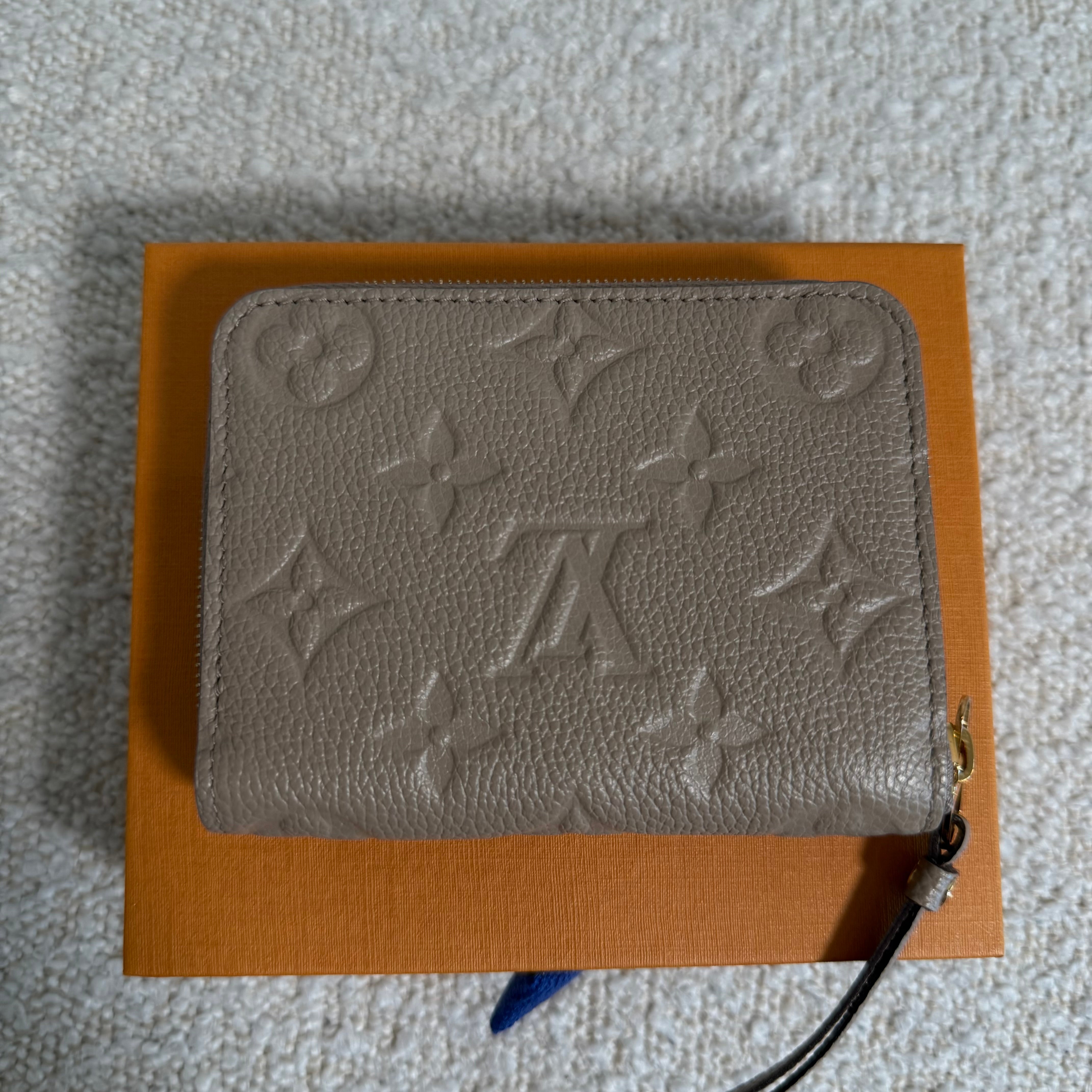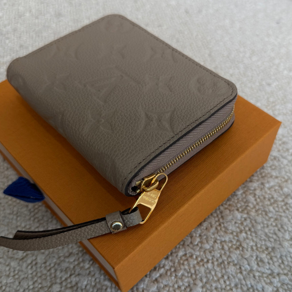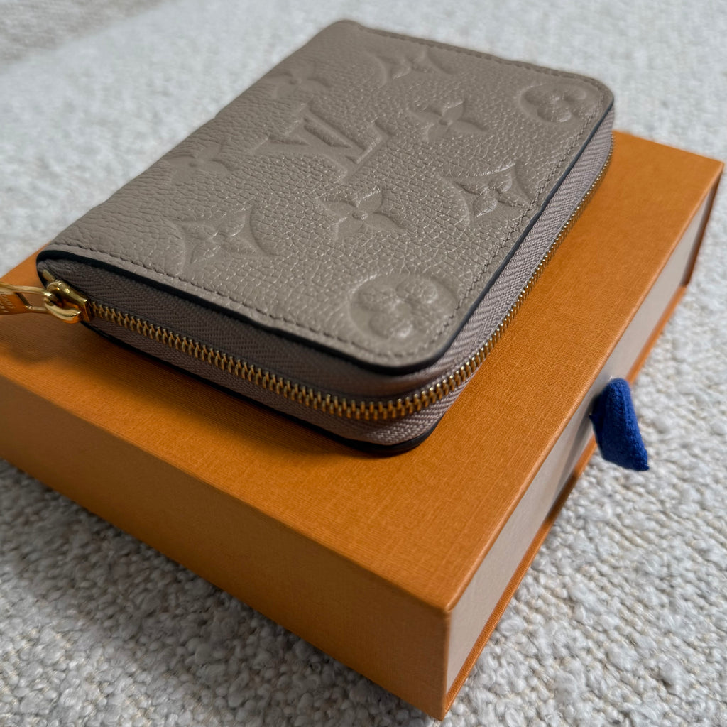 Turtledove empreinte monogram leather. Gold tone hardware. 4.3 x 3.3 x 0.8 inches.