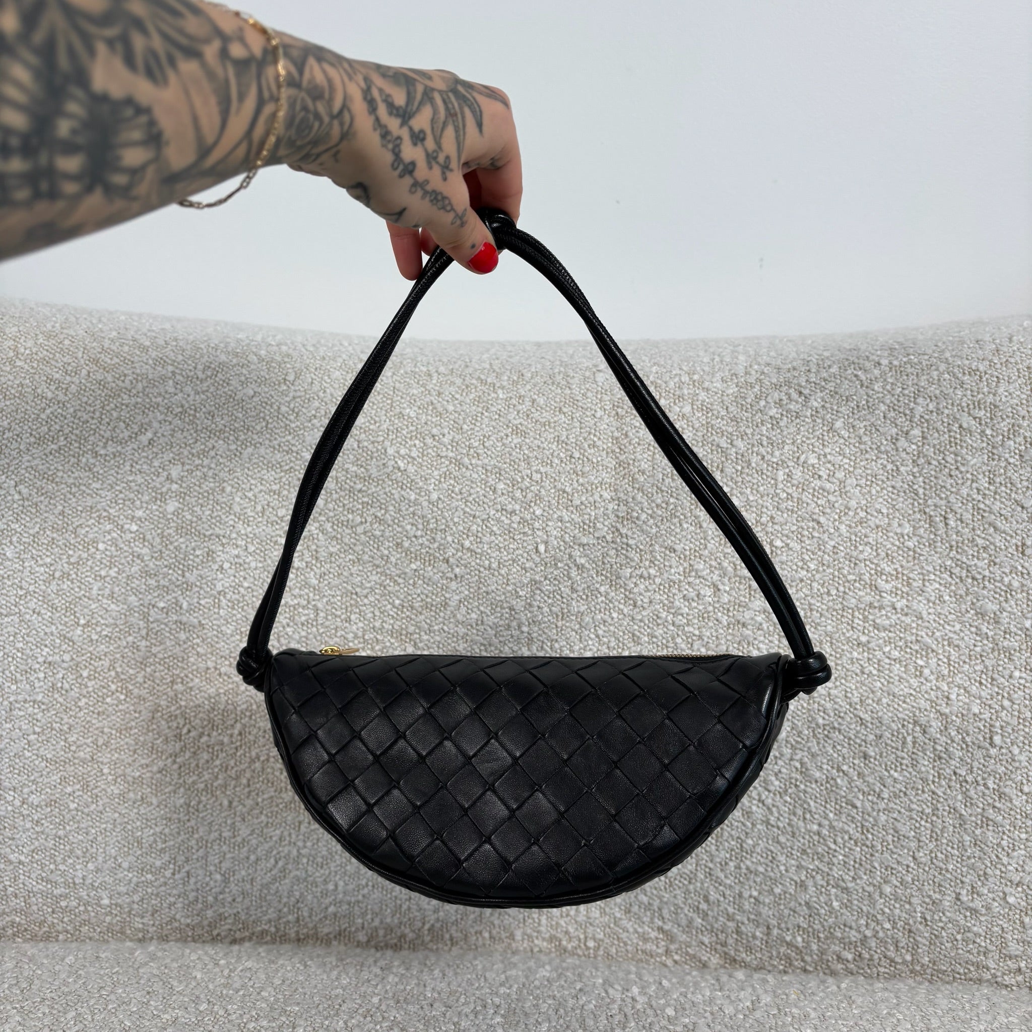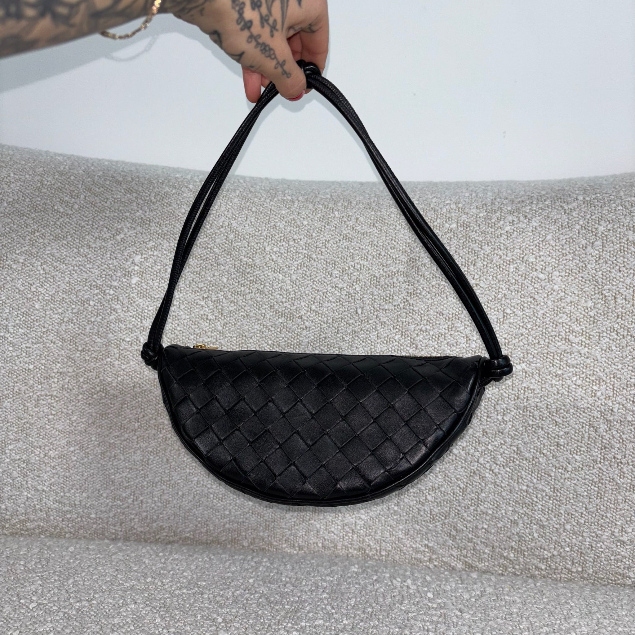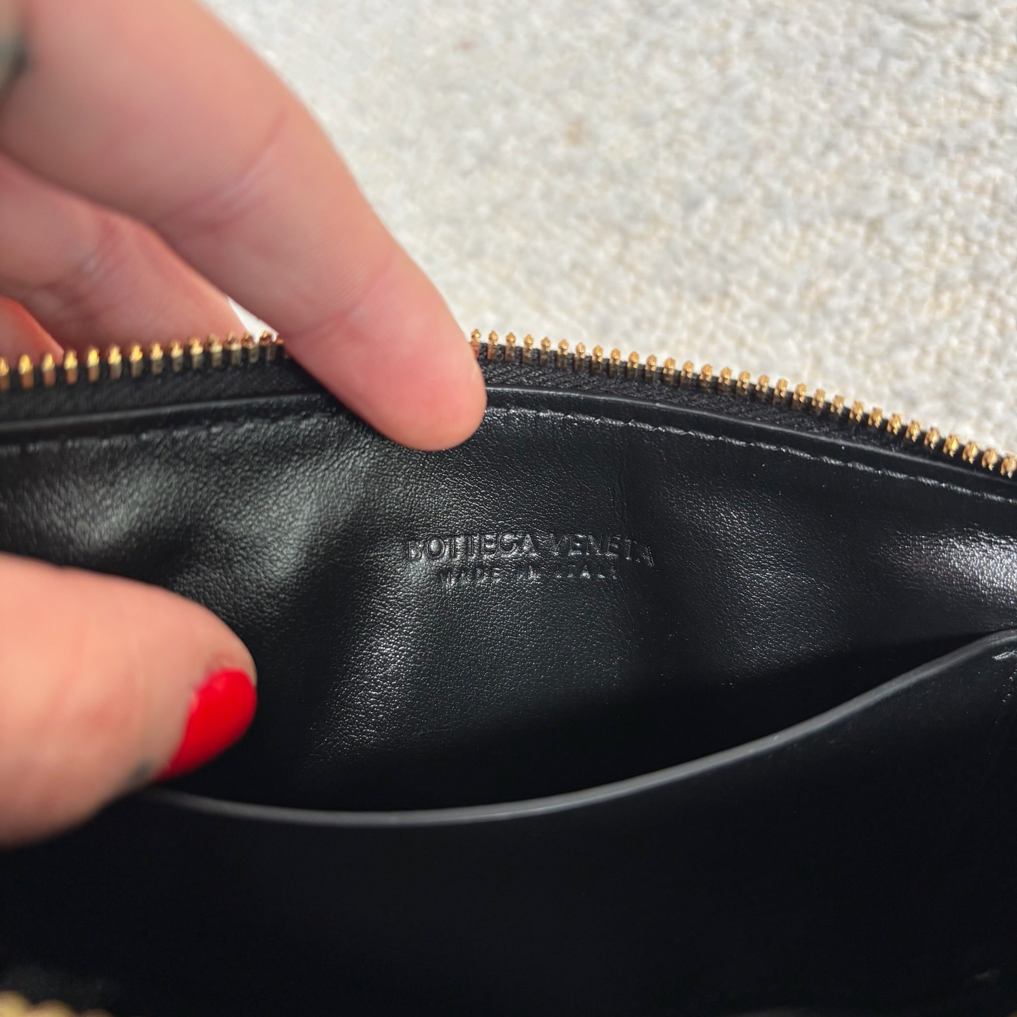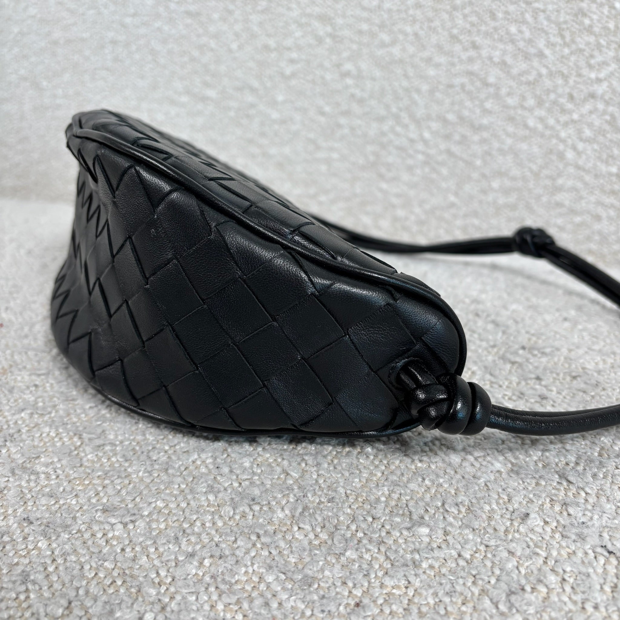 Crafted in black Intrecciato leather with gold-tone hardware.
