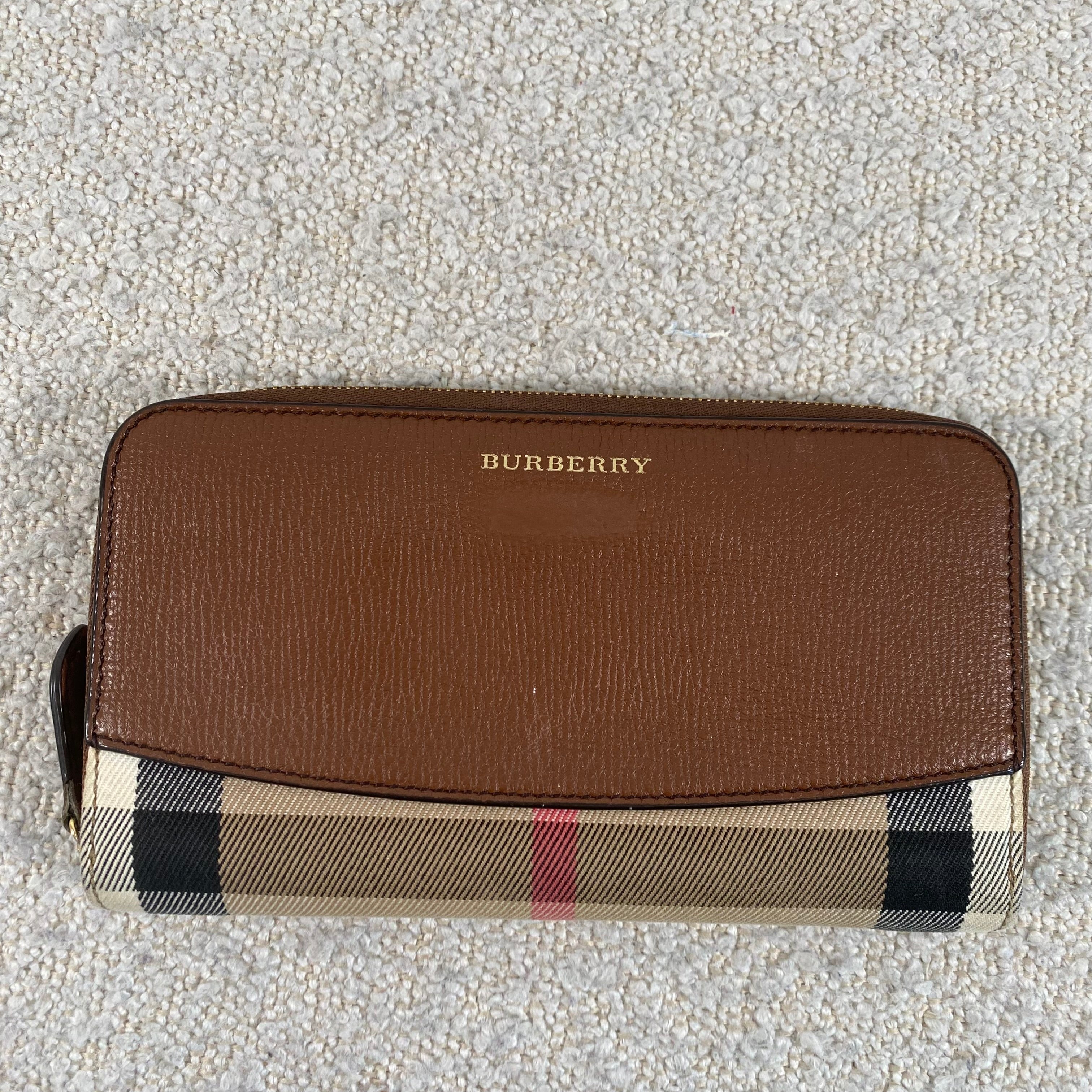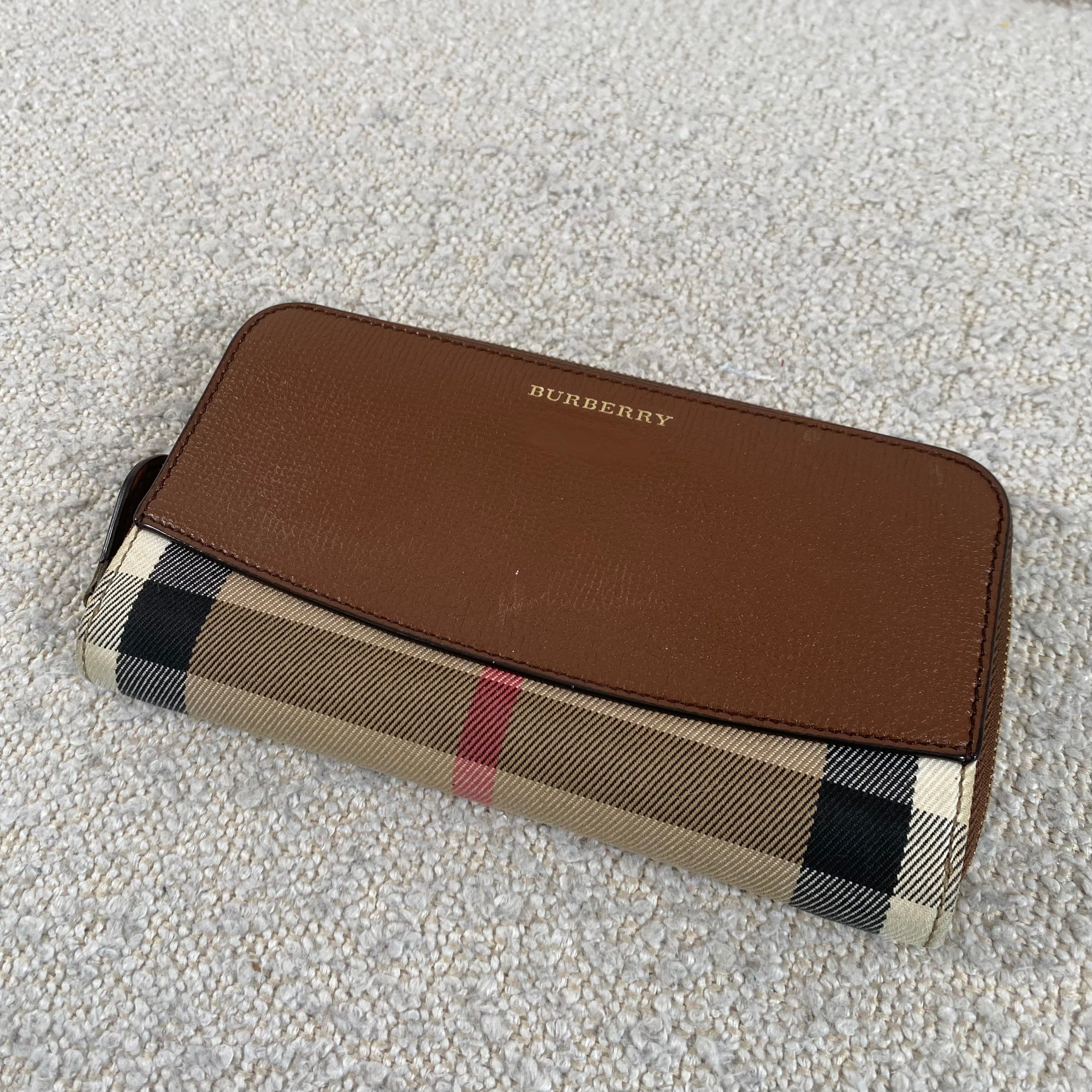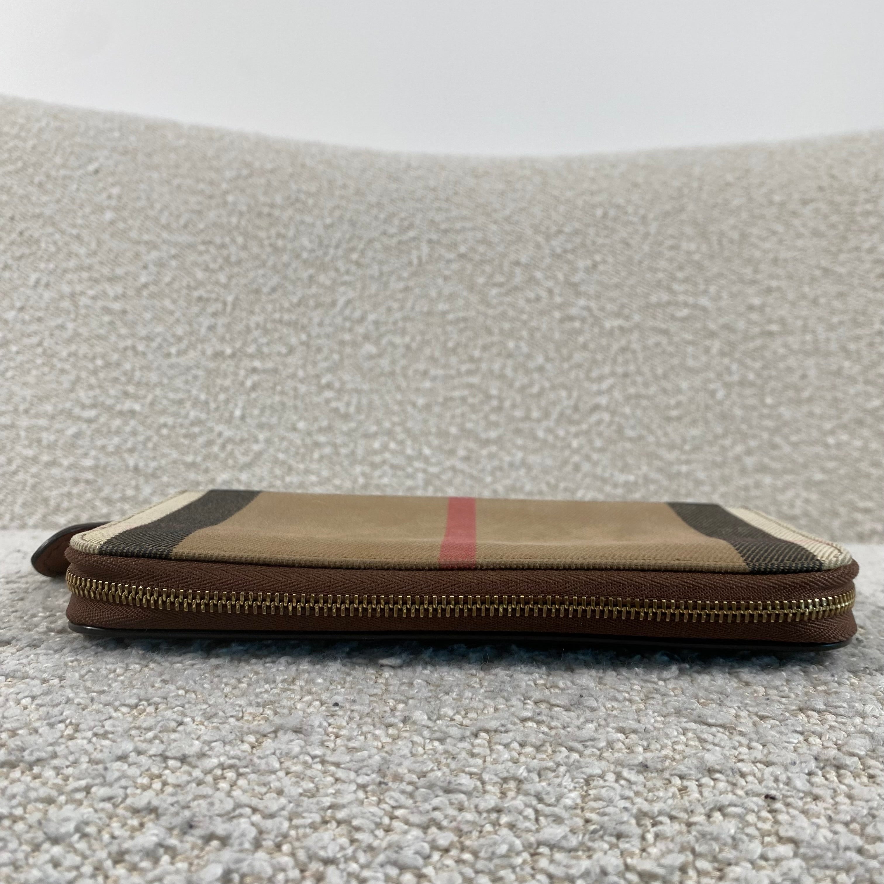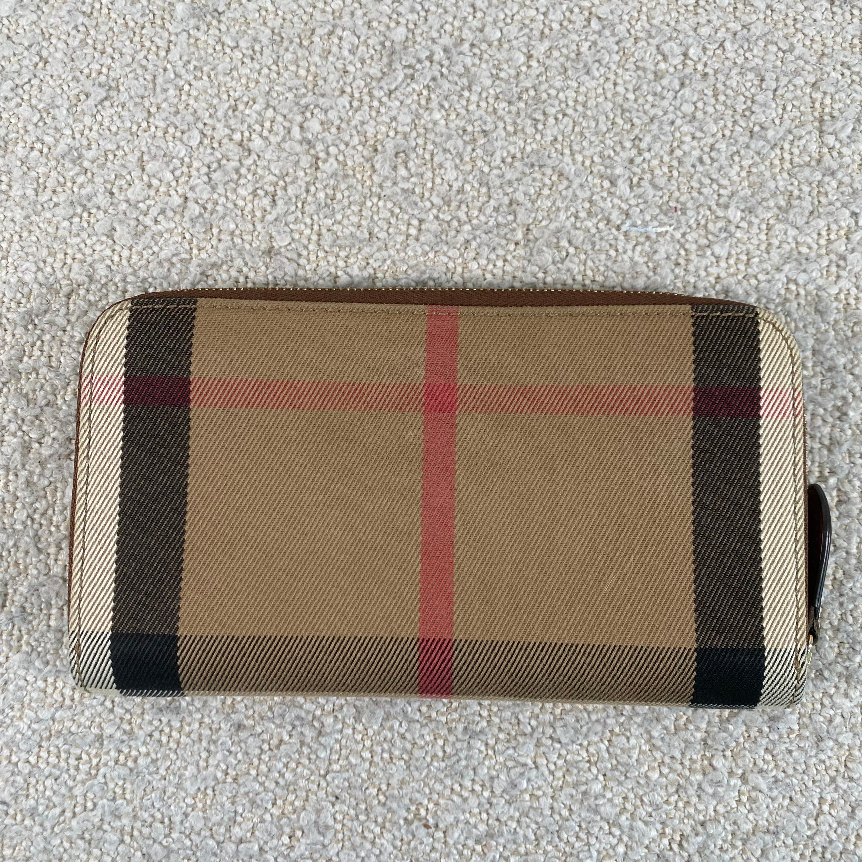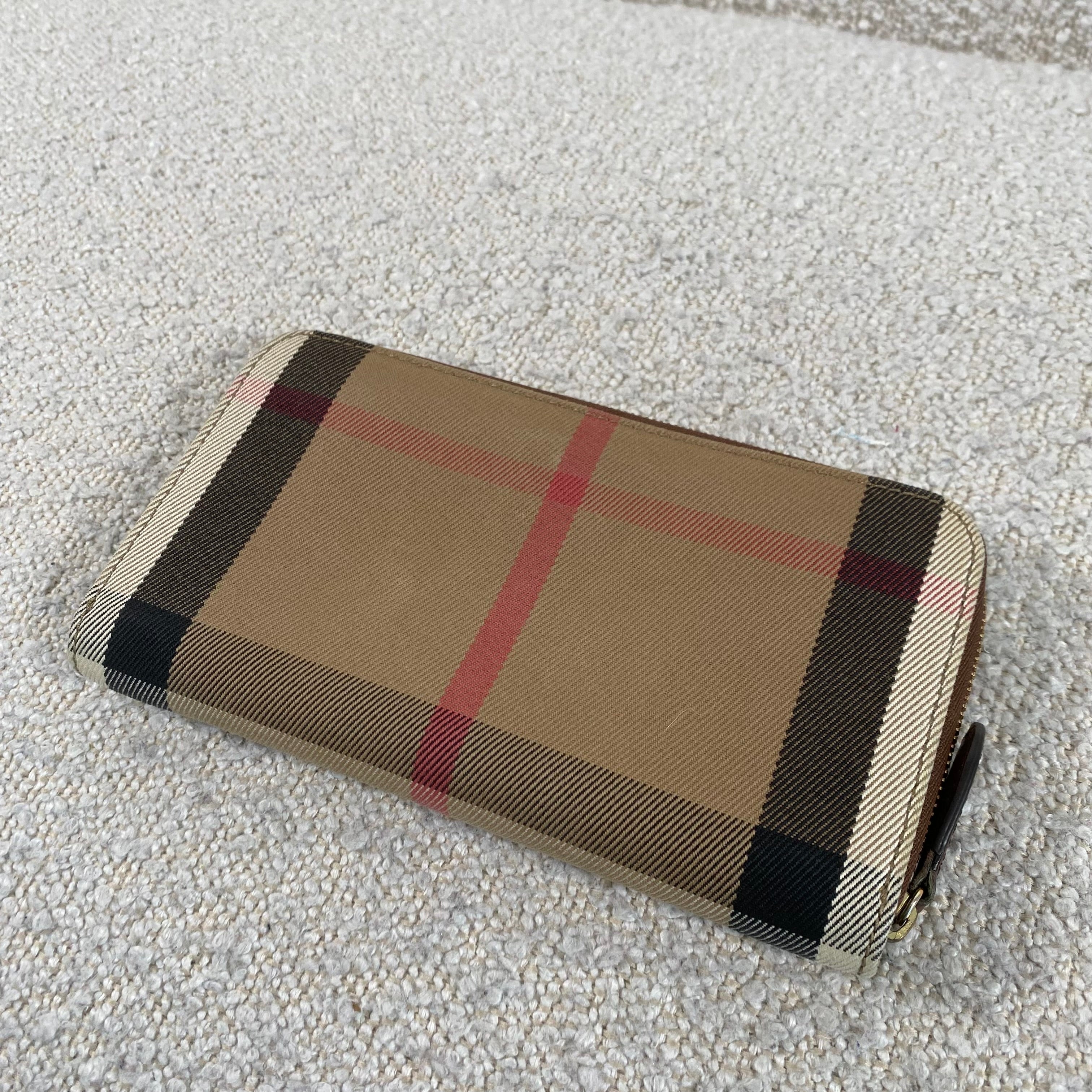 Classic Burberry check canvas with tan leather trim in a practical zip-around style that keeps everything secure and organized. A timeless everyday wallet that never goes out of style ✨
