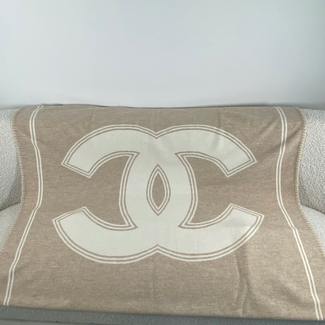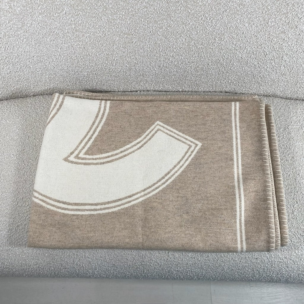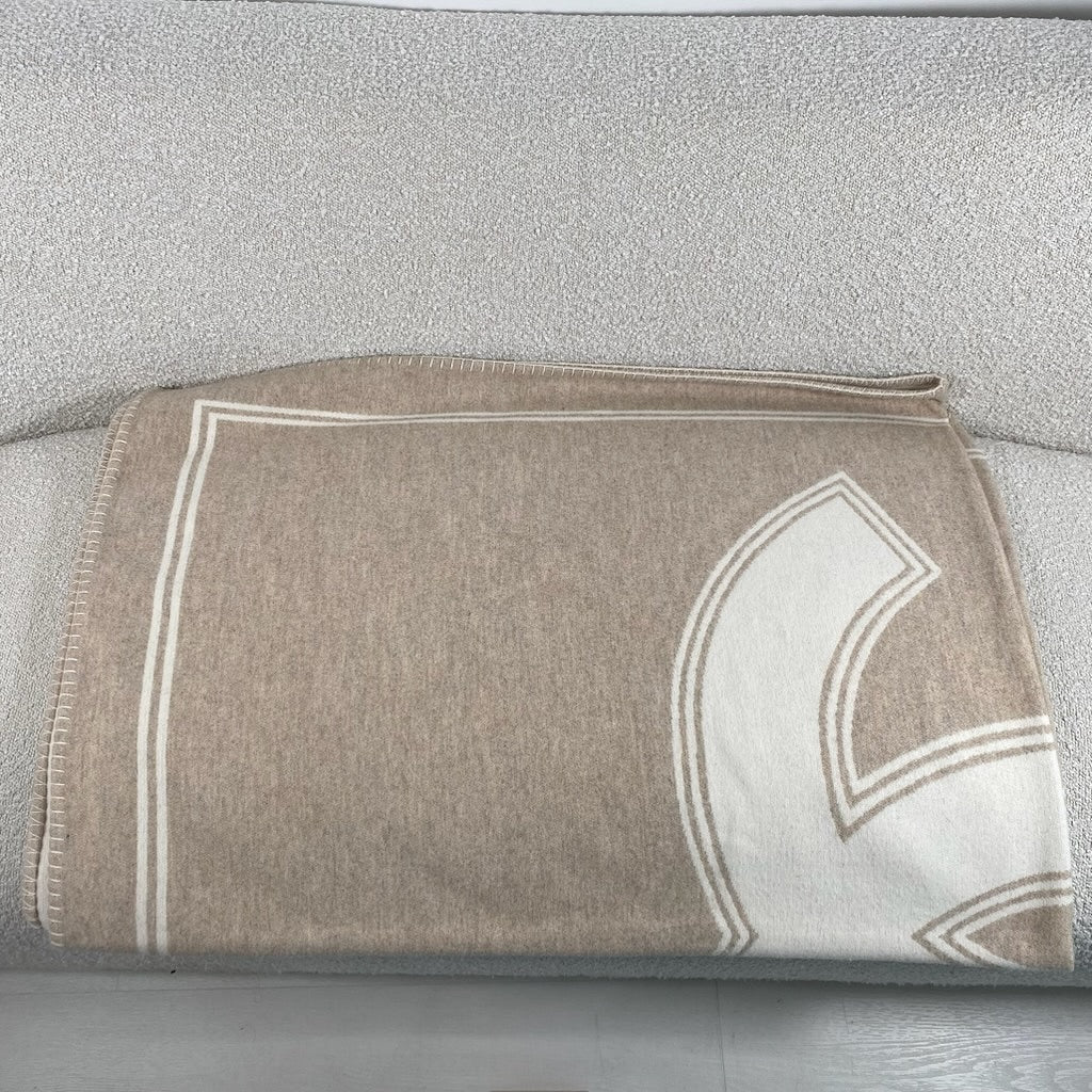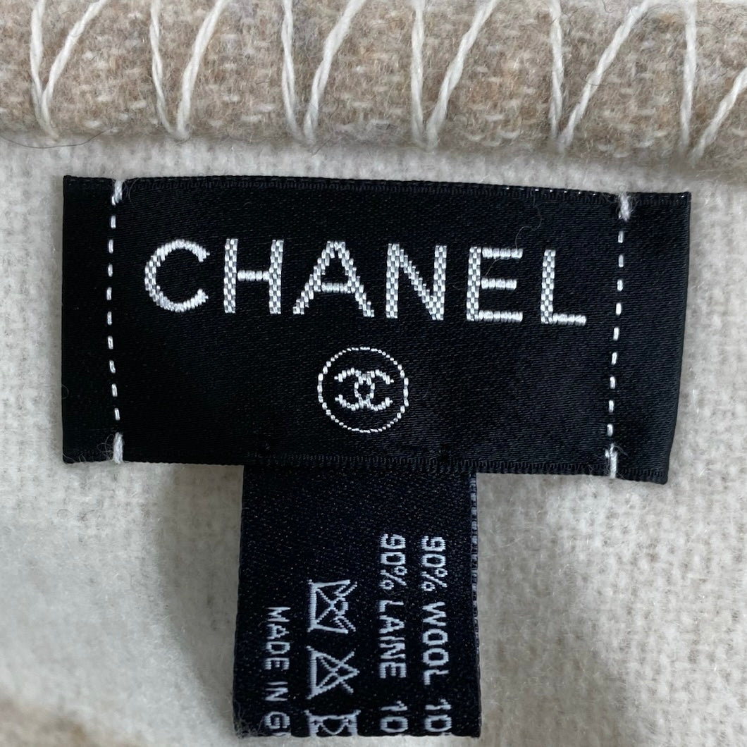 Luxurious Chanel blanket in a beige and white colorway, crafted from a premium blend of 90% merino wool and 10% cashmere for an exceptionally soft and sophisticated feel.
