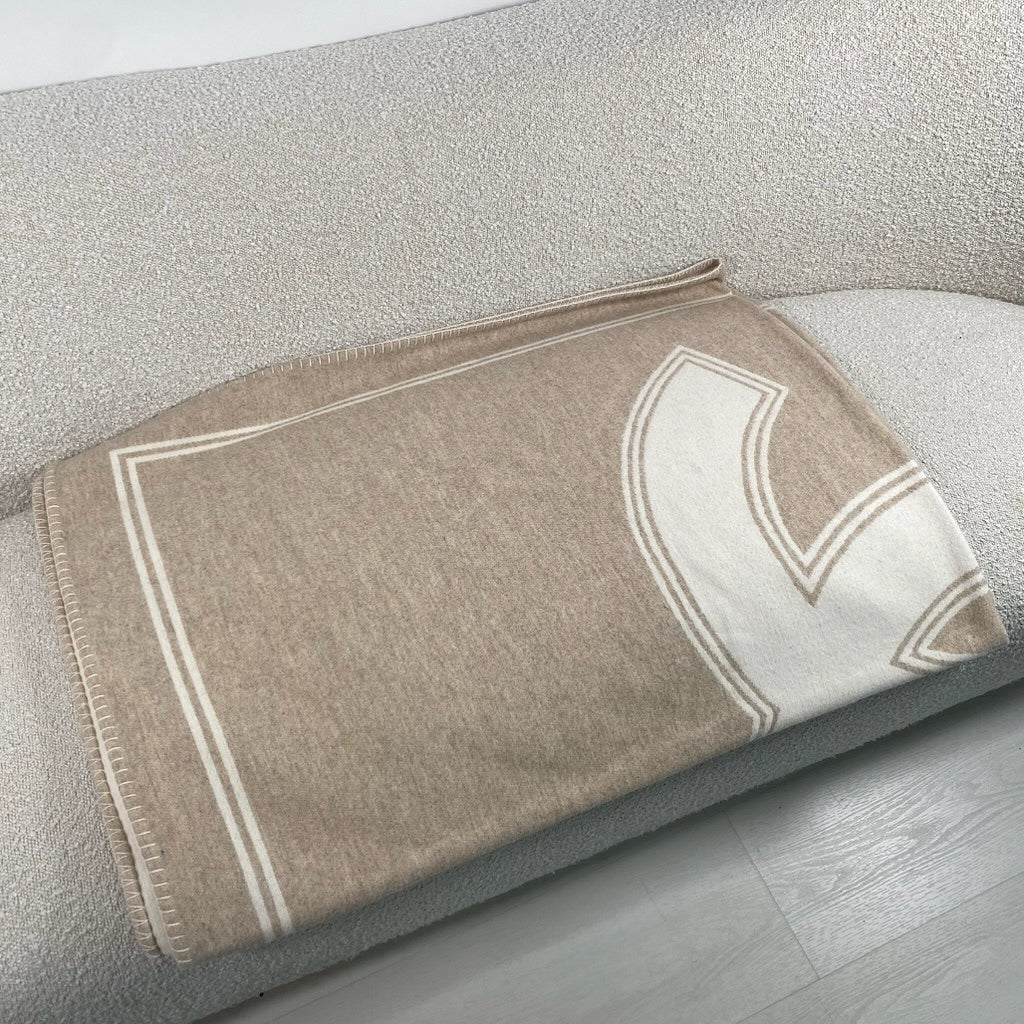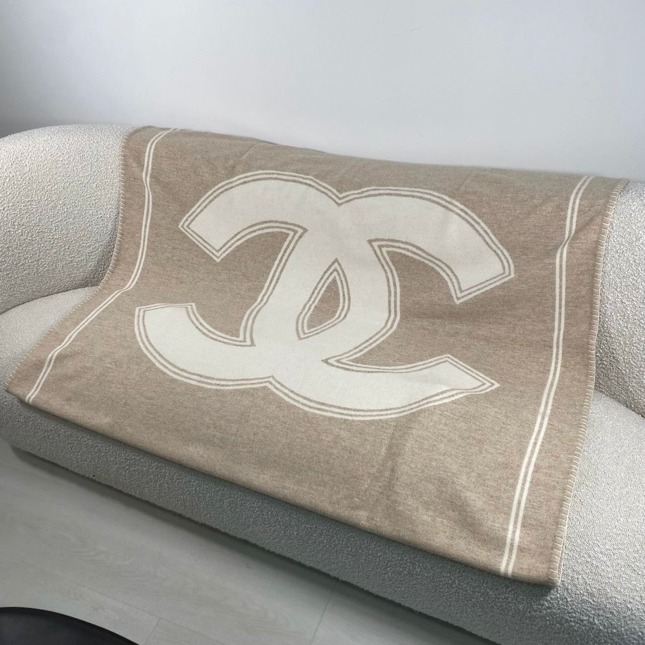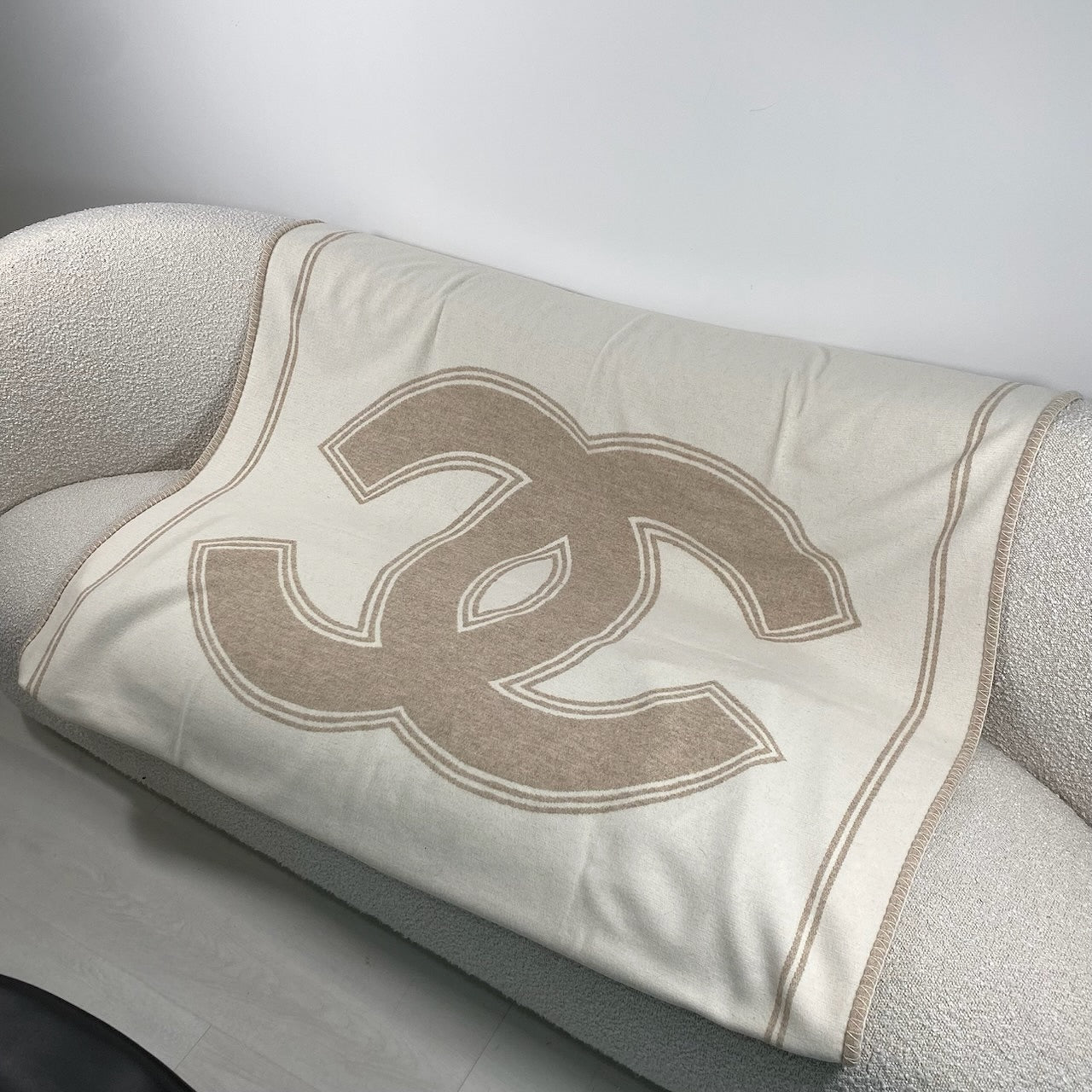 Luxurious Chanel blanket in a beige and white colorway, crafted from a premium blend of 90% merino wool and 10% cashmere for an exceptionally soft and sophisticated feel.