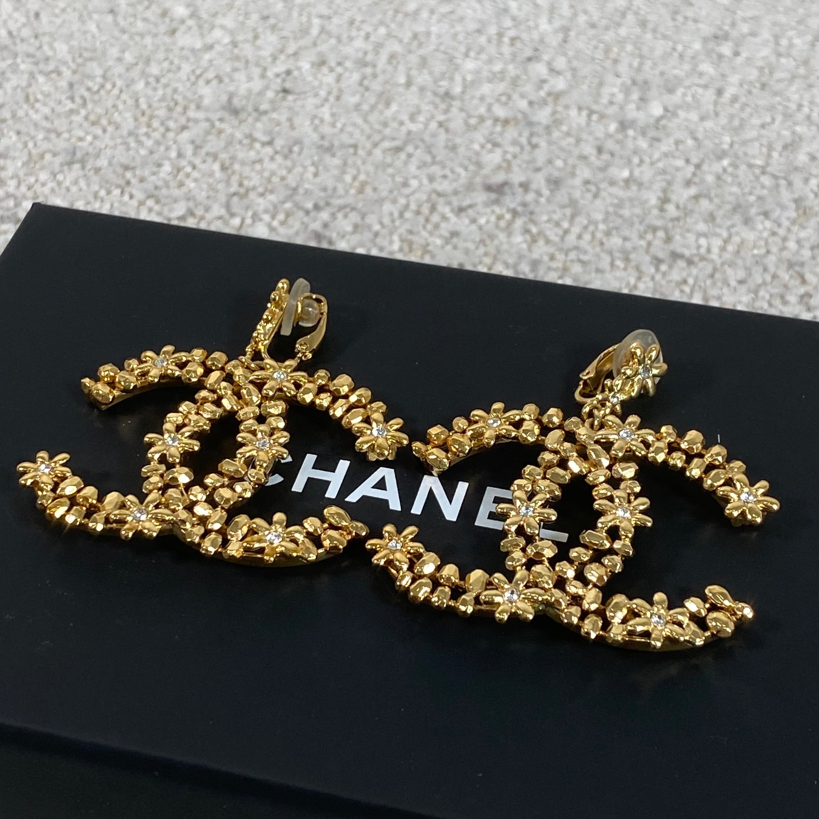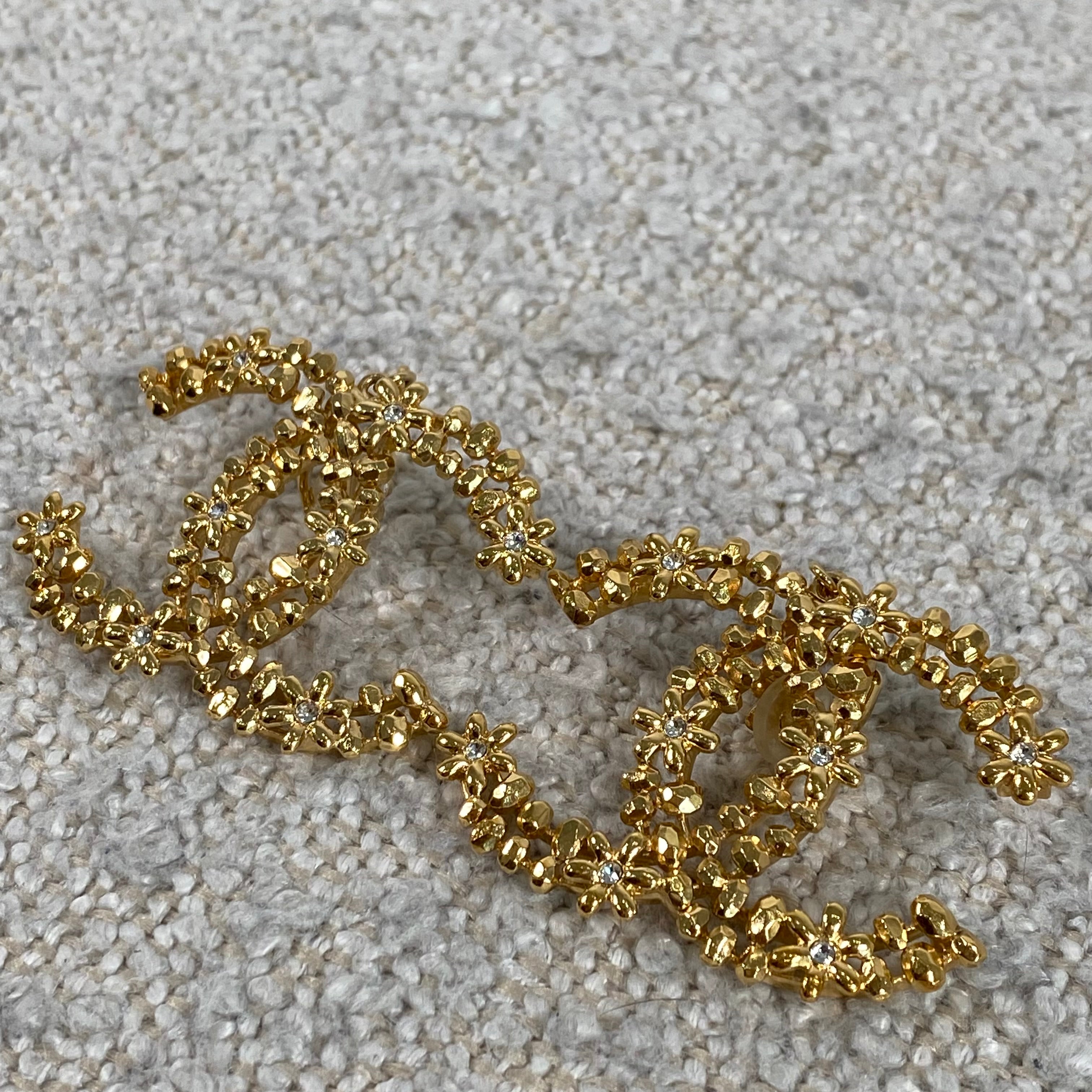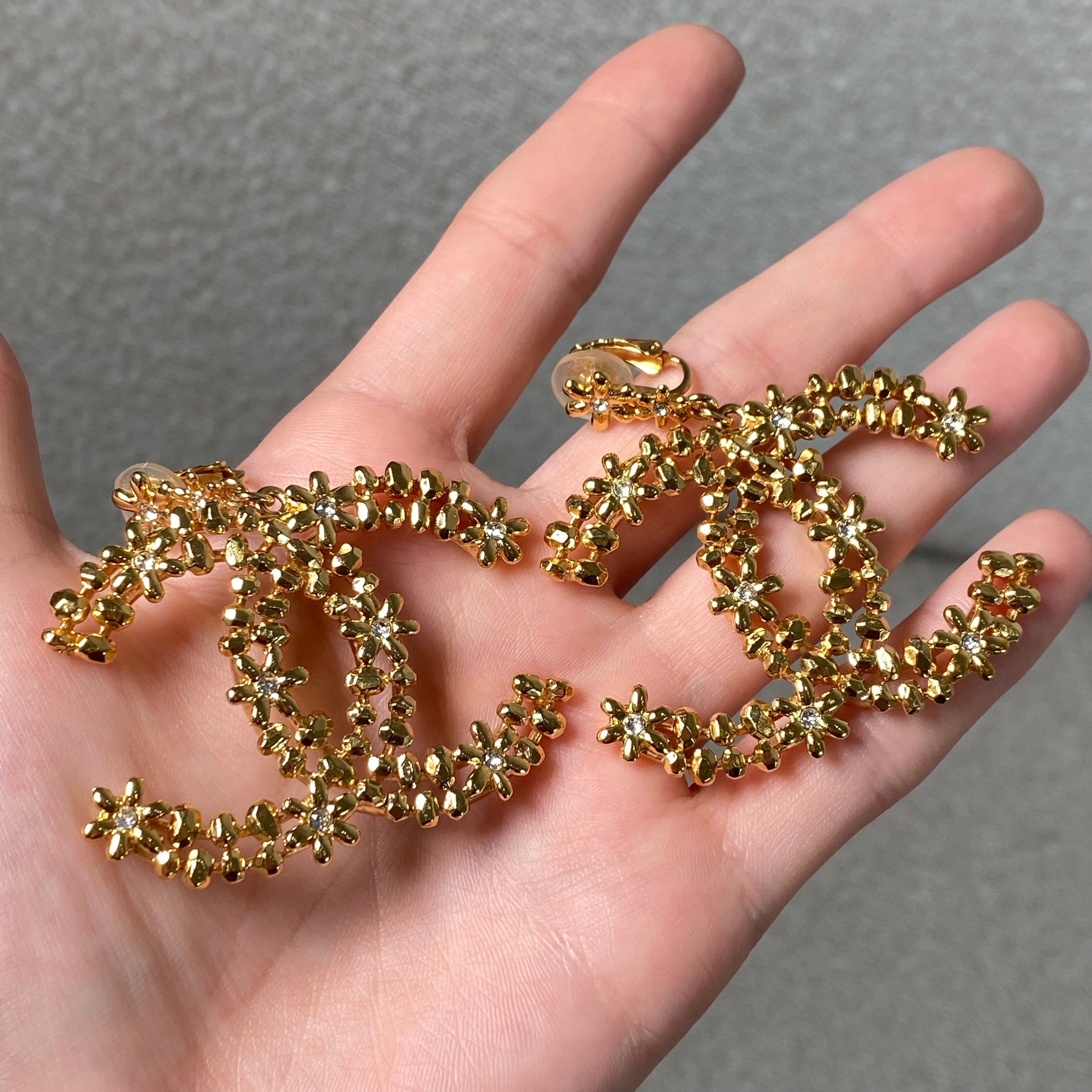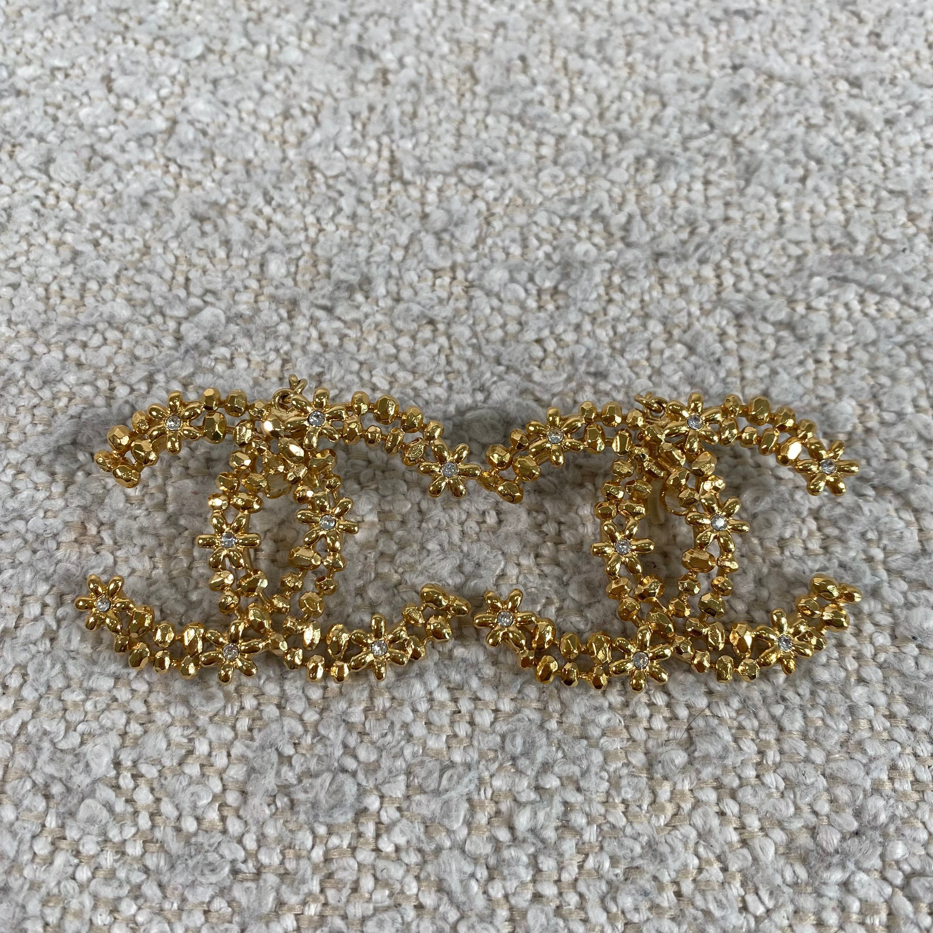 A stunning pair of statement CC floral motif clip-on earrings in a rich gold-tone finish, detailed with delicate crystal accents throughout. These feature a comfortable clip-on style, making them perfect for both pierced and non-pierced ears while still delivering that bold, unmistakable designer look.