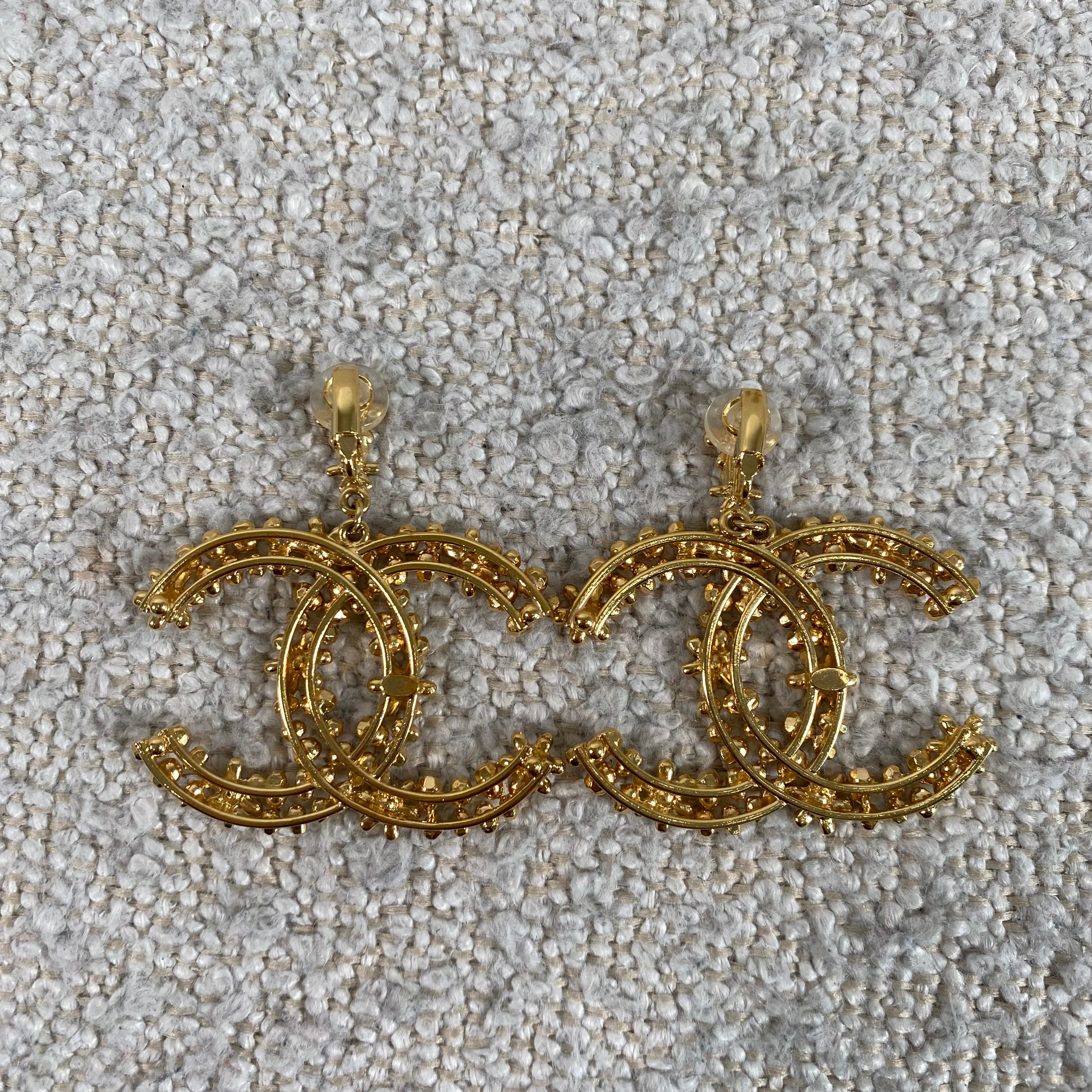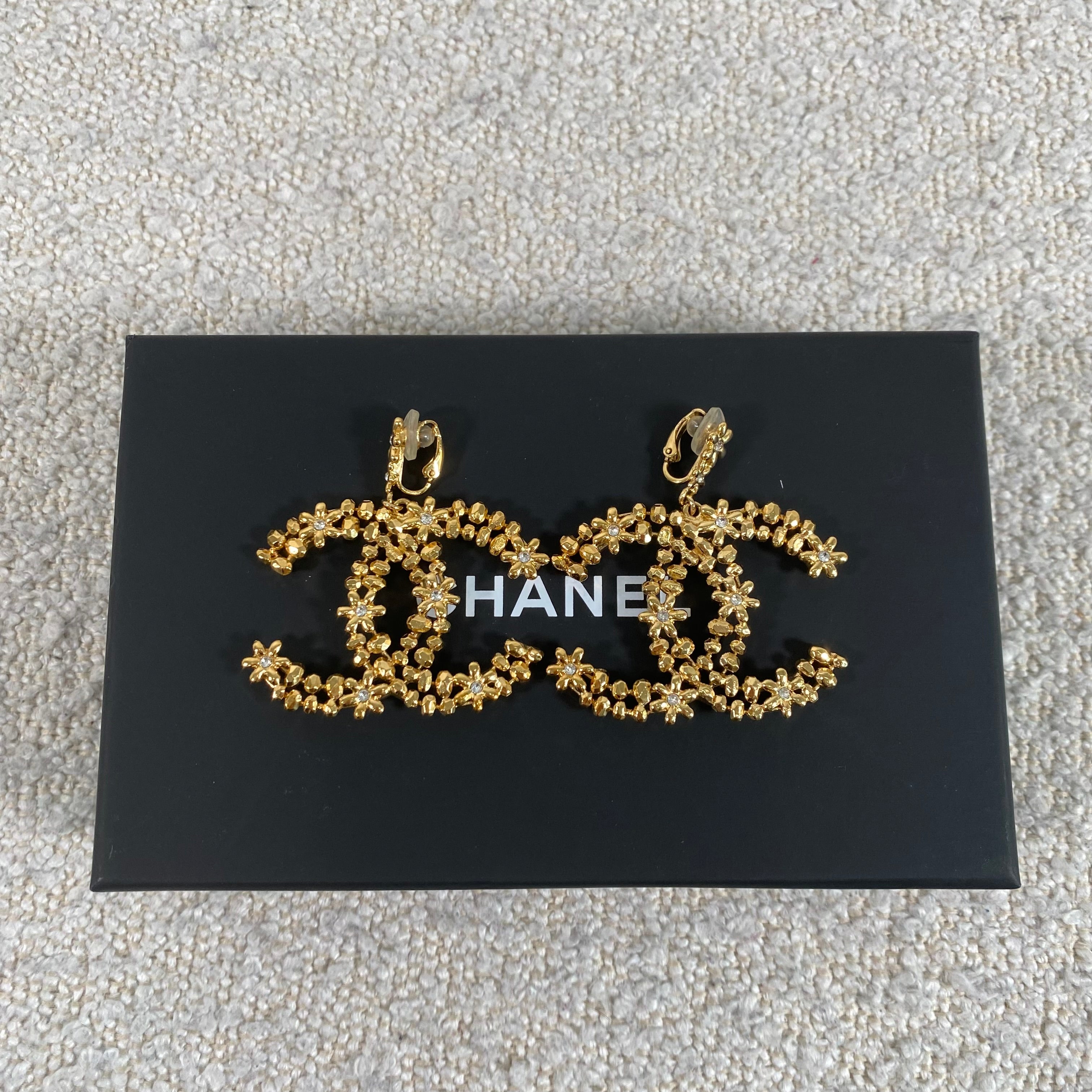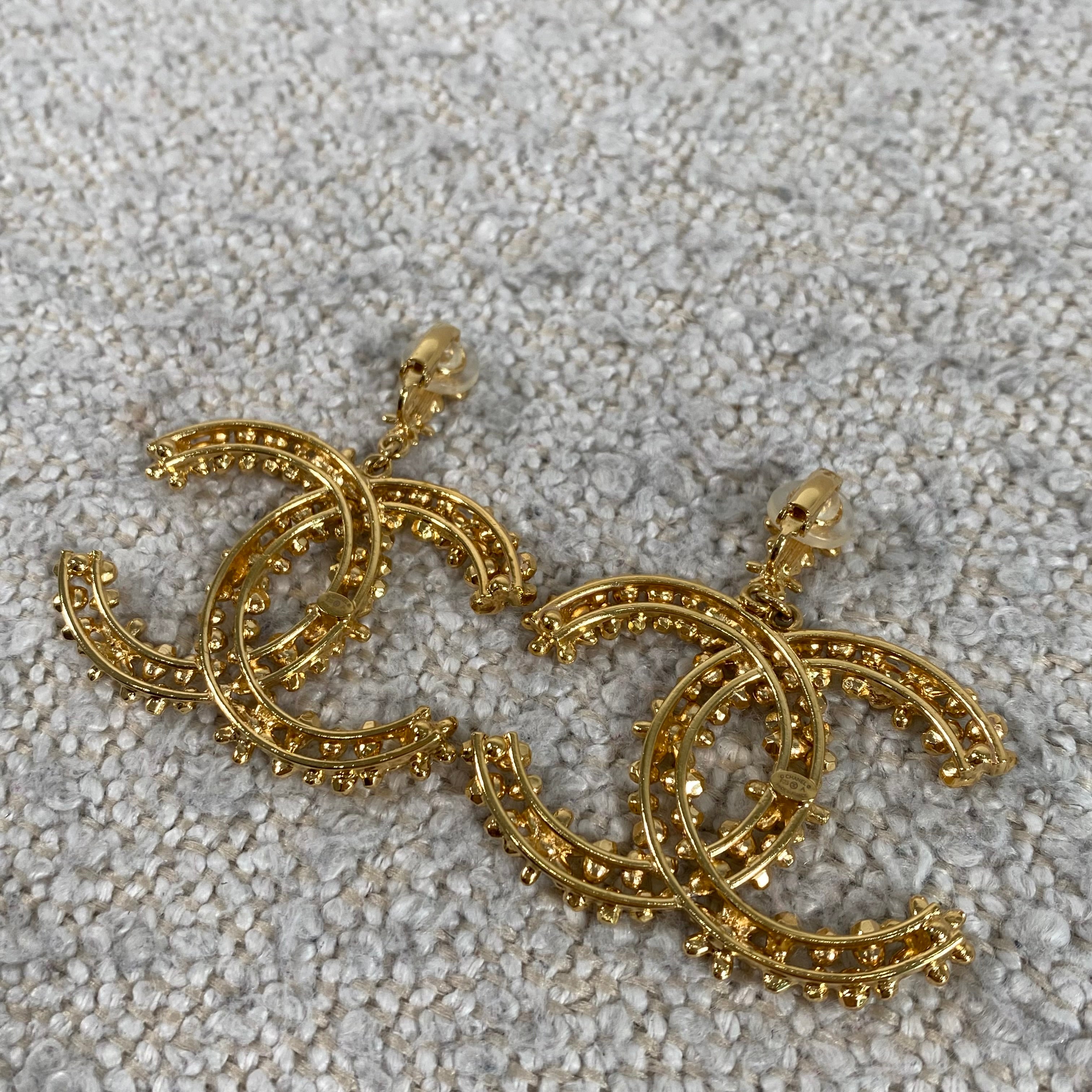 A stunning pair of statement CC floral motif clip-on earrings in a rich gold-tone finish, detailed with delicate crystal accents throughout. These feature a comfortable clip-on style, making them perfect for both pierced and non-pierced ears while still delivering that bold, unmistakable designer look.