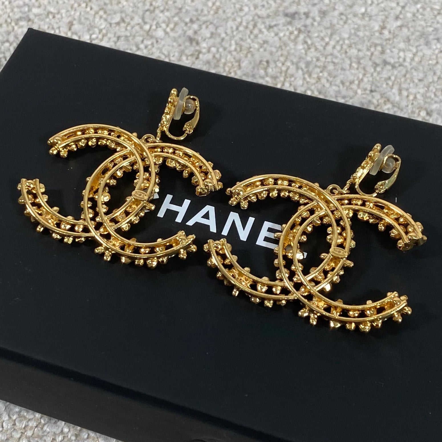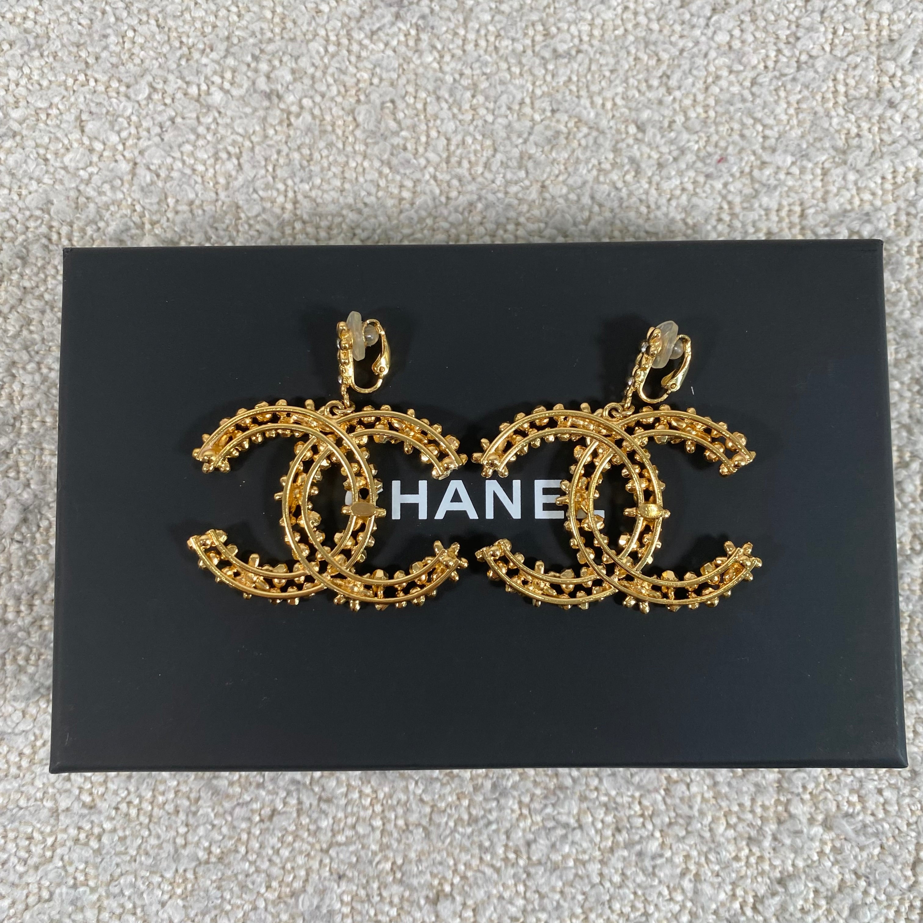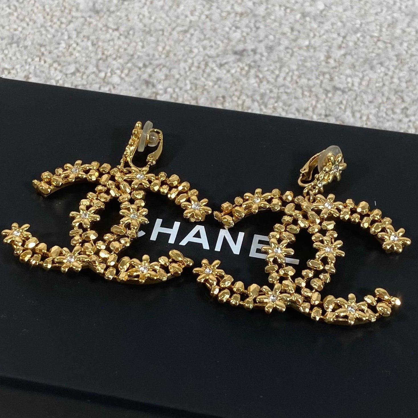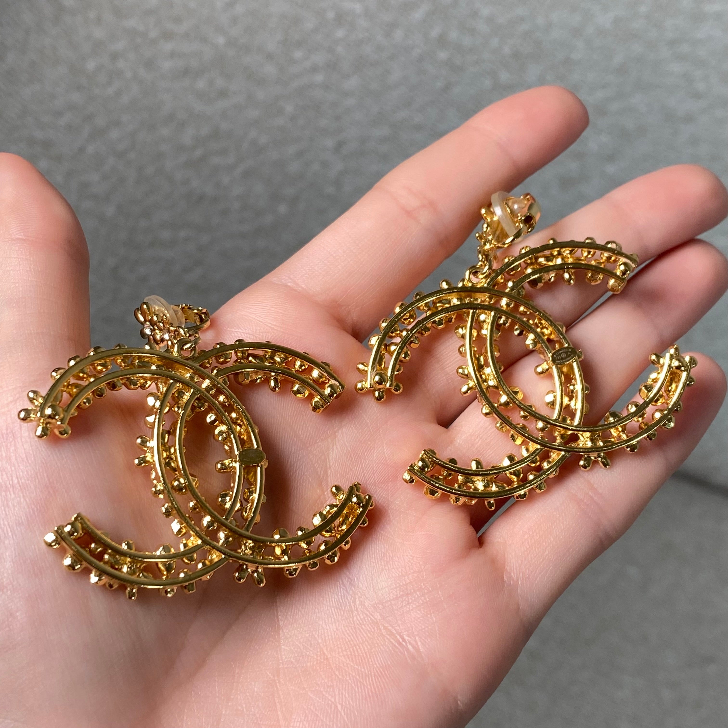 A stunning pair of statement CC floral motif clip-on earrings in a rich gold-tone finish, detailed with delicate crystal accents throughout. These feature a comfortable clip-on style, making them perfect for both pierced and non-pierced ears while still delivering that bold, unmistakable designer look.