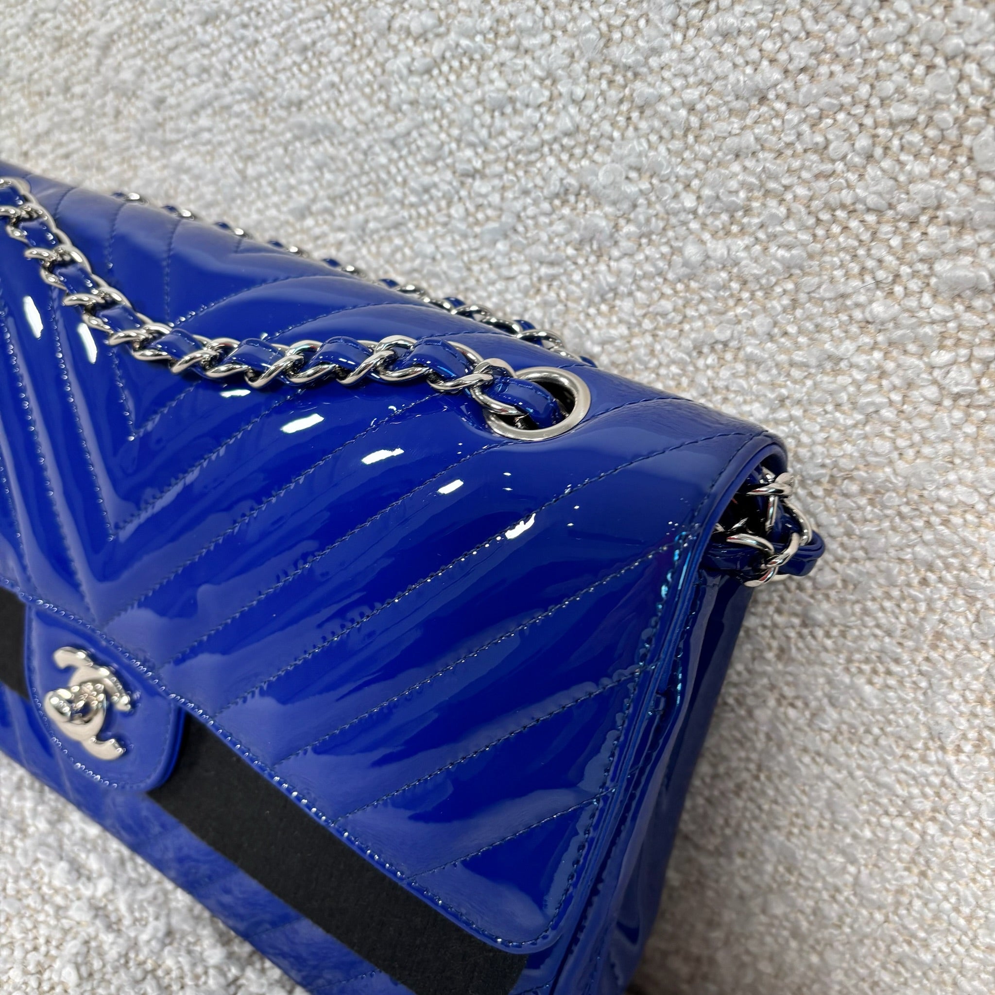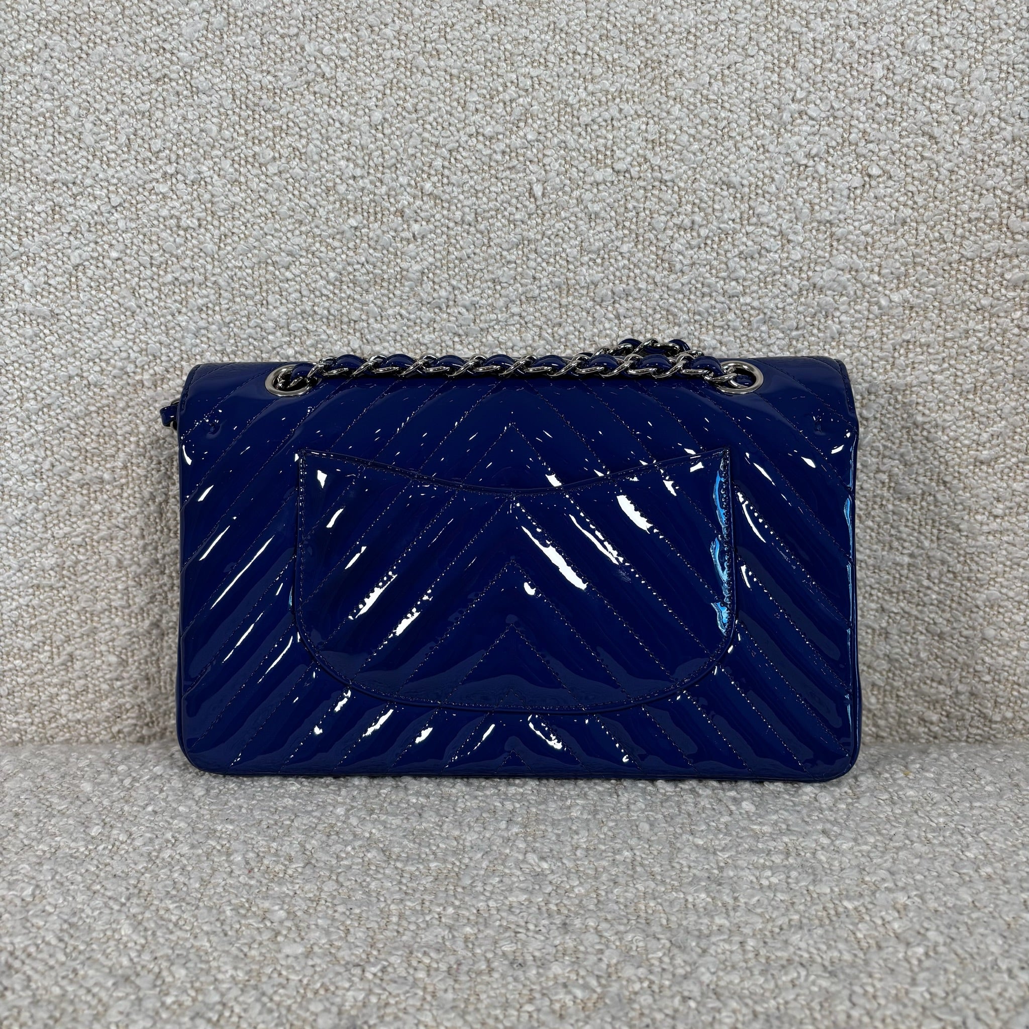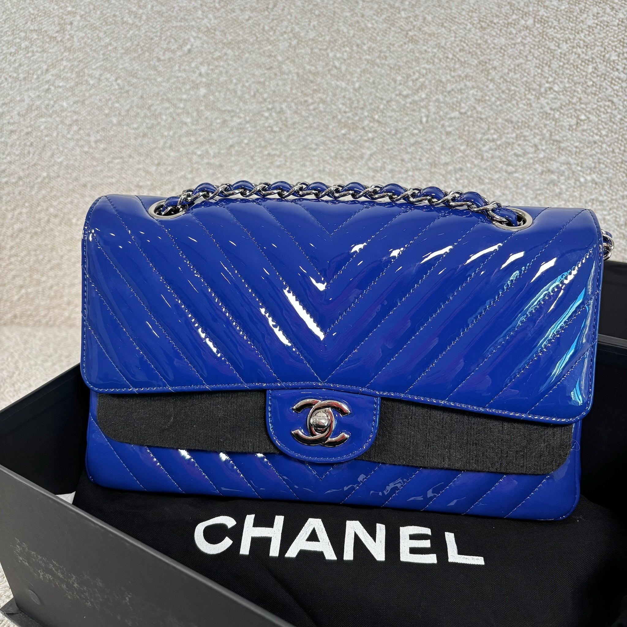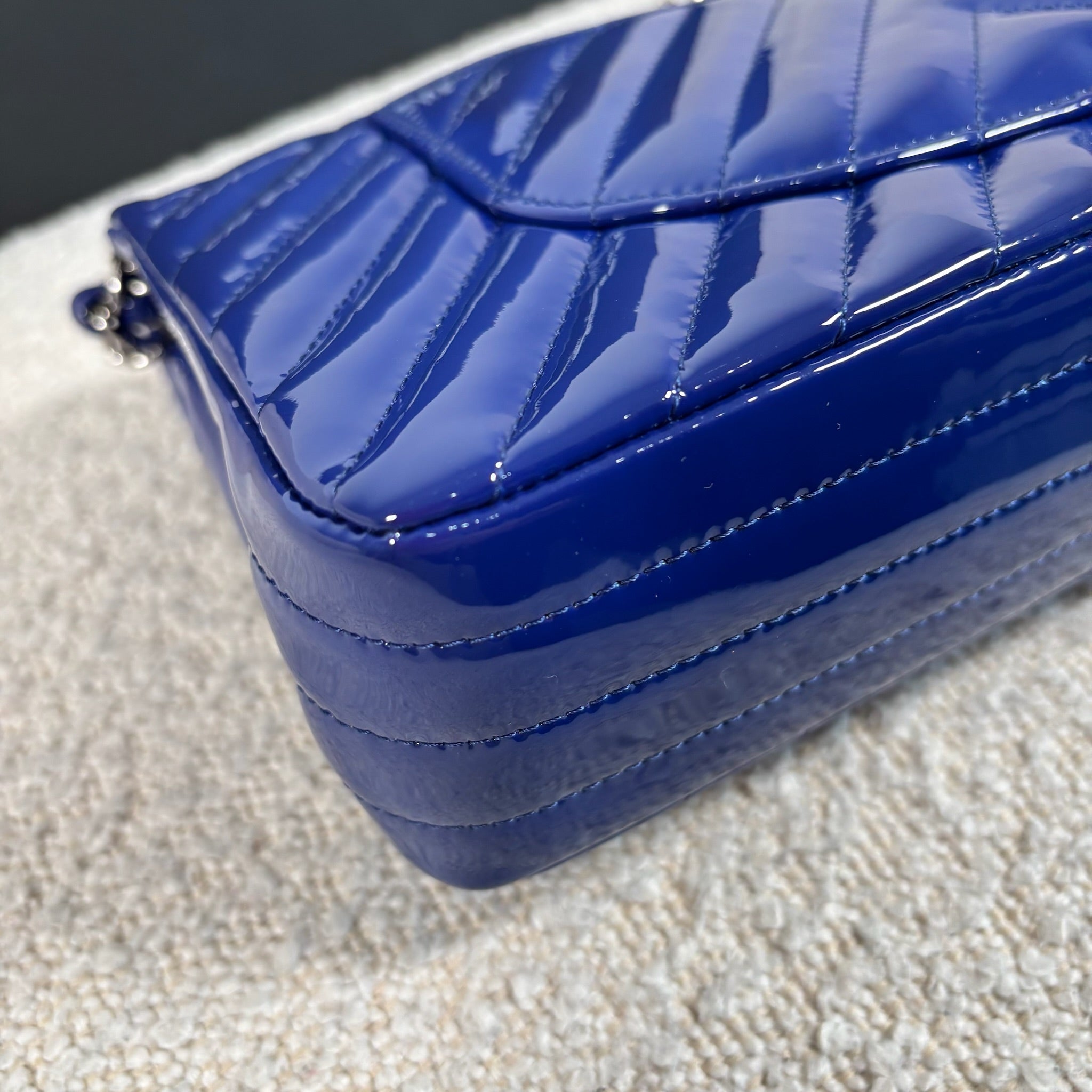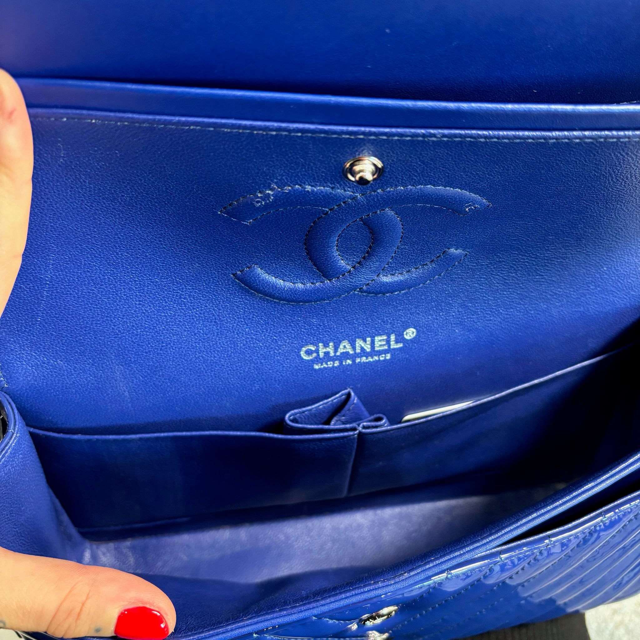 Pre-owned Chanel Classic Flap Chevron Blue Patent Leather Medium