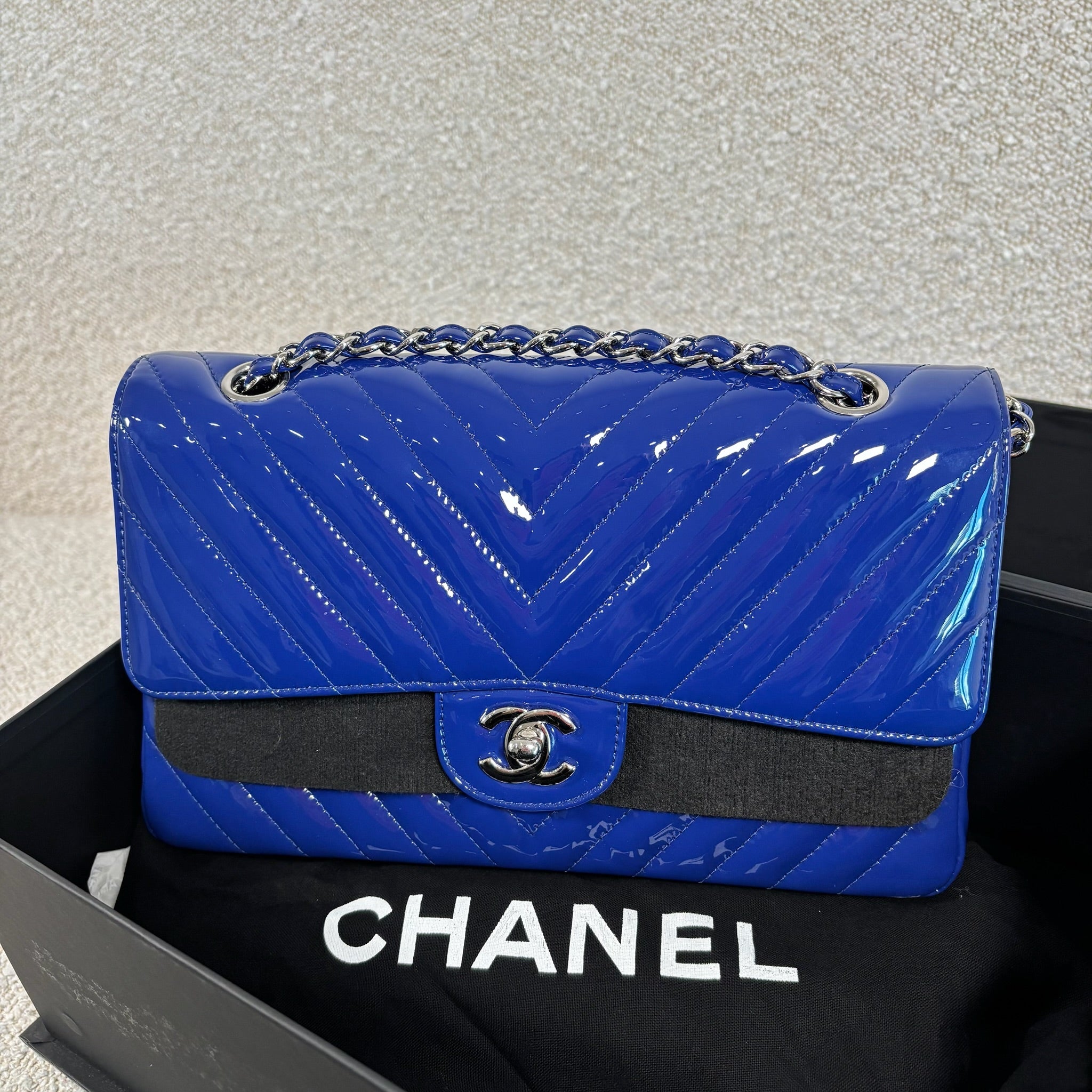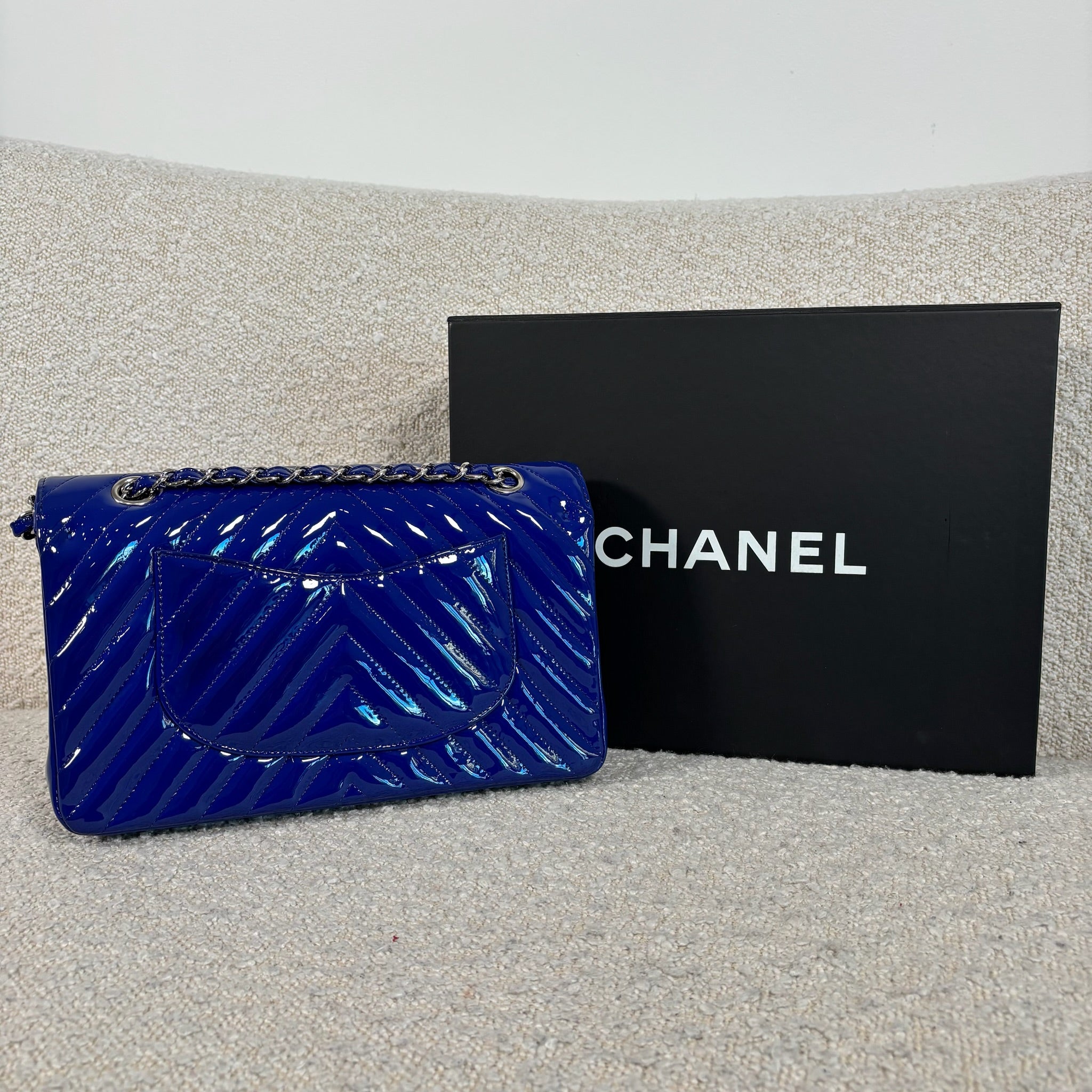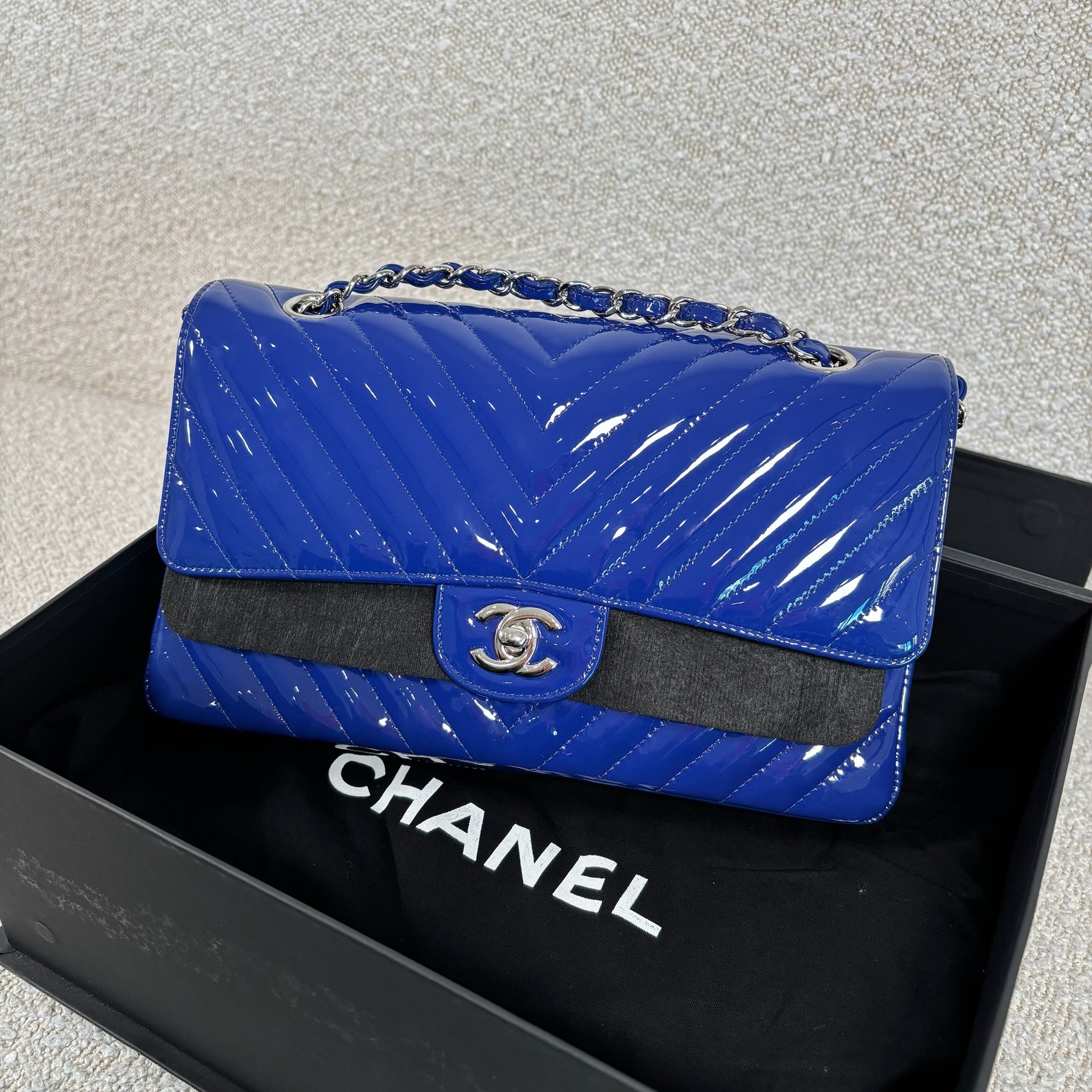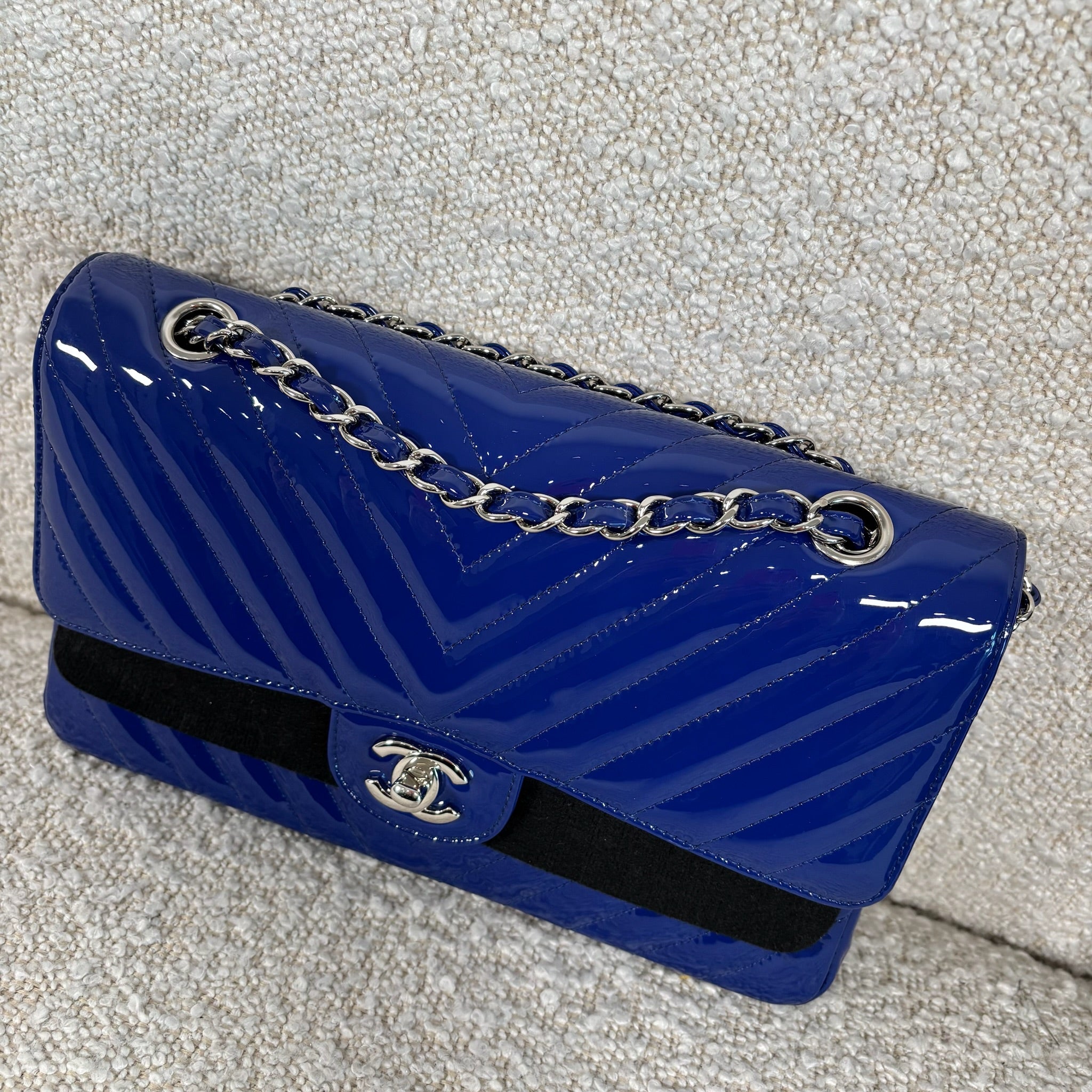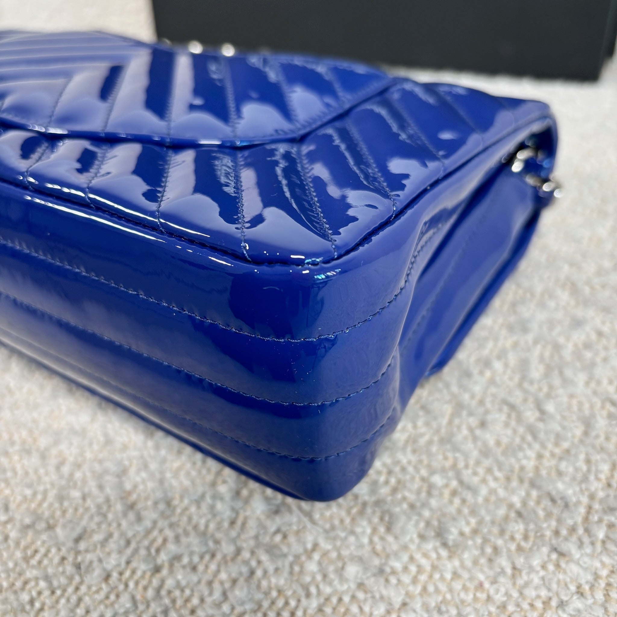 Pre-owned Chanel Classic Flap Chevron Blue Patent Leather Medium