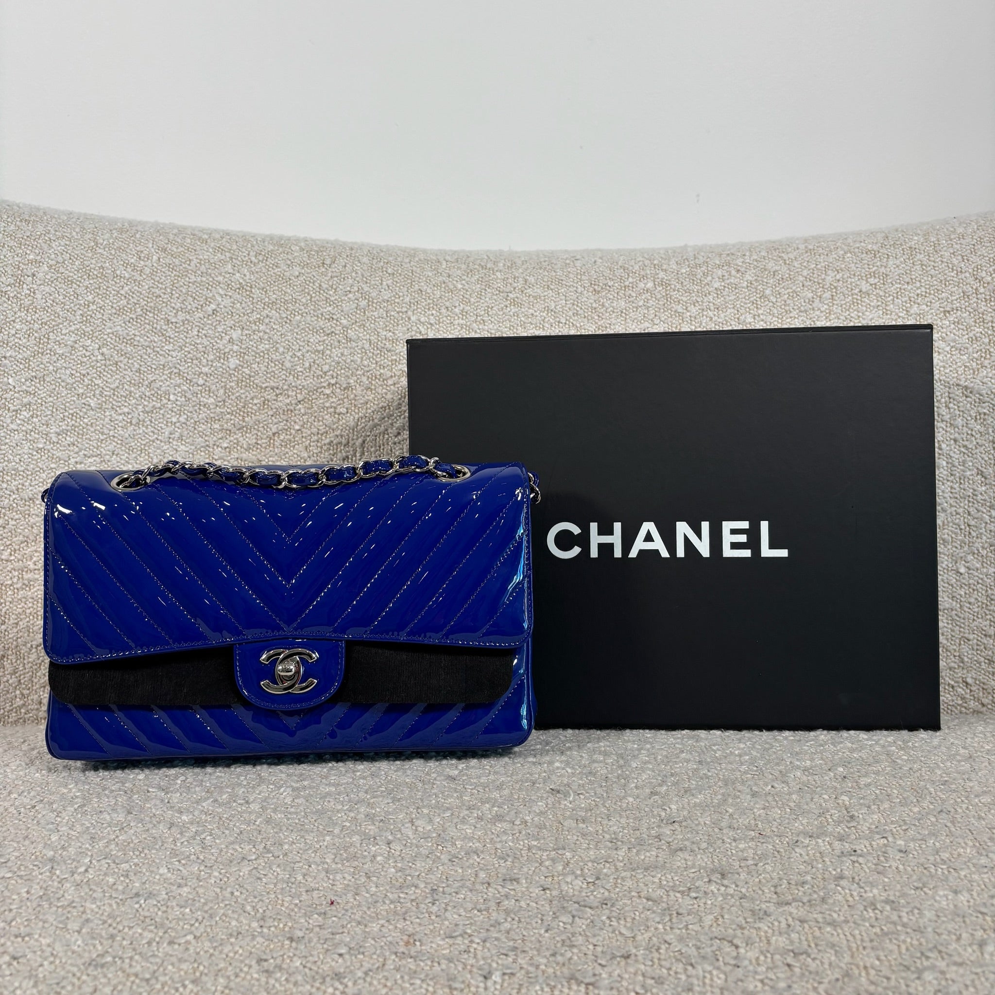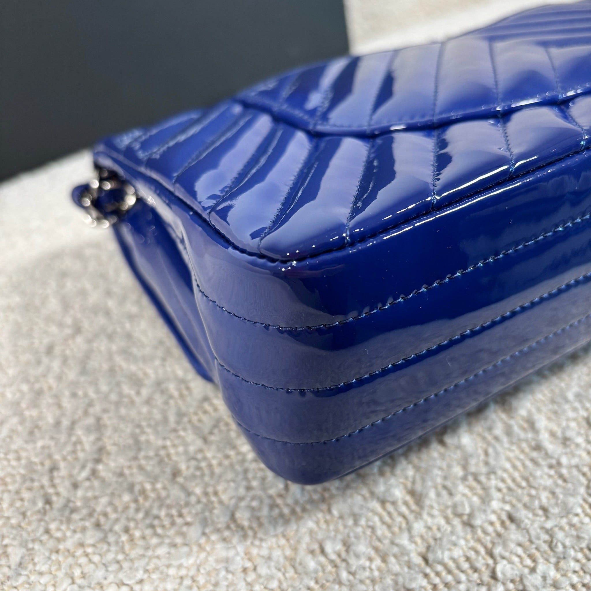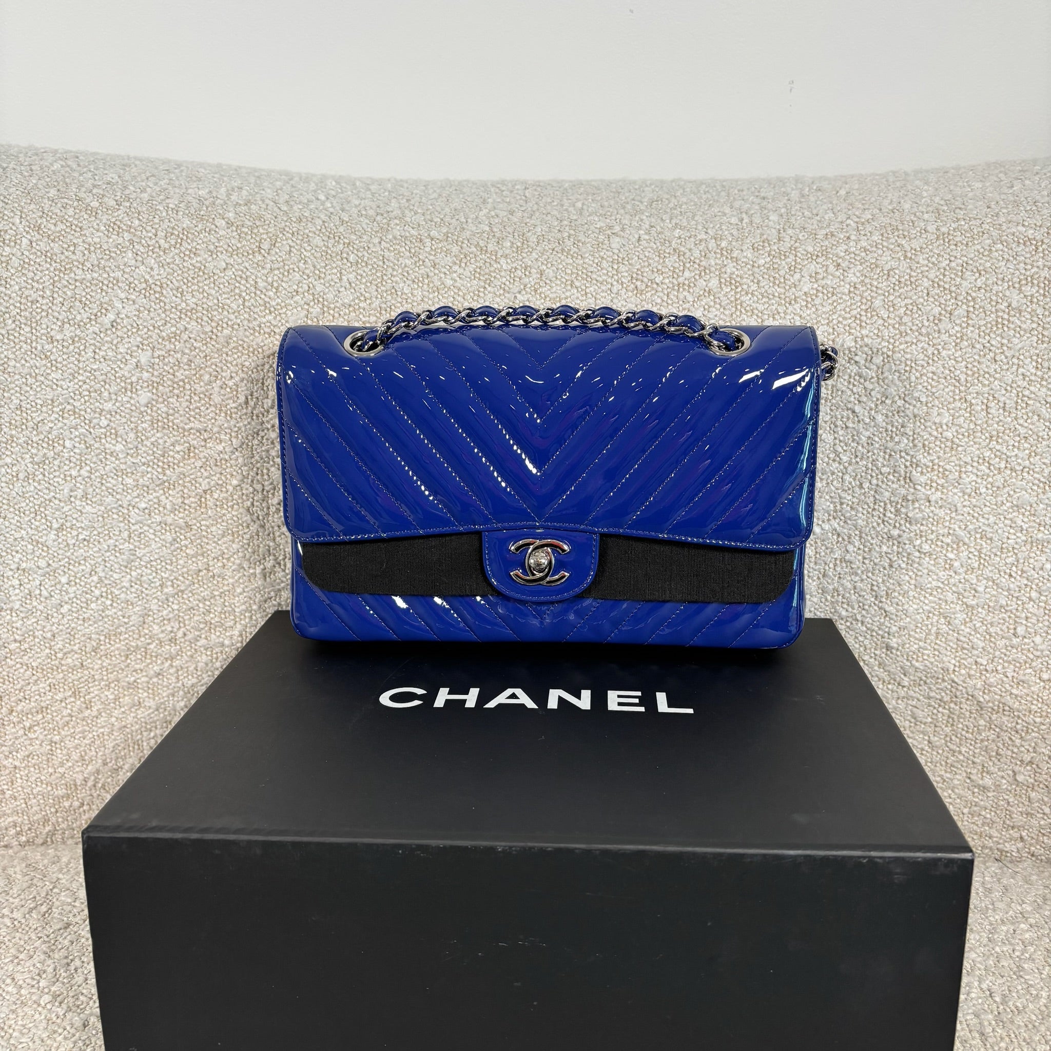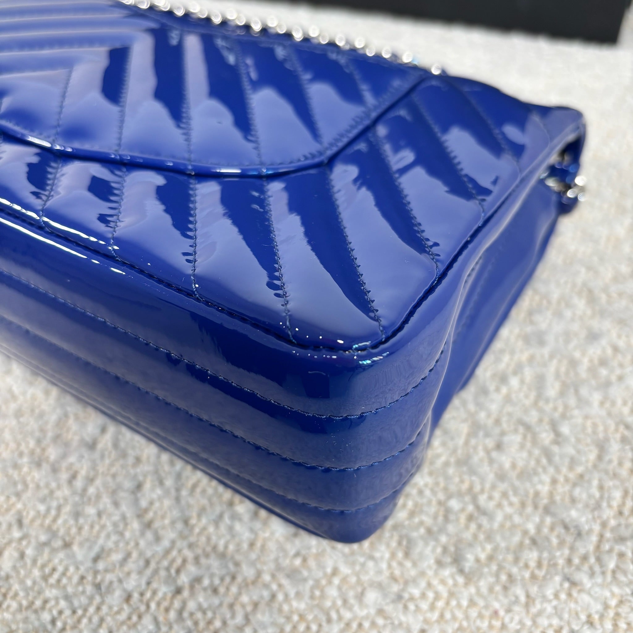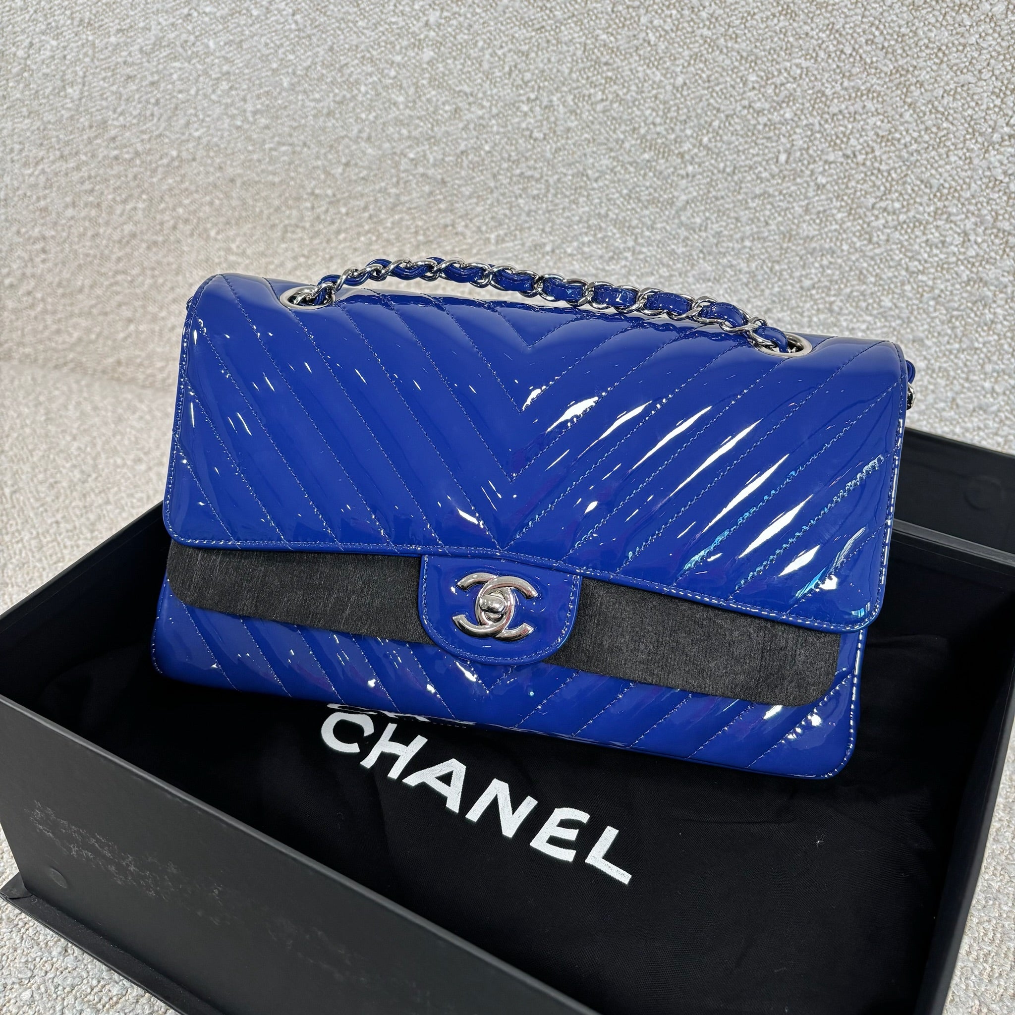 Pre-owned Chanel Classic Flap Chevron Blue Patent Leather Medium