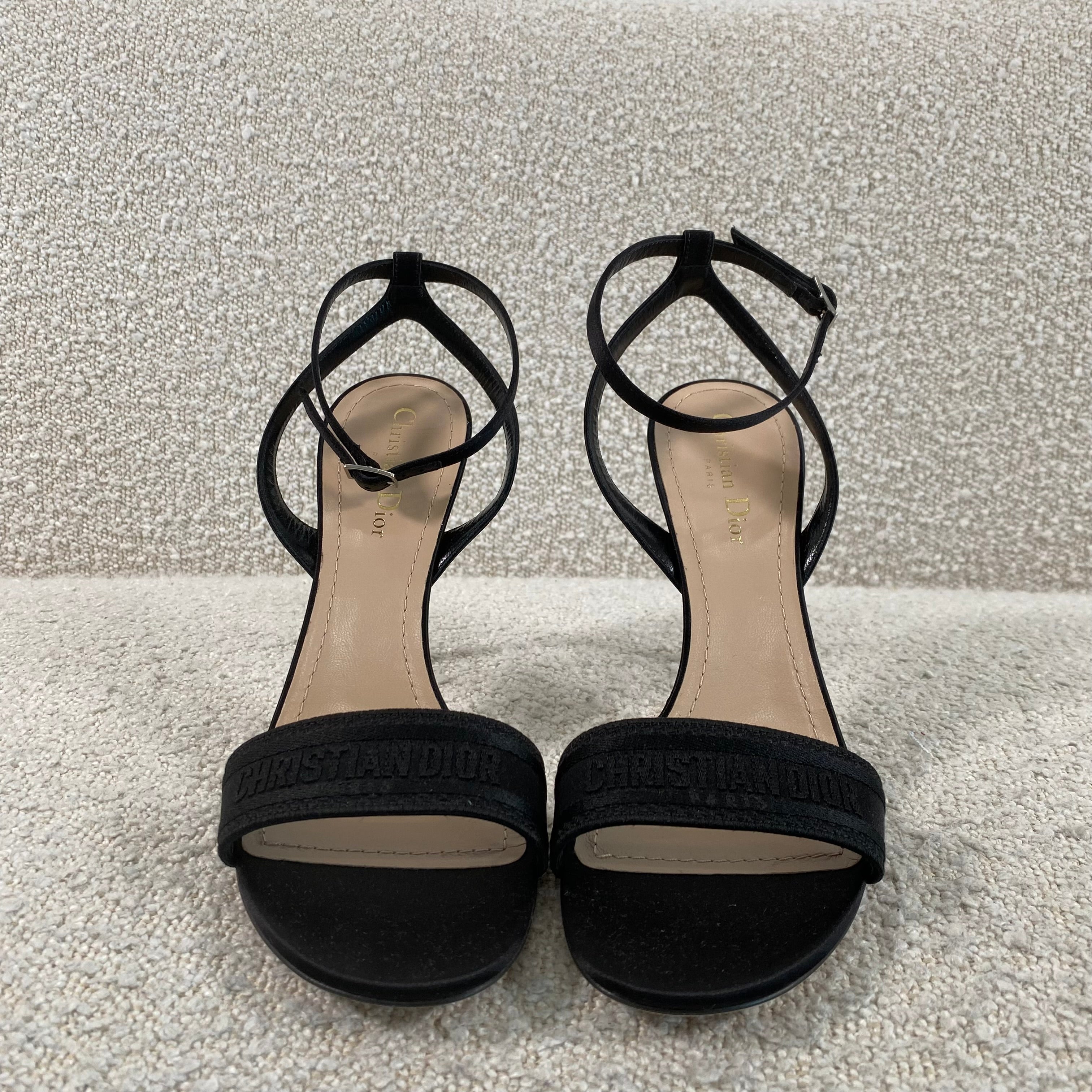 Elegant Christian Dior D-Way heeled sandals in classic black featuring the tonal embroidered CHRISTIAN DIOR PARIS signature across the front strap and a delicate ankle strap silhouette. A timeless and versatile style that pairs effortlessly with everything from denim to evening wear.