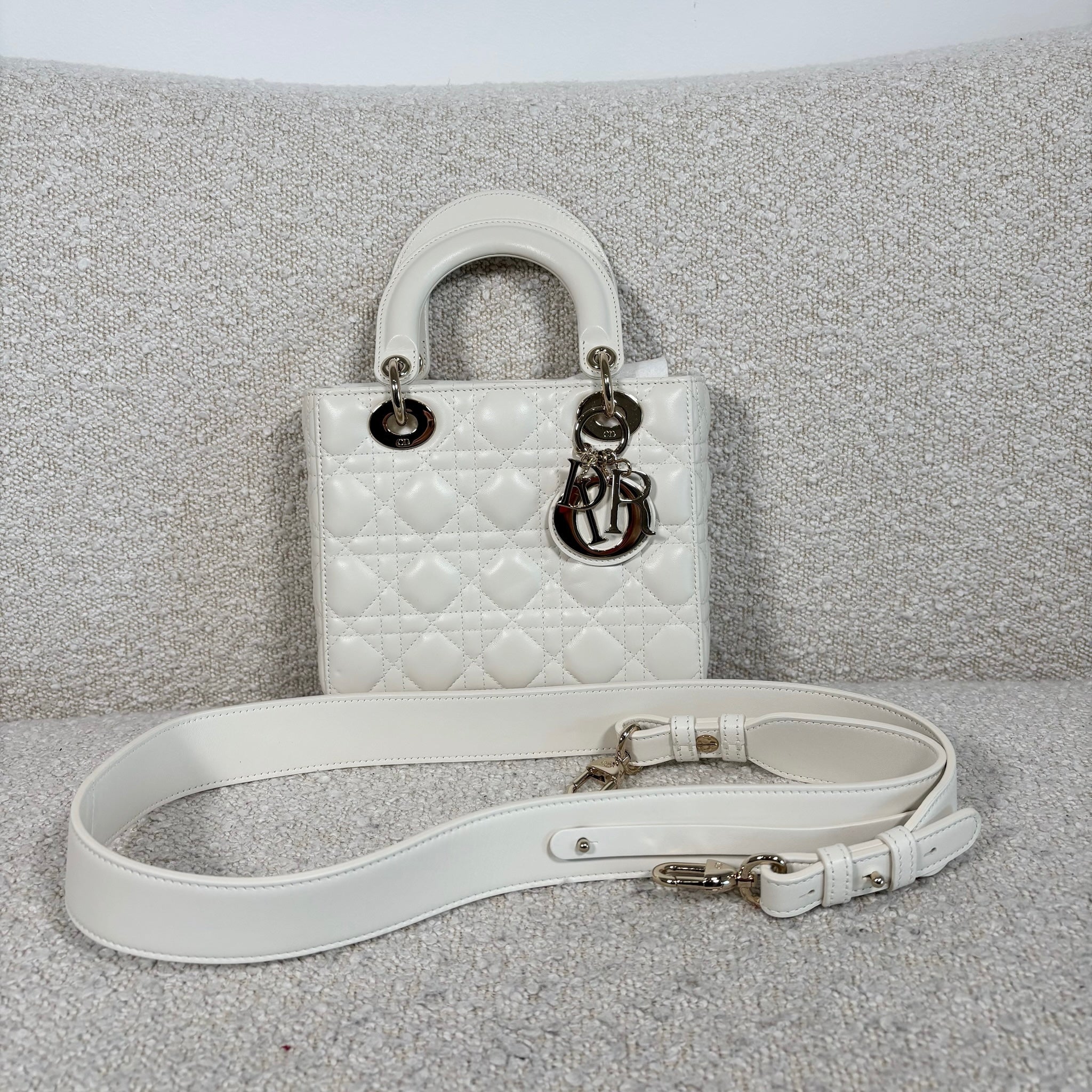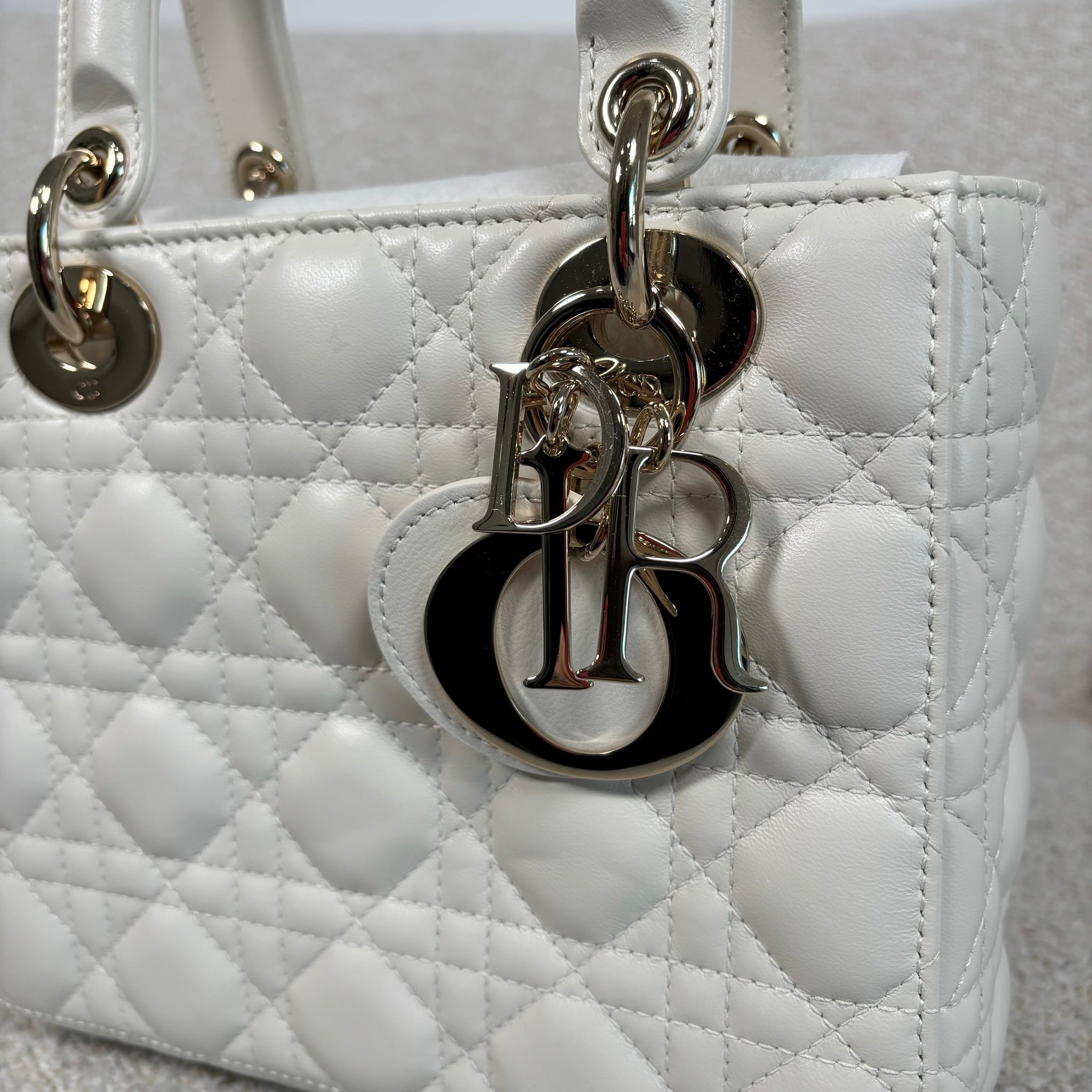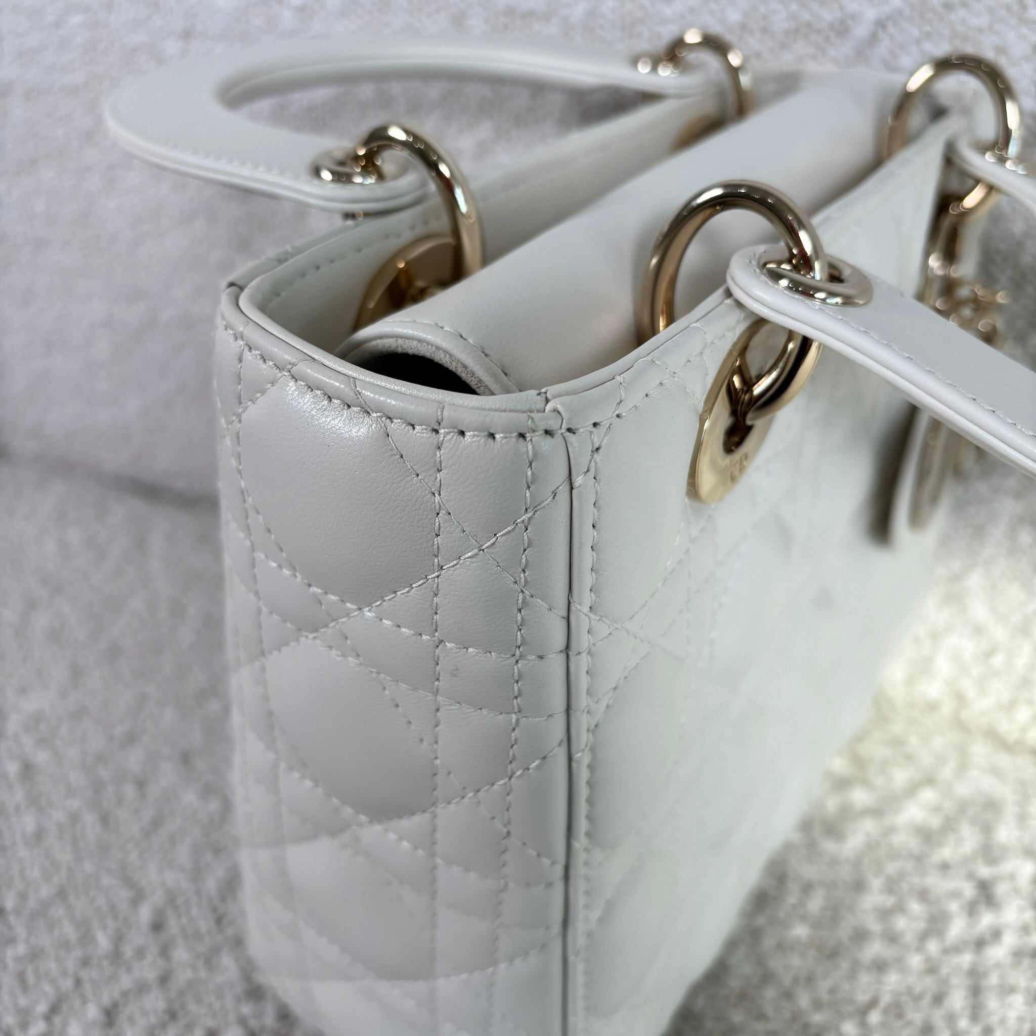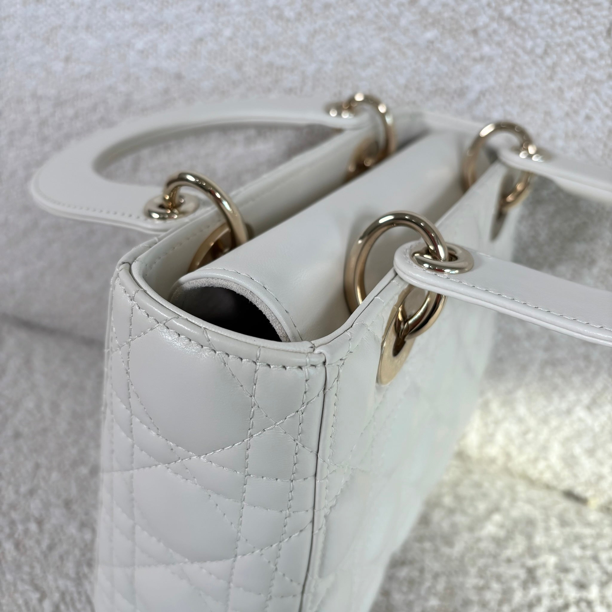 Crafted in white Cannage lambskin with light gold tone hardware, this small size silhouette is timeless and elegant—perfect for both everyday wear and special occasions.