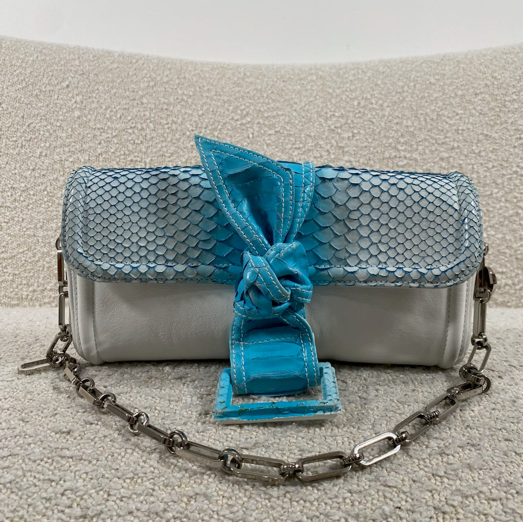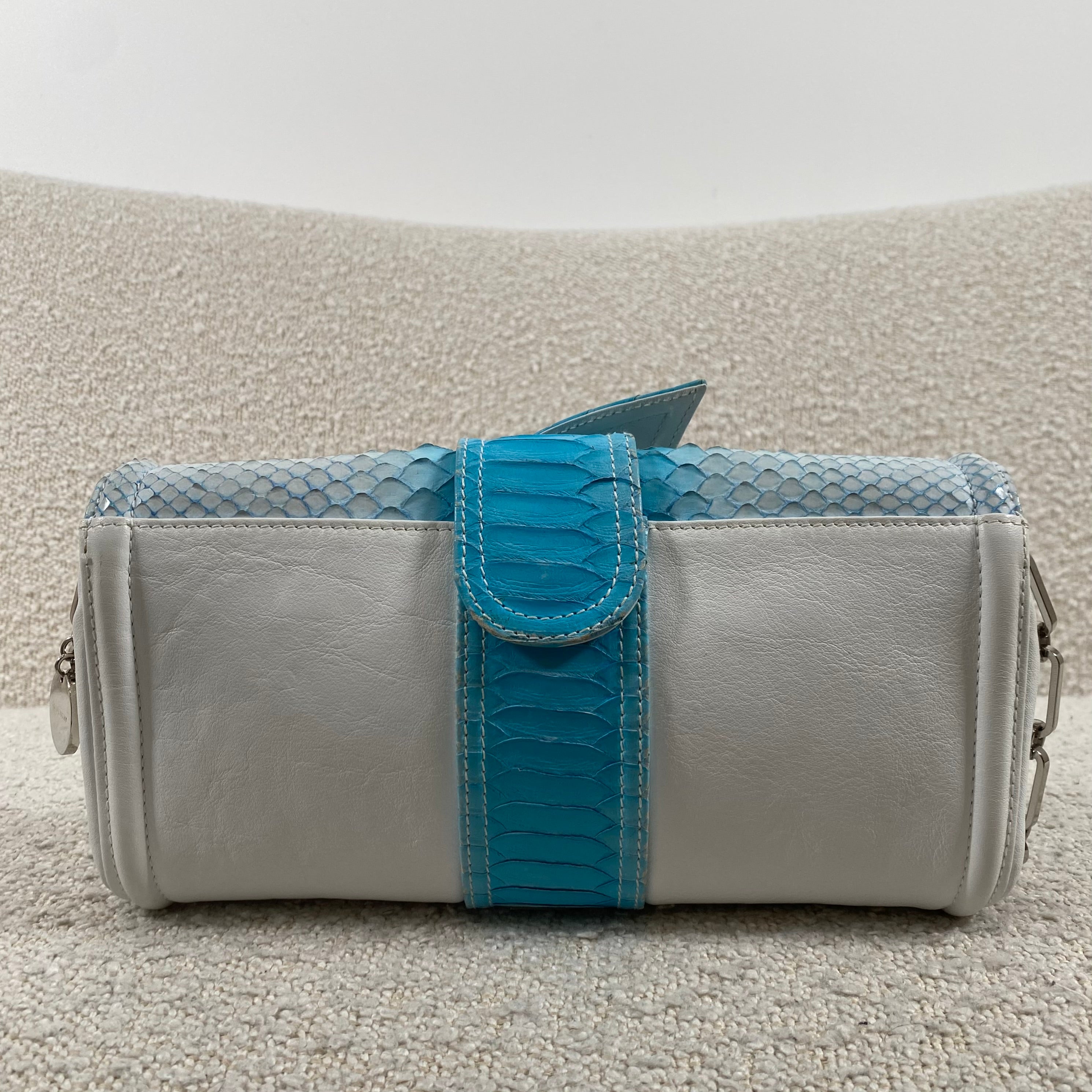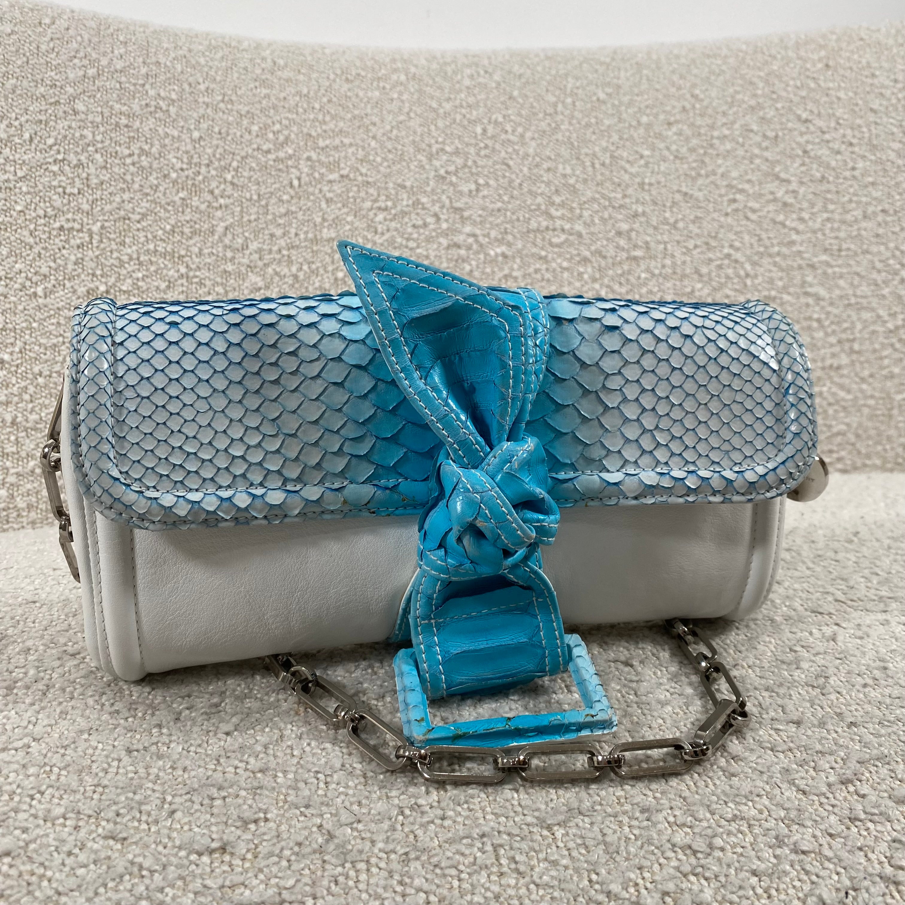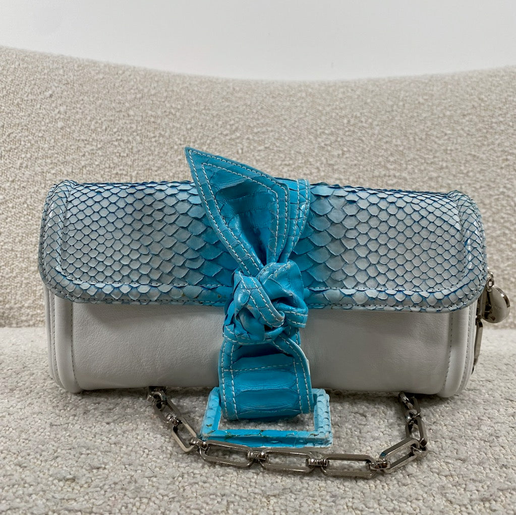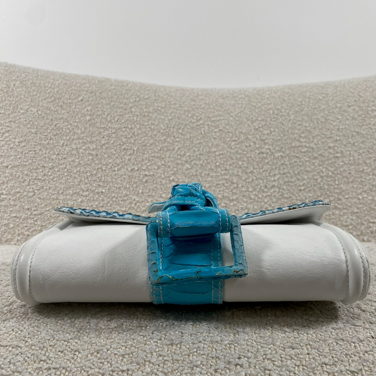 White calfskin leather with blue python detailing and silver-tone hardware.