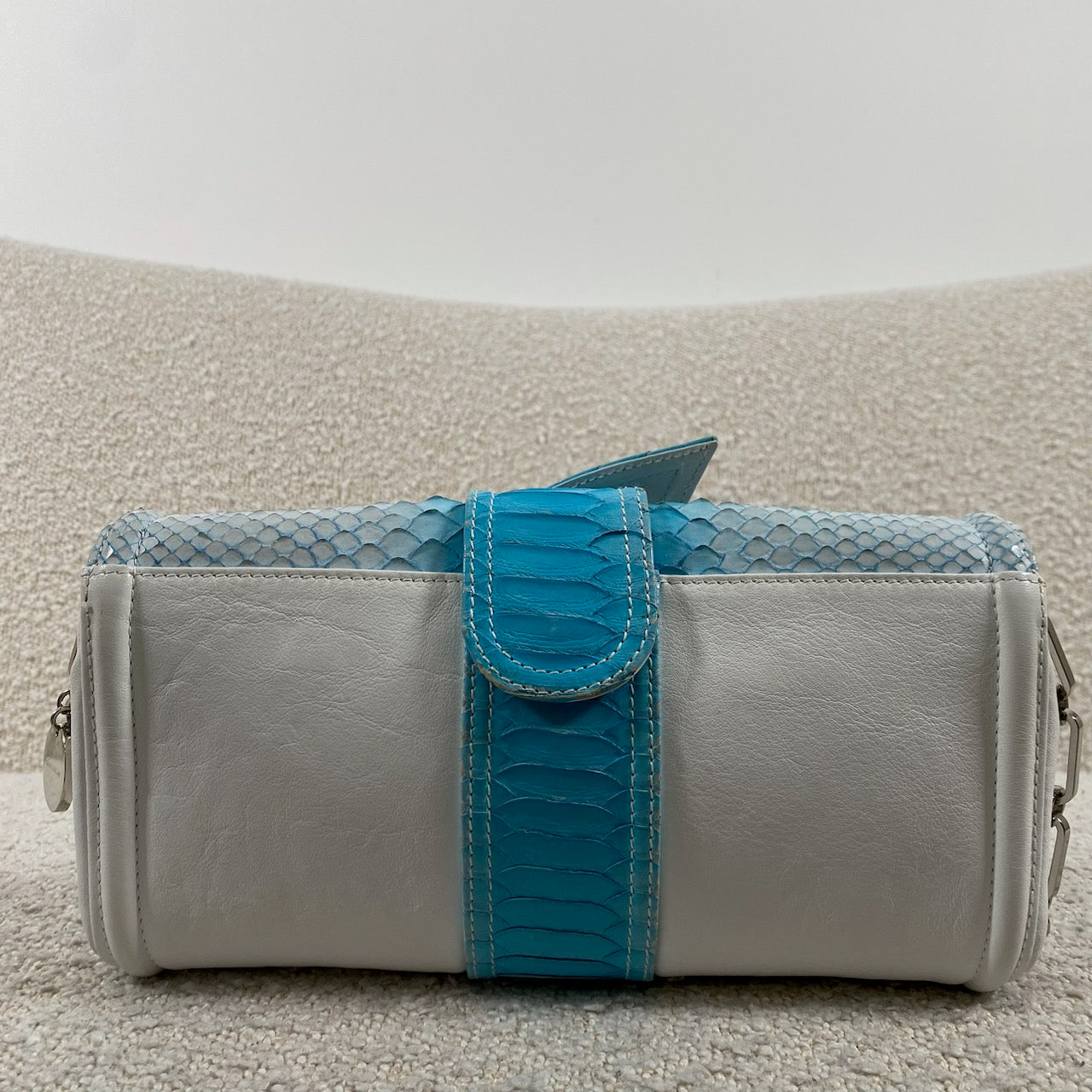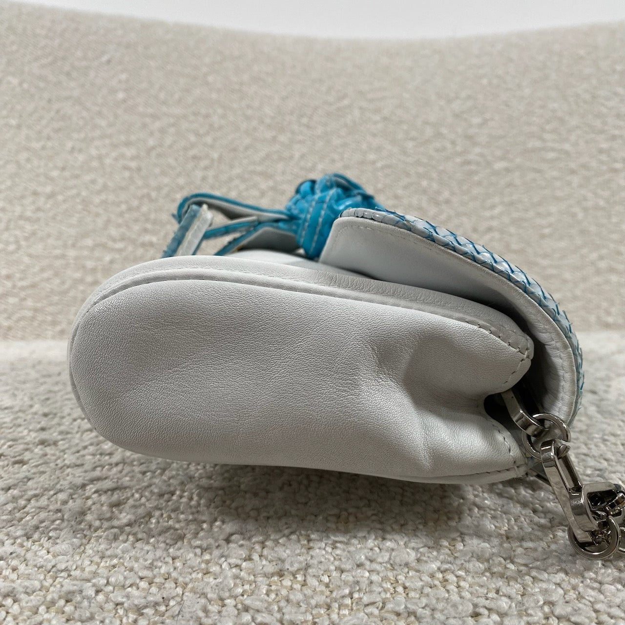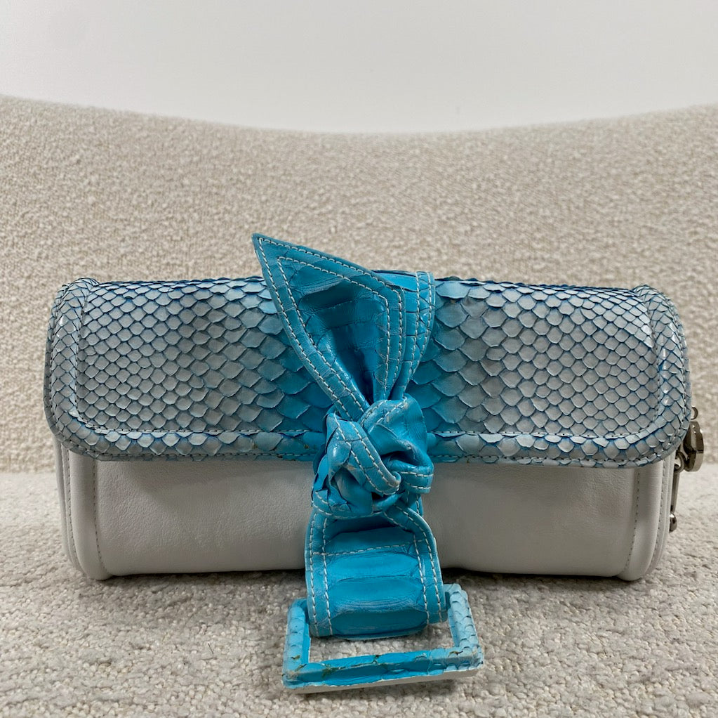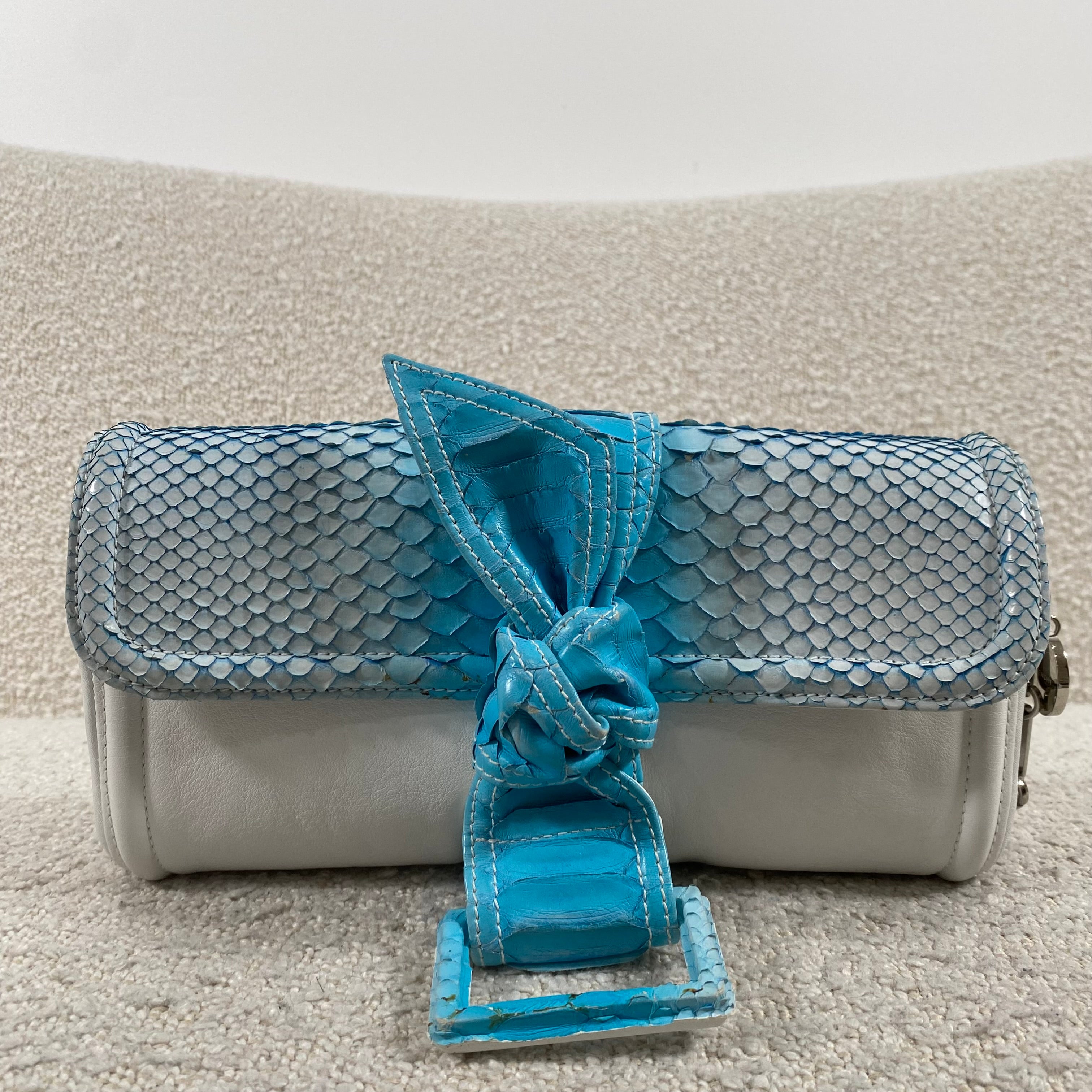 White calfskin leather with blue python detailing and silver-tone hardware.