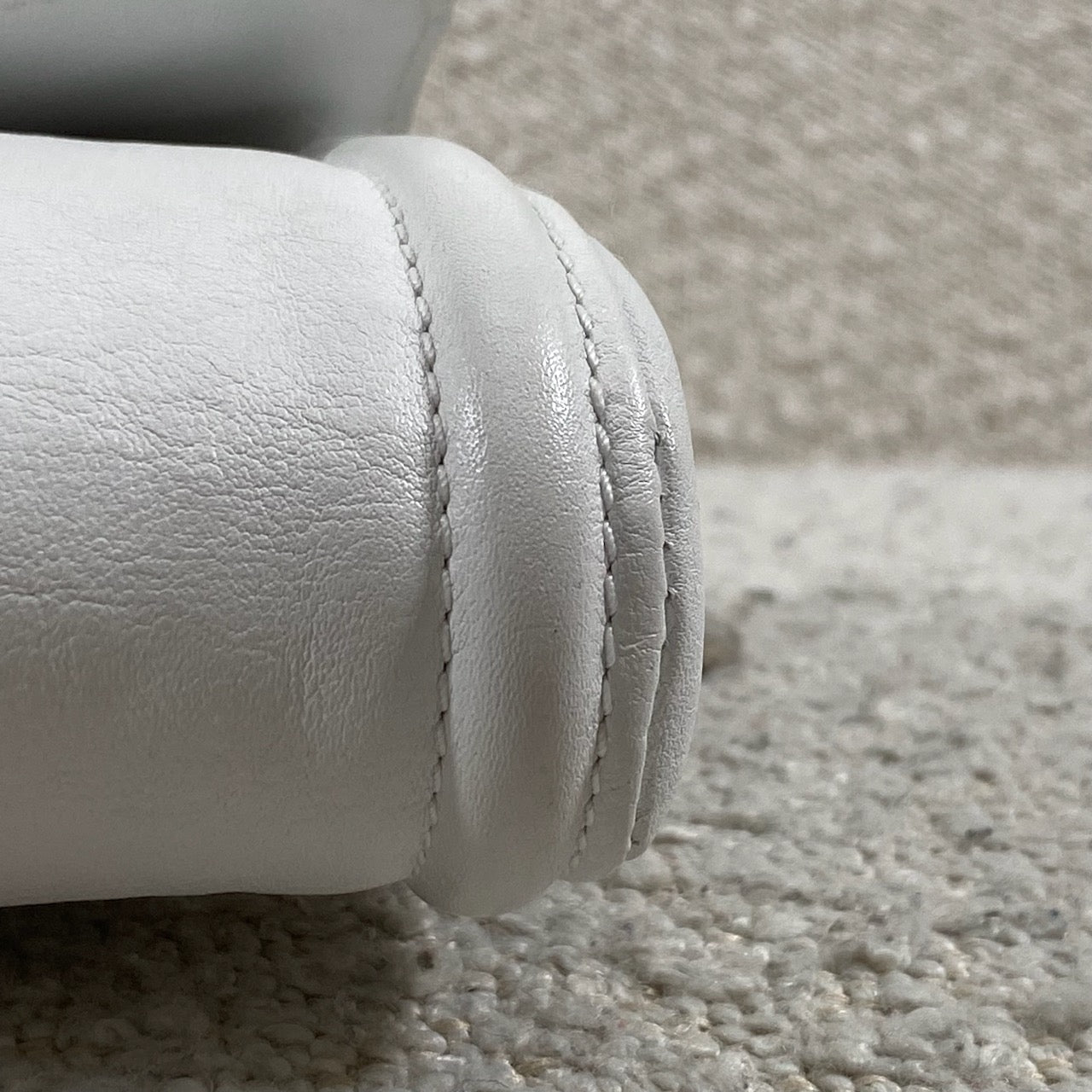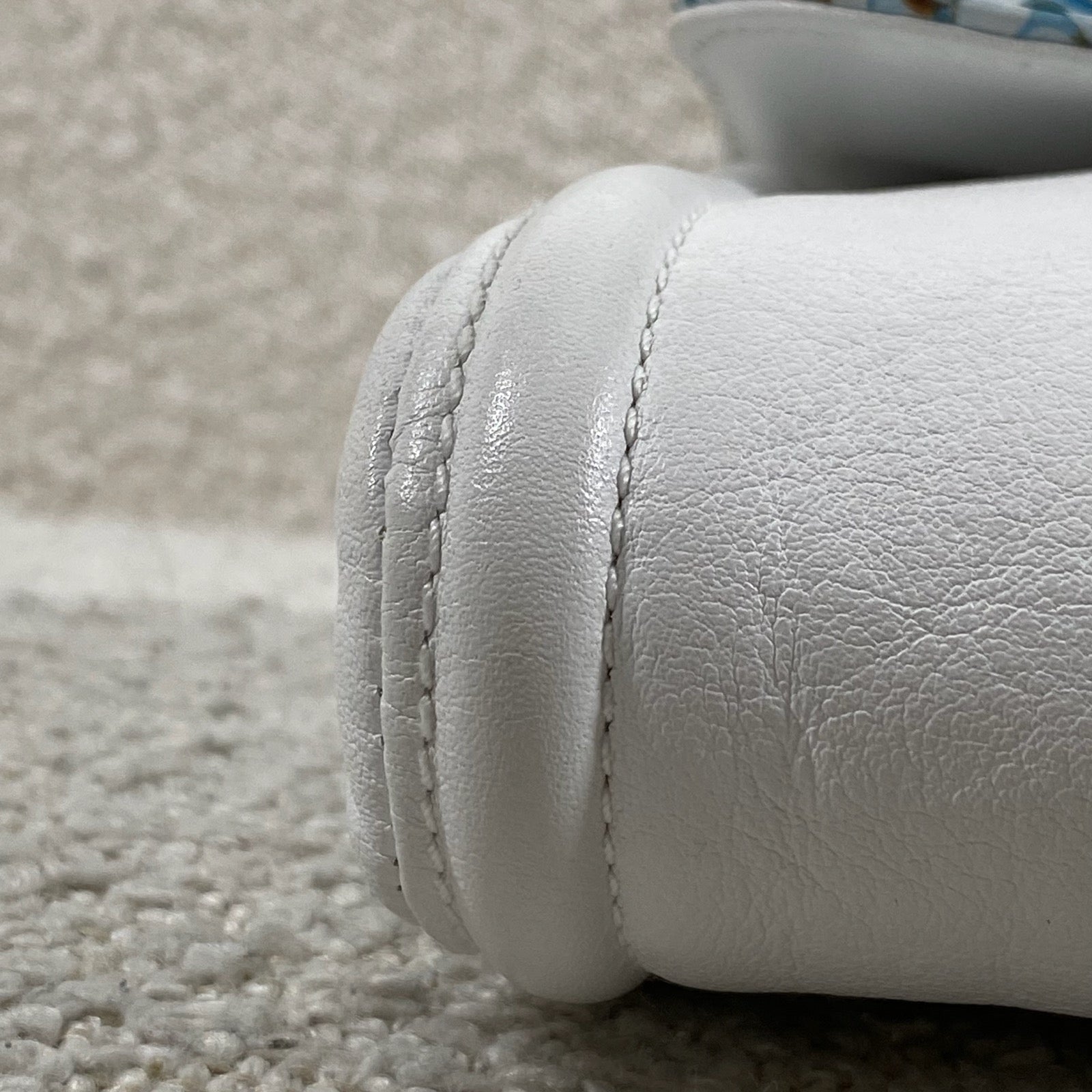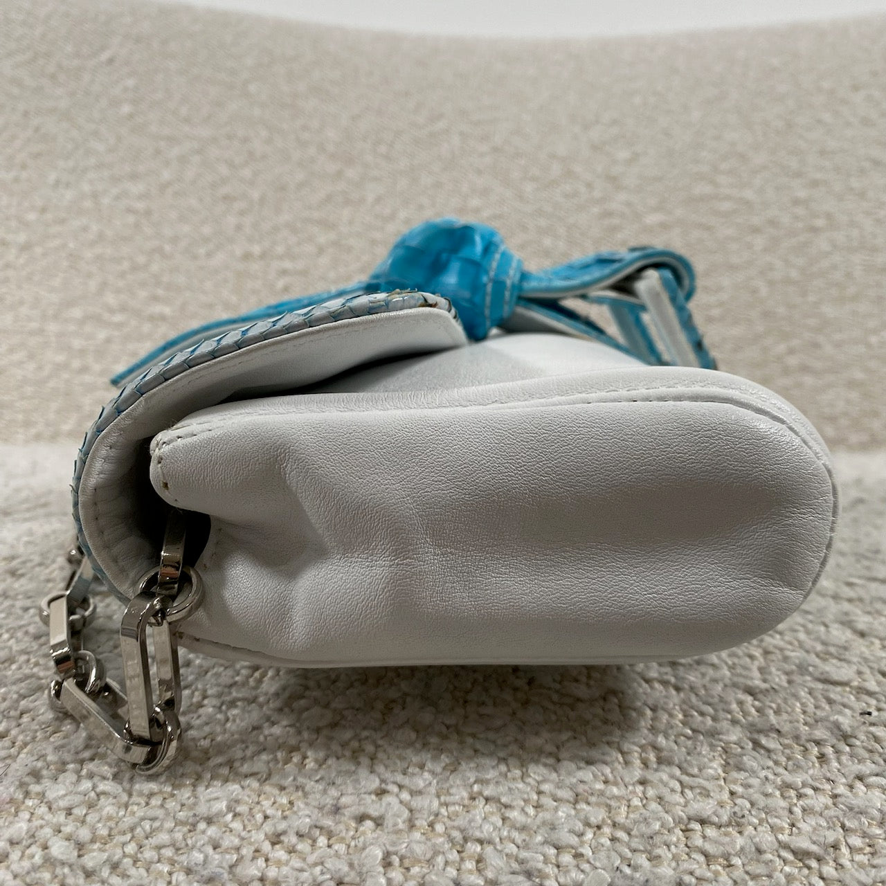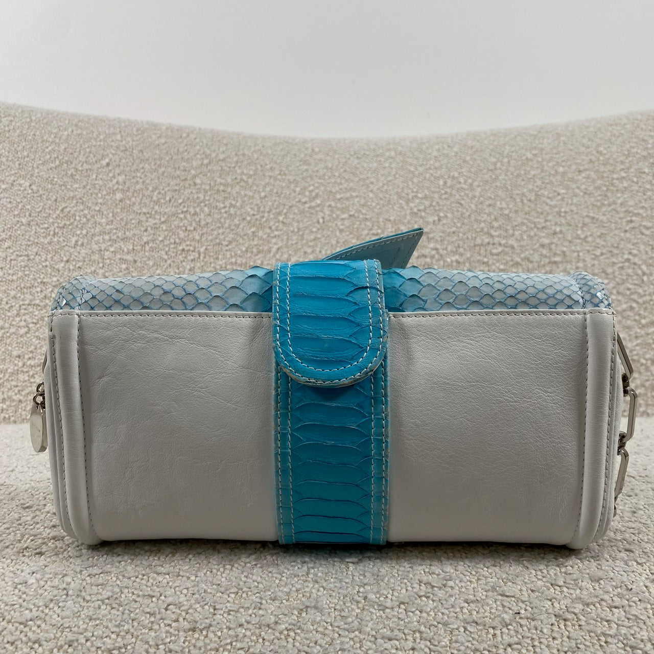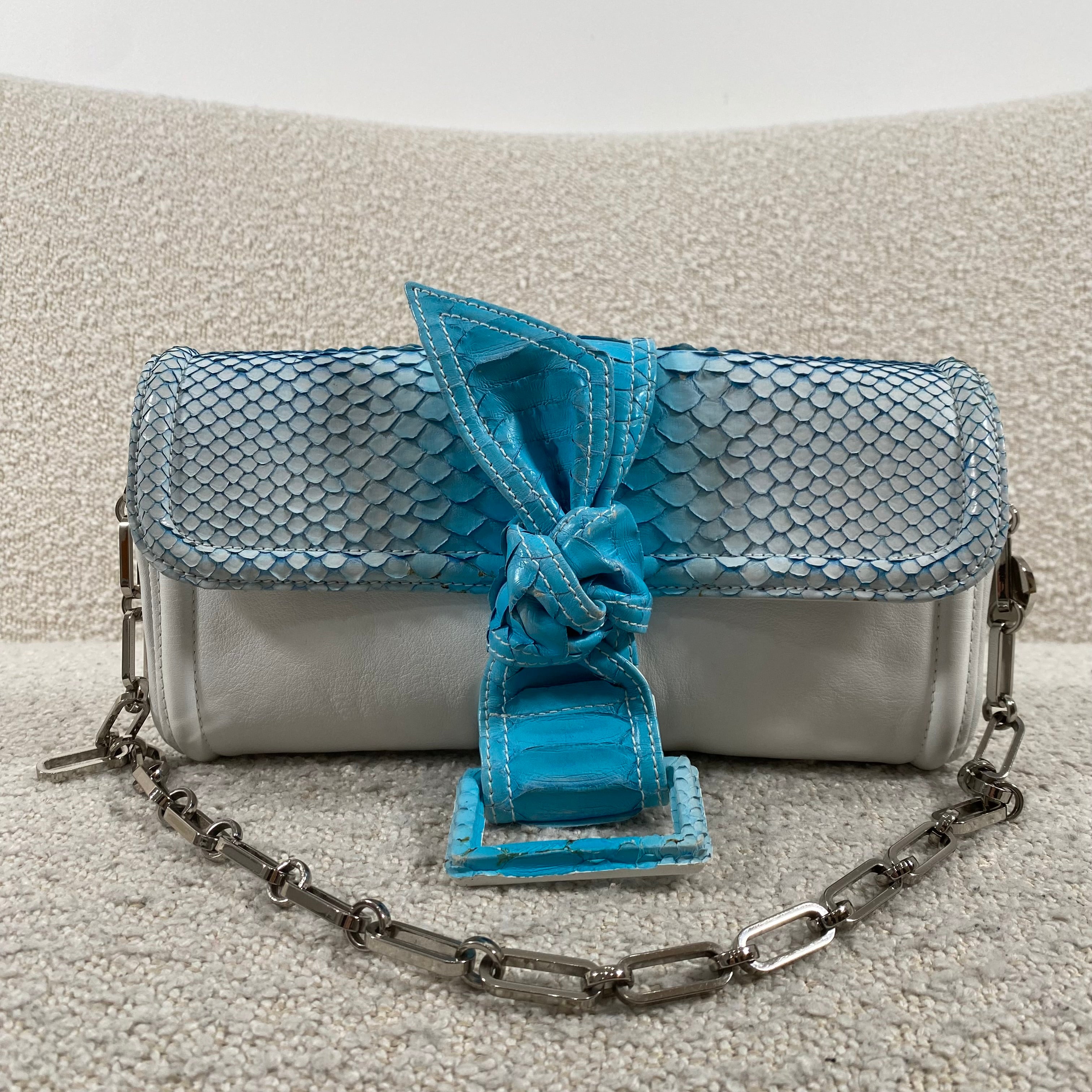 White calfskin leather with blue python detailing and silver-tone hardware.