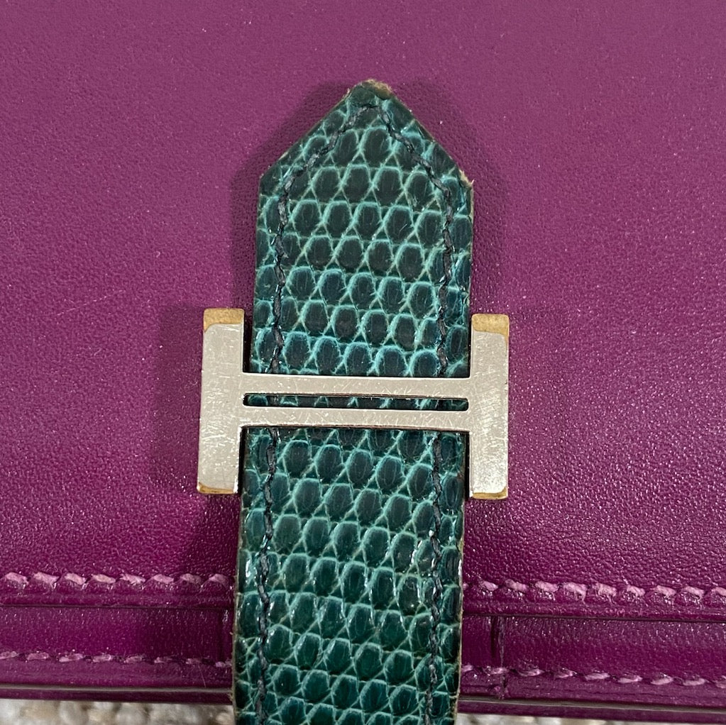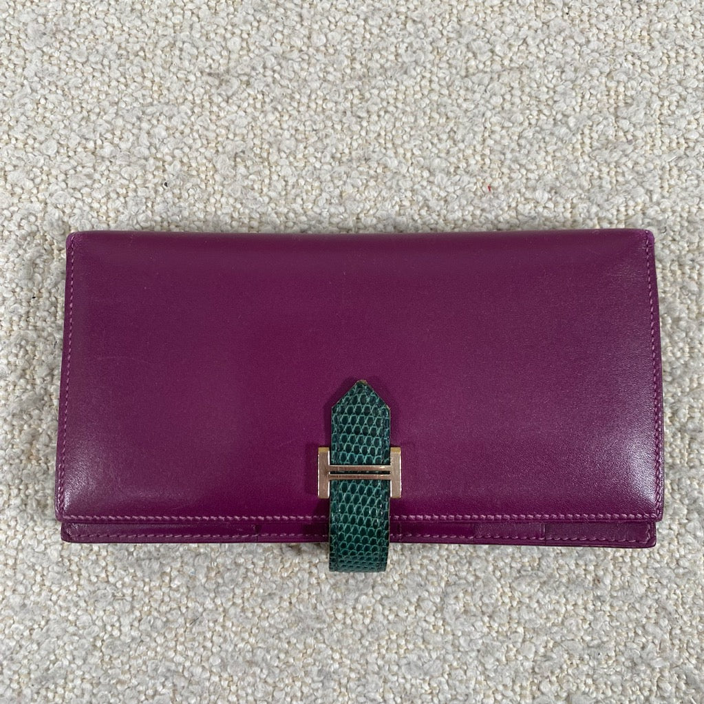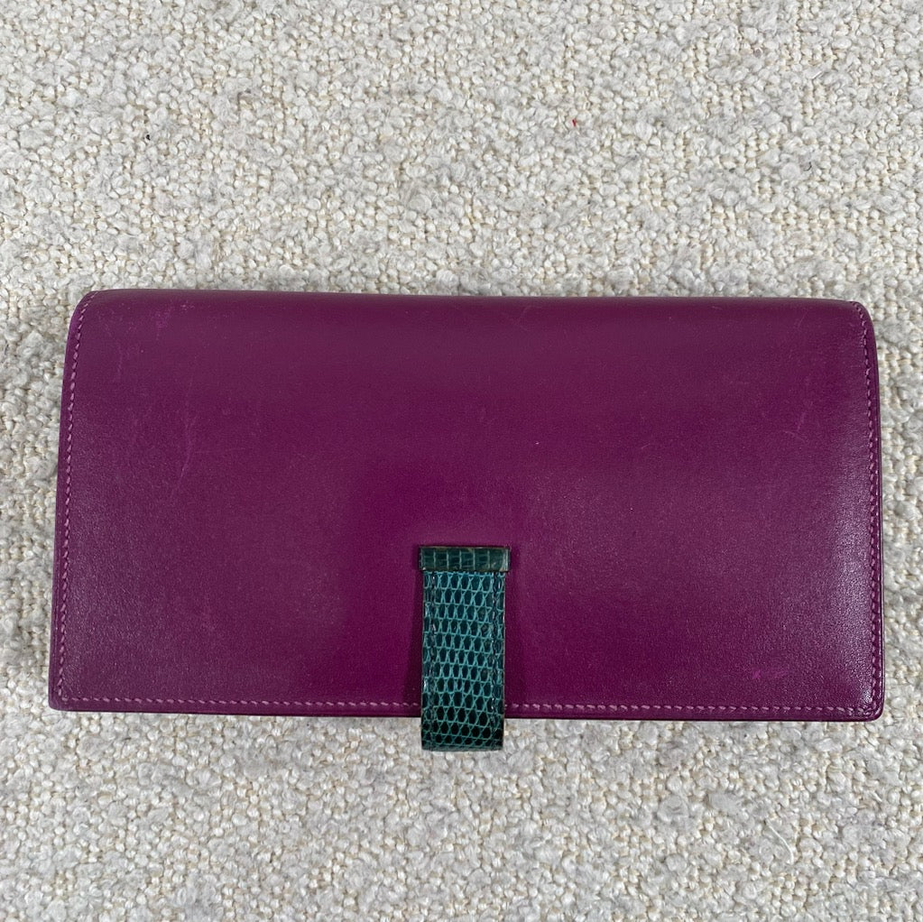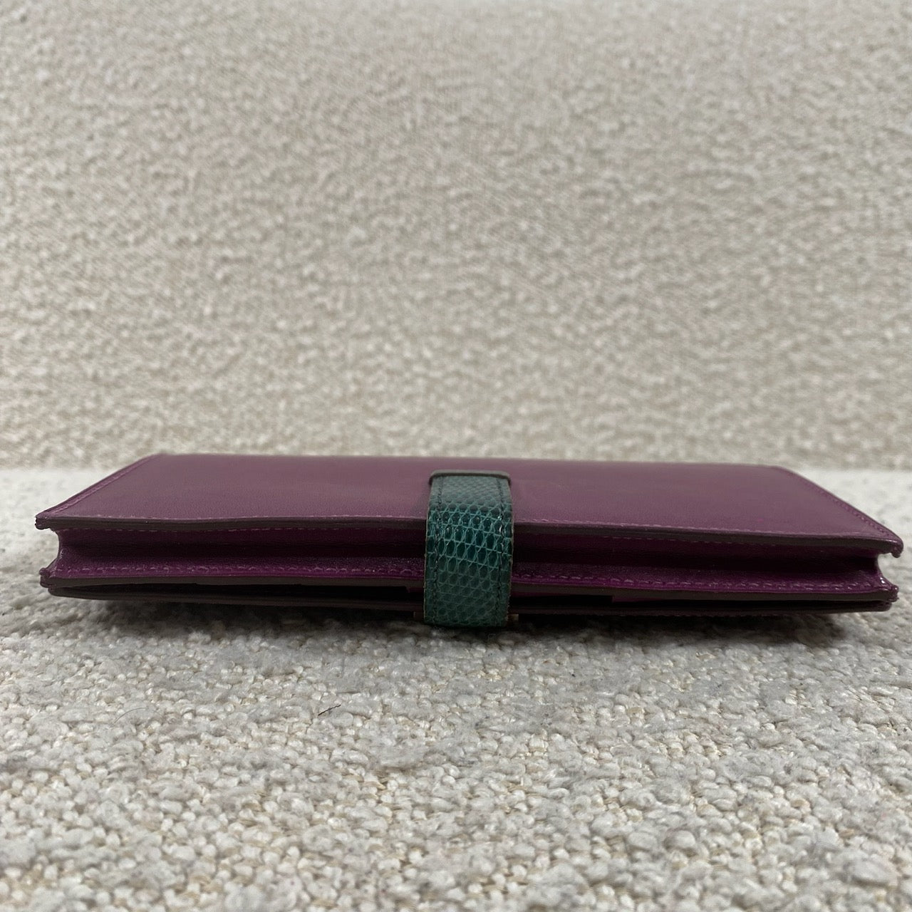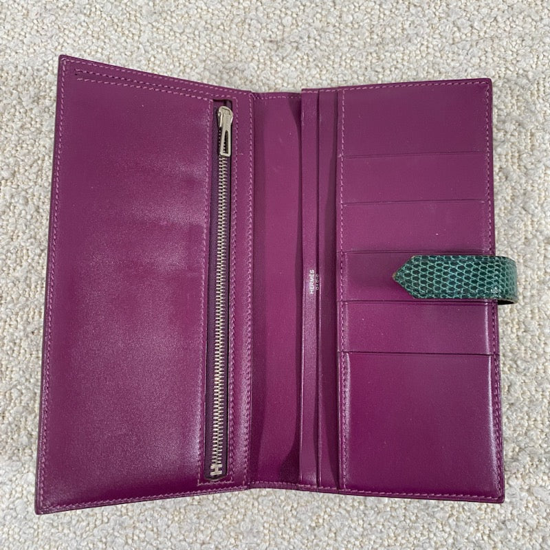 PRE-OWNED HERMES ANÉMONE SWIFT LEATHER & SHINY COLVERT NILOTICUS LIZARD BÉARN WALLET WITH PALLADIUM HARDWARE