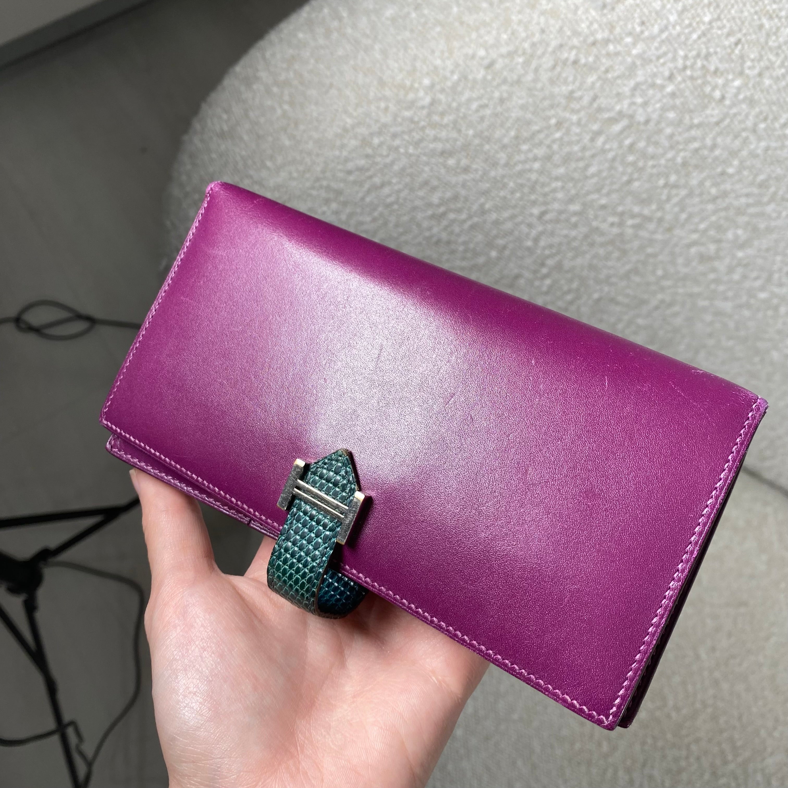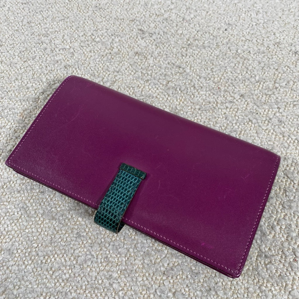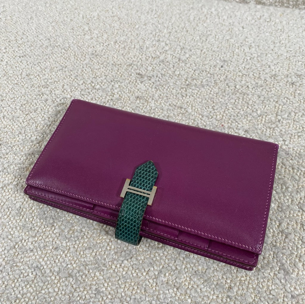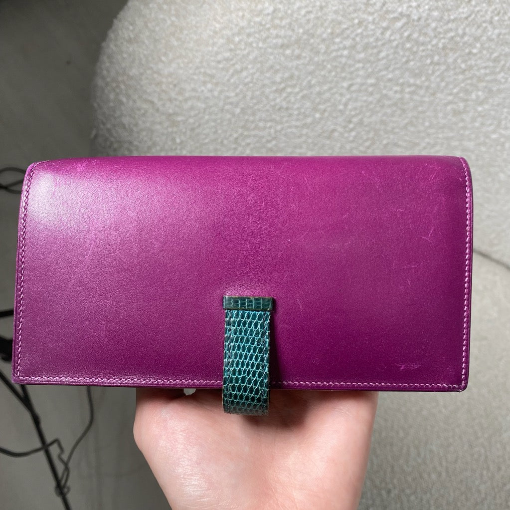 PRE-OWNED HERMES ANÉMONE SWIFT LEATHER & SHINY COLVERT NILOTICUS LIZARD BÉARN WALLET WITH PALLADIUM HARDWARE