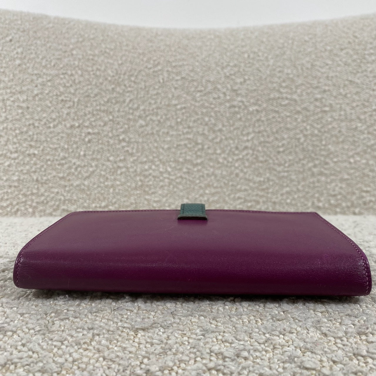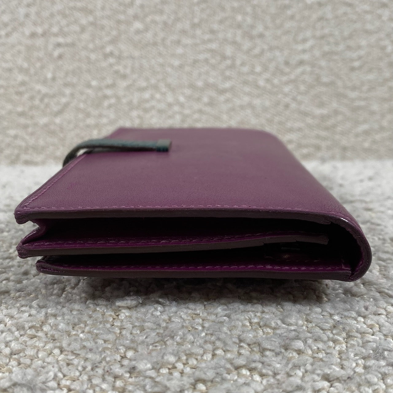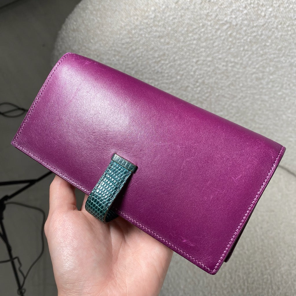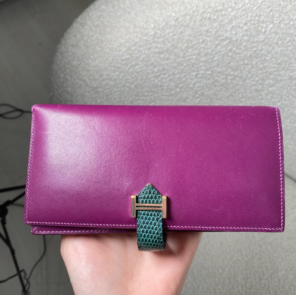 PRE-OWNED HERMES ANÉMONE SWIFT LEATHER & SHINY COLVERT NILOTICUS LIZARD BÉARN WALLET WITH PALLADIUM HARDWARE