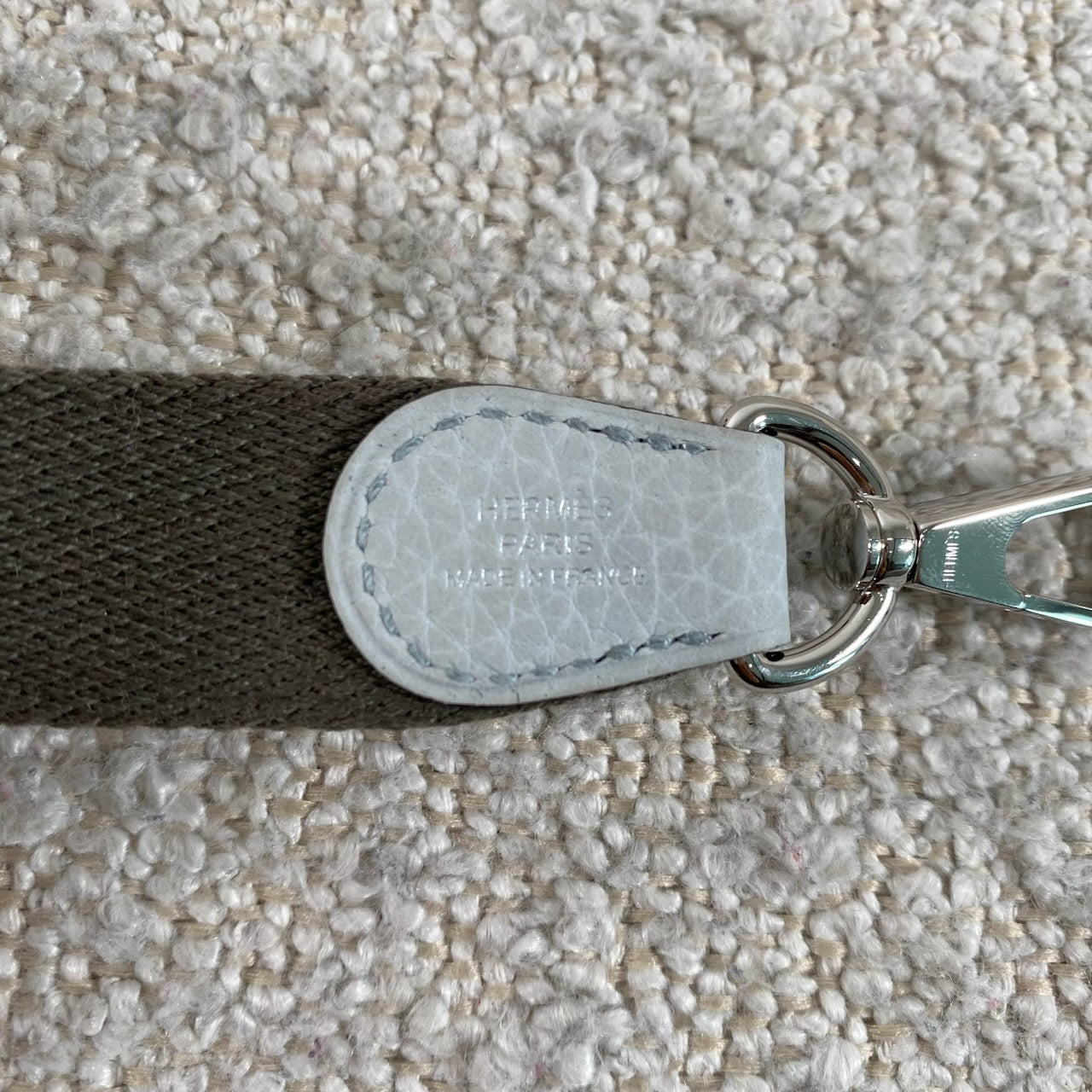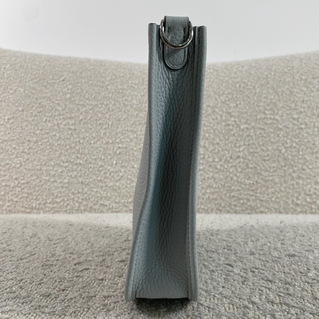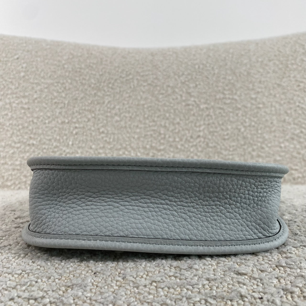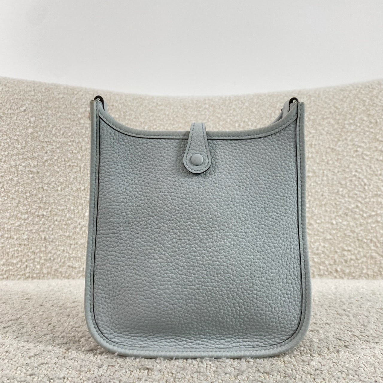 Beautiful Hermès Evelyne TPM in Bleu Pale / Gris Étain Clemence leather with palladium hardware.