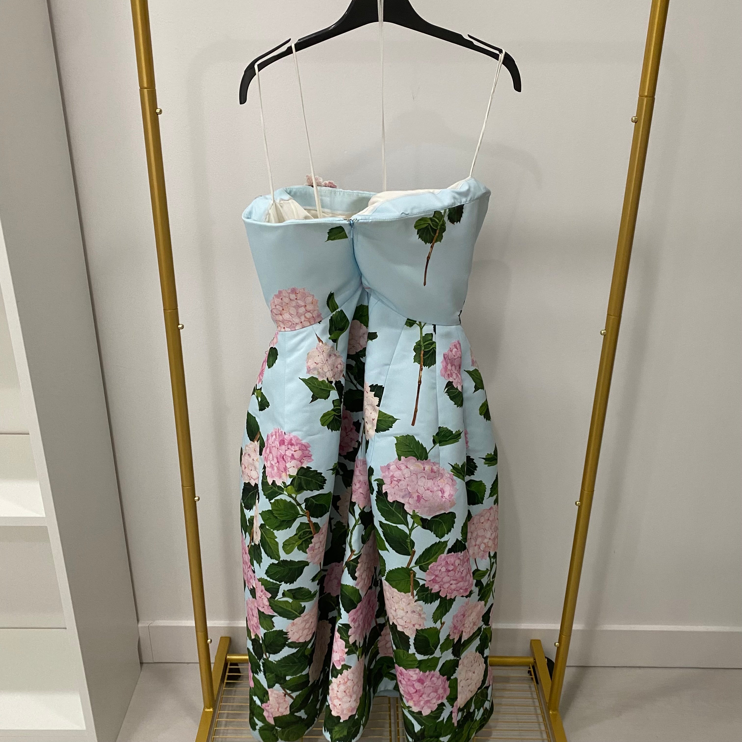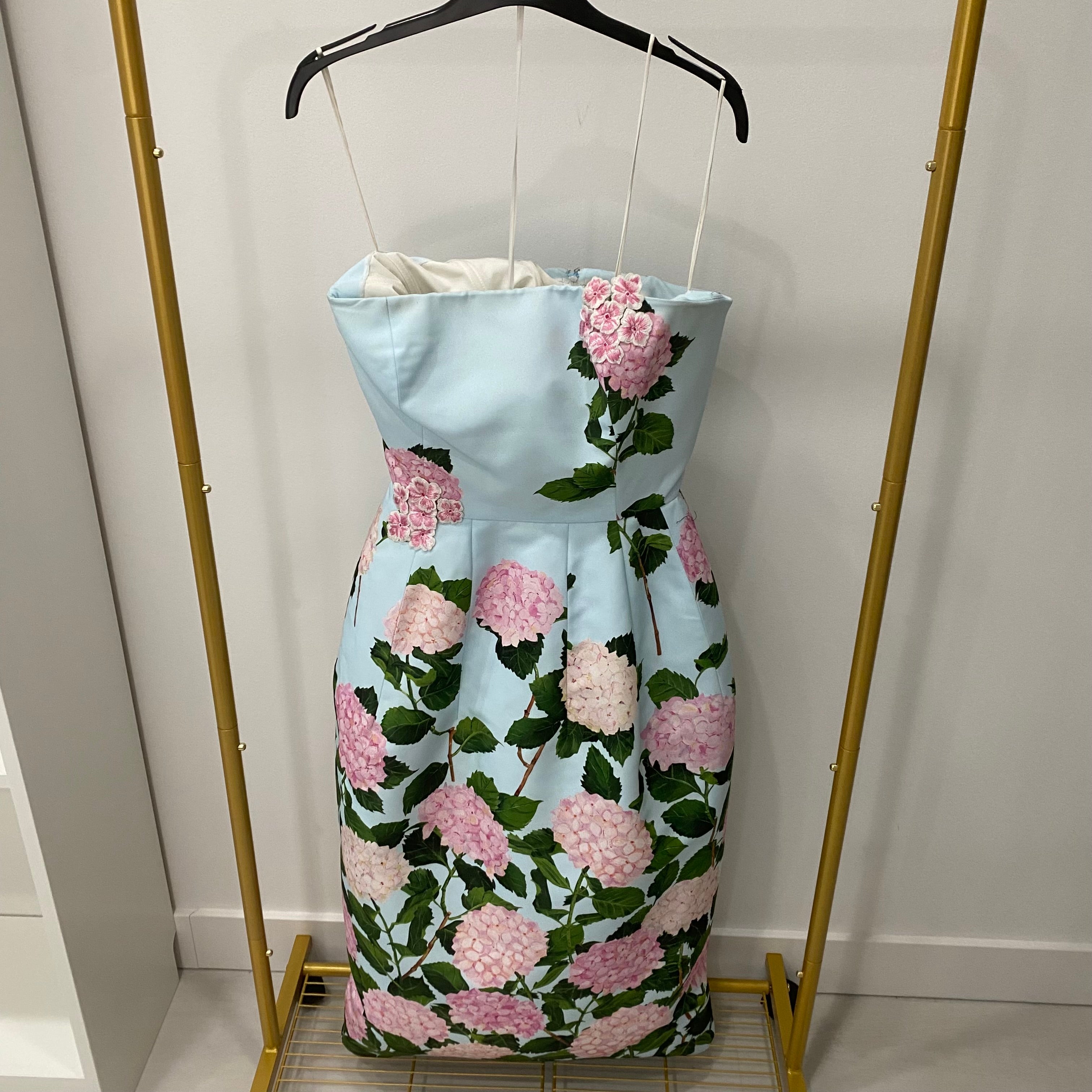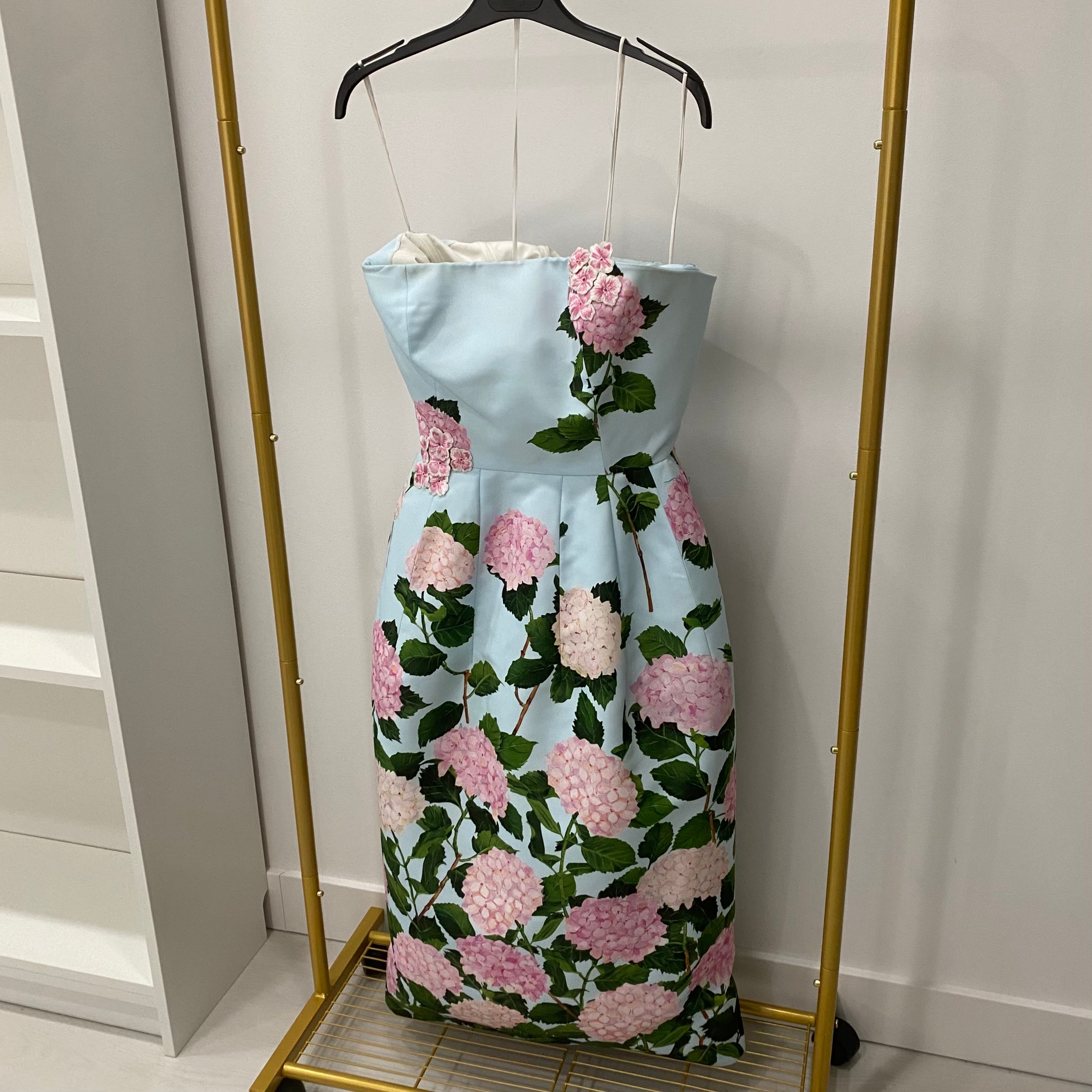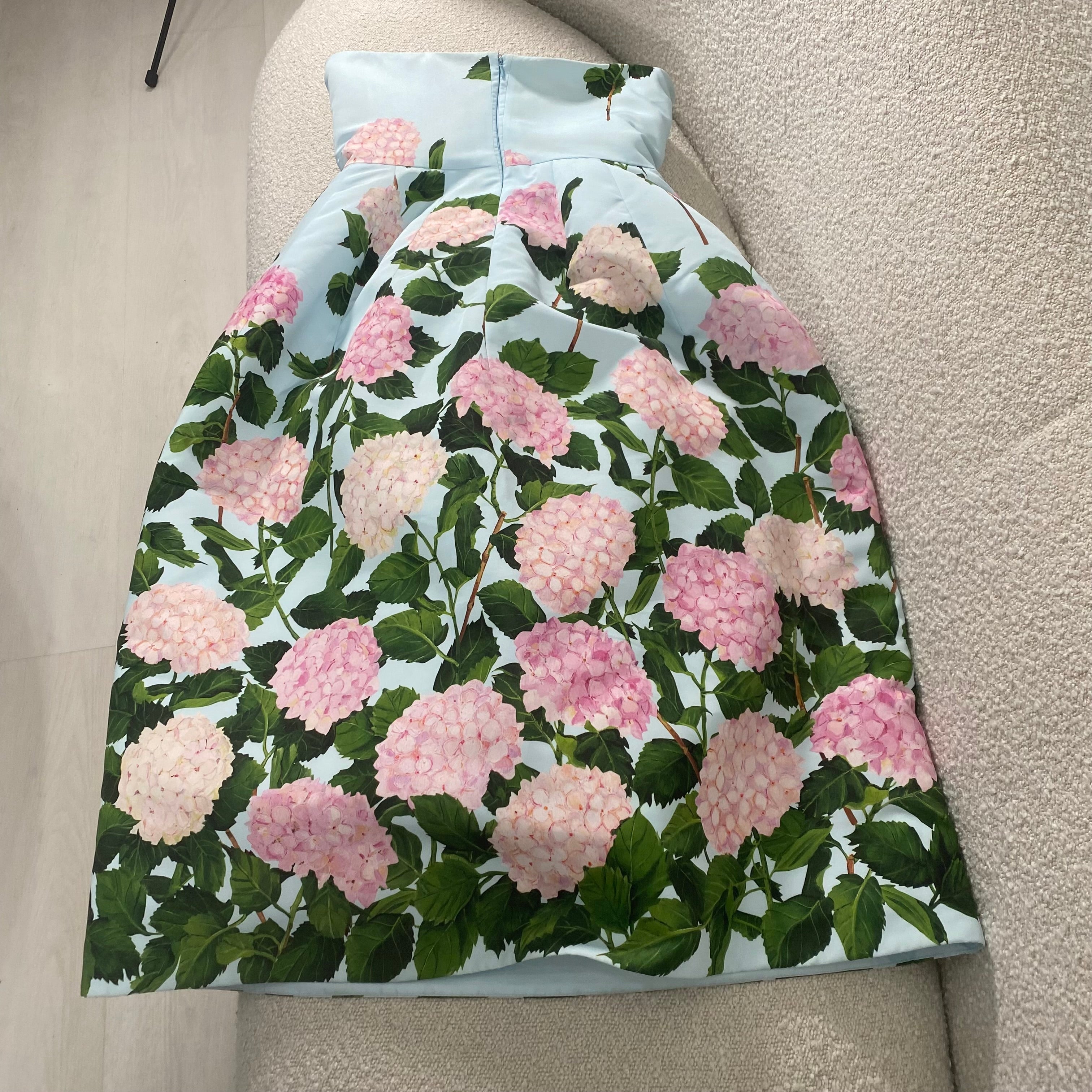 Pre-owned Oscar de la Renta Degrade Hydrangea-Print Strapless Tea-Length Faille Dress US 6