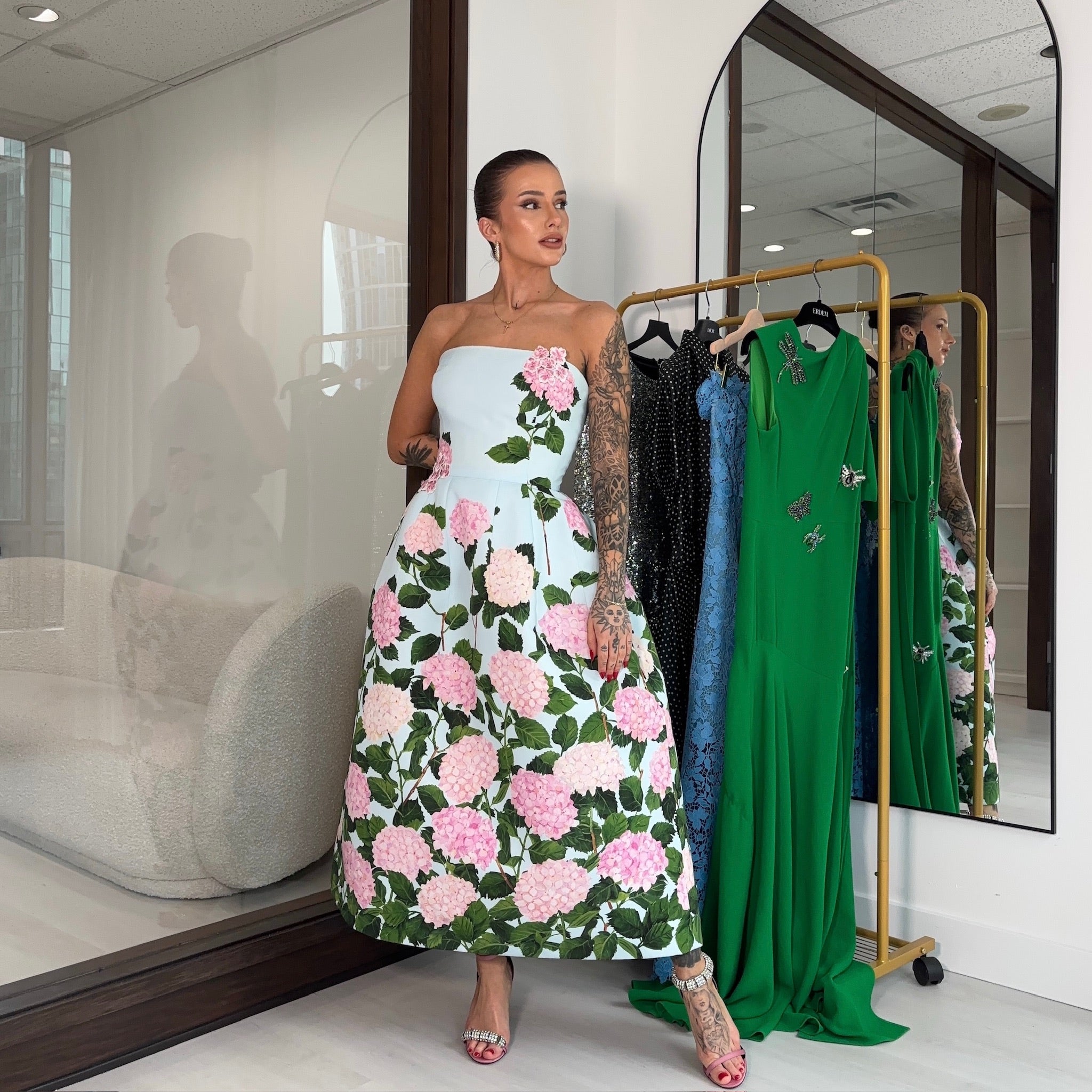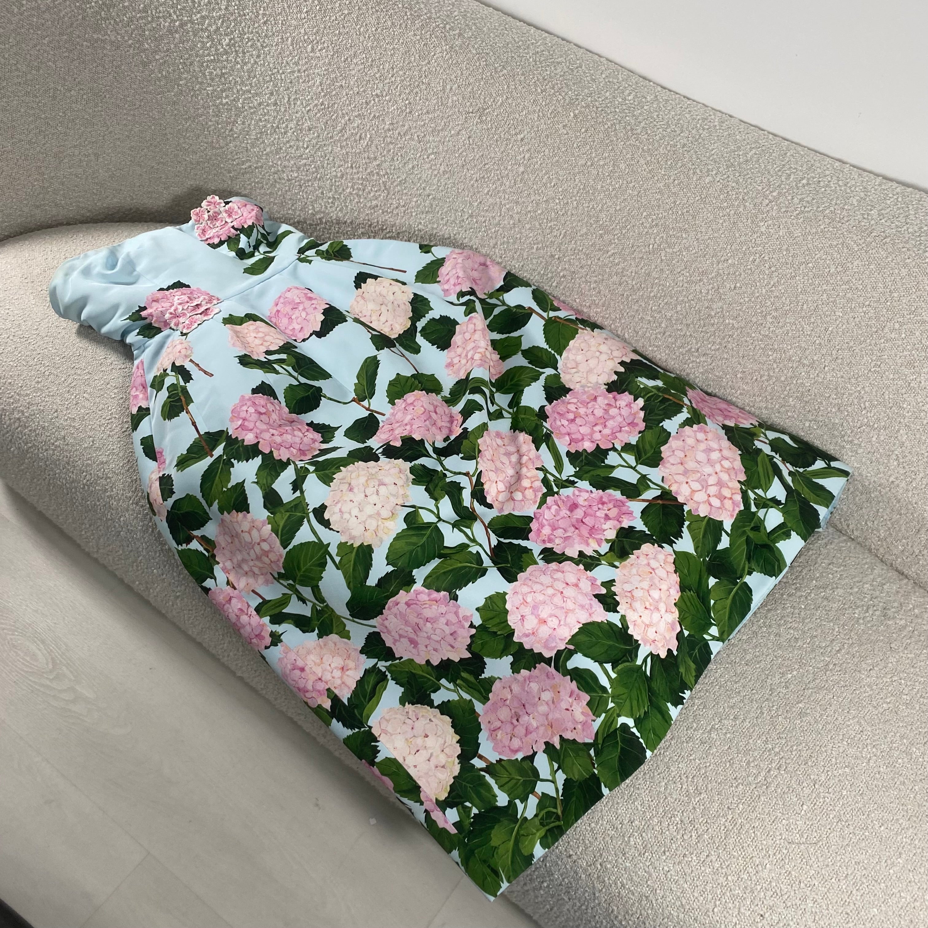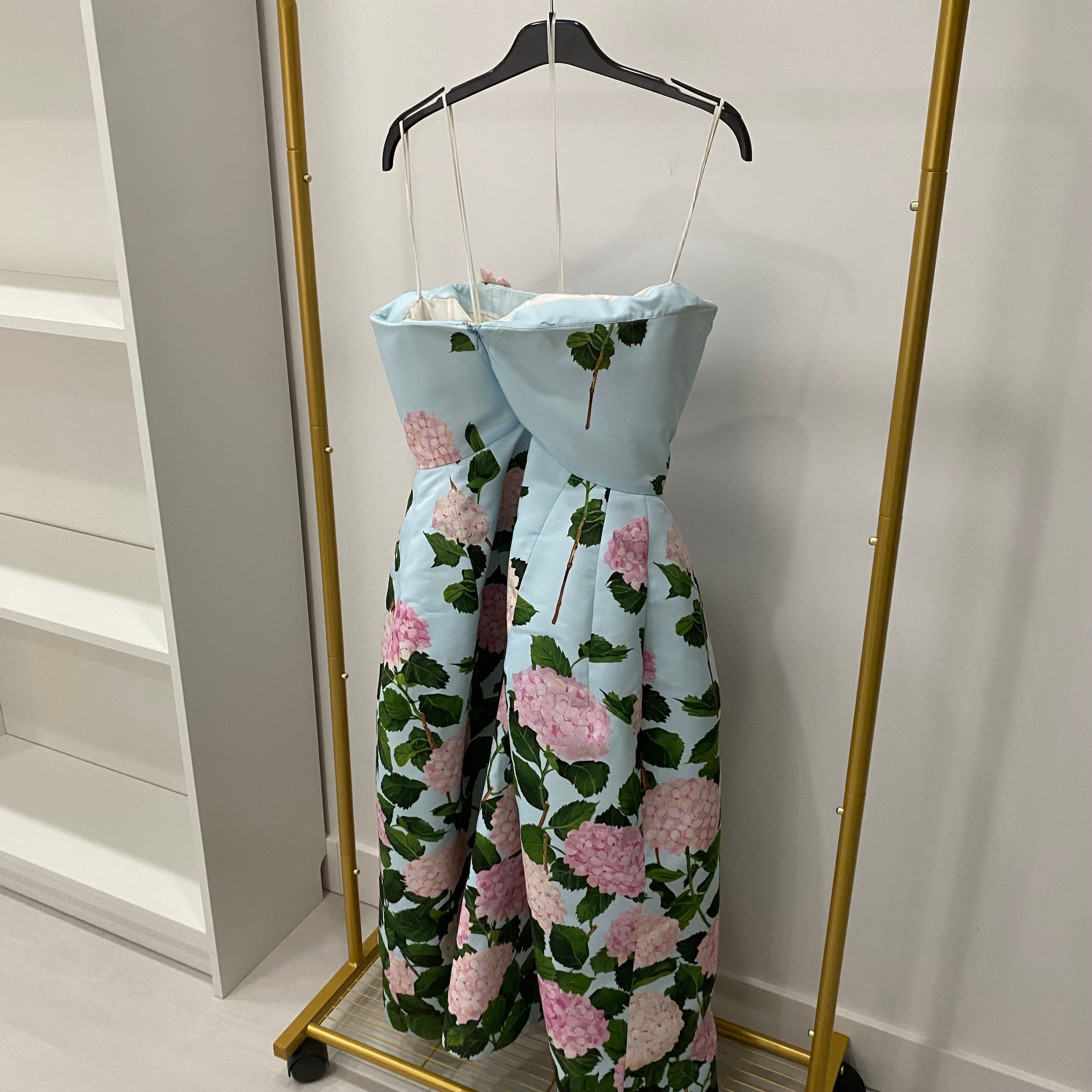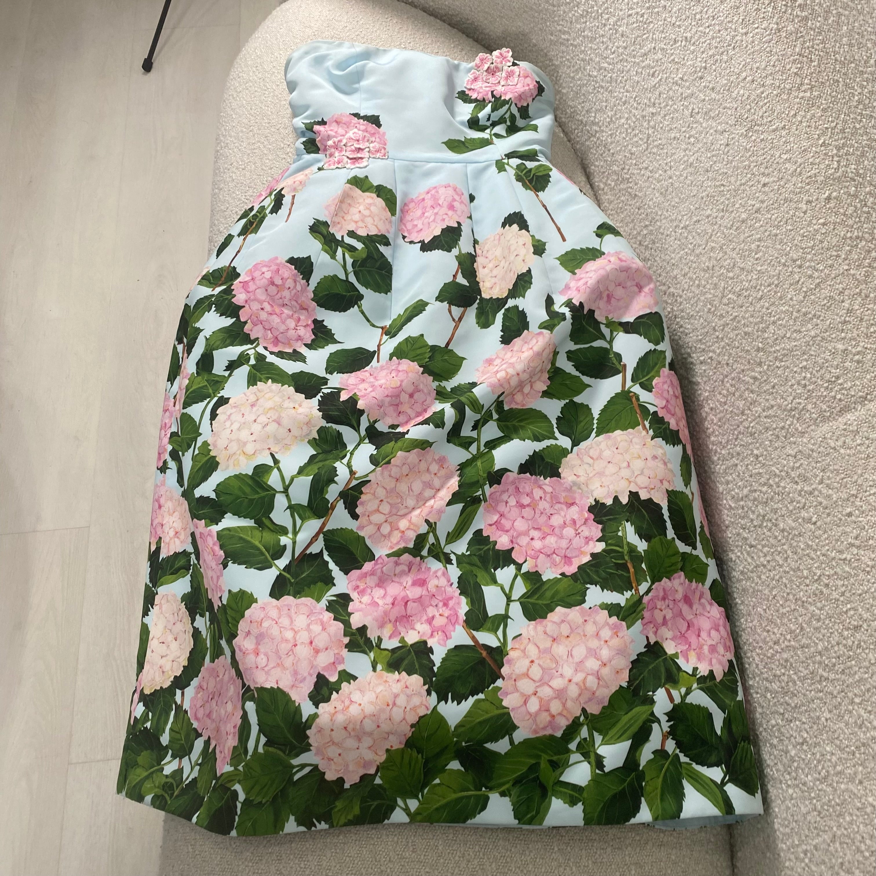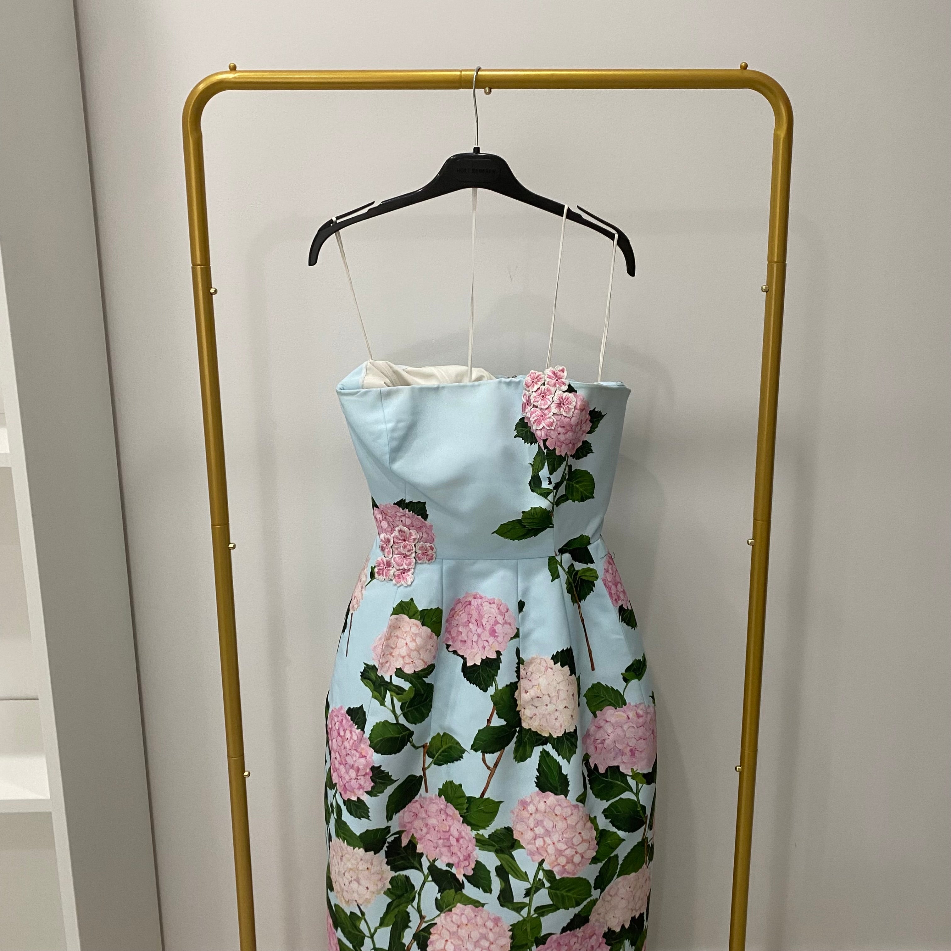 Pre-owned Oscar de la Renta Degrade Hydrangea-Print Strapless Tea-Length Faille Dress US 6