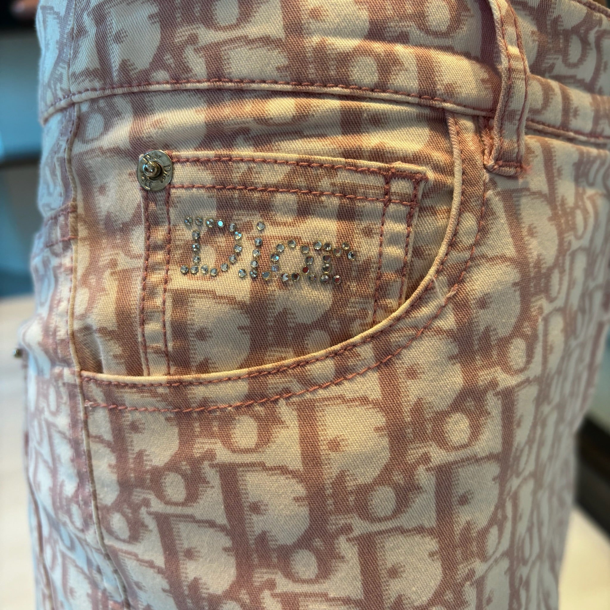 Pre-owned Christian Dior pink and white monogram denim trousers John Galliano 2004