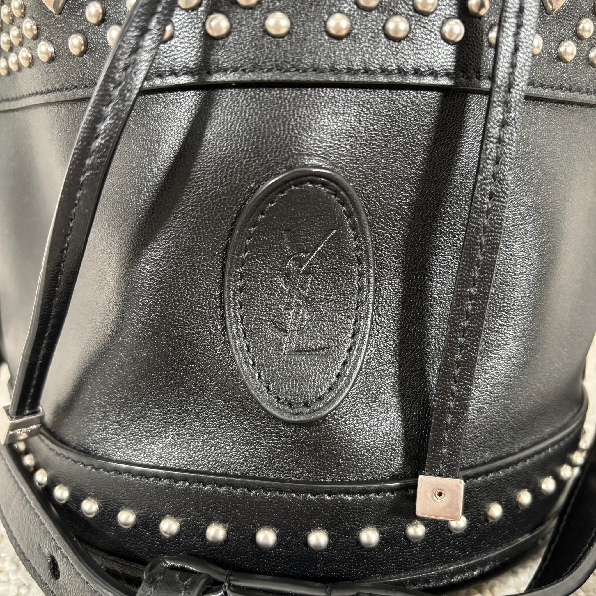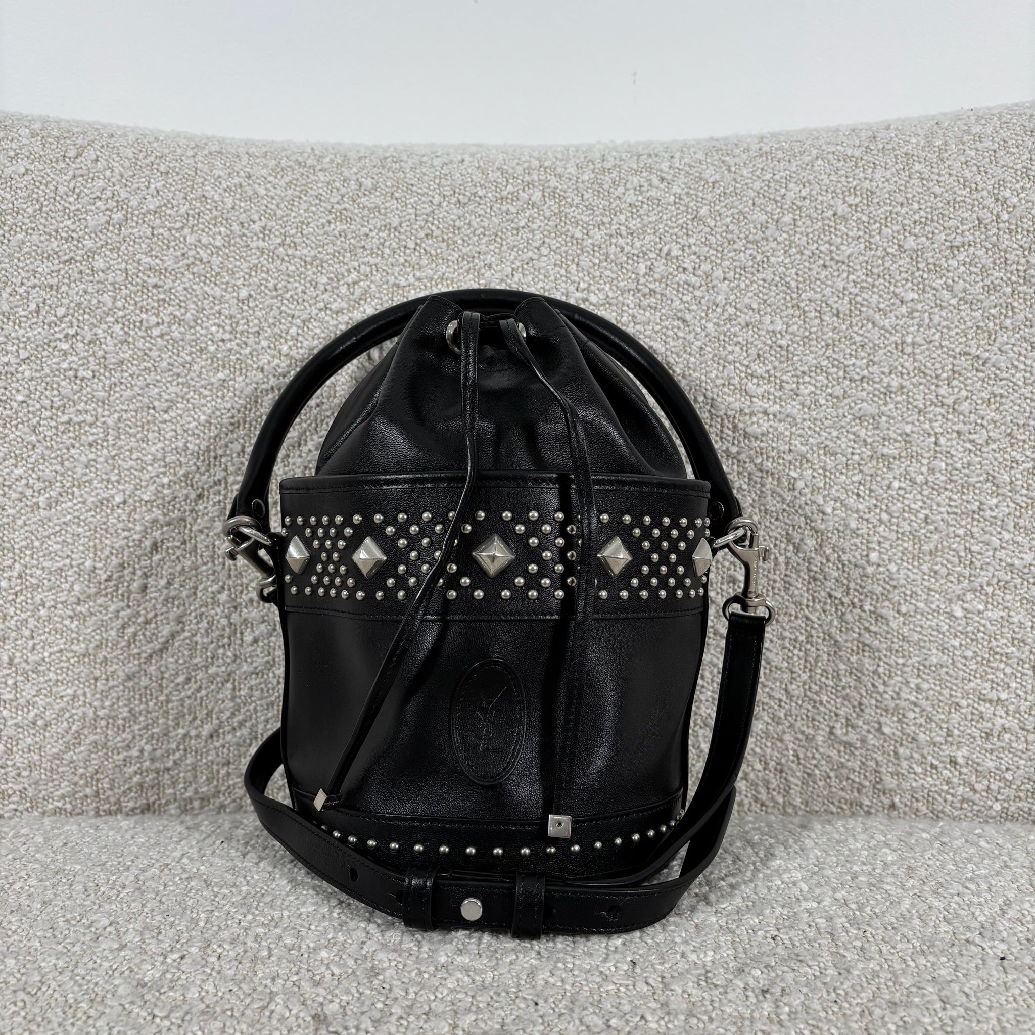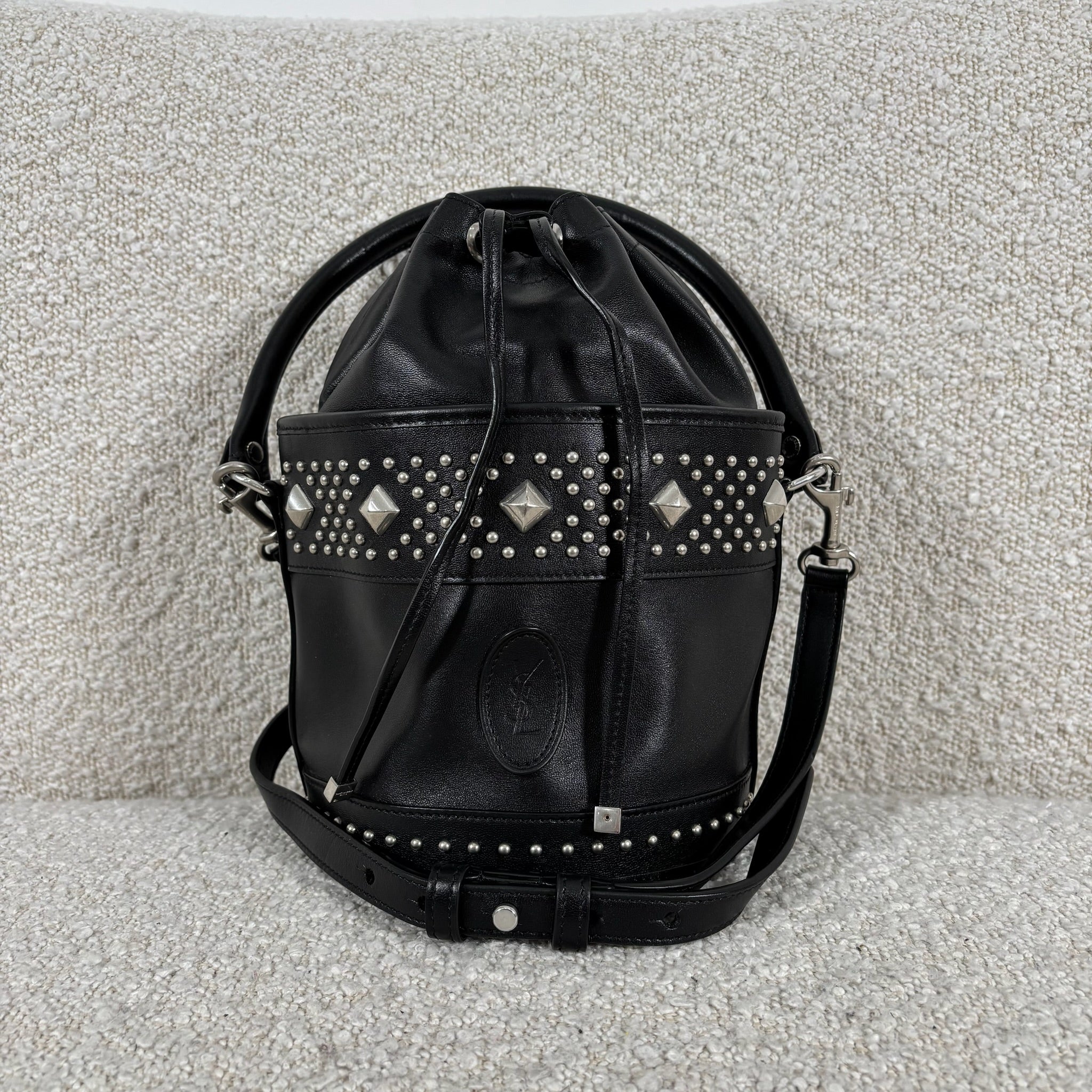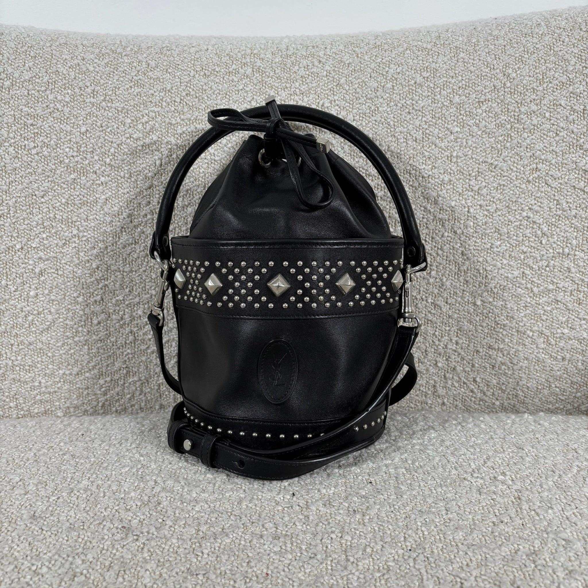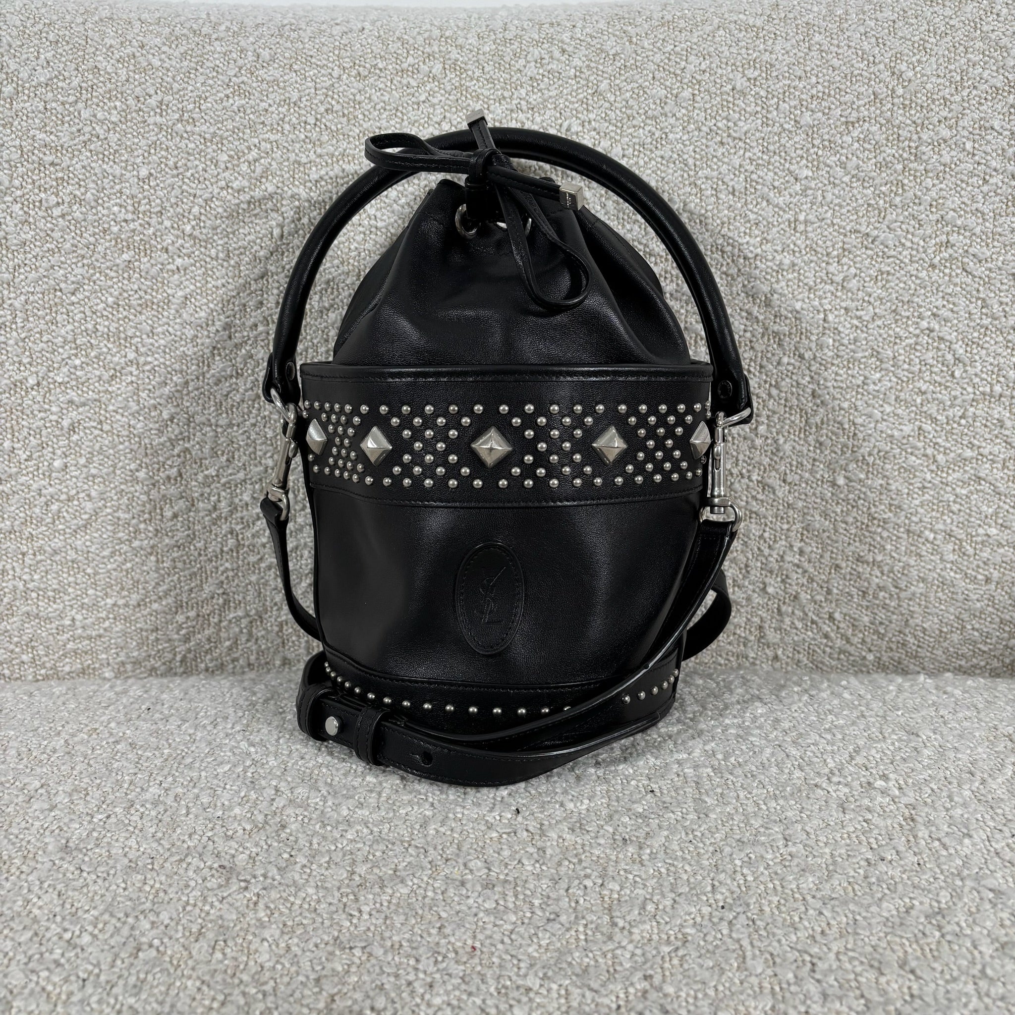 A chic take on the everyday bucket bag, this piece blends classic shape with bold attitude. Crafted from smooth black calfskin leather, it’s accented with striking silver stud details for a modern edge. Architectural influences lend subtle structure, while the signature Saint Laurent logo anchors the design at the front. Features include a rounded top handle, a removable and adjustable shoulder strap, secure toggle closure, a roomy interior, and a matching interior pouch for easy organization. Effortlessly versatile, it pairs beautifully with statement jewelry, sleek heels, or a leather jacket for a polished yet edgy look.
