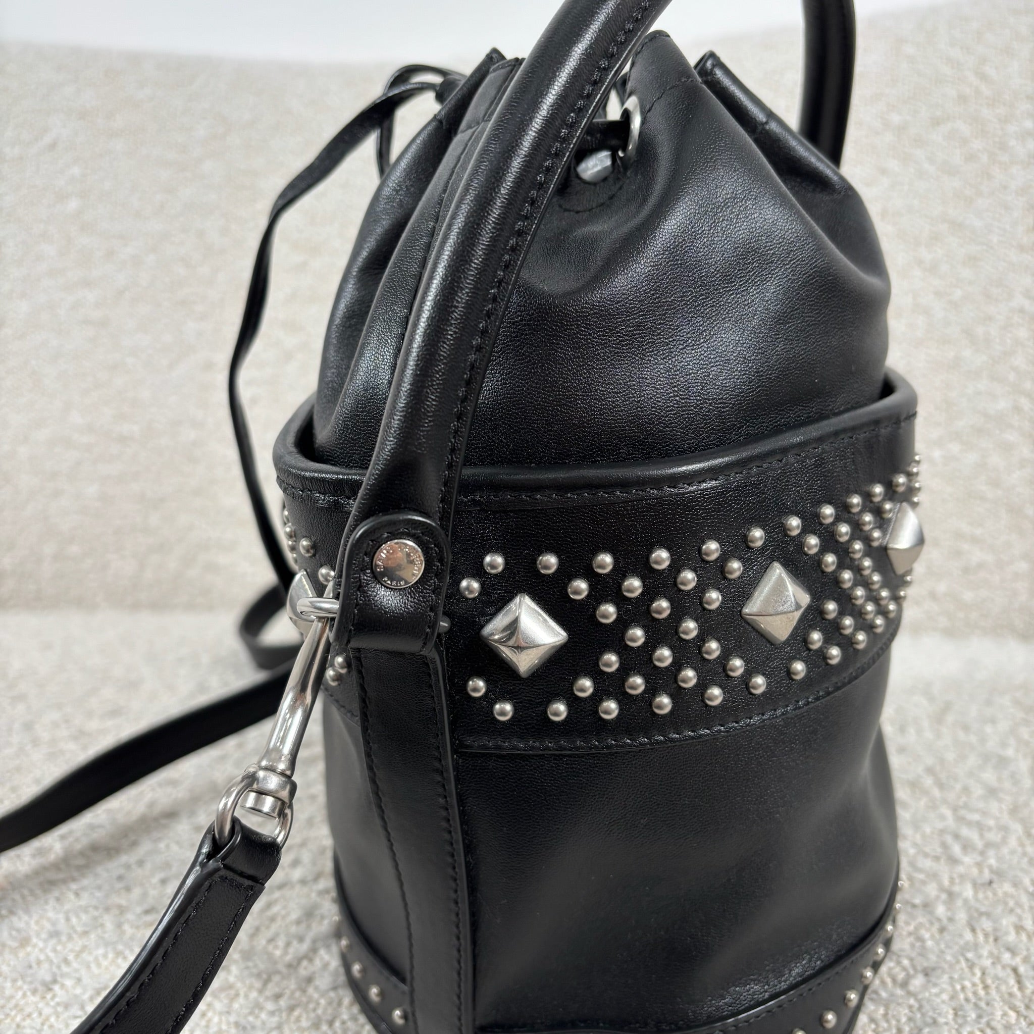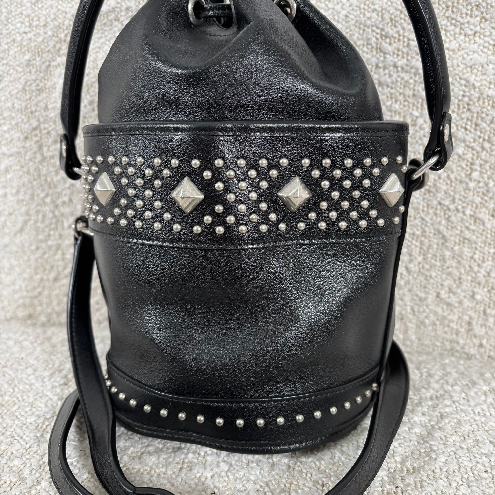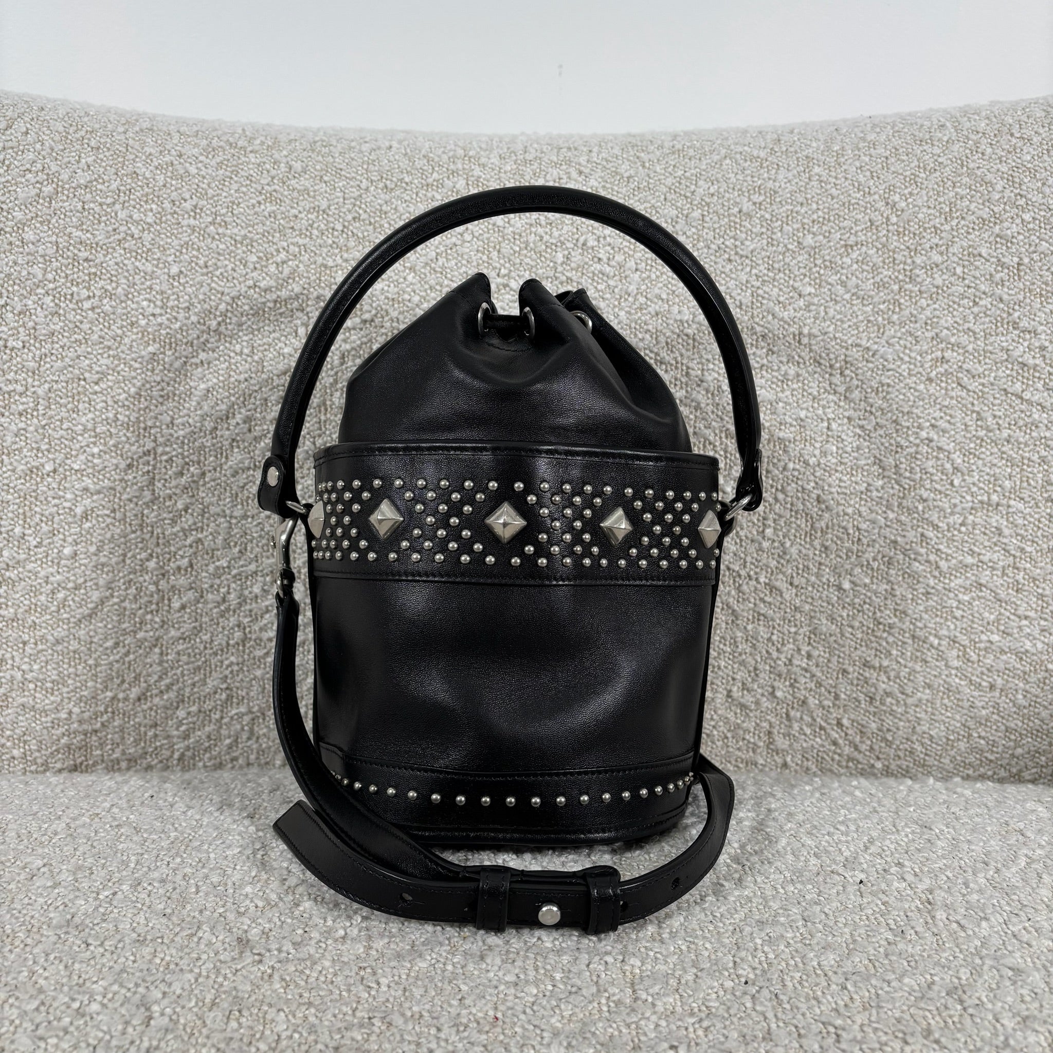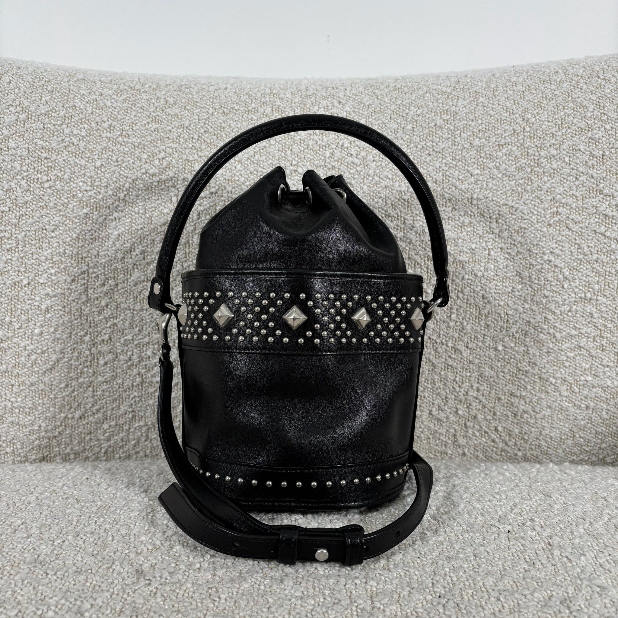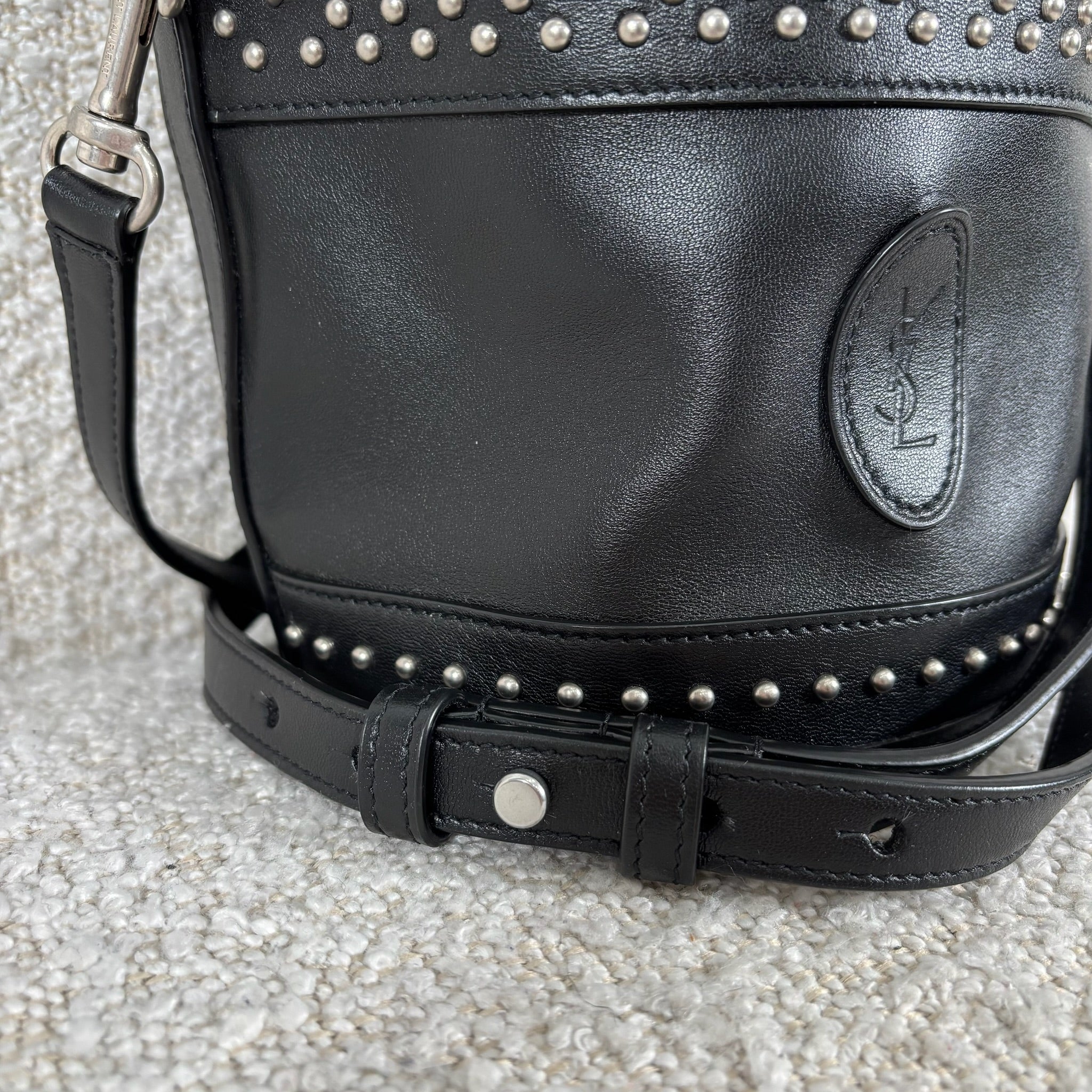 A chic take on the everyday bucket bag, this piece blends classic shape with bold attitude. Crafted from smooth black calfskin leather, it’s accented with striking silver stud details for a modern edge. Architectural influences lend subtle structure, while the signature Saint Laurent logo anchors the design at the front. Features include a rounded top handle, a removable and adjustable shoulder strap, secure toggle closure, a roomy interior, and a matching interior pouch for easy organization. Effortlessly versatile, it pairs beautifully with statement jewelry, sleek heels, or a leather jacket for a polished yet edgy look.