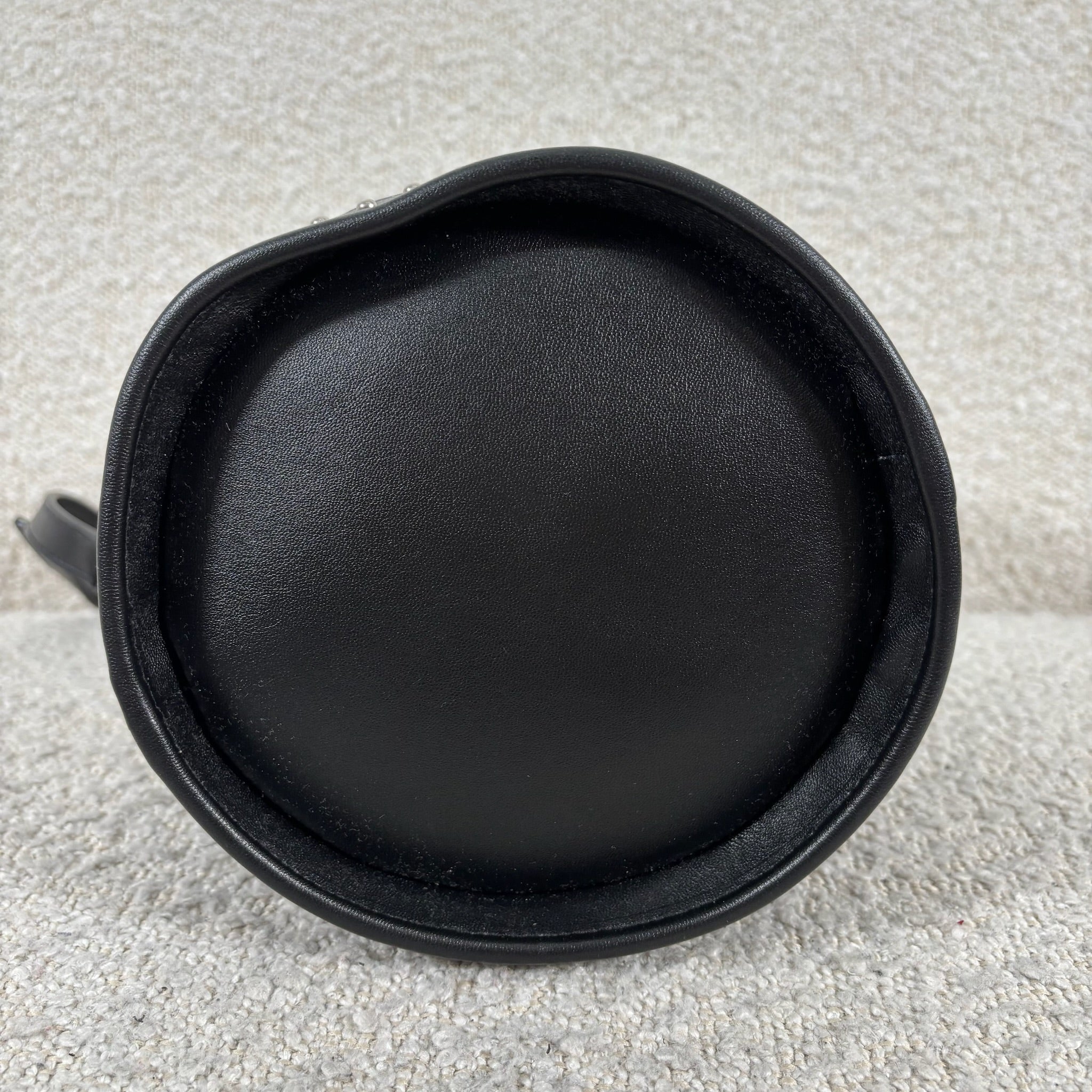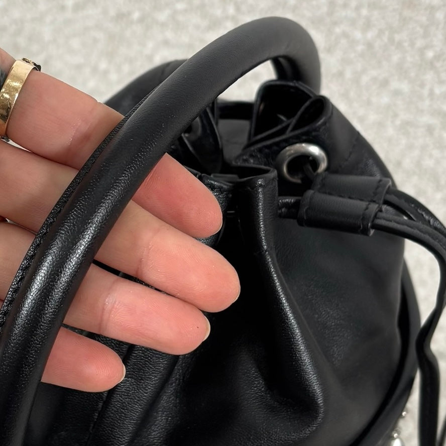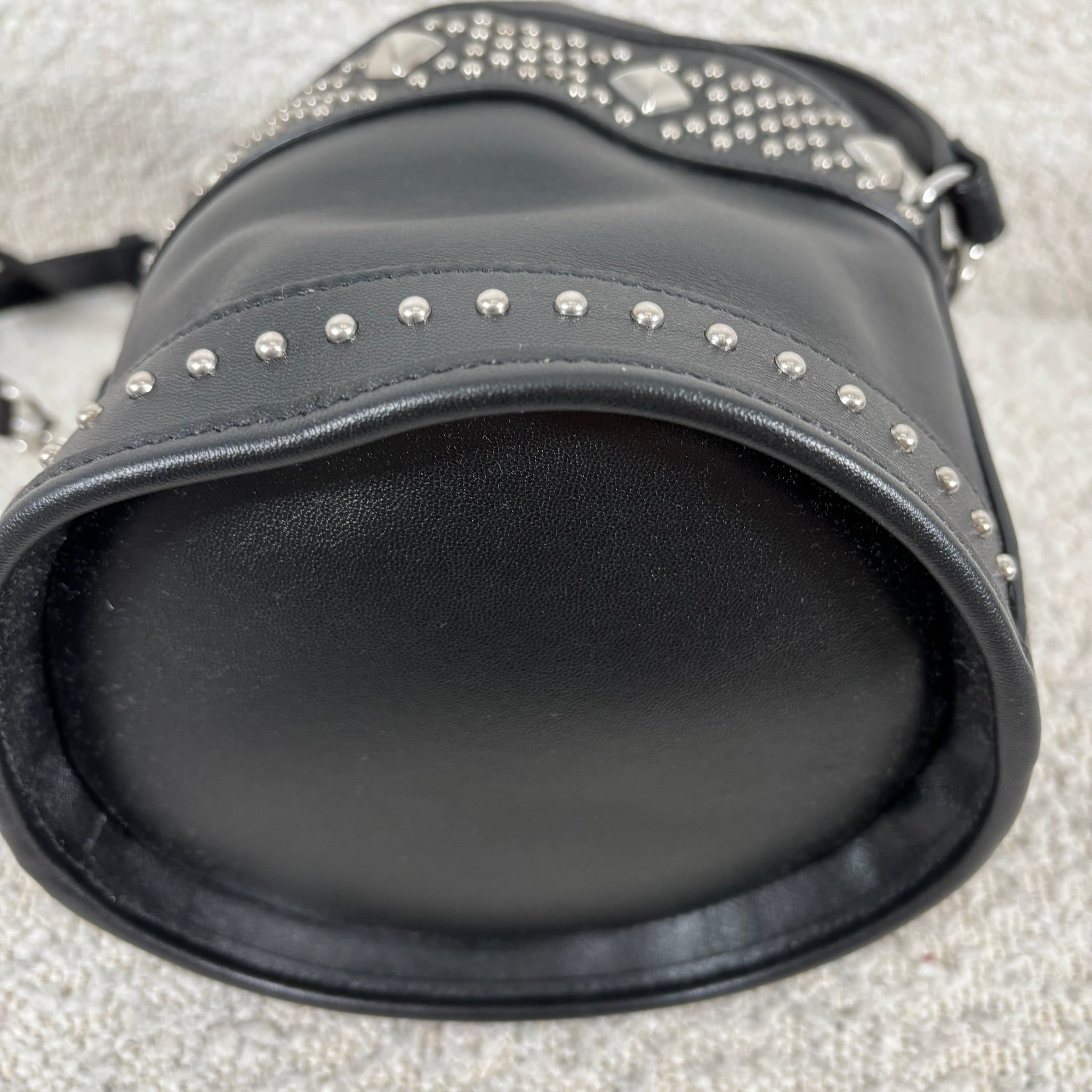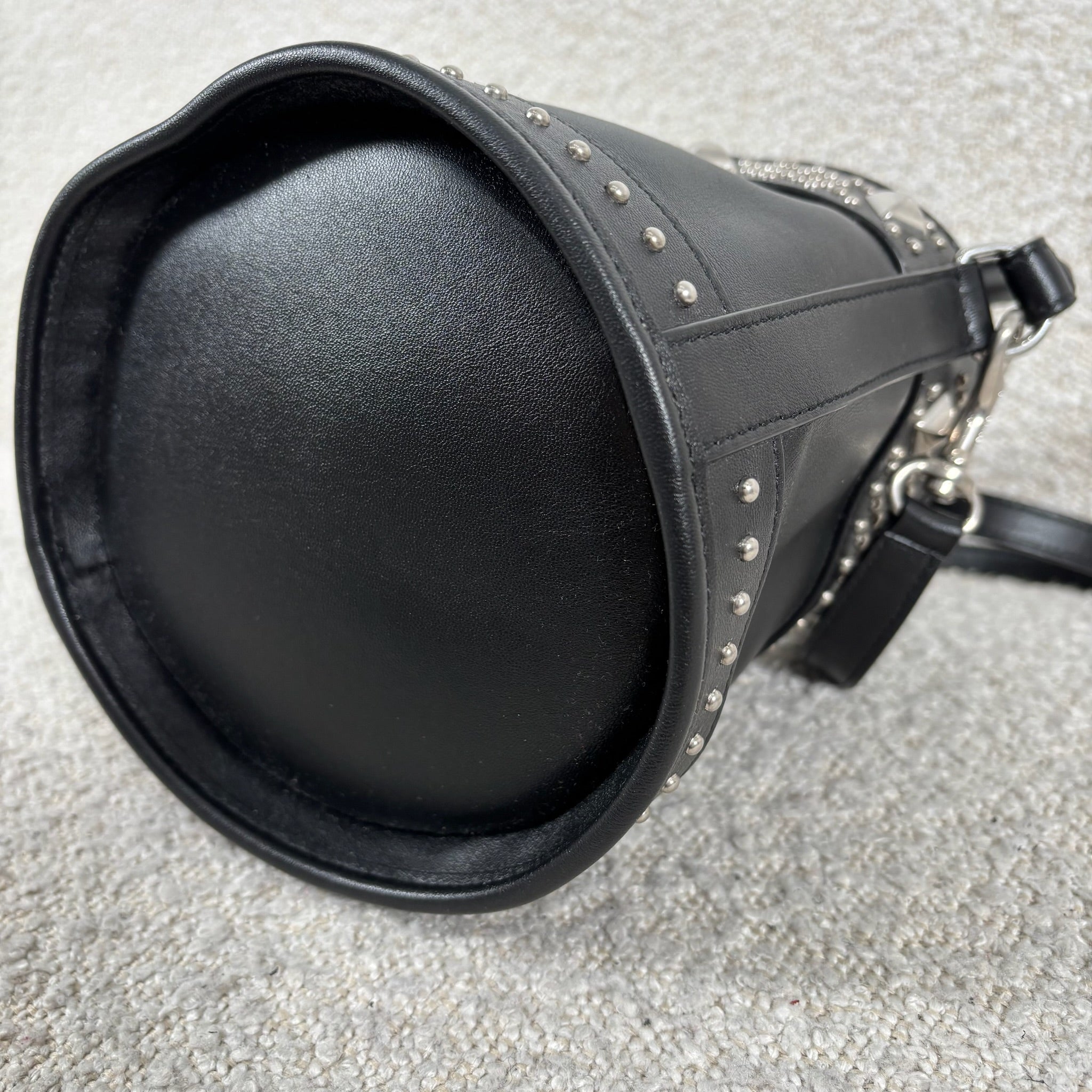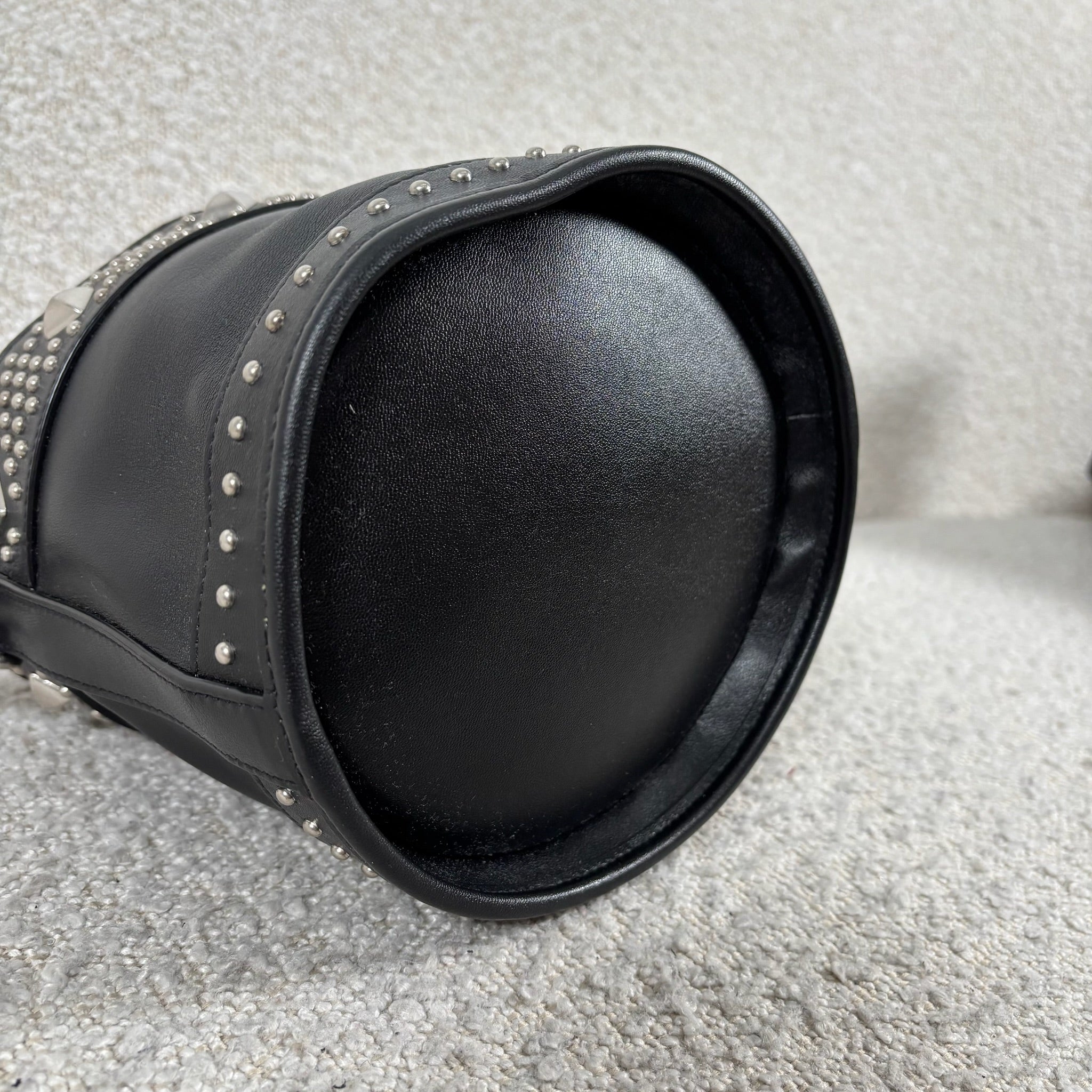 A chic take on the everyday bucket bag, this piece blends classic shape with bold attitude. Crafted from smooth black calfskin leather, it’s accented with striking silver stud details for a modern edge. Architectural influences lend subtle structure, while the signature Saint Laurent logo anchors the design at the front. Features include a rounded top handle, a removable and adjustable shoulder strap, secure toggle closure, a roomy interior, and a matching interior pouch for easy organization. Effortlessly versatile, it pairs beautifully with statement jewelry, sleek heels, or a leather jacket for a polished yet edgy look.