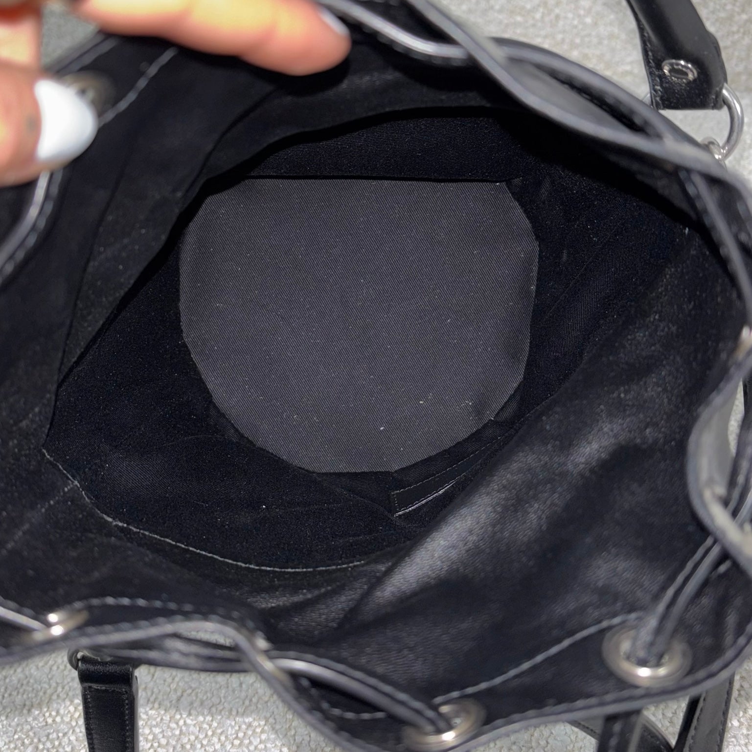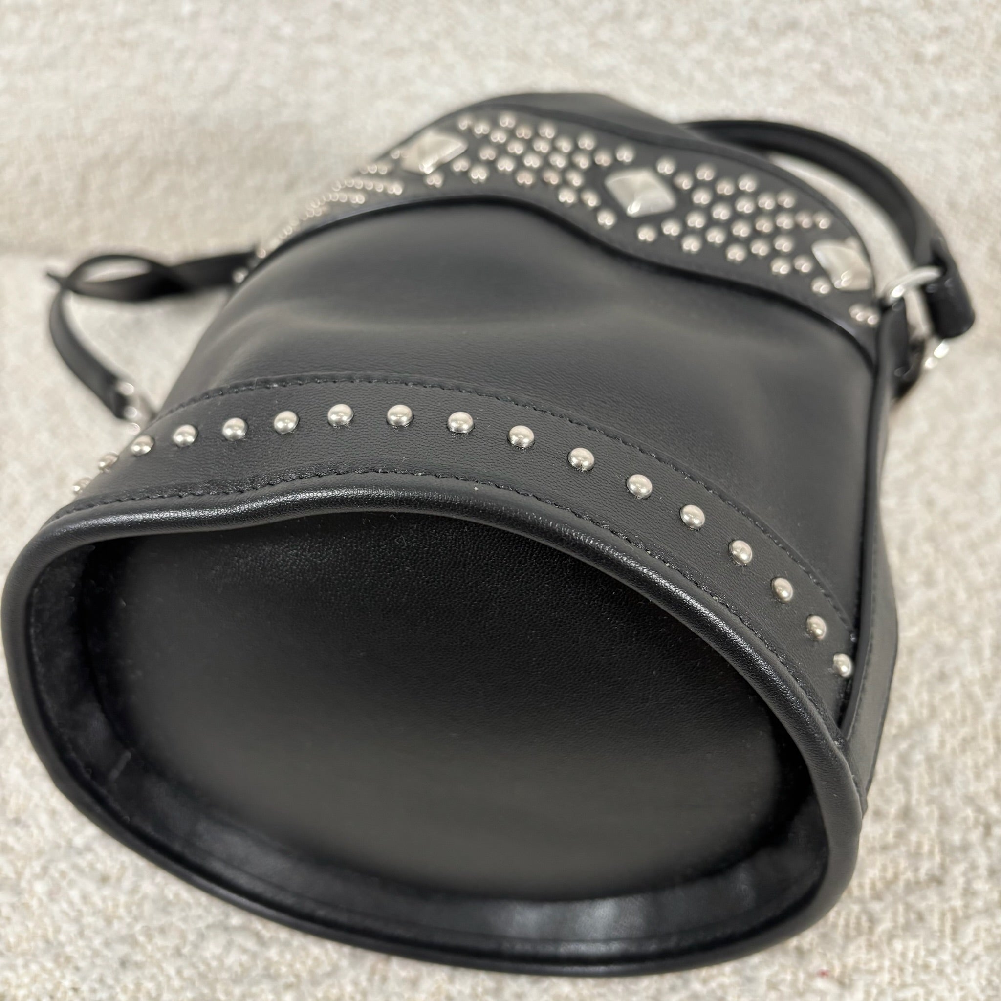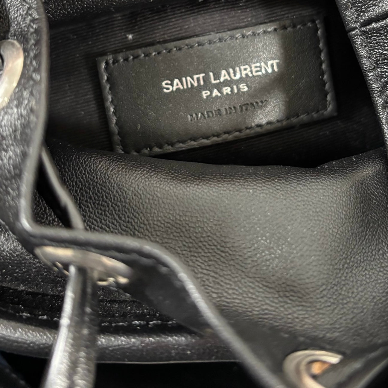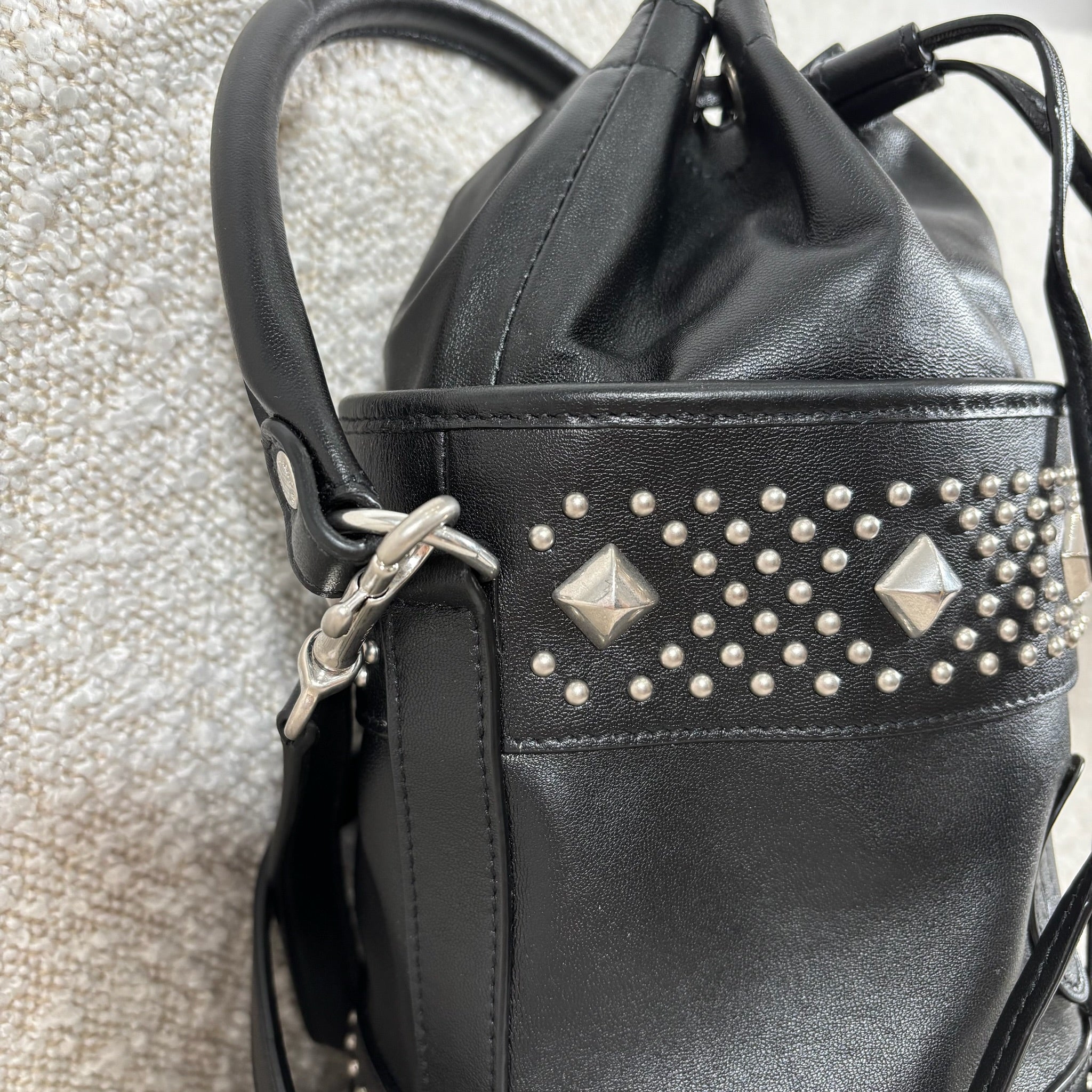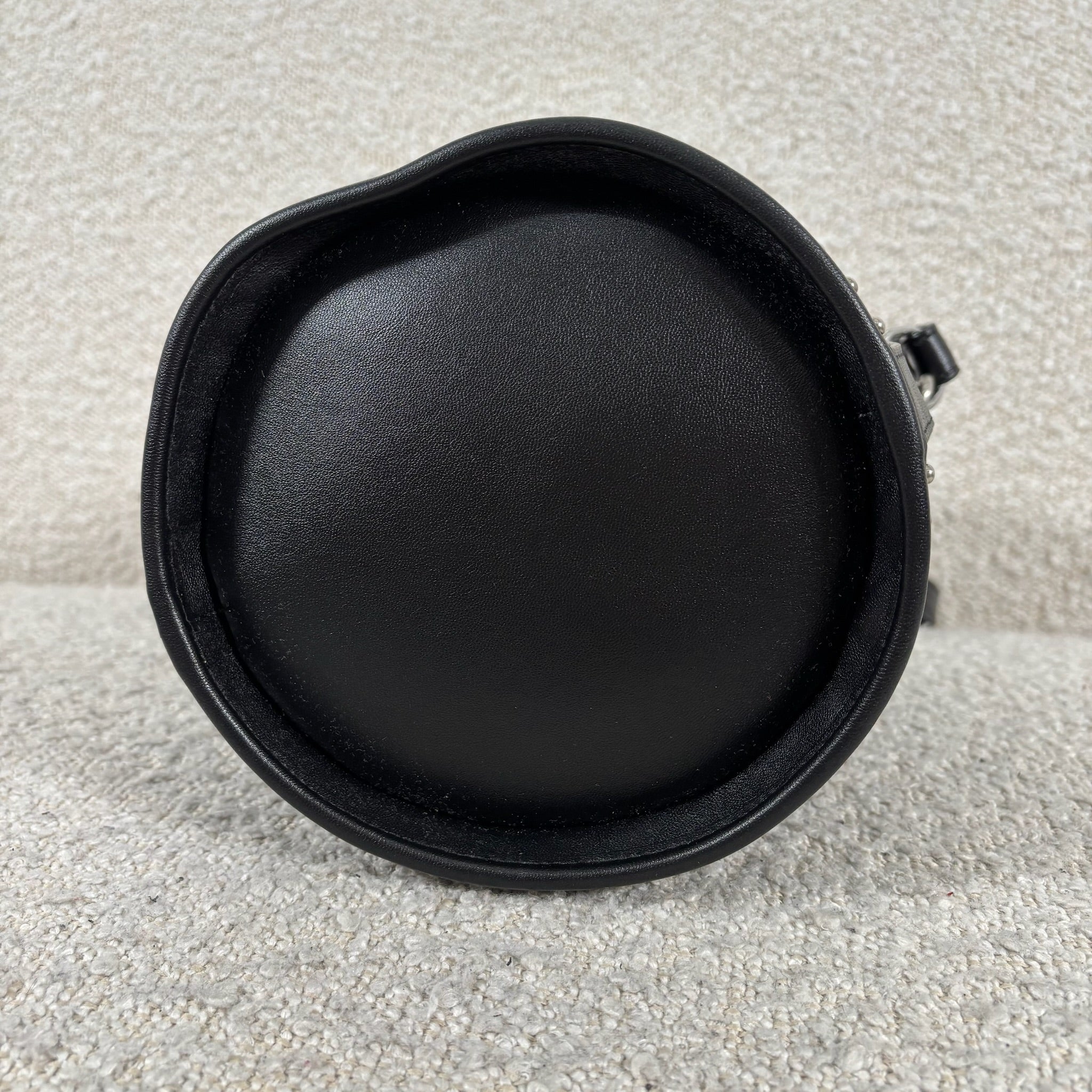 A chic take on the everyday bucket bag, this piece blends classic shape with bold attitude. Crafted from smooth black calfskin leather, it’s accented with striking silver stud details for a modern edge. Architectural influences lend subtle structure, while the signature Saint Laurent logo anchors the design at the front. Features include a rounded top handle, a removable and adjustable shoulder strap, secure toggle closure, a roomy interior, and a matching interior pouch for easy organization. Effortlessly versatile, it pairs beautifully with statement jewelry, sleek heels, or a leather jacket for a polished yet edgy look.