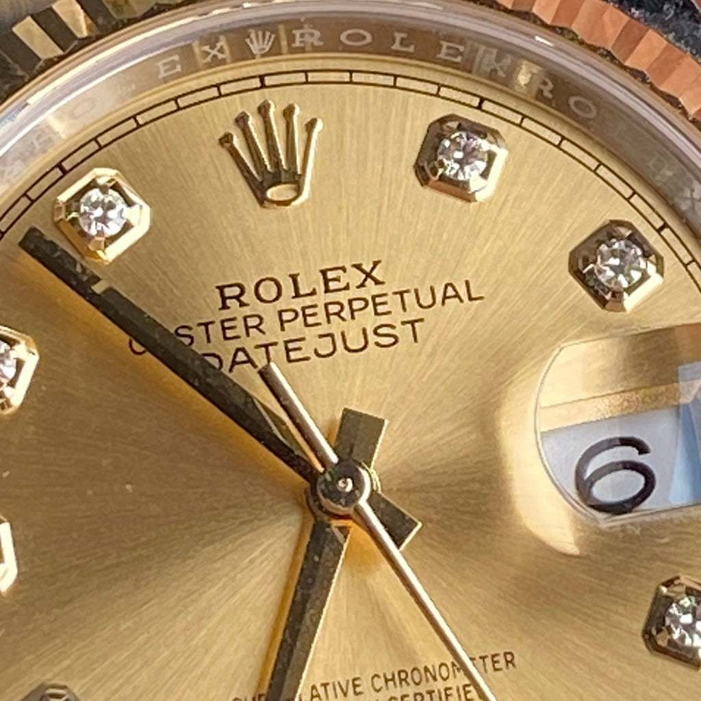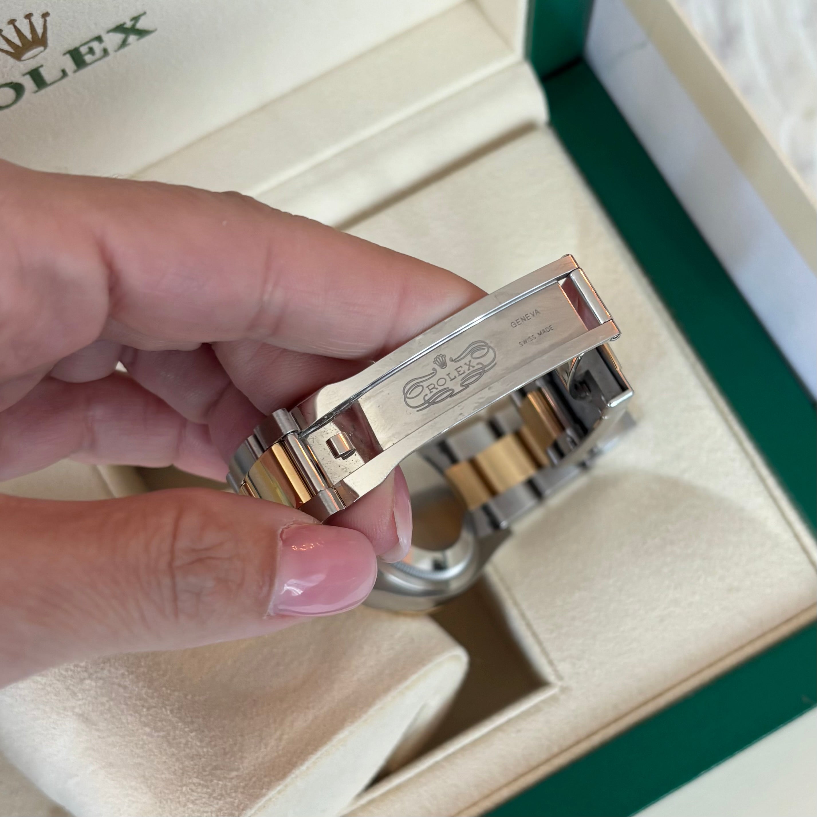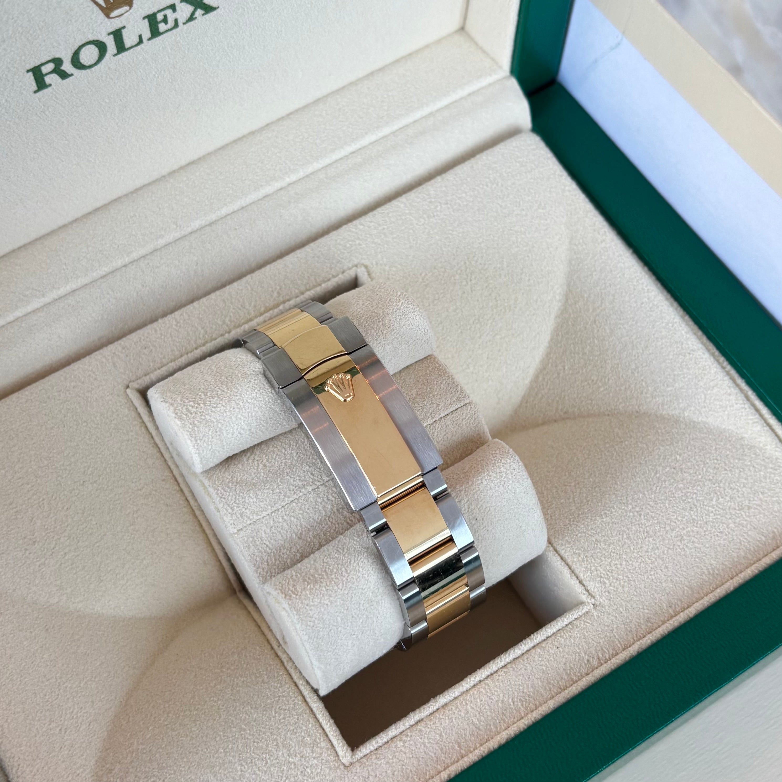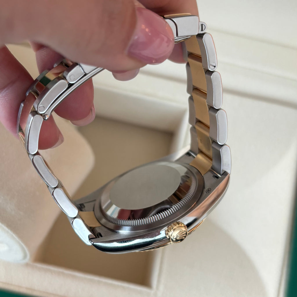 Size 36. Two tone. Yellow gold and stainless. Diamond markers. December 2024.