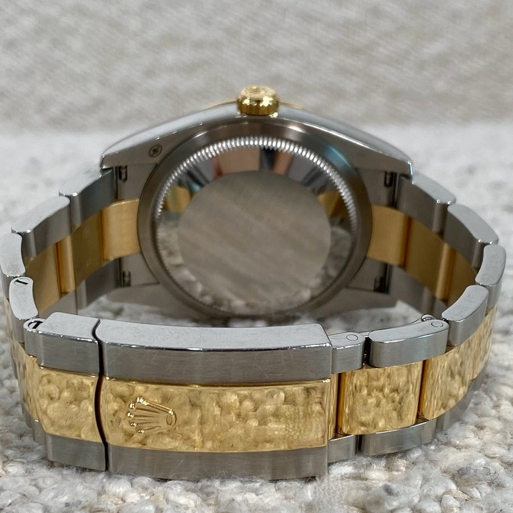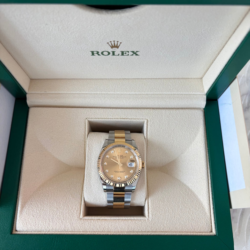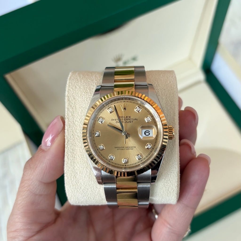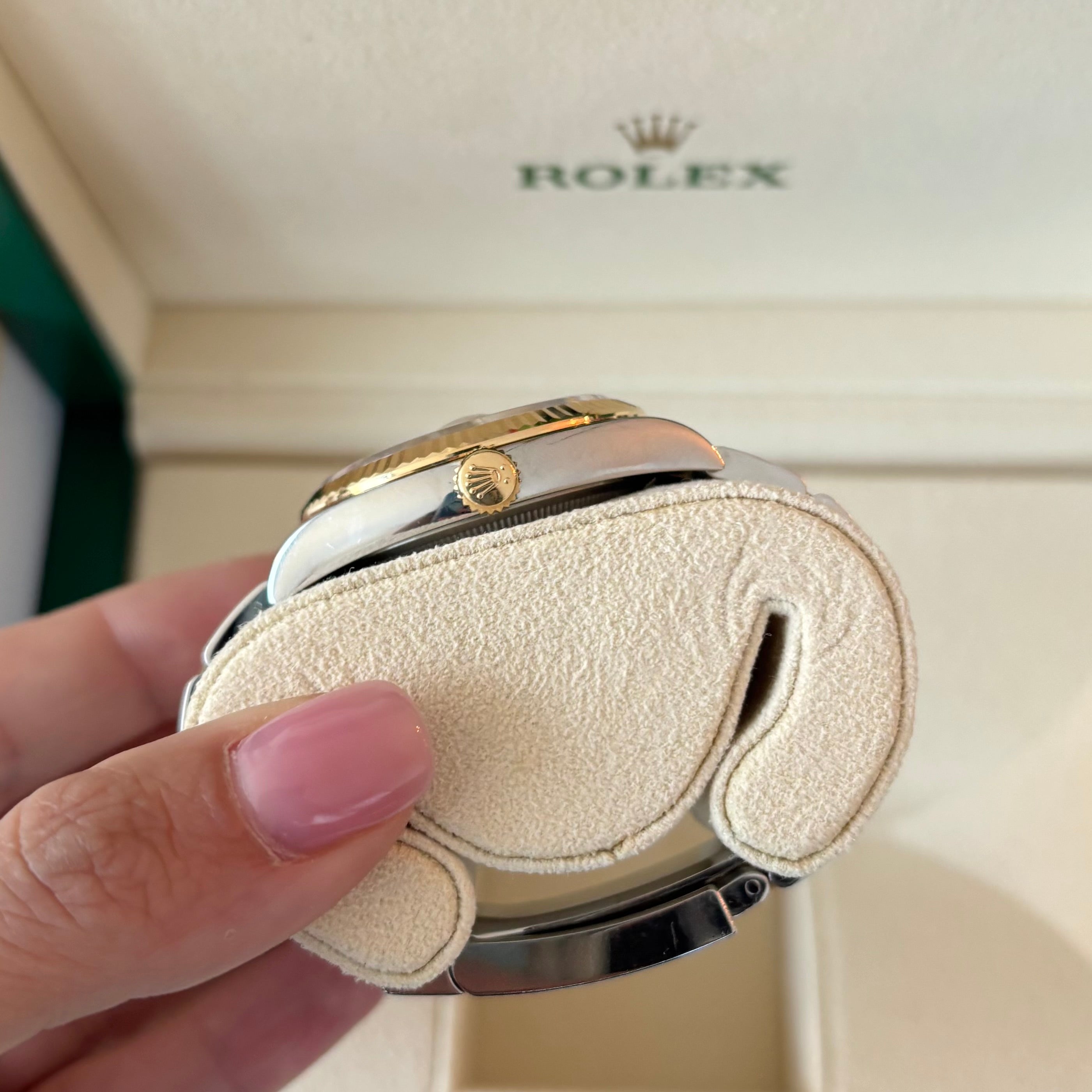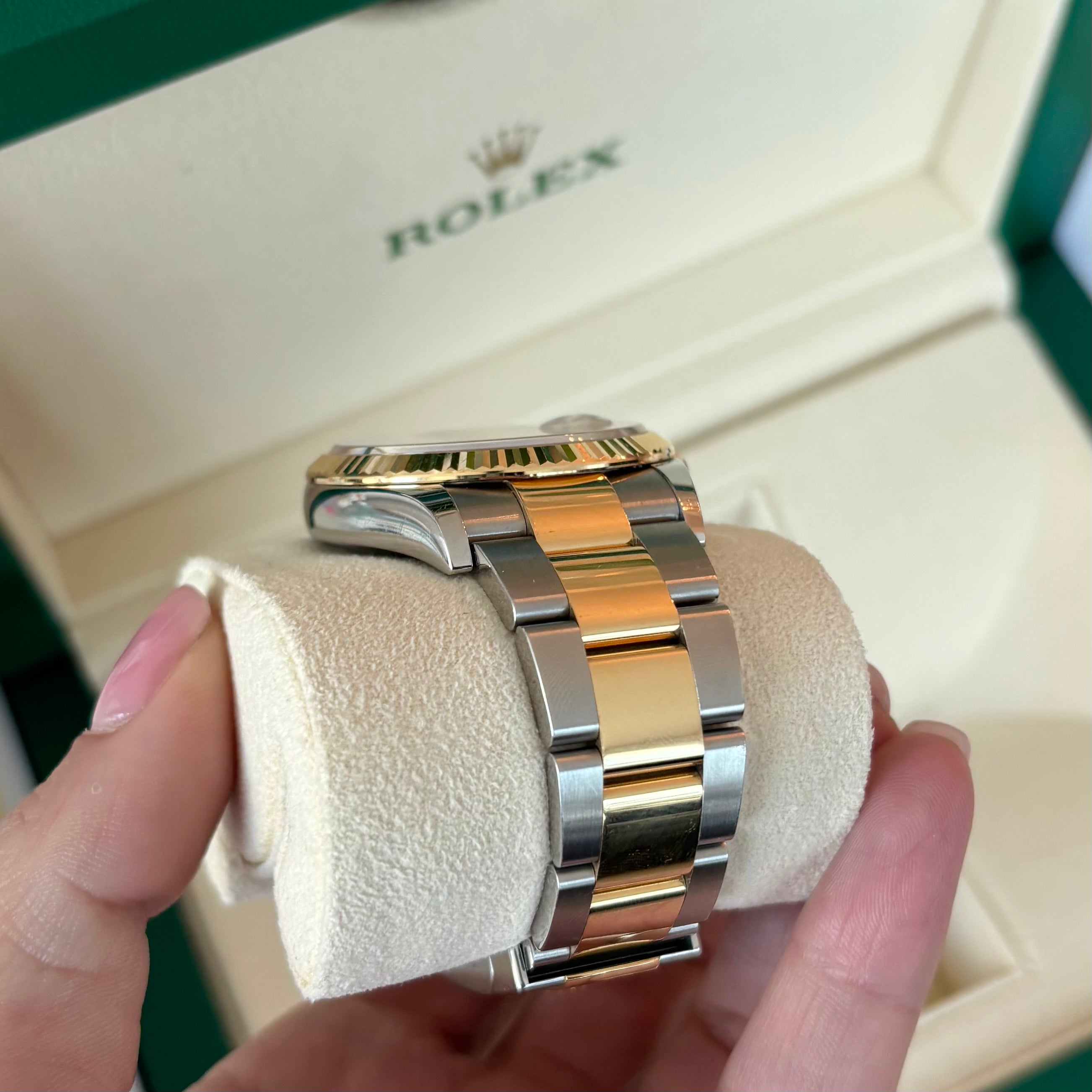 Size 36. Two tone. Yellow gold and stainless. Diamond markers. December 2024.