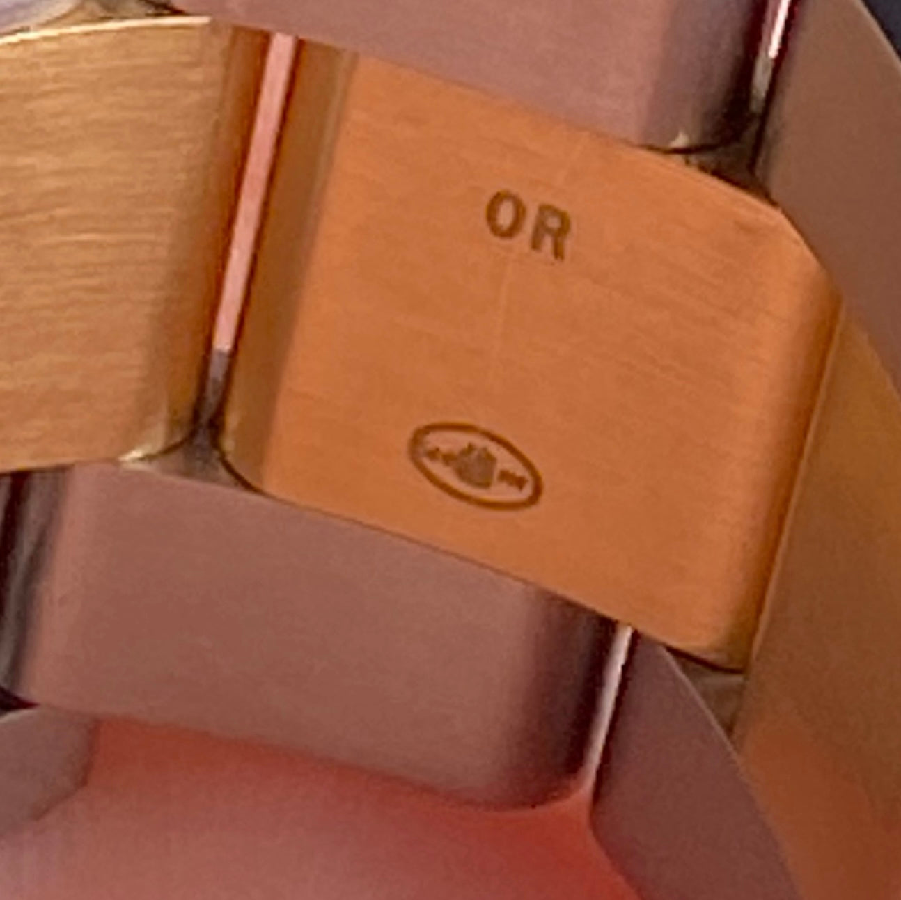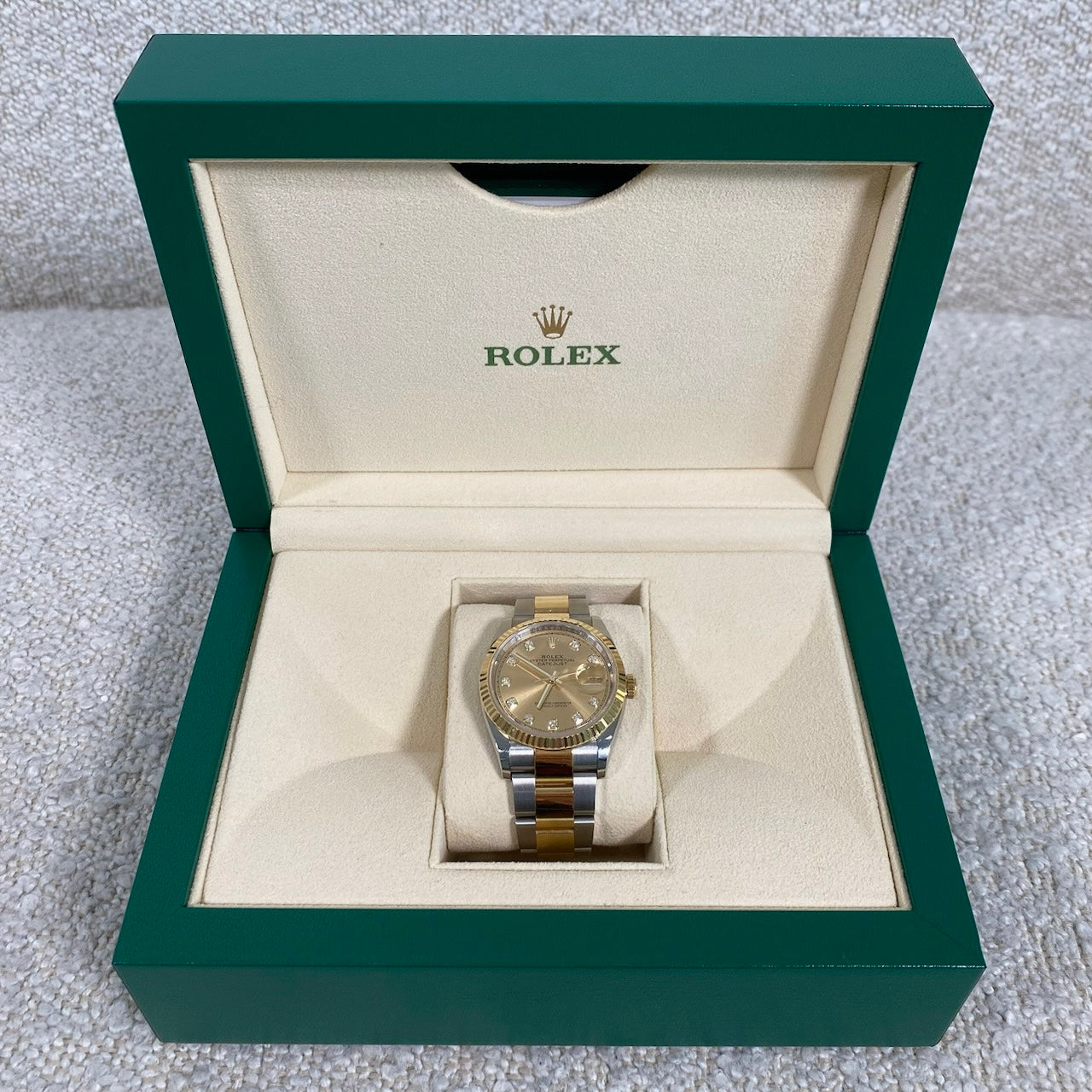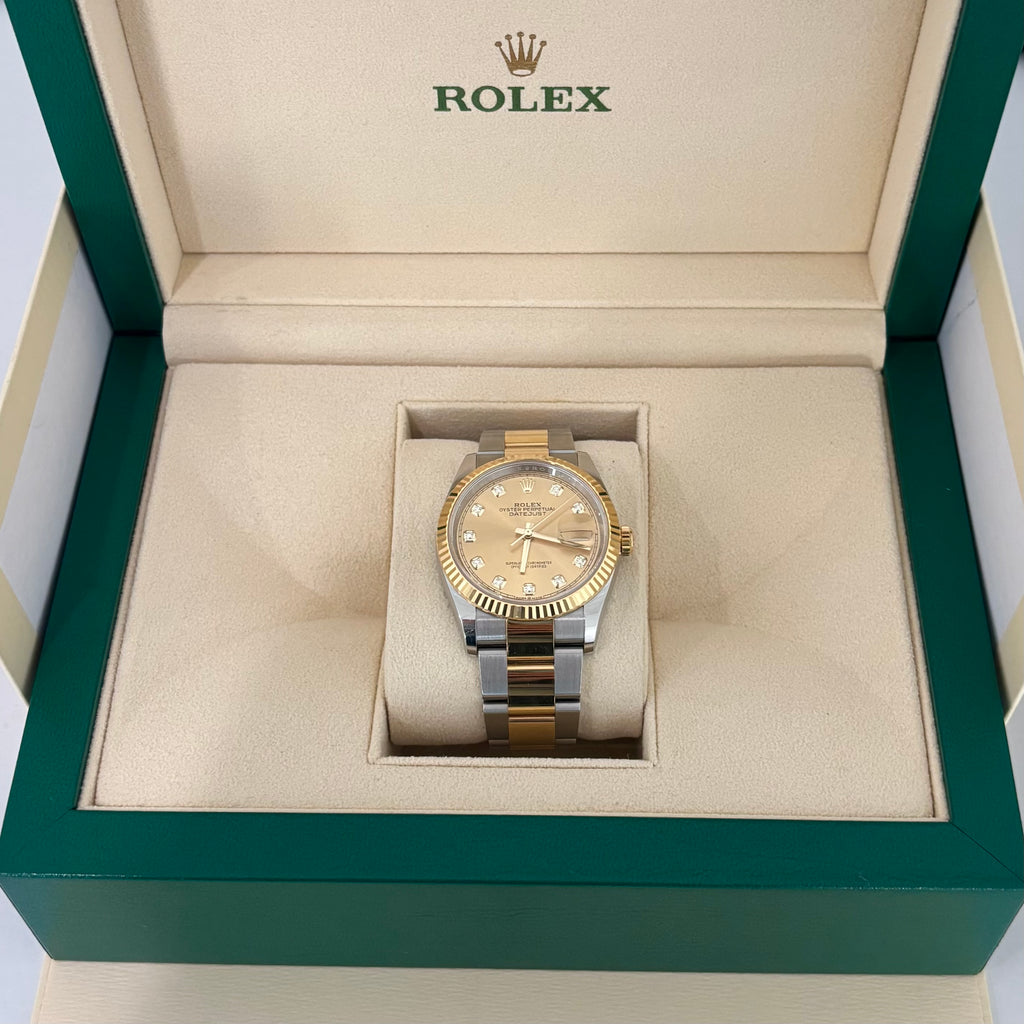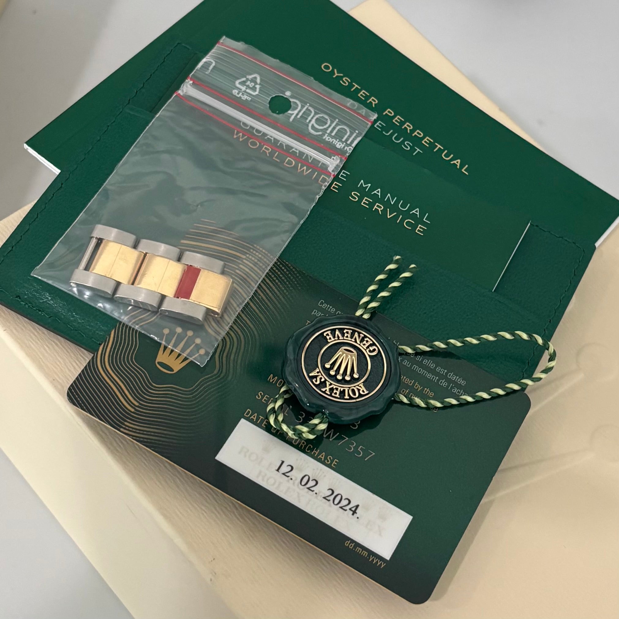 Size 36. Two tone. Yellow gold and stainless. Diamond markers. December 2024.