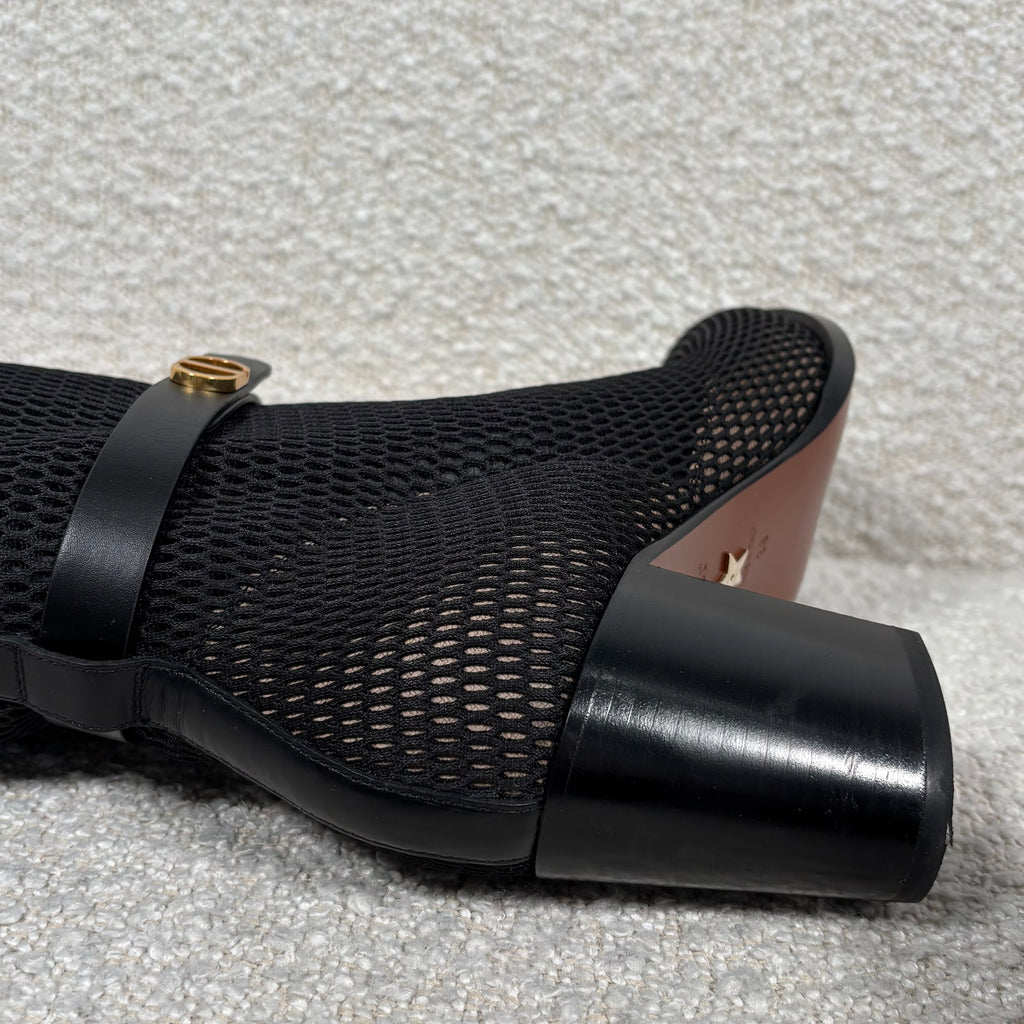 Black mesh textile and leather. Gold tone hardware. Size 38. 3” heel height.