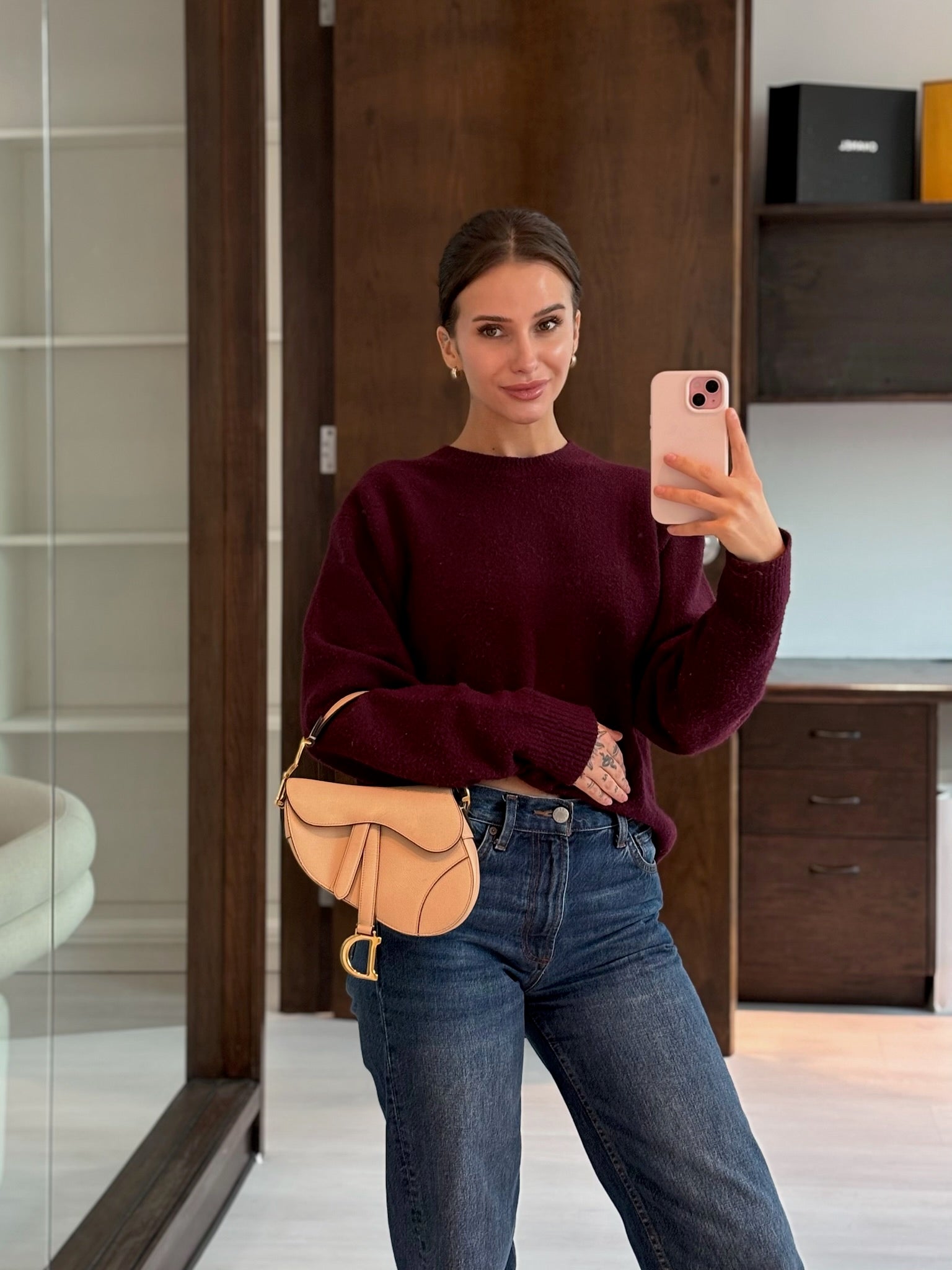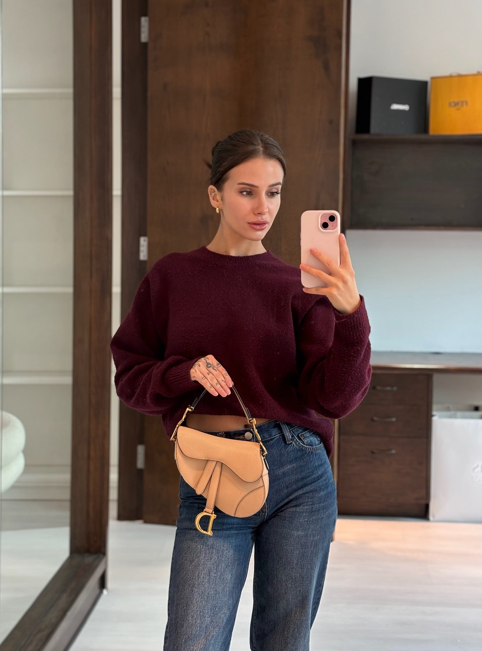 Beige grained leather with gold-tone hardware.