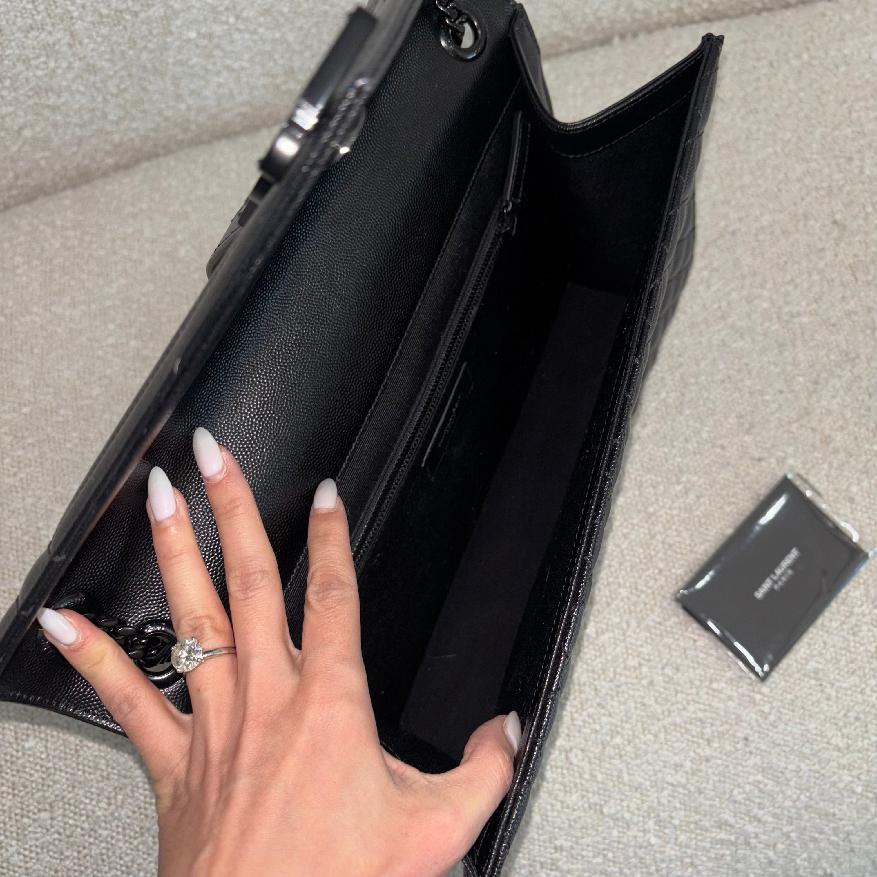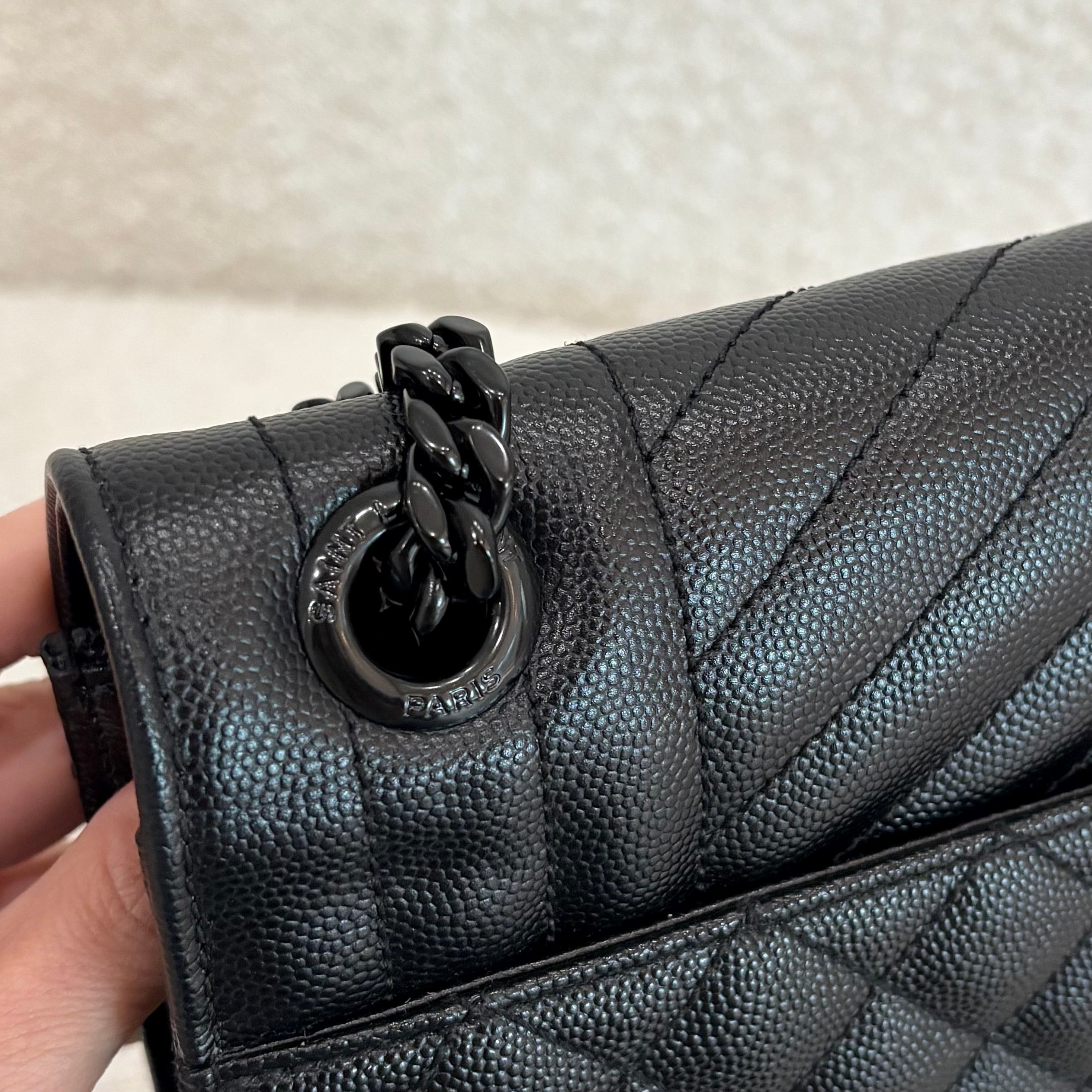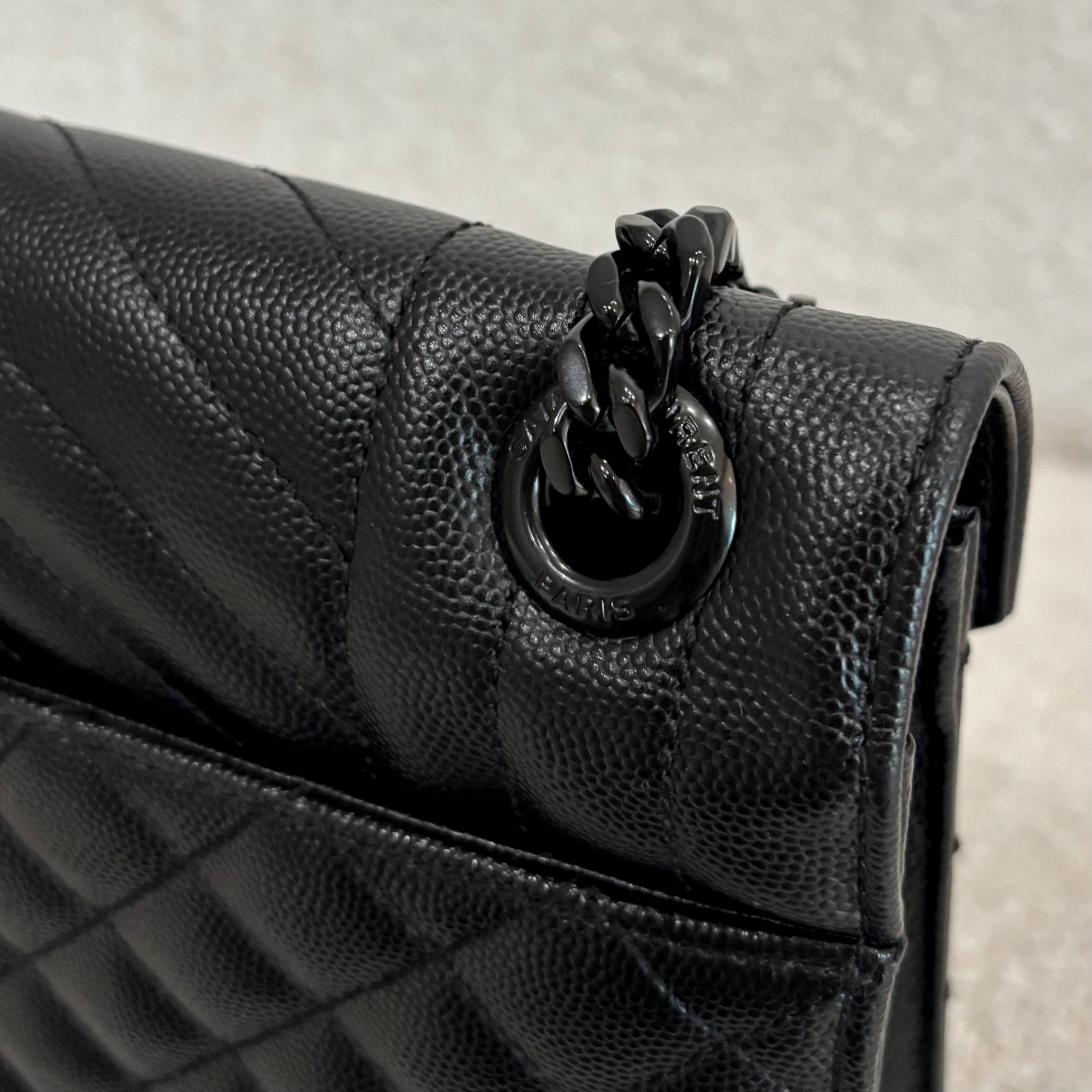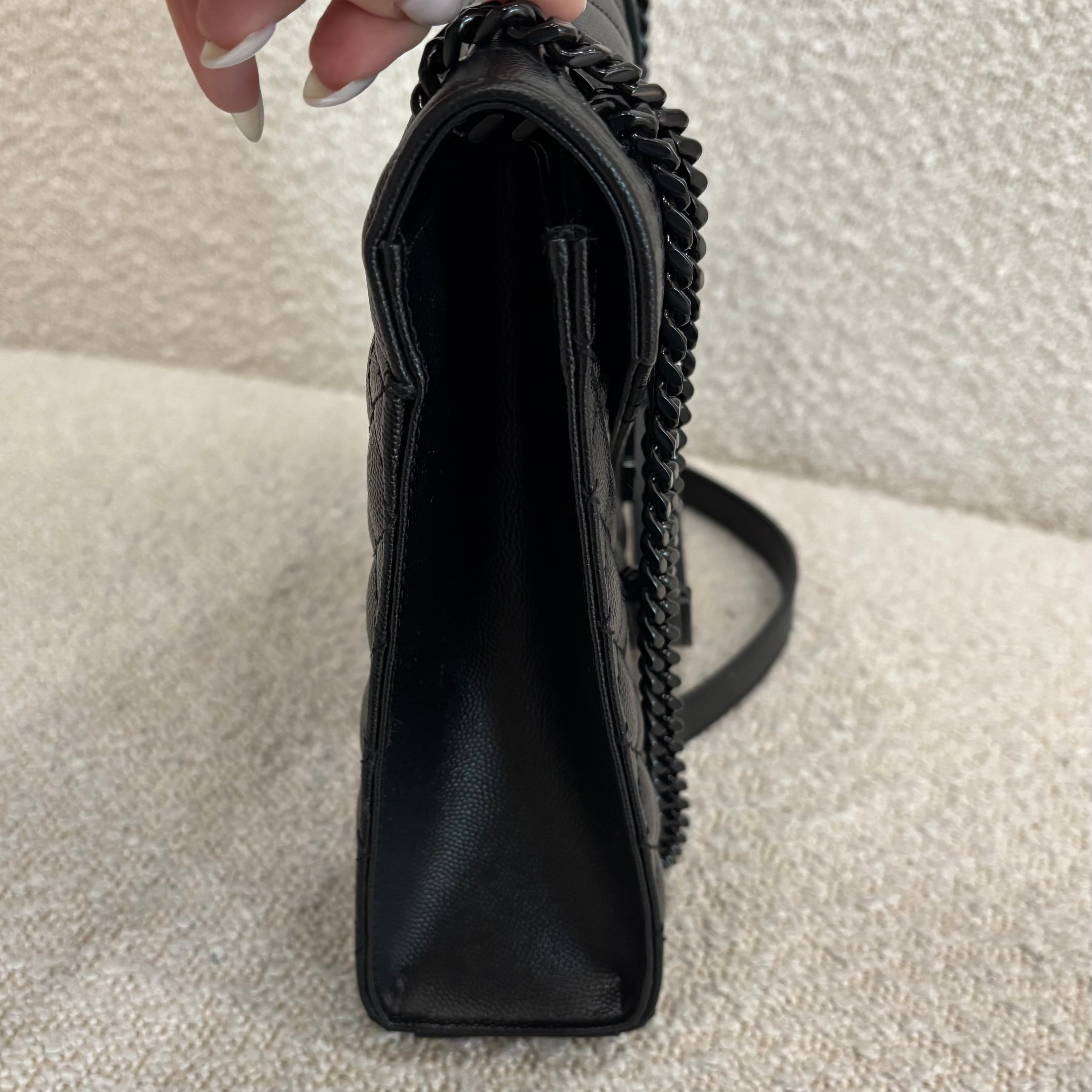Black grained leather. Black tone hardware. Large size. Size: 12.25" Length x 2.5" Depth x 9" Height • 12.5" - 21.25" Shoulder Strap Drop.
