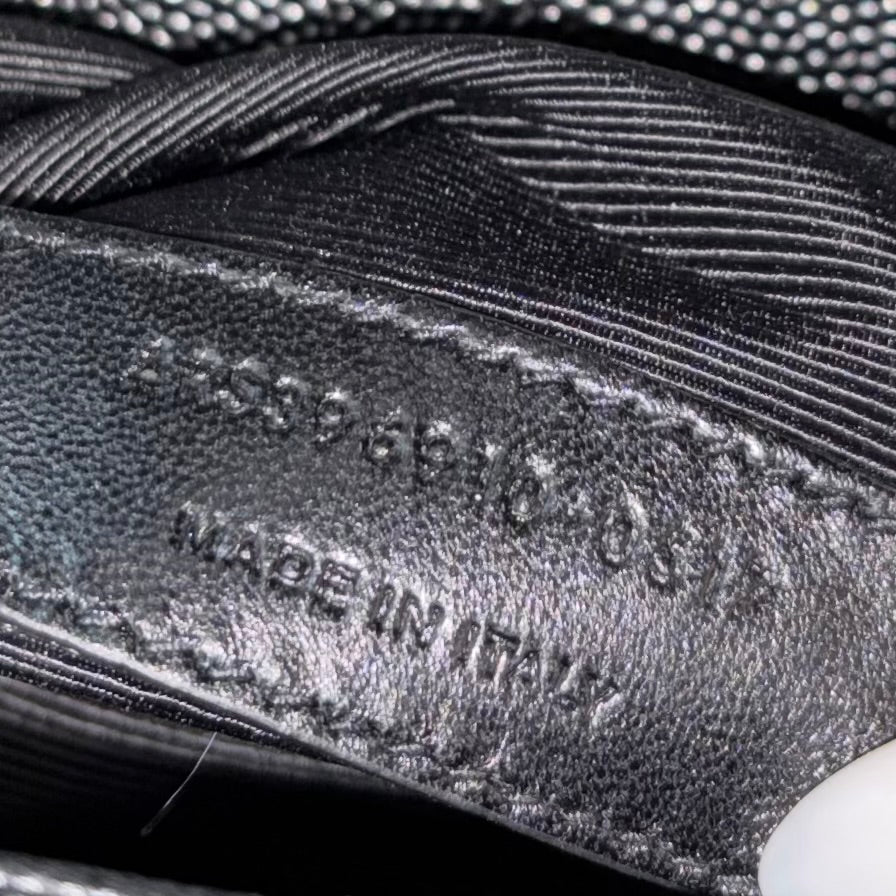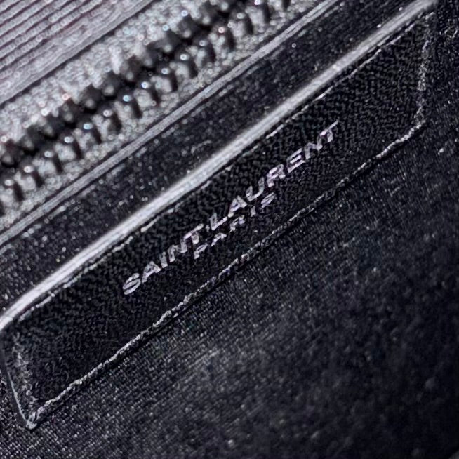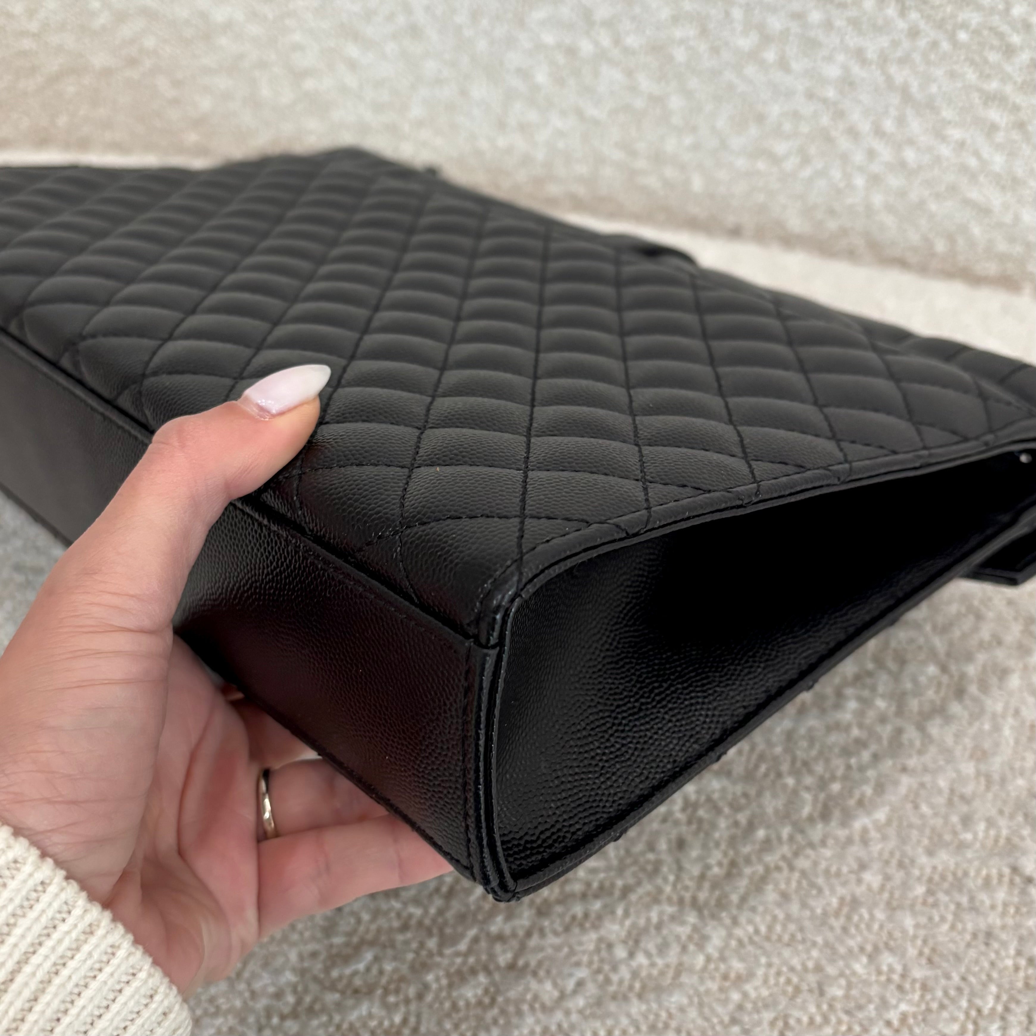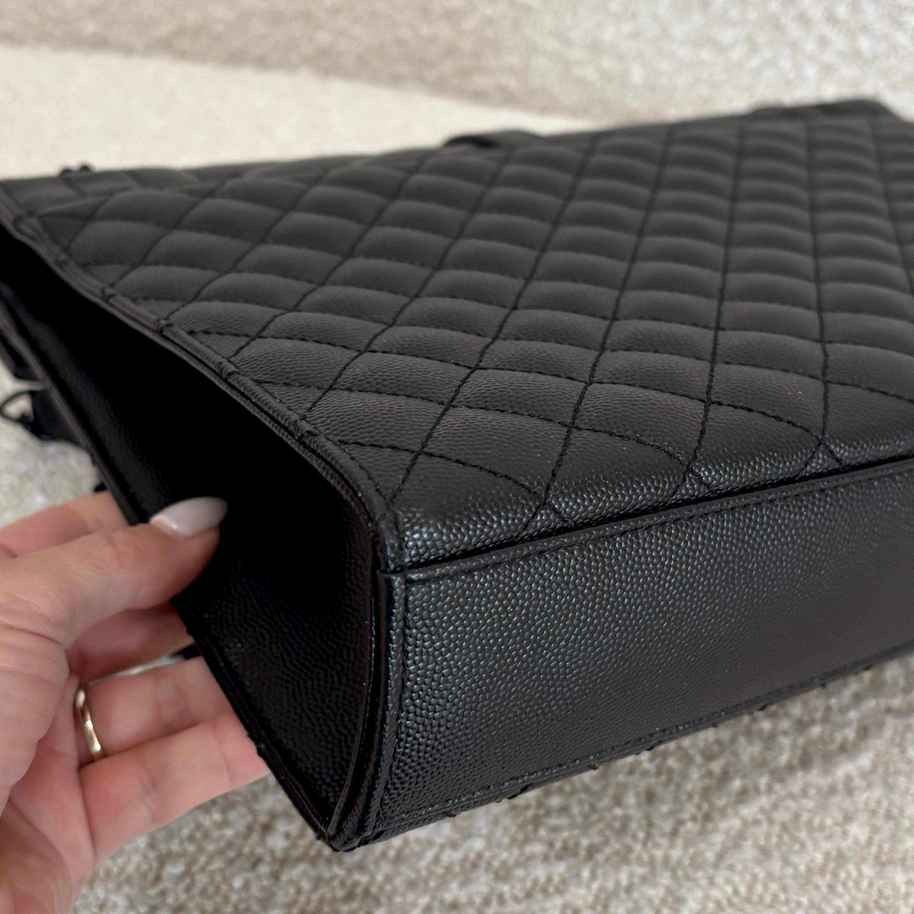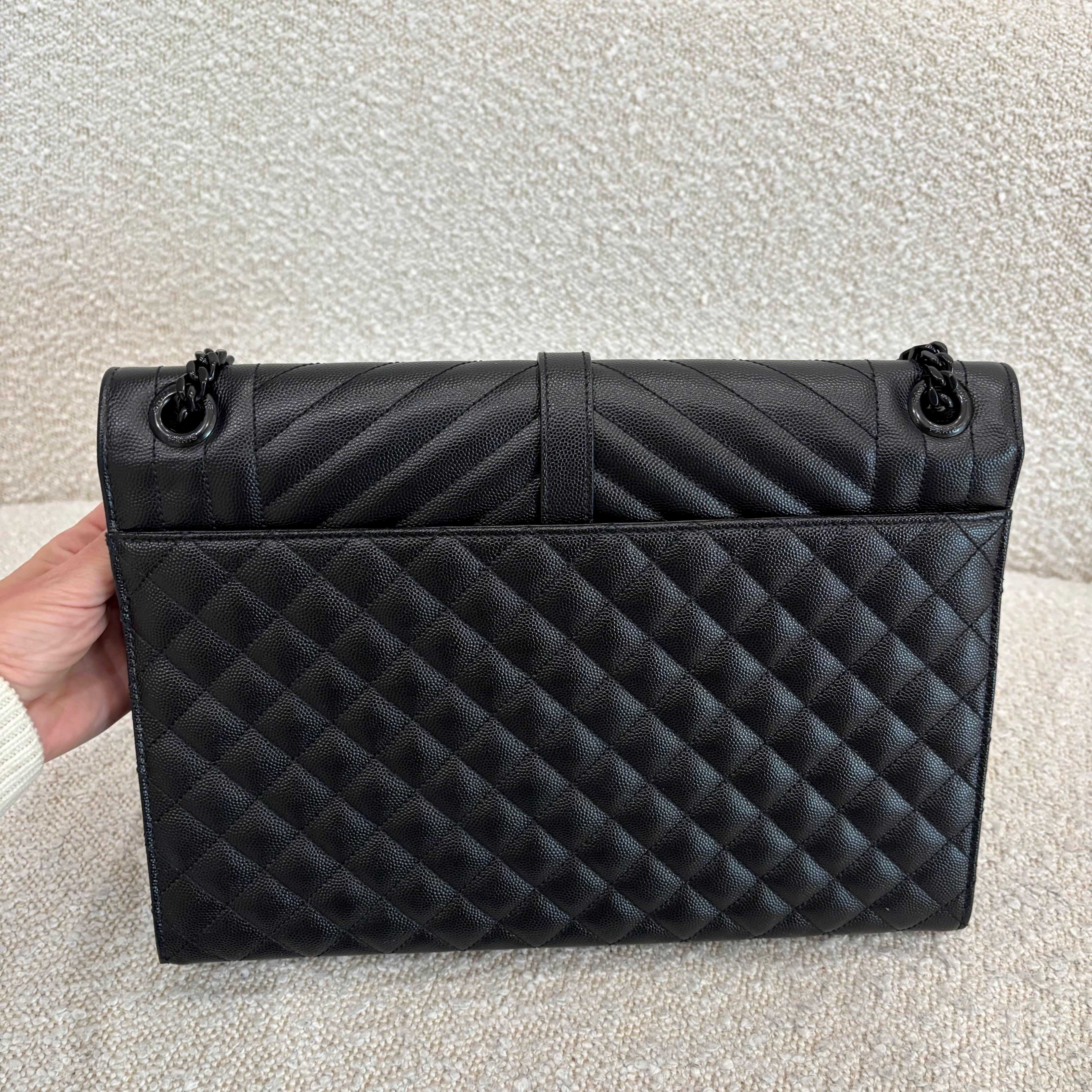 Black grained leather. Black tone hardware. Large size. Size: 12.25" Length x 2.5" Depth x 9" Height • 12.5" - 21.25" Shoulder Strap Drop.
