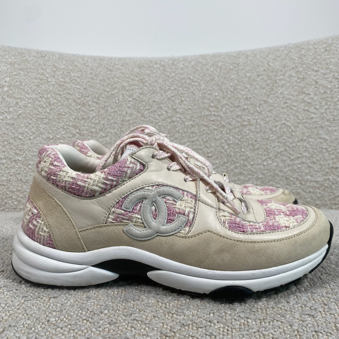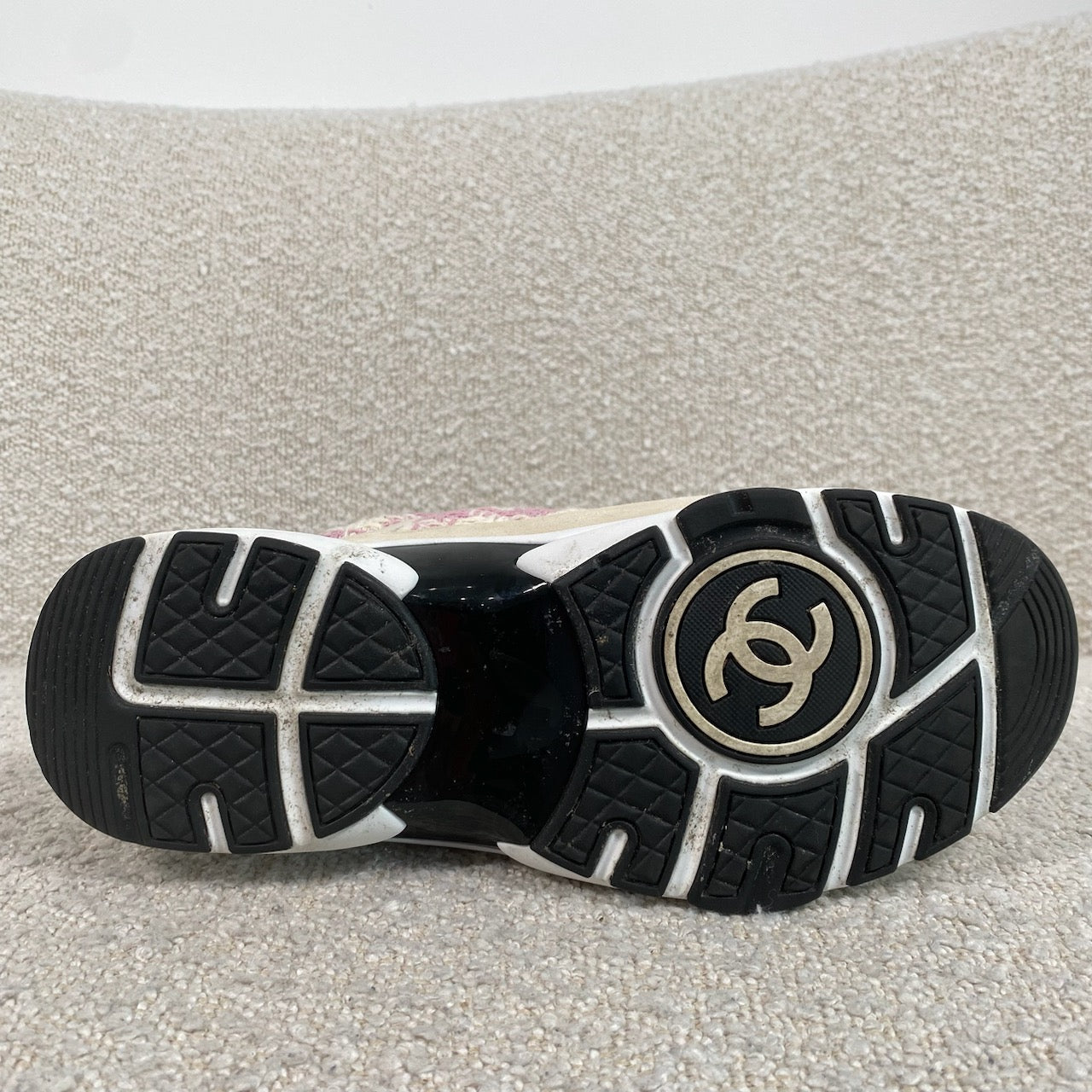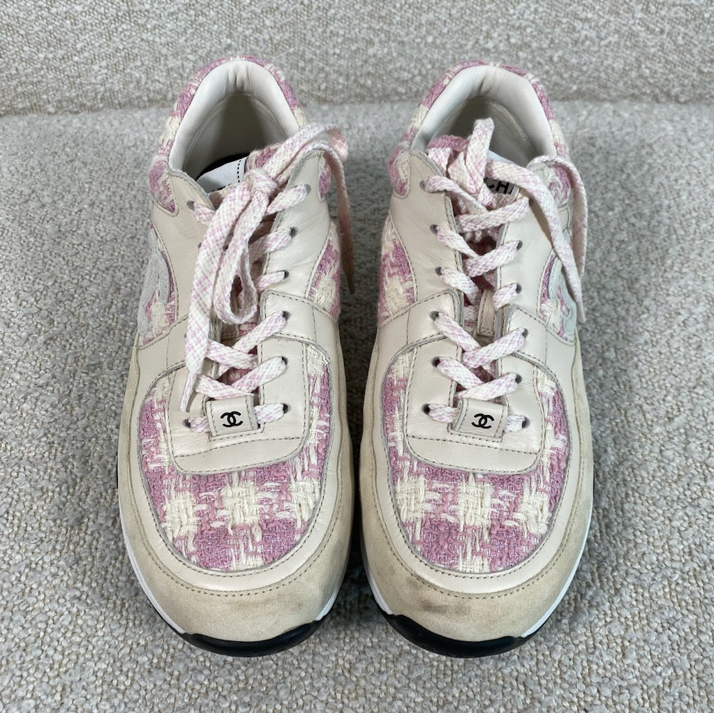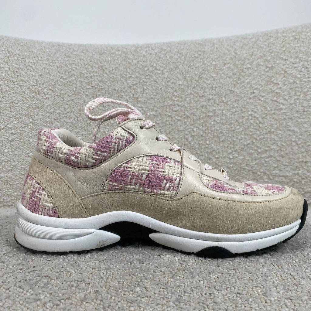 Pre-owned Chanel CC Tweed White Pink Sneakers 39
