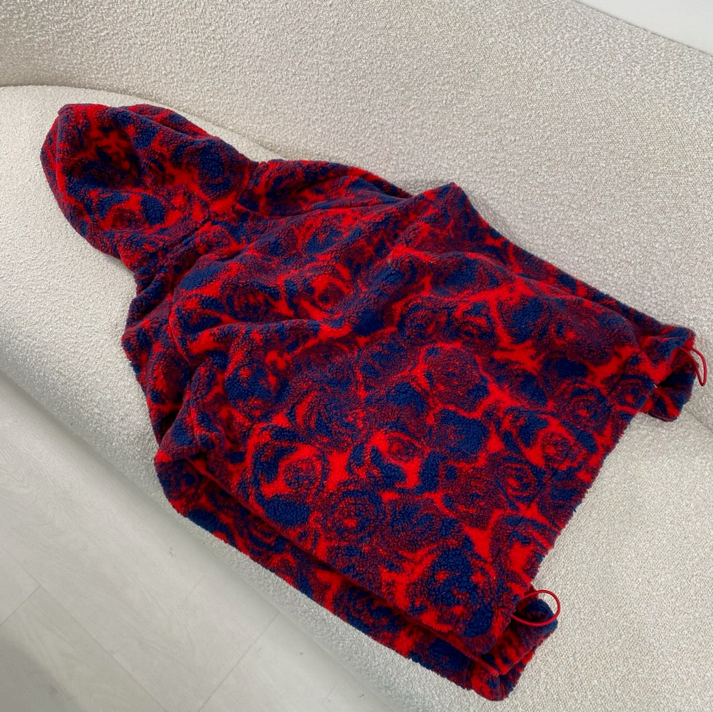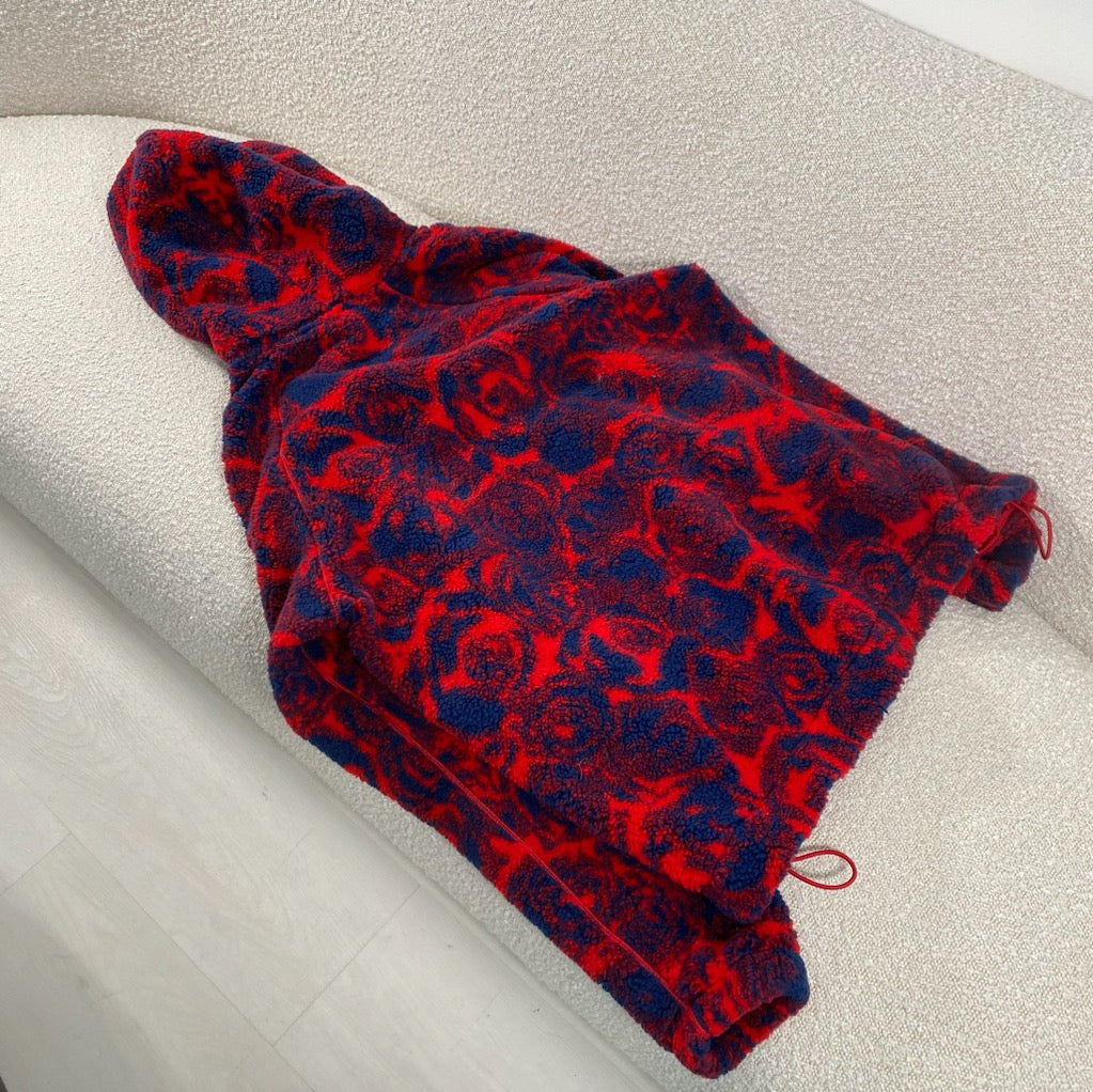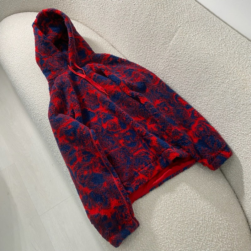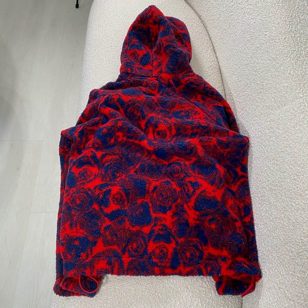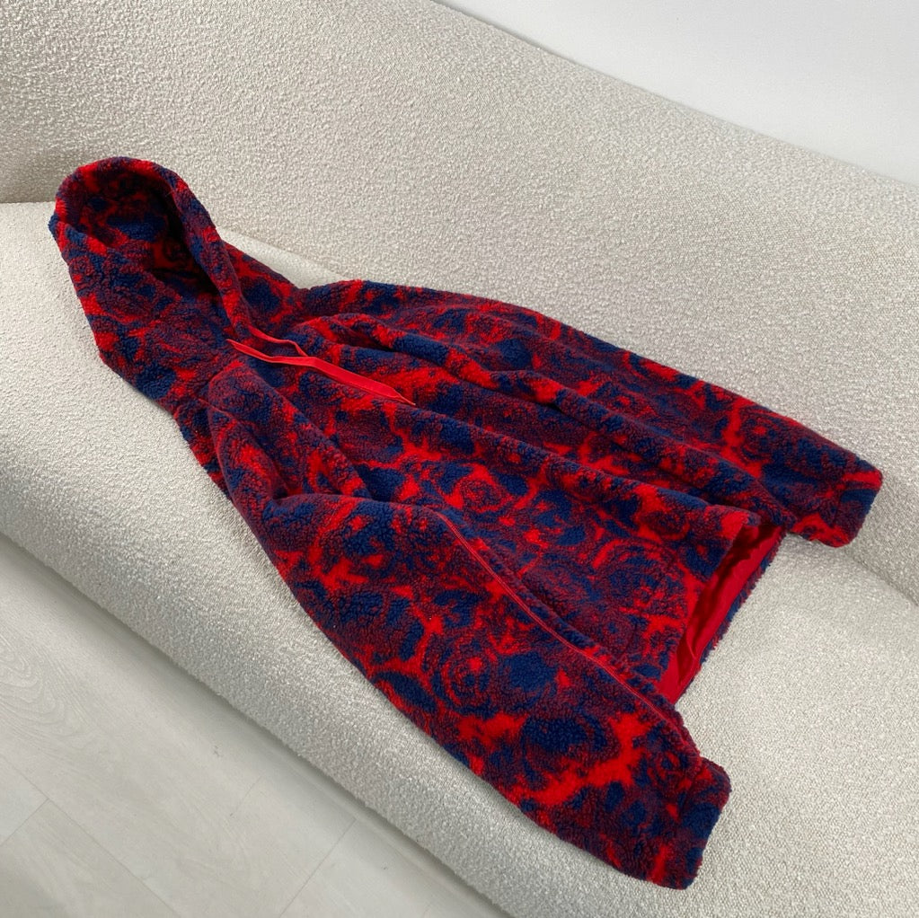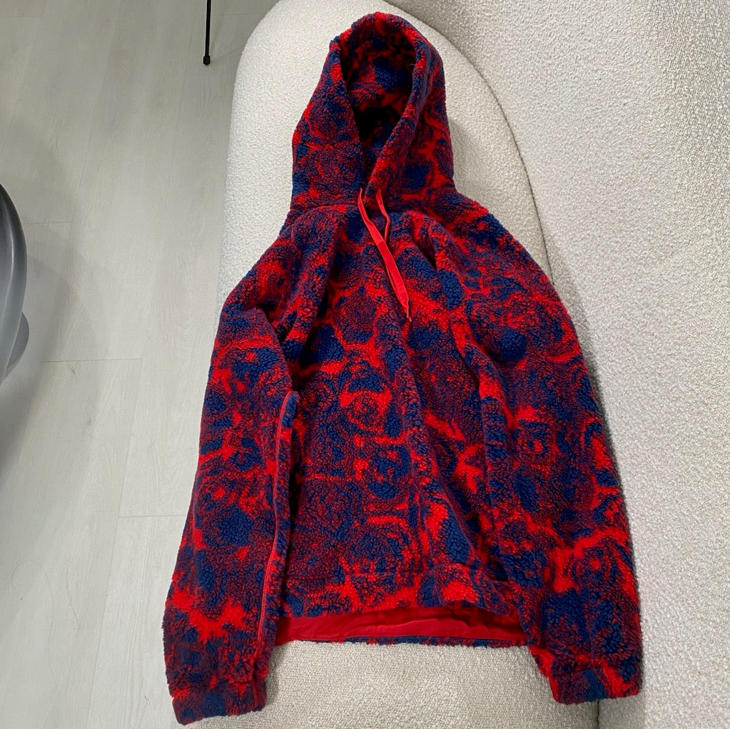 Large. Length: 43in Chest: 21in Hem: 22in Sleeve length: 32in Sleeve opening: 5.5in. Red/Navy Sherpa Rosette Patterned Hooded Sweatshirt. Pull-on. Front pockets. Lined.