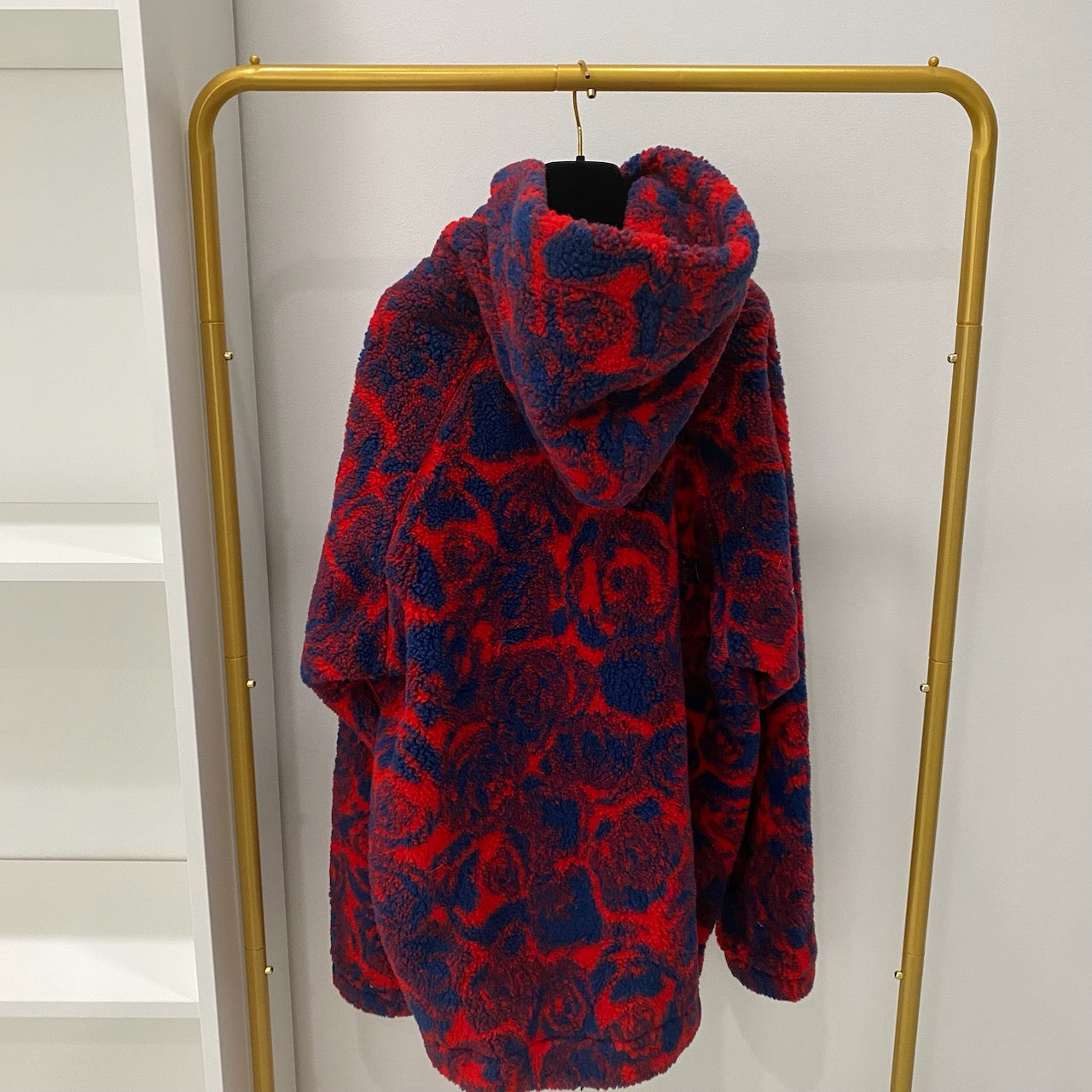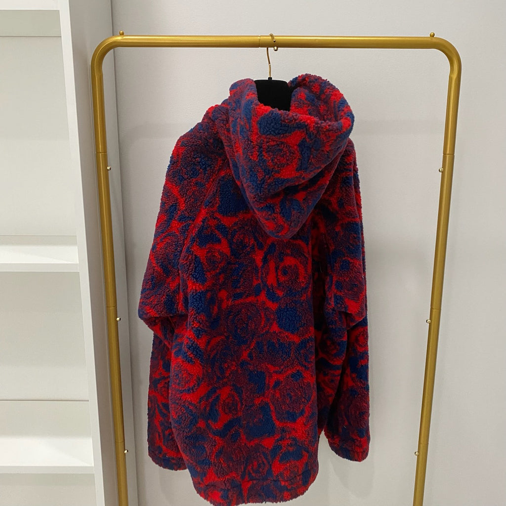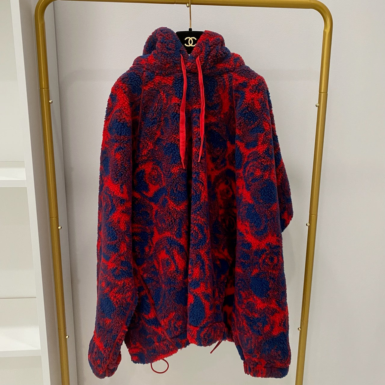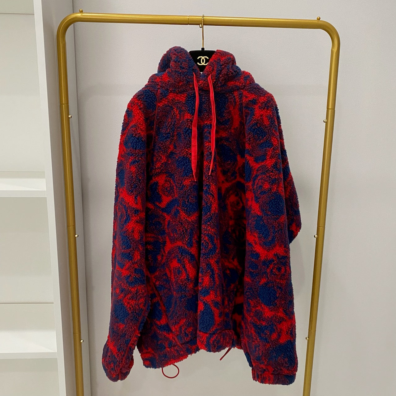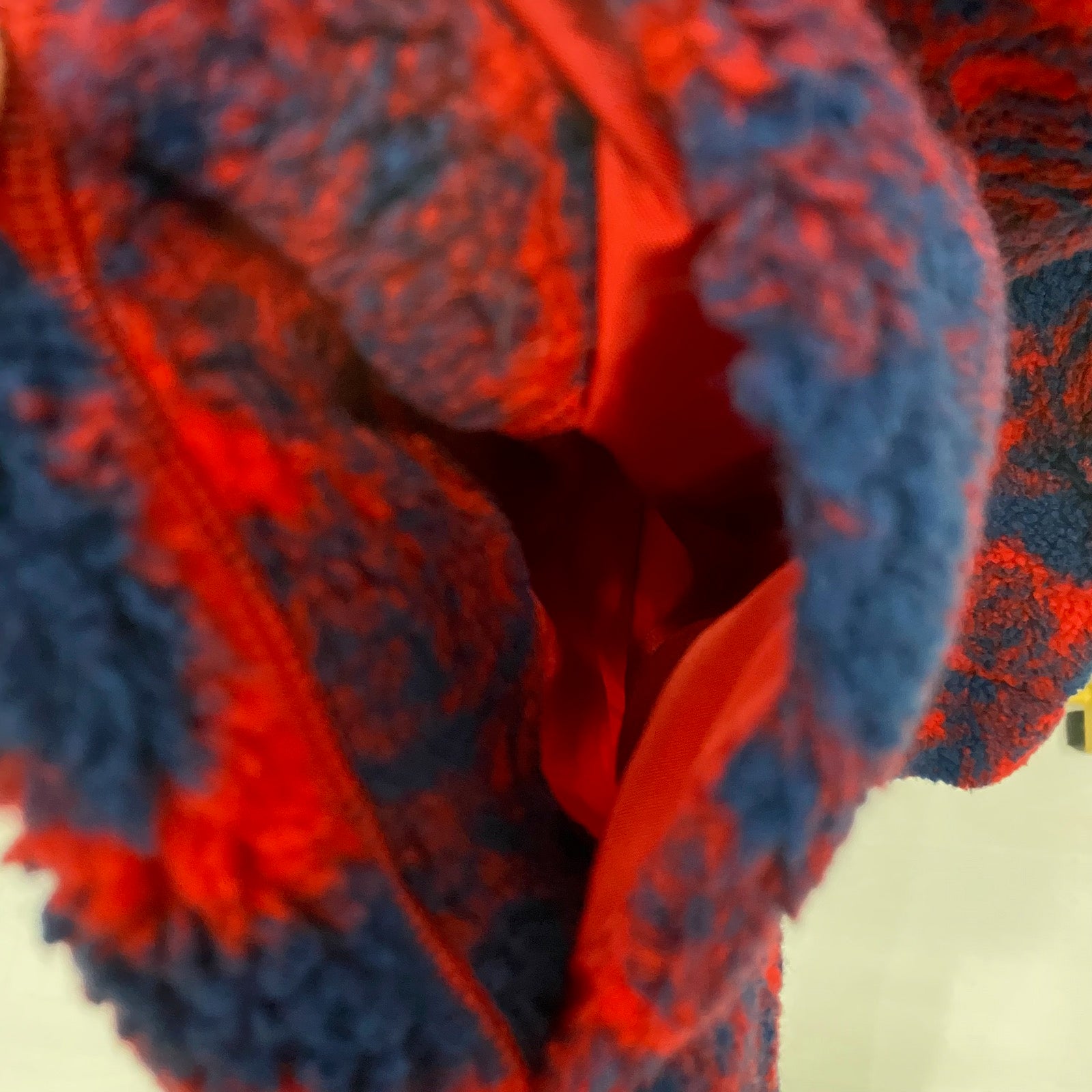 Large. Length: 43in Chest: 21in Hem: 22in Sleeve length: 32in Sleeve opening: 5.5in. Red/Navy Sherpa Rosette Patterned Hooded Sweatshirt. Pull-on. Front pockets. Lined.