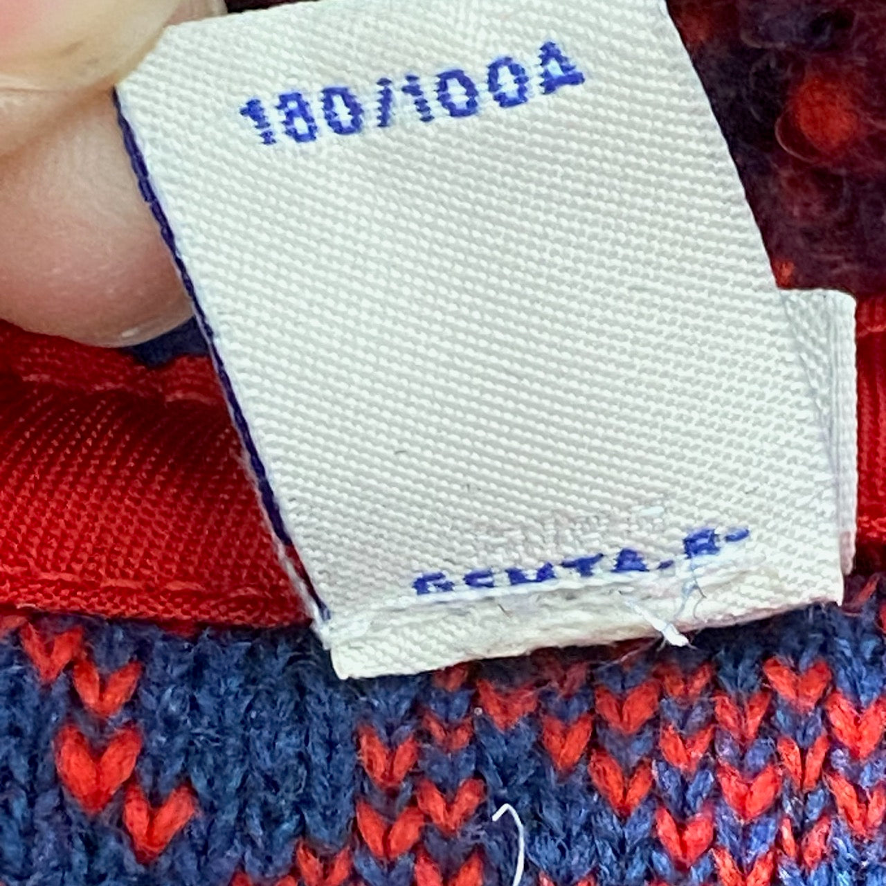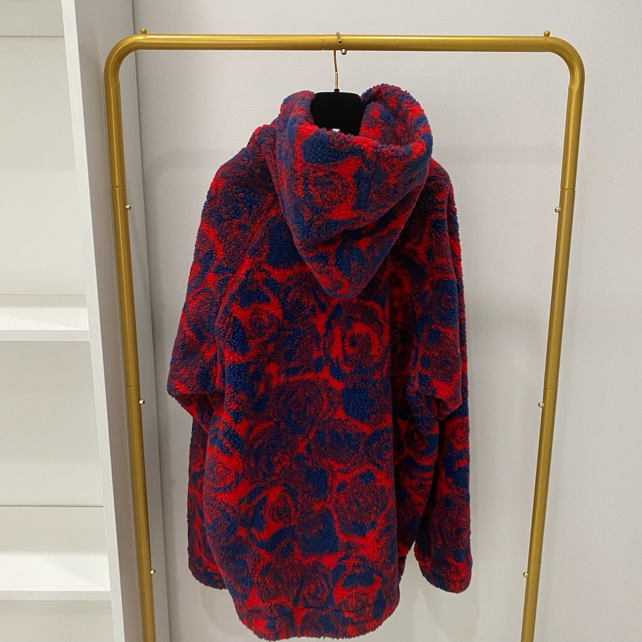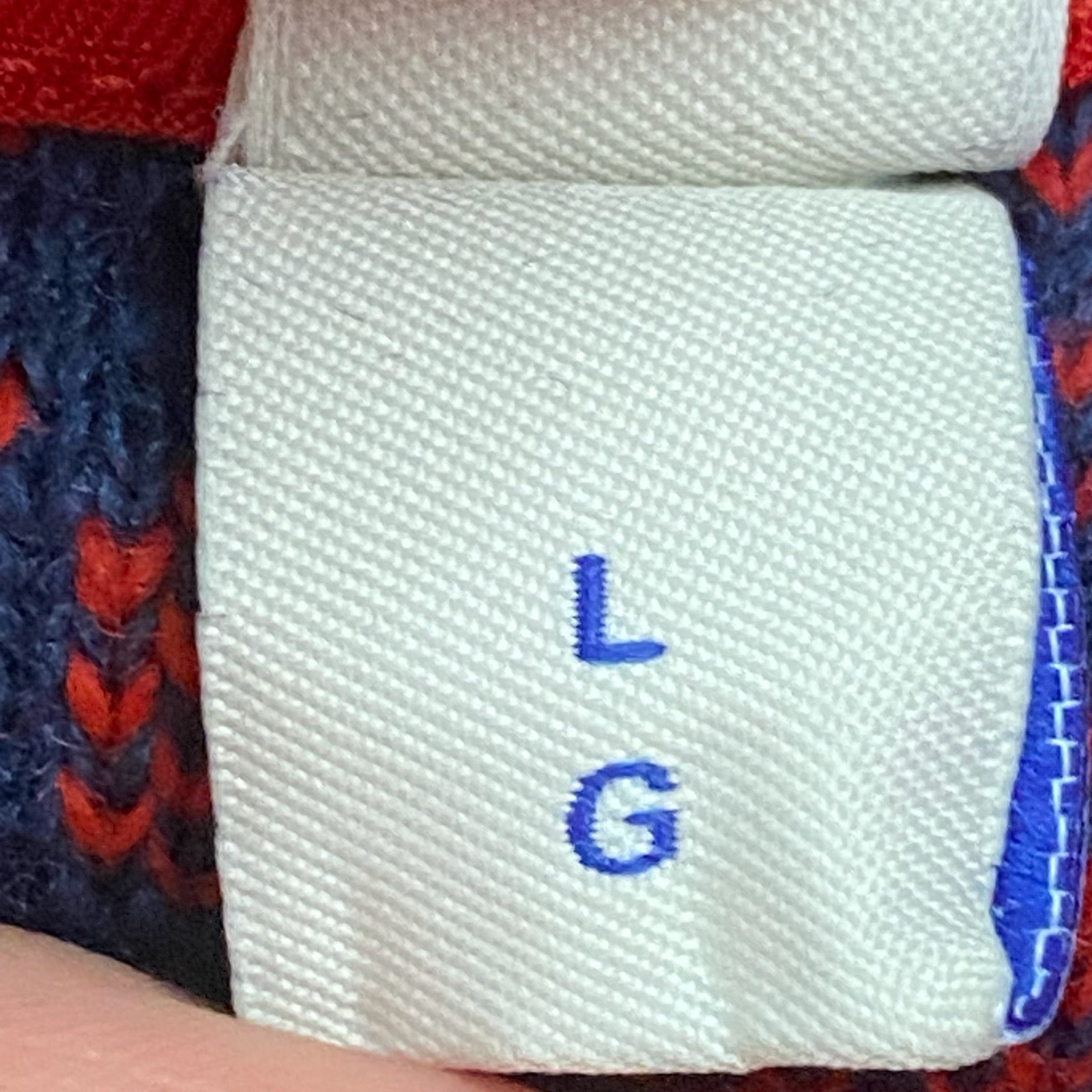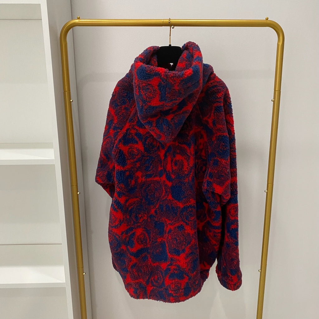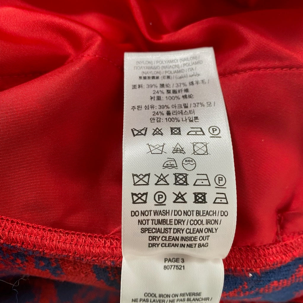 Large. Length: 43in Chest: 21in Hem: 22in Sleeve length: 32in Sleeve opening: 5.5in. Red/Navy Sherpa Rosette Patterned Hooded Sweatshirt. Pull-on. Front pockets. Lined.