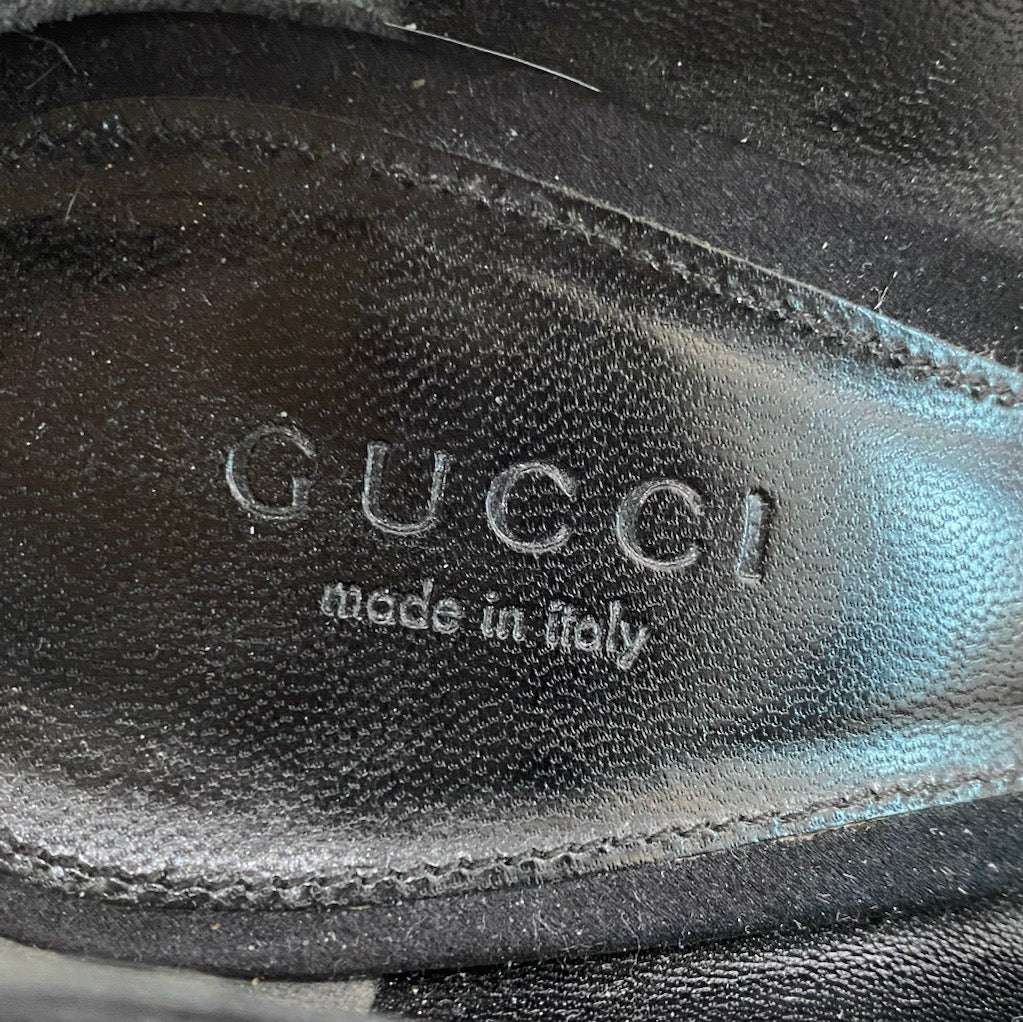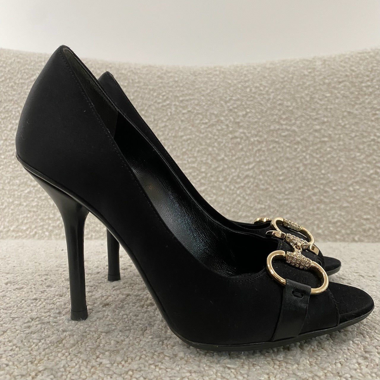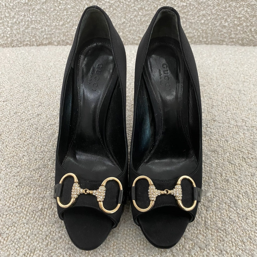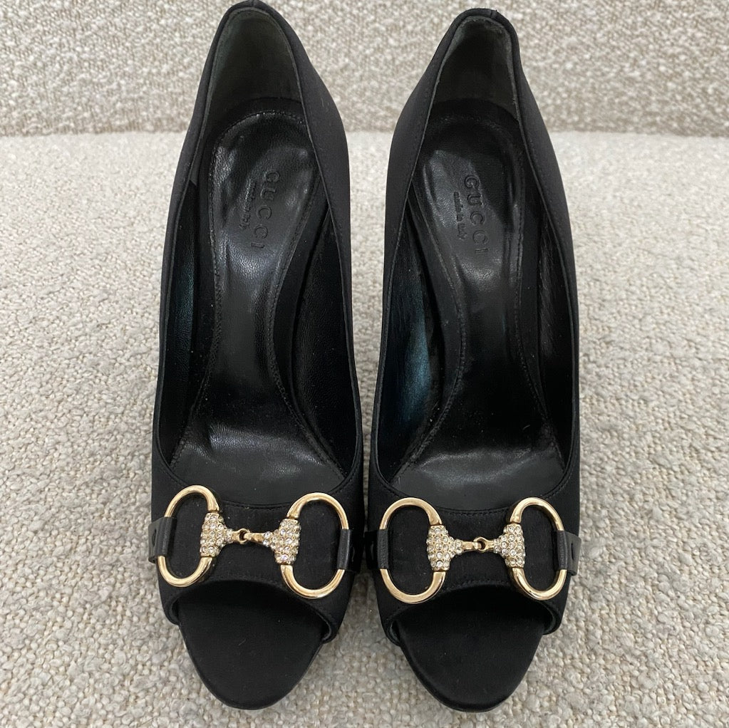 Pre-owned Gucci Black Satin Pumps Rhinestone Horsebit Heels Crystal Shoes Peep Toe 5.5