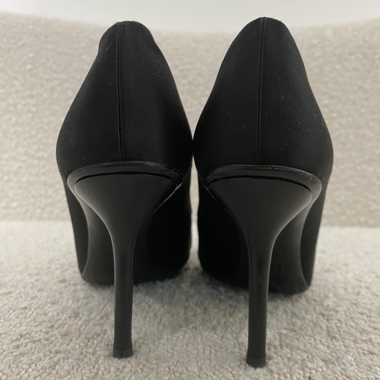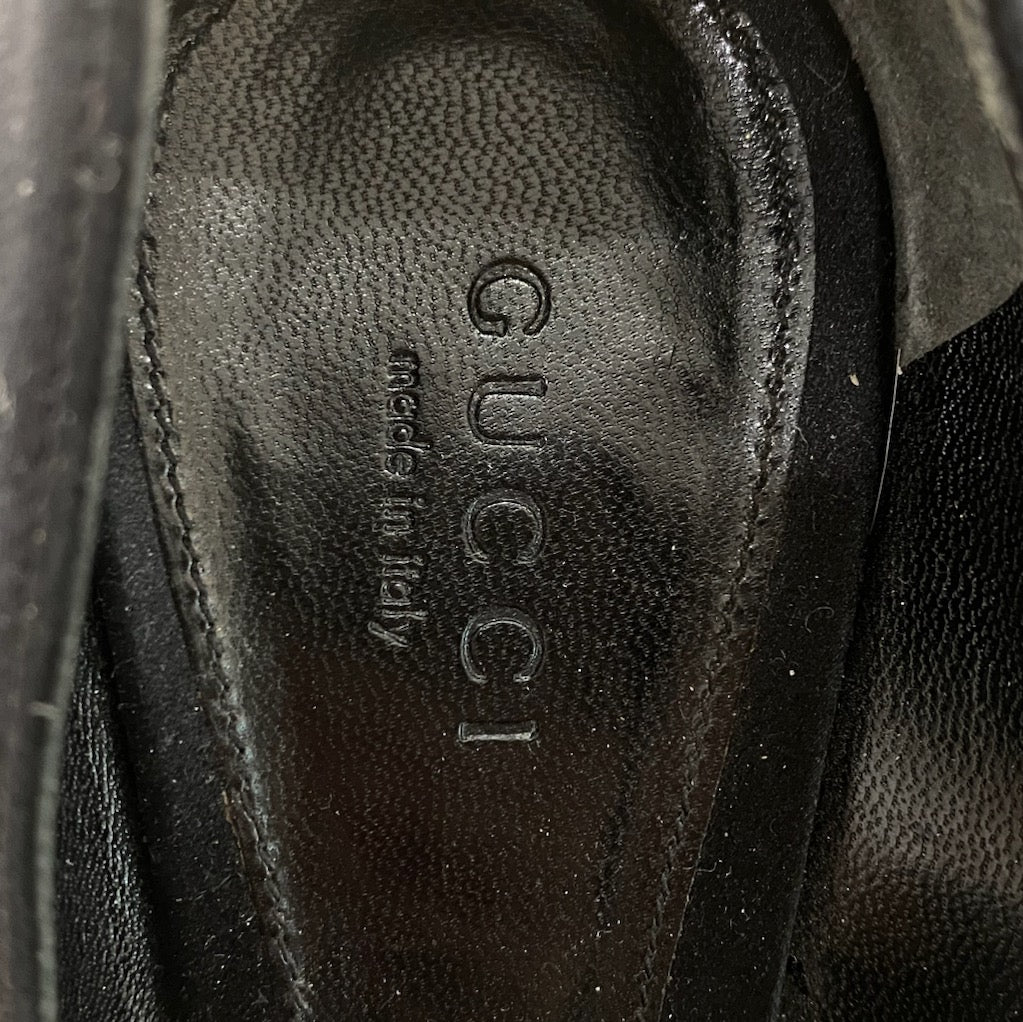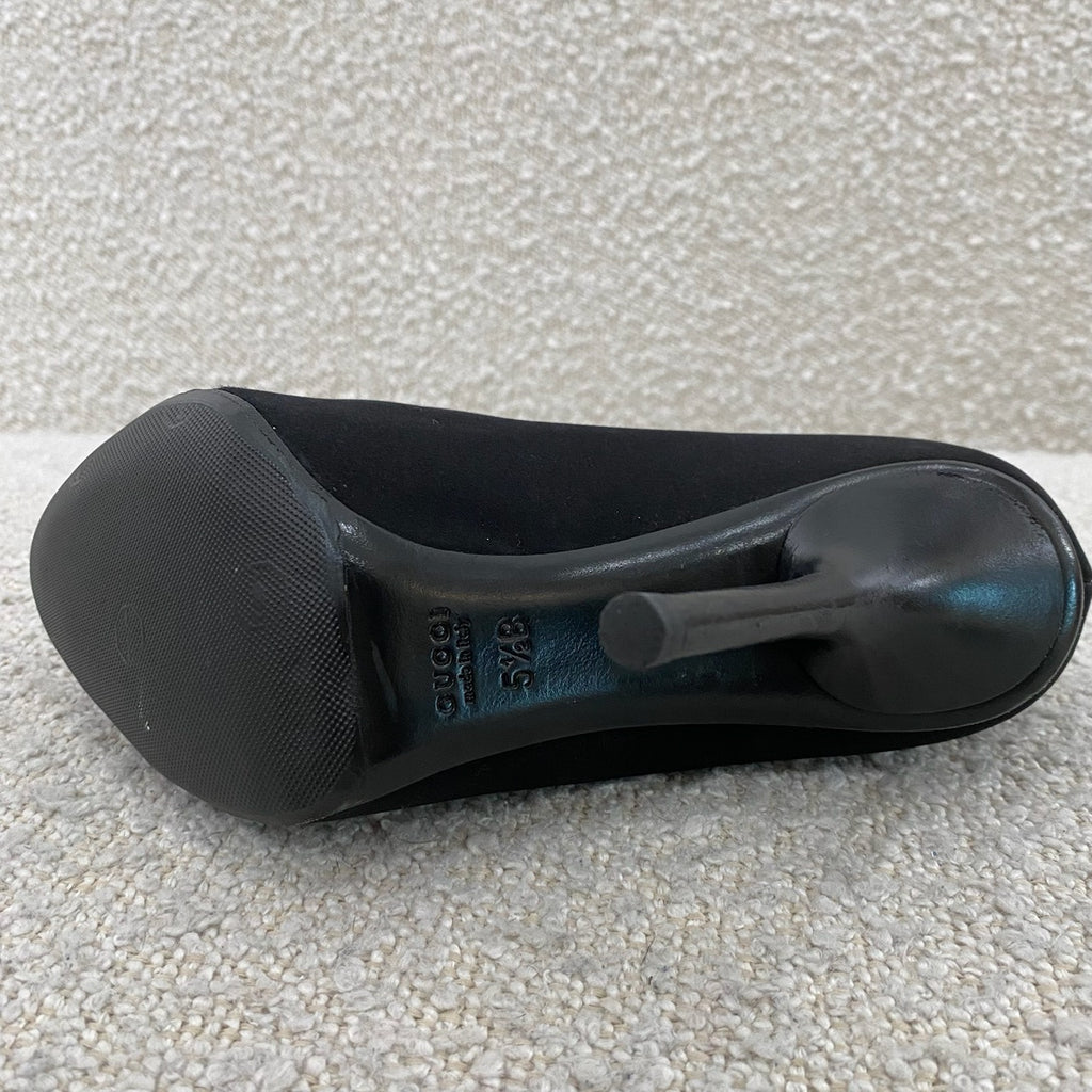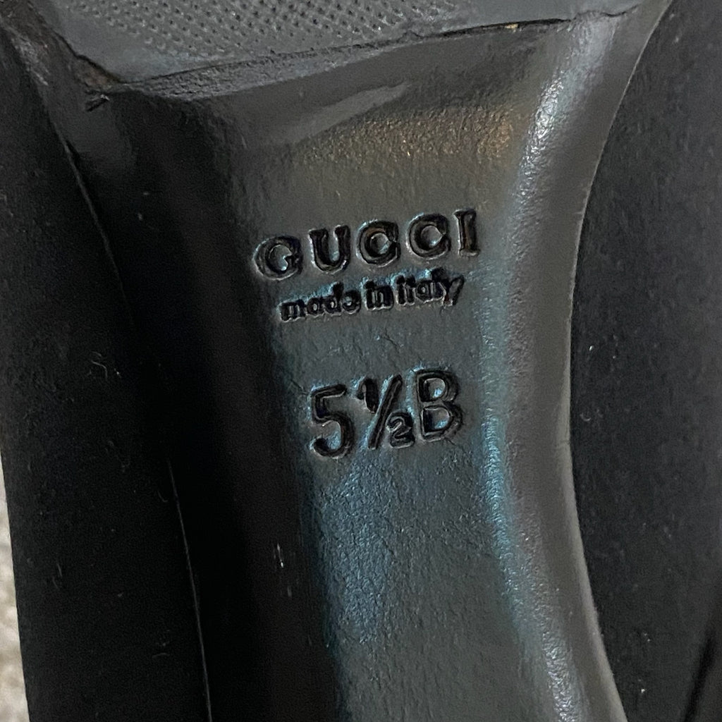 Pre-owned Gucci Black Satin Pumps Rhinestone Horsebit Heels Crystal Shoes Peep Toe 5.5